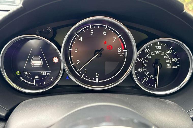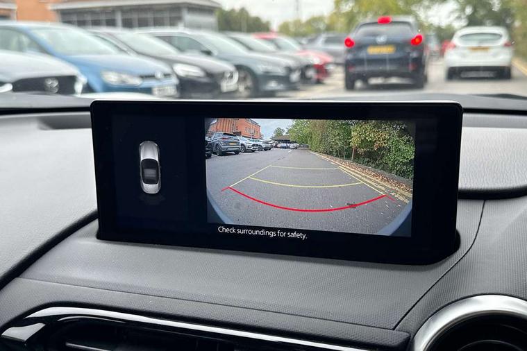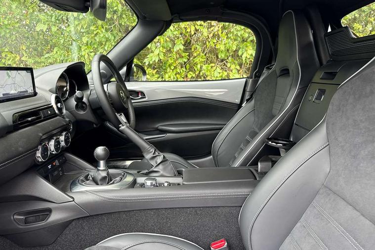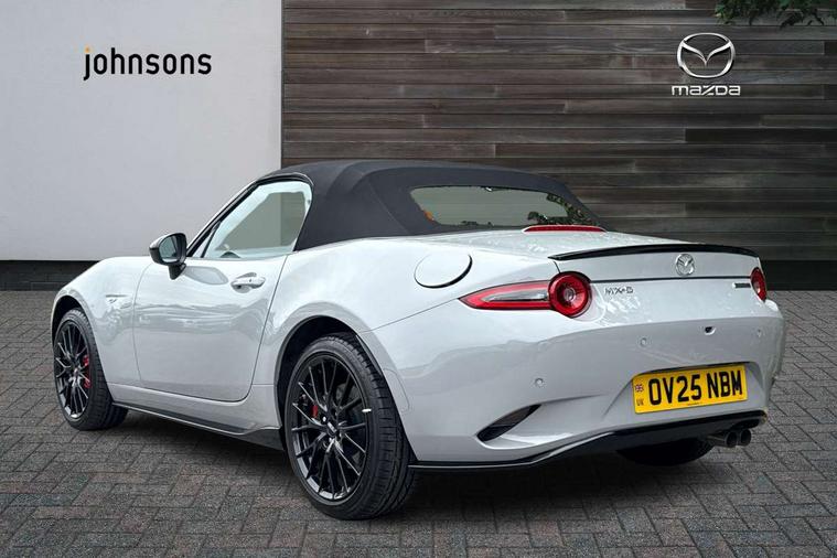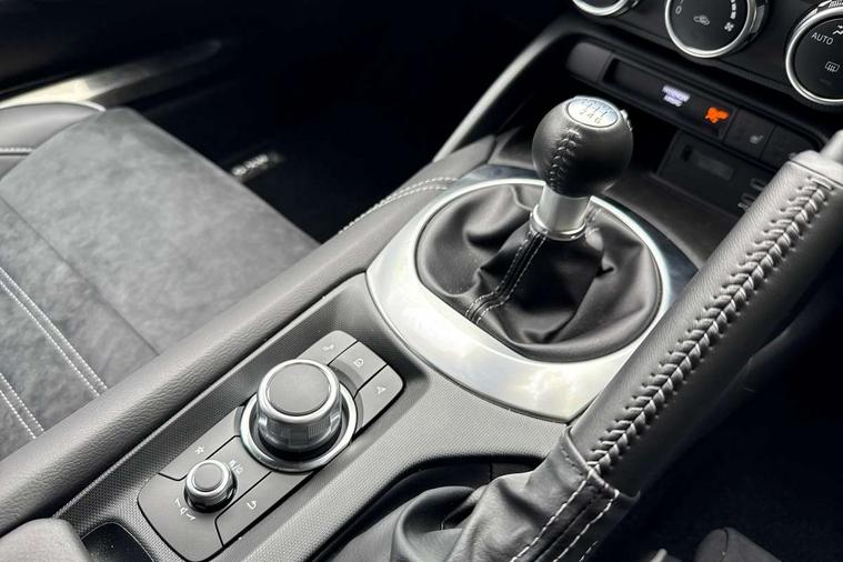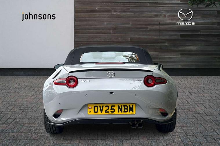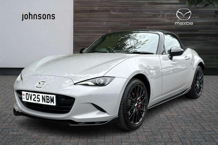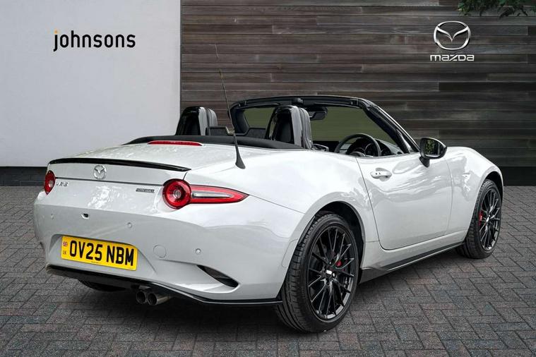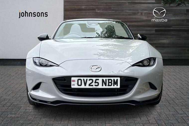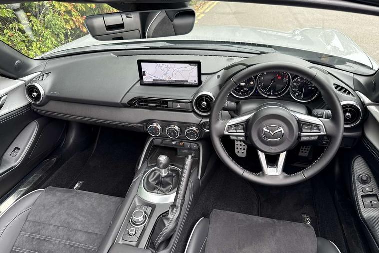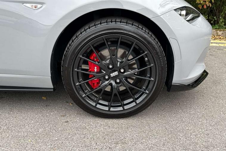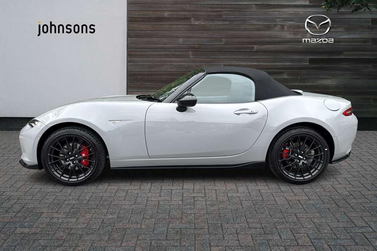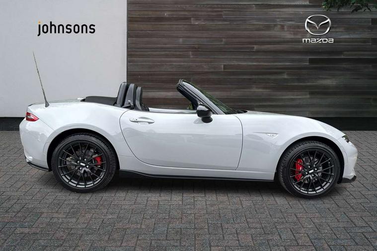 8.8" Colour centre touch screen display with Mazda Connect infotainment, Aha and stitcher app, Analogue speedometer, Apple car play/Android Auto, Blind spot monitoring with rear cross traffic alert, Cruise control with Intelligent speed assist, Driver alert system, eCall emergency call system, Emergency stop signalling system, Engine start/stop button, Hands free phone preparation, Integrated bluetooth with hands-free calling, bluetooth audio and easy access to phone contacts, Integrated navigation system, Kinematic posture control, Lane departure warning system, Lane keep assist, Multi dot display tachometer and electric odometer, PAS, Rear parking sensor, Reversing camera, Service indicator, Traffic sign recognition, Trip computer, Water temperature gauge, Asymmetric limited slip differential, I-ELOOP, i-stop, Sports suspension featuring Bilstein dampers, 2 x USB Type-C inputs, Multimedia Commander including separate volume dial, Premium Bose sound system with 9 speakers with 2 in each front headrest, AM/FM/DAB radio and MP3, Steering wheel mounted audio/bluetooth controls, Adaptive LED Headlights, Automatic headlamp levelling, Body colour bumpers, Body colour co ordinated interior upper door trim, Coming/leaving home lighting function, Dual exhaust pipes, Dusk sensitive headlamps, Electric front windows/one touch facility, Frameless auto dimming rear view mirror, Front intermittent wipers, LED 3rd brake light, LED daytime running lights, LED indicator lights, LED rear lights, Manually operated black premium cloth soft top with heated rear glass window, Piano black electric/heated door mirrors, Piano Black fashion bars, Rain sensing front wipers, Rear boot, Stainless steel scuff plates with MX-5 logo, 12V socket, Alcantara/leather upholstery, Centre console storage box, Chrome Air conditioning dials, Climate control air conditioning, Coin Box, Driver and front passenger sunvisors with covered vanity mirror and driver ticket holder, Driver seat manual slide, recline and tilt adjustment, Front centre armrest, Front head restraints, Gear shift indicator, Heated front seats, in 3 heat levels, Interior courtesy light, ISOFIX front passenger seat child seat compliance, Leather gear knob, Leather handbrake lever, Leather steering wheel, Lockable rear centre box with lid, Passenger seat + manual slide/recline adjust, Recaro sports seats, Single front passenger seat, Strut brace, Tilt/telescopic steering column, Two cupholders, Windblocker, 3 point ELR front seatbelts with pretensioners, ABS+Electronic Brake force Distribution, Deployable Hood System (DHS), Driver and passenger seatbelt reminder audible warning, Dynamic stability control with track mode, Exit warning, Front dual stage driver and single stage front passenger airbags, Front smart city brake support with autonomous emergency braking (SCBS), Hill hold assist, Passenger airbag deactivate switch, Red brembo brake callipers, Side airbags, Smart city brake support - Rear (SCBS-R), Traction control, Tyre pressure monitor, Remote central locking with deadlocking and remote boot release, Smart keyless entry, Superlocking, Thatcham category 1 alarm + immobiliser, Centre Console - Vinyl leather, Chrome air vent surrounds, Dashboard panel - Black Vinyl, Exterior body colour co-ordinated upper door panel trim with black vinyl, 17" BBS Gun Metallic alloy wheels, Tyre puncture repair kit,