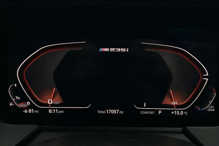 Active guard plus, Attentiveness assist, Auto start-stop, Bluetooth hands free facility with USB audio interface + WiFi interface for wireless connection of mobile terminal devices + audio streaming, BMW Intelligent Personal Assistant, BMW Live Cockpit Professional with 10.25" high resolution instrument and control display, BMW Online services, BMW operating system with 7.0 mid interface, BMW Teleservices, Check Control warning system for monitoring of lights and door/luggage compartment open warning, Electro hydraulically controlled multi plate clutch in rear axle, Energy efficient operating strategy, iDrive controller with touch function and 7 short cut favourite buttons on centre console, Integrated navigation data with map data via USB +features such as 3D landmarks and micro city models, Integrated owners handbook, Intelligent voice assistant, M Sport steering with M235i xDrive M performance specific settings, On board computer - average speed+fuel consumption, service interval, clock/date, odometer/trip meter, outside temperature display and ice warning, Optimum shift indicator, Personal Profile, Pull away assistant, Speed limiting function, 2 balance shafts, 8 speed sport automatic transmission with electronic selector lever, auto P function, coasting idle, race track, sport, gearchange display manual mode, Aluminium lightweight construction, BMW TwinPower twin-scroll Turbo four-cylinder petrol engine, Double VANOS, Drive performance control with ECO PRO comfort + sport mode, Electronic differential lock, Engine cover with M performance designation, High precision injection, Larger fuel tank capacity (50 litres), Launch control, M235i specific heavily de-throttled engine intake air guide, M235i specific high-performance cooling package, M235i specific larger turbocharger with integrated divert-air valve, Performance Control, Petrol Particulate Filter, Power transmission of front wheel drive on the rear axle via angle transmission on the front axle differential and two part cardan shaft, VALVETRONIC engine management, Variable, stepless and infinitely adjustable distribution of drive torque between the front and rear axles, xDrive intelligent all wheel drive with M235i specific reinforced components, 2x USB Type C ports (for charging and data transfer), 4G LTE Connectivity with hard wied 4G network sim card, DAB digital radio, MP3 players and RDS double tuner, Automatically dimming rear view mirror, Body colour door handles, Direction indicator side lights integrated exterior mirrors, Electric windows - front and rear, with open/close fingertip control and trap release, Exterior mirrors - electrically folding with anti-dazzle, Fading support, Follow me home headlights, Front and rear bumper system with replaceable deformation elements, Front door sill finishers in black plastic with M235i designation, Heated, electrically adjustable exterior mirror aspheric on driver side, convex on passenger side, High gloss black B pillar finish, High gloss shadow line exterior trim, High level third brake light, LED daytime running lights, LED front fog lights, Lightweight engineering, M Performance exhaust system with valve control and minimised exhaust back pressure, M rear spoiler, Model designation on right side of tailgate includes xDrive designation onleft handside for M235i xDrive, Preparation for high beam assistant, Rain sensor with automatic headlight activation, Rear fog lights, Reinforced crank drive, new pistons and adapted con rods, Reversing light in rear light cluster, Welcome lighting, 12V power socket in centre console, 2 cupholders in front centre console, 3 rear seat head restraints, 3 spoke M sports design leather steering wheel finished in nappa leather with specific M badge, Additional under floor storage in luggage compartment, Anthracite finished floor mats with contrasting surround, Anthracite headlining, Automatic two zone climate control air conditioning, Child seat ISOFIX attachment for two outer rear seats and front passenger seat with anchorage points, Conditioned based service, Driver and front passenger seat heating, Front and rear door pockets including bottle trays, Front and rear side armrests integrated into door trim, Front armrest foldable with integrated storage compartment, Front centre interior light over interior mirror and rear centre automatic interior light when door is opened/ignition switched off or via remote key, Front head restraints, Front M Sport seats, Glove compartment, Glovebox with light, Luggage compartment lighting, Manually adjustment steering wheel column, Multi-function controls for steering wheel, Shift-by-wire selector shift, Steering wheel paddles, Sun visors with vanity mirrors and insert tab, Through loading system with 40/20/40 split folding rear seat, Two lashing eyes, Additional interior lighting pack - 2 Series Gran Coupe, Connected pack professional - 2 Series Gran Coupe, Extended storage pack - 2 Series Gran Coupe, M Sport exterior styling aerodynamics pack - 2 Series Gran Coupe 235i, 2 tone horn, Airbag - Front driver and passenger, front and rear head, front side, curtain head protection, manual deactivation of front passenger airbag possible, Anti lock braking system (ABS) with cornering brake control, BMW emergency call, Brake drying, Braking readiness, Crash sensor activating of airbags, Unlocking doors, hazard warning lights, fuel cut off, interior lighting+activation of safety battery terminal clamp, Dynamic stability control + (DSC+), Dynamic Traction Control - DTC, Electrically operated hand brake, Integrated torsen mechanical limited slip differential on front axle, M Sport braking system in blue high gloss + blue painted brake calipers with M designation, M sport seatbelt, Rear brake discs, Rear child proof door locks, Seat belt security check for driver and front passenger, Seatbelt warning, Side impact protection, Three point seat belts on all seats including front belt stopper, pyrotechnic belt tensioners and 