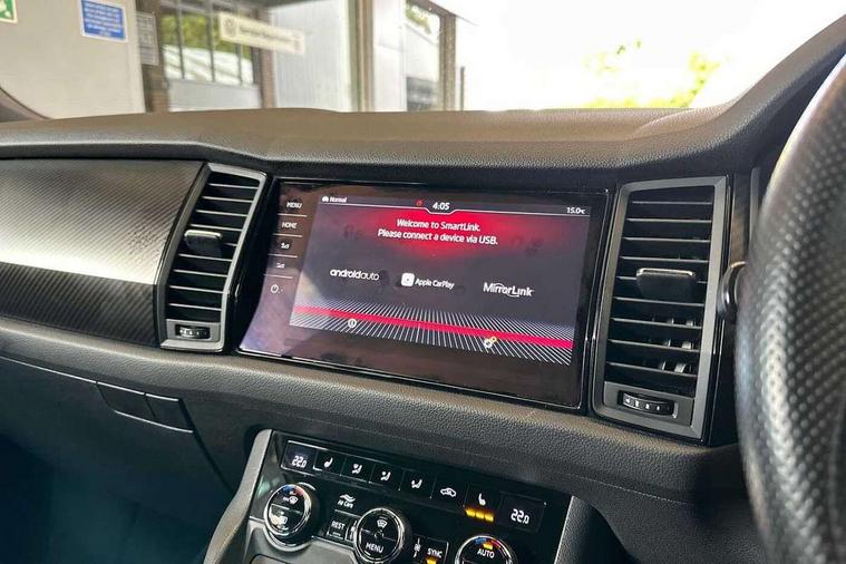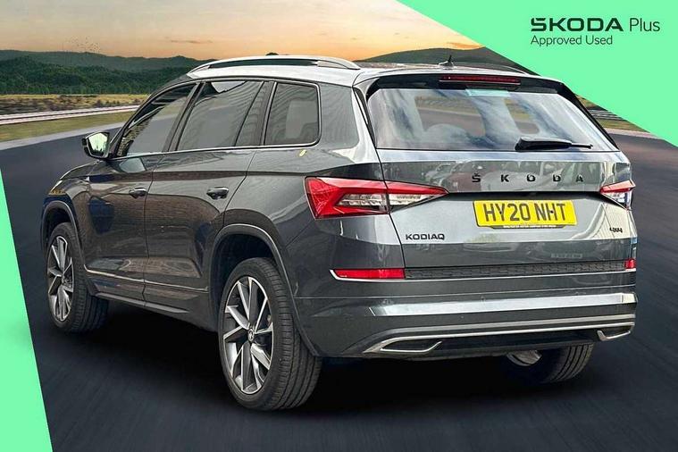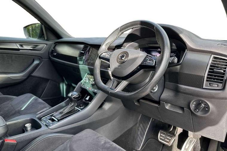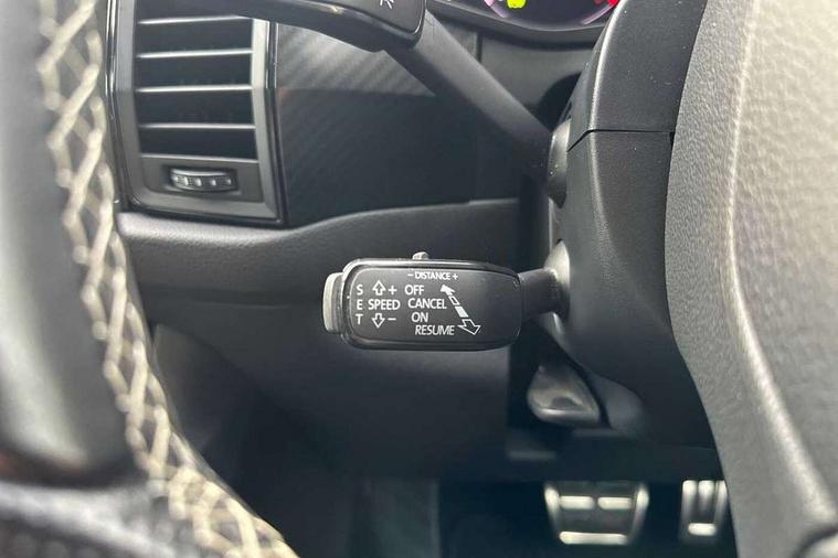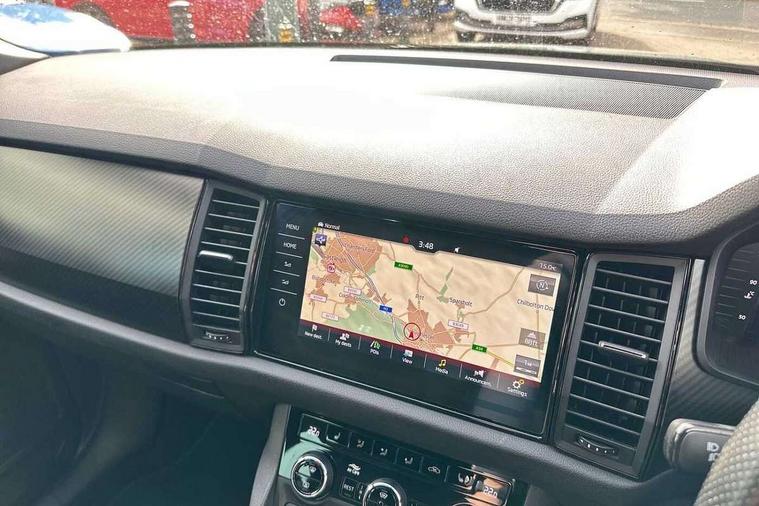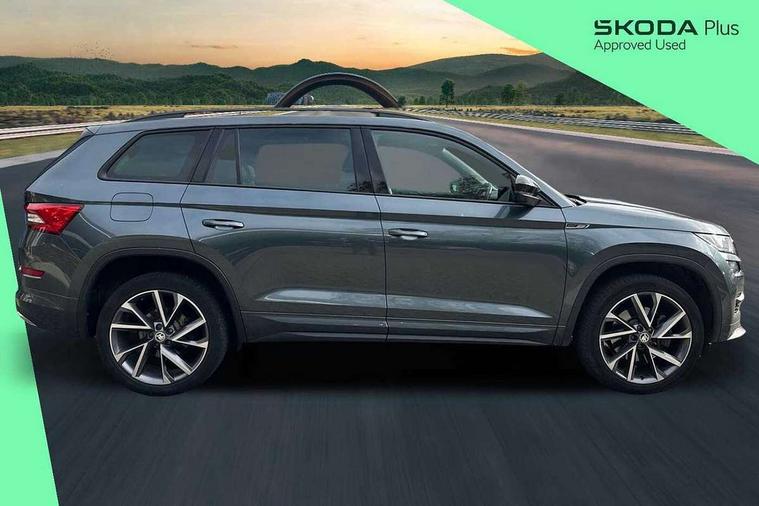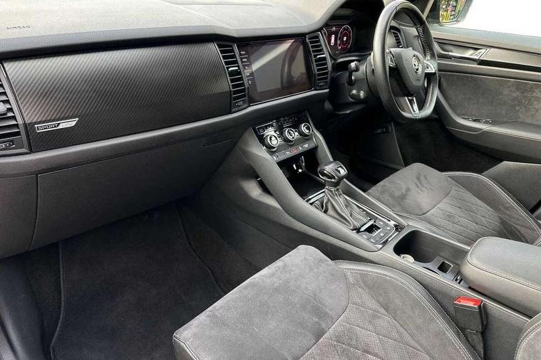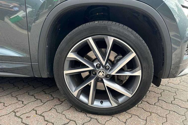 Bluetooth system, Colour multifunction trip computer, Columbus satellite navigation with 9.2" touch screen and integrated Wi-Fi + WLAN, Digital voice enhancement, ECO Stop/start function, Exterior temperature indicator, Map care, Progressive power assisted steering, SmartLink plus, Speed limiter, Sports dials, Tailgate unlocking from outside, Bolero Radio, DAB Digital radio, DVD System, USB and SD card connectivity, Aero front windscreen wipers with intermittent function, Aero rear window wiper, Auto dimming rear view mirror, Automatic activation of hazard warning lights, Black electric window control buttons, Black roof rails and door mirrors with radiator grille and window surrounds, Black wheel arch surrounds, Body colour bumpers, Body colour door handles, Chrome exhaust tailpipe, Electric front and rear windows, Electrically adjustable/heated/foldable and auto dimming door mirrors with memory function, Front door steps with SportLine logo, Full LED Headlights with adaptive front light system and LED daytime running lights, Headlight washers, Heated rear window, LED front fog lights with static cornering light function, LED rear fog light, LED third brake light in rear spoiler, Light assistant (coming home/tunnel light), Rain and light sensors, Rear diffuser, Rear spoiler, Safety reflectors on front and rear doors, Sportline badge on front fender, Sports front and rear bumpers, Sunset privacy glass, Tailgate lettering in Black, Without engine designation, 12V socket in boot, 2 rails with 2 hooks including 4 hooks for net programme, 4 foldable roof handles with rear coat hooks, 4 lashing points on luggage floor, 60:40 foldable rear seat with sliding adjustment and backrest angle adjustment, Alcantara door panels, Alcantara upholstery with Sports seats with silver stitching, Aluminium pedals, Black roof headlining, Bottle holders in door panel in the 1.5 litre front and 1 litre rear, Cargo storage compartments, Centre console with open storage box, cup holder and 12V socket, Chrome headlight control button, Chrome interior door handles, Coat hooks on B pillar, Covered storage compartment on driver side, Front and rear door armrest with black adductor trim, Front centre armrest with storage compartment, Front courtesy lights, Gear shift lever with chrome frame and black gloss insert, Height adjustable front headrests, Height adjustable rear headrests, Illuminated and cooled glovebox, Illuminated luggage compartment, Isofix system on outer rear seats, Manually adjustable steering column, Net programme in boot (1x horizontal Net, 2x vertical Nets), Overhead glasses storage compartment, Pollen filter, Rear centre armrest with cupholders, Roll up luggage compartment cover with intermediate position, Small Bags on the inner sides of the front backrests, Small pockets on the inner side of the front backrests, Storage compartment in lower middle Instrument panel, illuminated with closing, Three rear height adjustable headrests, Ticket holder on A Pillar, Umbrella in door panel, LED Interior Light pack - Kodiaq Scout/Sport Line/VRS/Laurin + Klement, Auto door release and activation of warning lights in the event of an accident, Driver and passenger airbags, Electronic parking brake with hill hold control, Emergency rear braking signal, ESC (incl. ABS+MSR+ASR+EDS+HBA+DSR+RBS+MKB), Front and rear three point safety belt on all seats, Front assist includes AEB city/urban, Front side airbags, Fuel cut off safety device, Head and knee airbags, Passenger airbag deactivate switch, Rear disc brakes, Safety vest holder in door, Seat belt reminder for all seats, Two tone horn, Tyre pressure monitor, Warning lights in front doors, Alarm with interior monitoring and tilt sensor with safe function, Immobiliser, Keyless entry and start system (KESSY), Remote central locking, Carbon finish dashboard and door inserts, Chrome air vent surrounds, Sportline plaque on the dashboard, 20" Vega Anthracite alloy wheels with anti-theft wheel bolts,