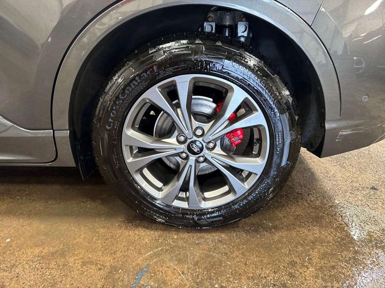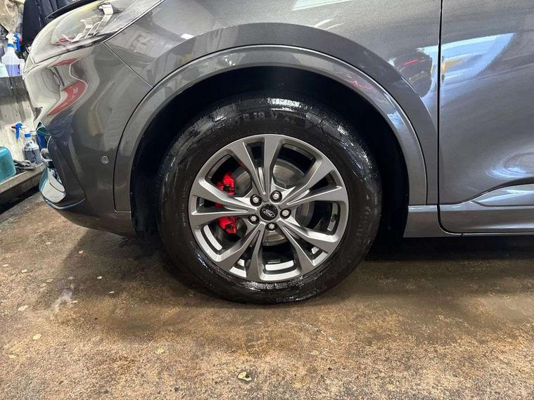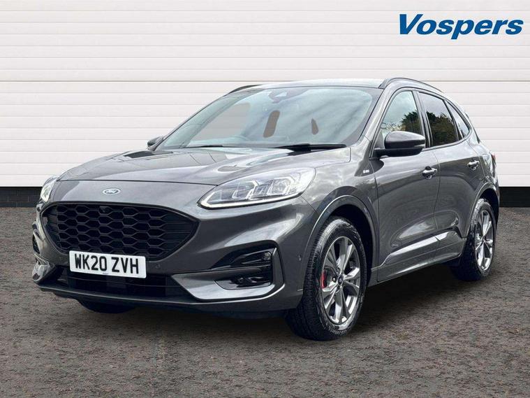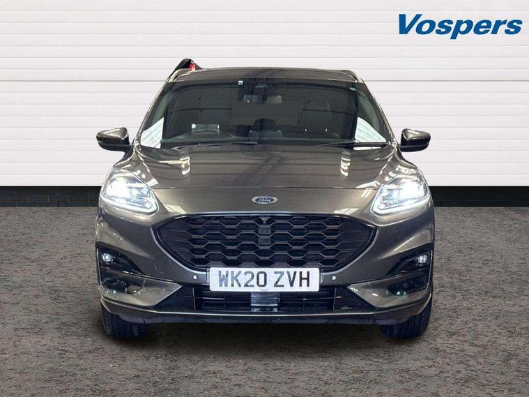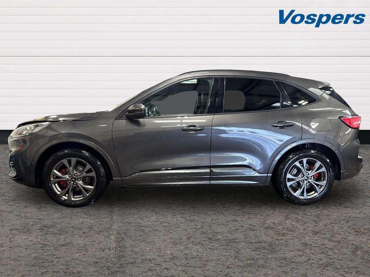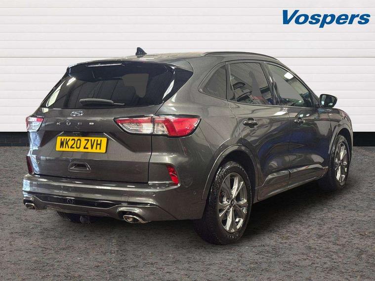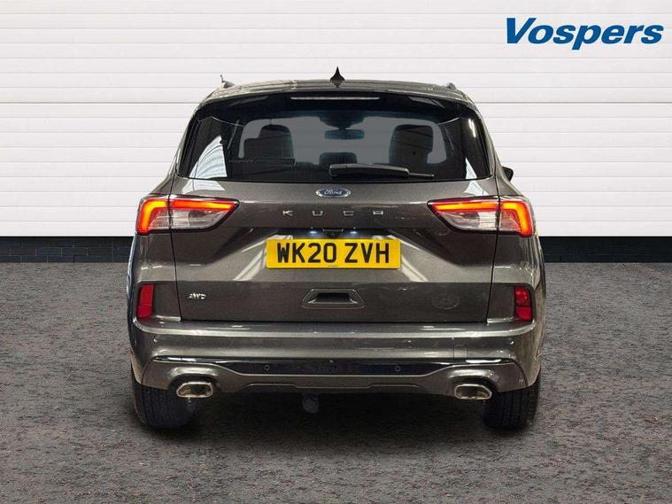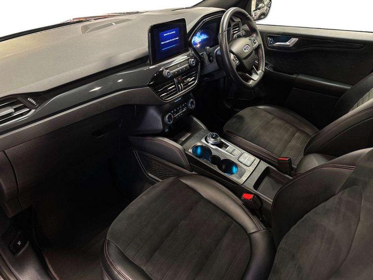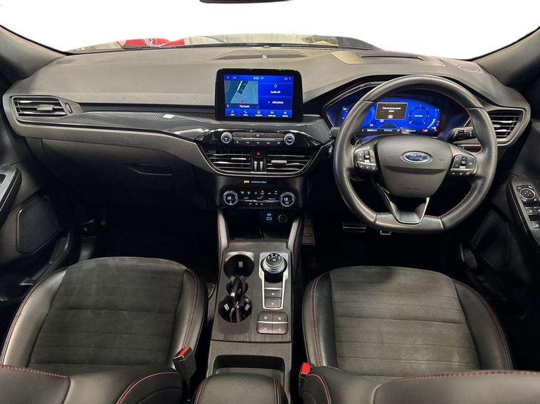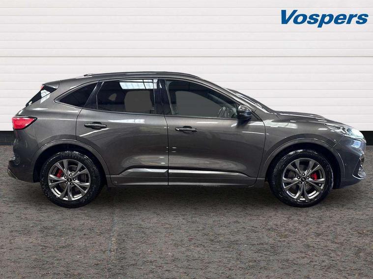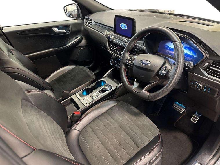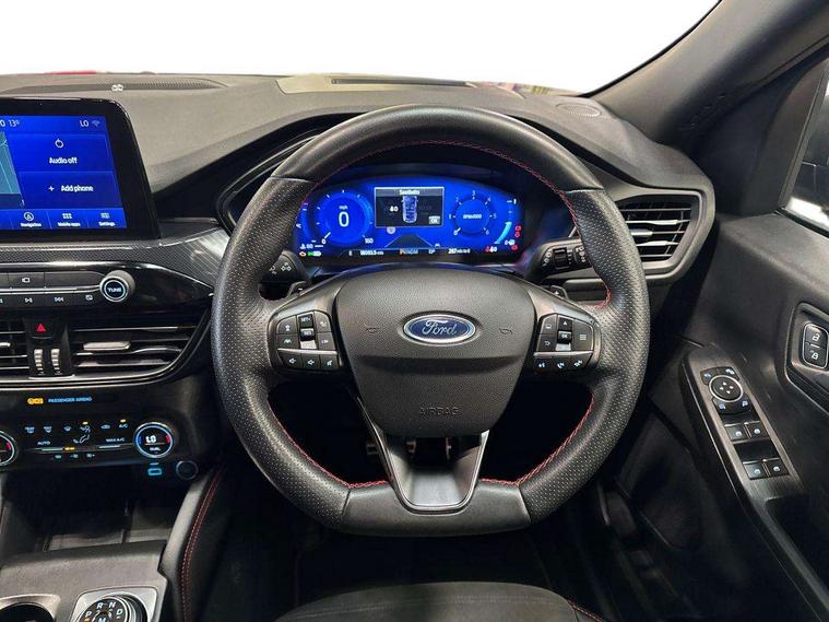 Active park assist, Adaptive cruise control with Stop and Go, BLIS (Blind spot information system), Driver impairment monitor, Eco coaching, Ford easy fuel, Front and rear parking sensors, Front and rear view camera, Hands free power tailgate, Head up Display, Intelligent speed assist, Lane keeping aid with lane departure warning, Mobile phone wireless charging pad, Power assist steering, Selectable drive modes, SYNC 3 with navigation, DAB audio, Auto dimming rear view mirror, Auto headlamps with high and low beam, Auto wipers, Black roof rails, Door edge guards, Electrically operated front and rear windows, Front LED fog lights with cornering function, Full LED quad projector headlamps with glare free, Large rear spoiler, LED daytime running lights, LED rear lights, Power folding heated door mirrors with puddle lights, Power front/rear windows with global close, Privacy glass, Quickclear heated windscreen, ST Line badges in exterior and interior, ST Line front scuff plates, Twin exhausts, 2nd row sliding seats, 8 way manual passenger seat including lumbar support and height adjust, Alloy pedals, Ambient lighting, Centre console with electronic parking brake, Dark headlining and pillars, Dual electronic automatic temperature control, Flat bottomed leather steering wheel in sensico with red stitching, Front and rear head restraints, Partial leather manual track seat, Rear charging point, Sensico partial premium leather upholstery, Sports seats, ST Line front and rear floor mats, Steering wheel mounted paddle shift, B&O with large instrument cluster pack - Kuga, ST Line body styling kit - Kuga, 3x3 point rear seatbelts, Airbags - front driver/passenger, front and rear curtain, Drivers knee airbag, Electronic stability control (ESC) and ABS, Ford MyKey Gen 2 safety system, Hill launch assist, Post collision braking, Powered child proof rear door locks, Pre collision assist with autonomous emergency braking, Red brake calipers, Tyre pressure monitoring system, Engine immobiliser, Keyless entry, Keyless start with 'Ford Power' starter button, Locking wheel nuts, Remote powered central double locking doors, Thatcham category 1 alarm,
