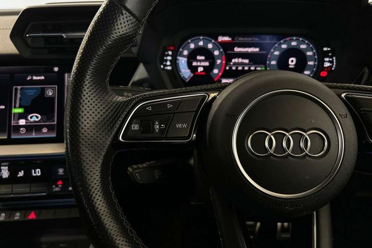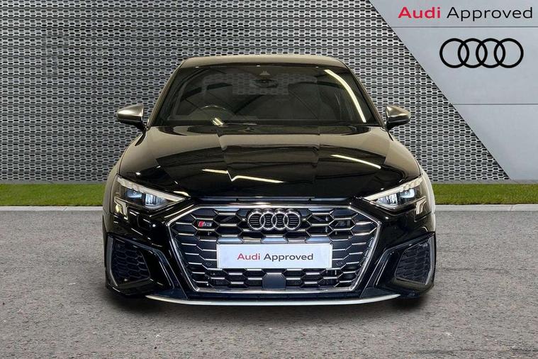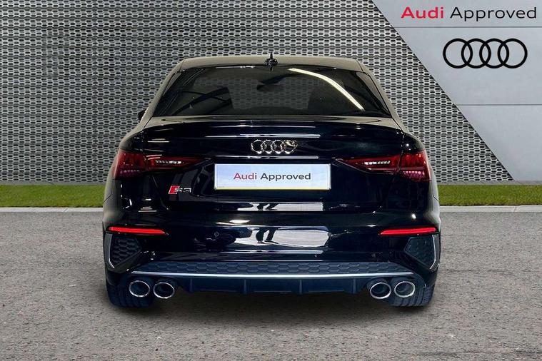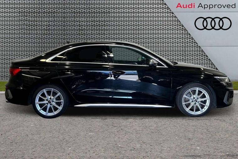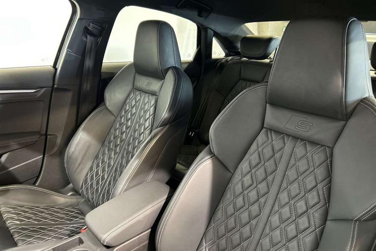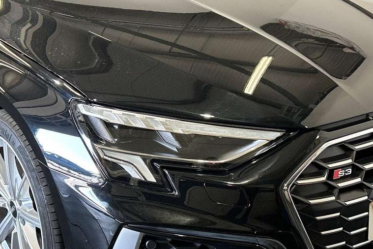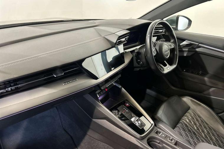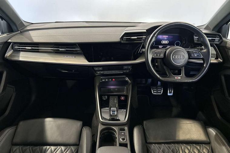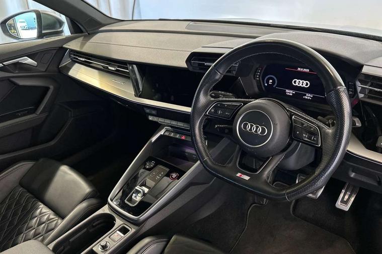 2x USB Type C ports (for charging and data transfer), Audi connect emergency call and service, Audi drive select (Auto, Comfort, Dynamic, Efficiency and Individual), Audi smartphone interface, Audi Virtual Cockpit - 10.25" digital and colour instrument cluster, Automatic start/stop system with recuperation, Bluetooth interface, Collision avoidance assistant, Lane departure warning system, MMI Navigation Plus with high resolution 10.1" colour touch screen display, Progressive steering, Service indicator, Voice control system with natural language interaction, Quattro permanent all wheel drive, S sport suspension with spring damper adjustment and lowering by 15mm, 6 passive loudspeakers, CD player, DAB Digital radio, Acoustic glass windscreen, Audi Beam uses LEDs to project the Audi logo onto the ground as you exit your S3, Auto dimming frameless rear view mirror, Dual branch oval twin tailpipes in chrome plated finish, Electrically adjustable/heated/folding/dimming door mirrors with kerb view includes integrated LED indications + kerb view function for passenger side, Front electric windows, Headlight washers, Illuminated door sills with aluminium inserts at the front with S logo, LED daytime running lights, LED headlights with LED rear lights and dynamic rear indicators, Light and rain sensors, Model and engine designation badges at rear, Privacy glass - dark tinted rear window, rear door and side windows, Rear electric windows, 12V socket and storage compartment in front centre console, 40/20/40 split folding rear seat bench with cupholder, Black cloth headlining, Dual zone electronic climate control, Front and rear centre armrest in leather, Front and rear headrests, Front/rear floor mats, Heated front seats, Height and reach adjustable steering wheel, Interior lighting - glove compartment light and right hand side, Luggage compartment floor covering, Manual boot compartment lid, Seat side bolsters, Stainless steel pedals and front footrest, Body styling design pack - S3, Storage pack - A3/S3 Saloon, 3x3 point rear seat belts, Driver and front passenger airbag with passenger airbag deactivation, Electronic Stabilisation Control (ESC) including ABS, ASR and EDL, First aid kit with warning triangle and 2 safety vests, Front side airbags with head airbags and interaction airbag, Hill hold assist, Pre-sense front with pedestrian and cyclist detection, Seatbelt monitoring, Tyre pressure loss indicator, Anti theft alarm, Anti-theft wheel bolts, Electronically operated child lock, Immobiliser, Remote control central locking, Aluminium air vent surrounds, Aluminium trim elements, Dark spectrum aluminium inlays, accent surfaces in the dashboard and centre console in platinum grey silk effect paint finish,