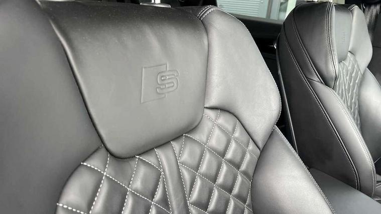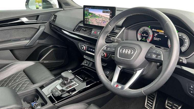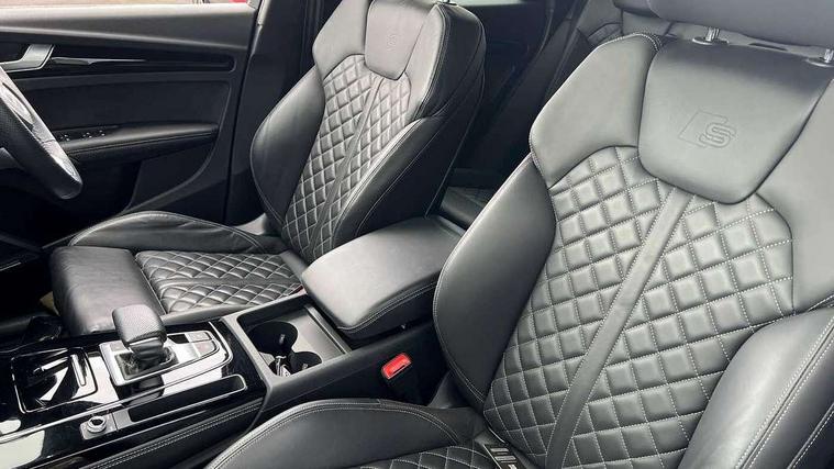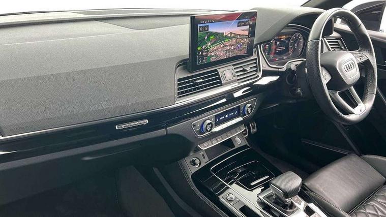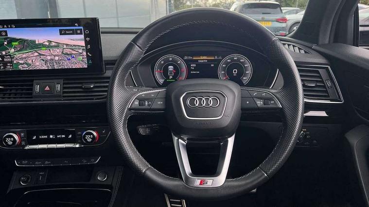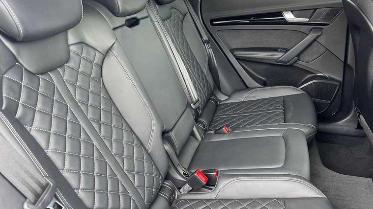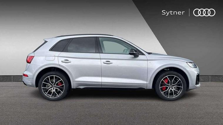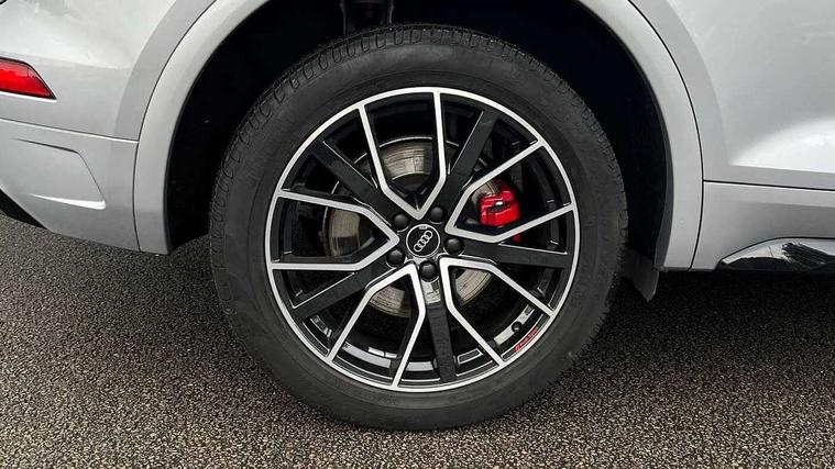 Acoustic front and rear parking sensor, Audi connect safety and service (e-call), Audi connect with Amazon Alexa Integration, Audi drive select, Audi virtual cockpit plus with 12.3" screen and three different layout designs, Audi wireless smartphone interface, Automatic start-stop system with coasting functionality and efficiency programme, Bluetooth interface, Electro - mechanical power assisted steering, MMI navigation plus with 10.1" touch screen, Power tailgate, Reversing camera, Service interval indicator, Voice control system with Audi hotword activation "Hey Audi", Diesel particulate filter, Quattro on demand, S line sports suspension, 8 loudspeakers, DAB Digital radio, Acoustic windscreen, Audi matrix LED headlights with dynamic front and rear indicators, Audi rings at front and rear in black, Audi rings decal on rear doors, Auto dimming door mirrors, Auto dimming frameless rear view mirror, Automatic headlight adjustment, Automatic headlights and windscreen wipers, Black roof rails, Body colour bumpers, Body colour underbody protection, Chrome plated exhaust trims, Daytime running lights, Door sills in Selenite silver, Electric adjustable/heated/folding door mirrors, Front air inlet surrounds in anthracite black, Front and rear electric windows, Headlight washers, High gloss black B pillar trims and triangular rear door trim, High level LED brake light, Rear chrome trim strip below lights, Rear privacy glass and rear side windows, Rear side wing doors, Rear wiper, Roof bars, S Line rear spoiler, 2 x USB charging port with aux input socket, 3 rear headrests, 4 way electric lumbar support for driver and front passenger, 40:20:40 split folding 3 rear bench seat in 2nd row with rear centre armrest, Black cloth headlining, Comfort front centre armrest, Contrast stitching on seats, steering wheel and gear lever gaiter, Deluxe 3 zone electronic climate control, Electrically adjustable front seats, Fine Nappa leather upholstery with diamond pattern contrast stitching + front sport seats with S embossed logo, Front/rear floor mats, Gear lever in black leather, Heated front seats, Height adjustable front head restraints, Height/reach adjustable steering column, Illuminated door sill trims with S logo, Luggage compartment cover, Rear seat bench plus-adjust for forwards/backwards position/backrest angle, cupholders in the armrest, load through hatch and remote backrest release, Removable luggage compartment floor, Single front passenger seat, Stainless steel pedals, Sunvisors with vanity mirrors, Black styling package - Q5 Edition 1, Extended interior upholstery pack - Q5, Extended LED Interior multi coloured Lighting Pack - Q5, 3 point seatbelts on all seats, 6 airbags - Driver, front passenger, curtain and side airbags, Electrically operated child locks on rear doors, Electromechanical parking brake, Electronic stabilisation control including ABS, ASR and EDL, First aid kit with warning triangle and vests, Front and rear brake calipers painted in red, Front passenger airbag deactivation, Hill descent control, Hill hold assist, ISOFIX child seat mounting for front passenger seat and ISOFIX child seat mounting with Top Tether for outer rear seats, Multi collision brake assist, Pop-up bonnet for pedestrian protection, Pre sense city, Seat belt force limiter, Seatbelt monitoring, Tyre pressure warning, Anti theft alarm, Anti-theft wheel bolts, Keyless Go access/ignition system, Remote central locking, Air vents inserts and centre console in gloss black, Piano black finish inlay,