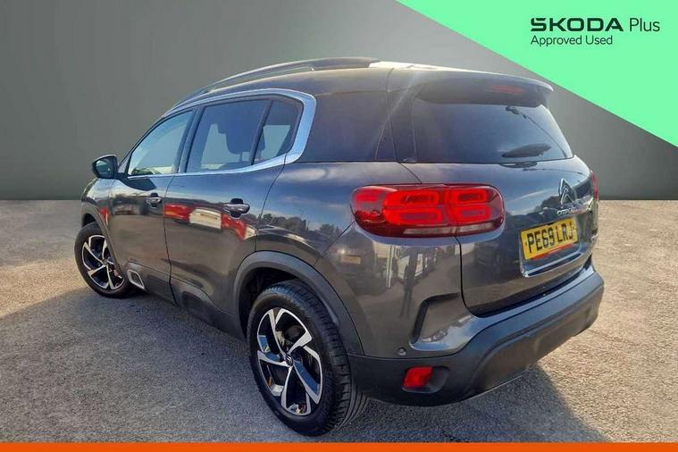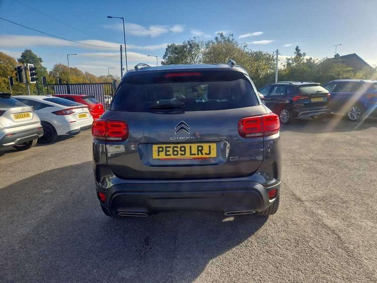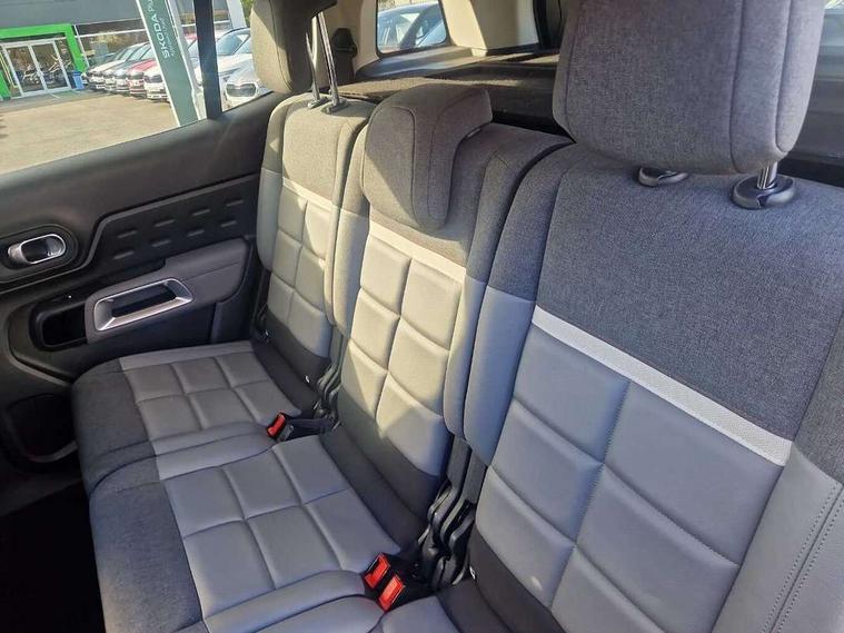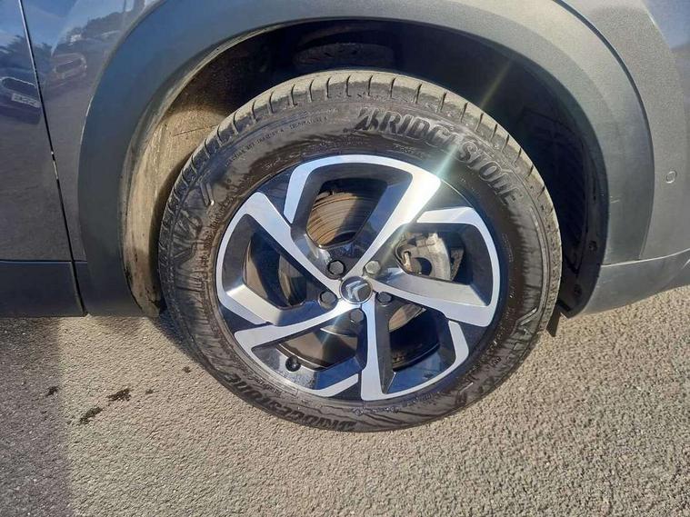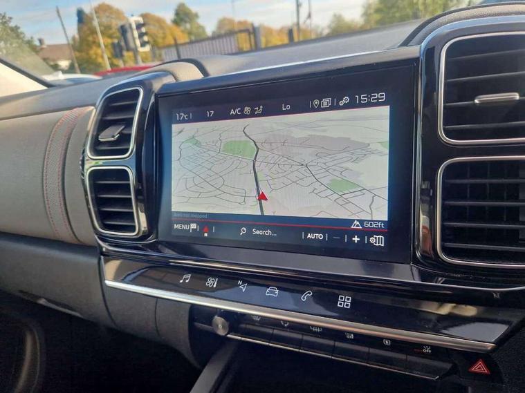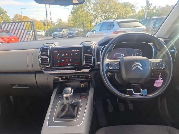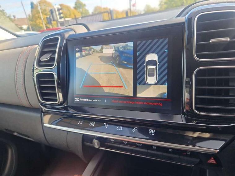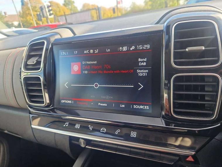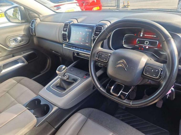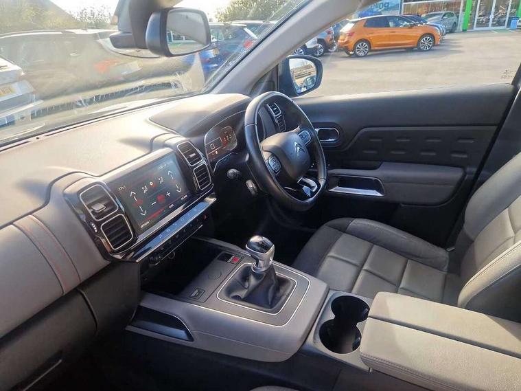 12.3" customisable TFT instrument display, Active blind spot monitoring system, Active lane departure warning system, Bluetooth telephone facility, Central 8" capacitive touch screen, Citroen connect box emergency assist system, Citroen connect Nav with connect box, Citroen connected CAM, Coffee Break Alert, Eco+ mode, Electric power steering, Exterior temperature indicator with ice warning, Front parking sensors, Gear efficiency indicator, Mirror screen with mirror link, apple carplay and android auto, Multi function trip computer, Park assist function with auto parallel and bay parking, Programmable cruise control and speed limiter, Rear parking sensors, Reversing camera displayed on the central screen, Speed limit recognition and recommendation, Traffic sign recognition and recommendation, Suspension with Progressive Hydraulic Cushions, 2x USB sockets in front, Auxiliary input socket, DAB (Digital Audio Broadcasting), AM/FM and MP3 compatible radio with two tweeters and four speakers, Voice recognition for radio, navigation and telephony features, 3D effect LED rear lights, Acoustic laminated windscreen with rain and brightness sensors, Airbump panels with colour insert on lower portion of the doors, Auto dimming electrochrome rear view mirror, Automatic hazard light activation upon heavy brake application, Automatic headlight activation via windscreen mounted sensors, Automatic triggered rear windscreen wiper in reverse gear, Automatic windscreen wipers, Body colour door handles, C5 Aircross monogram on boot rear, Citroen logo and monogram on rear, Dark tinted rear windows and rear windscreen, Electric, heated and folding door mirrors with integrated LED indicator and kerb puddle light, Front fog lights with cornering function, Front windscreen wiper with magic wash cleaning system, Gloss black finish on A and B pillar and aerodynamic trim, Guide me home headlight function, Halogen headlights, Halogen rear fog lights, Halogen rear number plate lights, Headlights left on audible warning, Heated rear windscreen with integrated antenna, LED daytime running lights, LED front indicators, LED high level brake lights, Longitudinal roof bars, Matte black lower rear skirt, Matte black rear bumper facia, Matte black side sill with anodised silver colour touch, Matte black upper and lower grille, Matte black wheel arch extensions, One touch electric front/rear windows with pinch protection, Painted front bumper, Painted rear bumper, Roof bars with anodised silver lower, Roof coloured rear spoiler, Satin chrome C signature, Satin chrome window surround, Twin exhaust effect trim, 12V socket in boot, 12V socket in cabin, 2 Central illuminated cup holders, 2 Position boot floor, 2 way lumbar adjustment for driver, 2x Rear coat hooks, 3 Independent full size rear seats with adjustable recline angle, 3x Grab handles retractable with damping, Advanced comfort front and rear seats, Air recirculation when reverse gear is engaged, Anti odour and pollen filter, Central front armrest with butterfly wing opening and illuminated storage compartment, Driver and front passenger adjustable headrests, Dual zone automatic climate control, Electric driver seat adjustment (height, fore/aft and backrest angle), Fixing rings 4 in load compartment, Front door pockets store up to 1.5L bottle and A4 note pad, Front interior light with 2 reading spotlights and rear interior light with timer, Front seat back map pockets, Height adjustable rear headrests, Height and reach adjustable leather steering wheel with 2 control zones, Hinged rear parcel shelf, Isofix child seat preparation for front passenger seat, Leather interior door handles, Leather steering wheel with satin chrome inserts and radio controls, Manual passenger seat adjustment (height, fore/aft and backrest angle), Multi function steering wheel, Open central storage area below touch screen, Open central storage compartment, Rear centre console ventilation system, Rear door pockets store up to 0.5L bottle, Rear passenger air vents, Satin chrome digital instrument panel and touchscreen trim, Satin chrome gear lever, Satin chrome interior door handles, Seatbelt unfastened on the move audible and visual alert for front and rear seats, Smooth opening flocked glove box with lighting, Stainless steel front Citroen embossed sill scuff plates, City camera pack with front parking sensors - C5 Aircross, 2x Isofix child seat fitting on outer rear seats, 3x Rear three point retractable seatbelts with pretensioners and force limiters in the outer rear seats, ABS/EBD, Adaptive driver and front passenger airbags with passenger airbag deactivation function, Advanced active safety brake (AEBS2 with 24GHz radar), Collision risk alert, Driver and front passenger side airbags, DSC (Dynamic Stability Control) and ASR (Electronic Anti-skid System), Electric child locking functionality on rear windows and doors, Electronic parking brake, ESP including traction control and stability programme, Front and rear curtain airbags, Front three point retractable seatbelts height adjustable with pre tensioners and force limiters, Front ventilated disc brakes and rear disc brakes, Hill start assist, Two tone horn, Tyre under inflation indicator, Alarm - perimetric and volumetric alarm with anti-lifting mechanism, Automatic door locking, Electronic code immobiliser, Remote central locking + deadlocks, Gloss black touch screen surround with integrated tactile buttons and chrome finisher, Leather effect dashboard facia, Satin chrome air vent decors, Soft touch matte dashboard with grey insert, Space saver spare wheel,