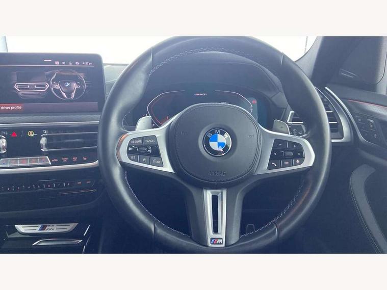 Active Guard, Attentiveness assist, BMW Live Cockpit Professional nav system including 12.3" instrument display + 12.3 high resolution control display, BMW Online services, BMW Teleservices, Brake pad wear indicator in front and rear, Check Control warning system for monitoring of lights and door/luggage compartment open warning, Condition based service - BMW service history, electronic service booklet, integrated owner's handbook, Connected drive services, Deletion of driving assistant professional, Electric boot lid, Front/rear Parking distance control, iDrive Controller with 8 favourite buttons, Instrument cluster with speedometer with mph readout, tachometer, fuel gauge and oil temperature gauge, Lights on warning by audio warning signal when ignition is switched off, Oil sensor for level and grade, warning by check control system, On board computer - average speed+fuel consumption, service interval, clock/date, odometer/trip meter, outside temperature display and ice warning, Optimum shift indicator, Personal Profile - automatic lock when driving away selectable, Stop/start system, Variable sports power steering, Drive performance control with ECO PRO comfort + sport mode, Incorrect fuelling protection, M Adaptive suspension, M Sport differential, Multi-link rear suspension, Performance Control, Sport automatic transmission with gearshift paddles, BMW professional radio/CD/MP3, DAB tuner, Acoustic glazing, Automatic windscreen wipers and automatic headlight, Black finish on B pillars, BMW individual high gloss shadow line with extended content, Body colour door handles, Body colour roof mouldings, Body coloured bumpers, Direction indicator, side repeaters, integrated in exterior mirrors, Dynamic brake lights, Electric adjust heated aspherical door mirrors, Exhaust tailpipes - dual, round, split left and right with chrome finisher, Fingertip control / anti-trap function on electric window, Folding wing mirrors with auto dimming, Follow me home headlights, Front and rear bumper system with replaceable deformation elements, Front and rear electric windows, Green tinted heat insulating glass, Heated windscreen washer jets, High beam assistant, High gloss black shadow line roof rails, High gloss shadowline exterior trim in decorative moulding side frame/recess cover/guide rail/B, C pillars/mirror frame and triangle with mirror base, High level 3rd brake light incorporating LED Technology, Interior rear view electrochromatic mirror with automatic anti dazzle function, Kidney frame and struts painted in high gloss black, LED tail lights, Lightweight engineering, M aerodynamic bodystyling, M black mirror caps, Model designation, Rear side wing doors, Rear wing door, Rear wiper, Shark fin antenna, Side exterior M designation badges, Sun protection glass, Visible VIN plate, Welcome lighting, Windscreen wipers with adjustable interval, 12V power socket in front centre console, 3 rear headrests, 3 zone automatic air conditioning, 4 lashing points to secure luggage, 40:20:40 split folding rear seat with loading system, 5 seats, Ambient lighting, Anthracite headlining, Automatic interior light when door is opened/ignition switched off or via remote key, Electric adjustable seats with memory function, Foldable storage floor with compartment, Four grab handles integrated in roof lining, Front and rear bottle holders integrated into door trim storage compartments, Front and rear side armrests integrated into door trim, Front centre armrest with storage compartment, Front footwell lights, Front head restraints, Front/rear courtesy lights with soft on/off dimming, Front/rear reading lights, Heated front seats, Isofix rear child seat preparation, Leather gear knob, Luggage area underfloor compartment, Luggage compartment lighting, M sport leather steering wheel, Multifunction steering wheel, Parcel shelf removeable and storable under boot floor, Reach and rake adjustable steering column, Rear centre armrest with 2 cupholders, Removable / retractable luggage cover, Slope adjustable rear seats, Storage compartment in rear centre console and front/rear door trims, Sun visors with vanity mirrors and ticket pocket, Toolkit located in luggage compartment, Two front cupholders with removable oddments tray/lid, Vernasca leather upholstery, Connected pro pack - X3, Active protection, ADB - Automatic Differential Brake, Anti-lock braking system (ABS) with brake assist, Automatic Stability Control (ASC), Battery safety cut-off, BMW emergency call, Brake drying, Brake energy regeneration, Braking pre-tensioning, Child locks on rear doors, Cornering brake control (CBC), Crash Sensor - activation of central locking release, hazard warning light and interior lighting, Deactivation of fuel pump in the event of a crash, Driver and front passenger front and side airbags with passenger deactivation and ITS front and rear head airbags, DSC+, Dynamic brake control, Dynamic Traction Control - DTC, Electromechanical parking brake, Hill descent control, Hill start assist, M sport seatbelt, Seatbelt security check for front seats, Side impact protection, Three point seatbelts to all seats with front and outer rear pyrotechnic belt tensioners and seat belt force limiters, Two tone horn, Tyre pressure sensor, Ventilated front and rear disc brakes, Warning triangle and first aid kit, Central locking switch for all doors, fuel filler cap and luggage compartment, Electronic engine immobiliser, Locking wheel nuts, Remote control including two integrated key - one button for open/close all lockable content, windows and separate button for open luggage compartment, Remote control Thatcham category 1 alarm, Start/stop button with Comfort Go keyless engine start and auto Start/stop deactivation button, Sensatec dashboard, Low rolling resistance tyres,