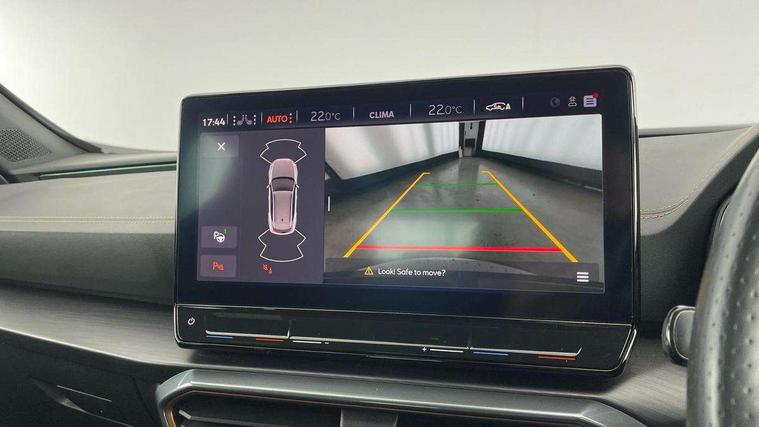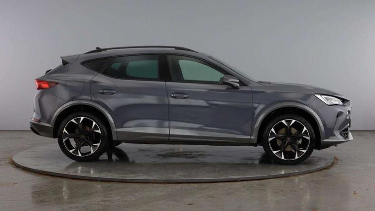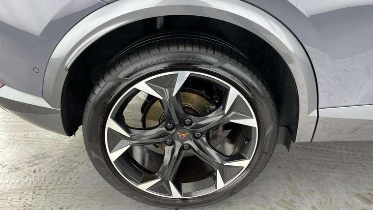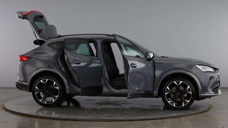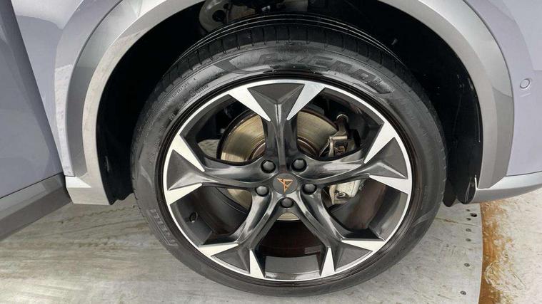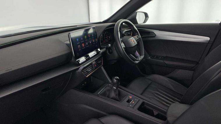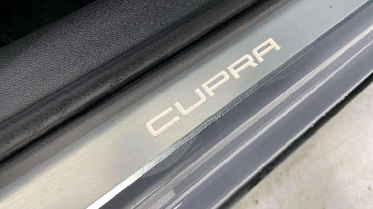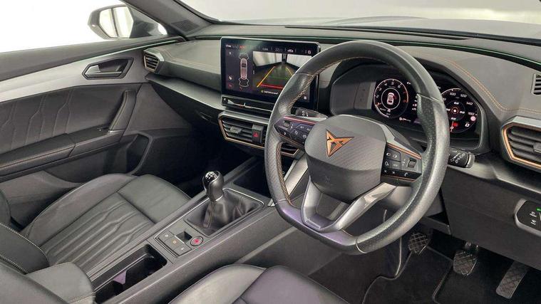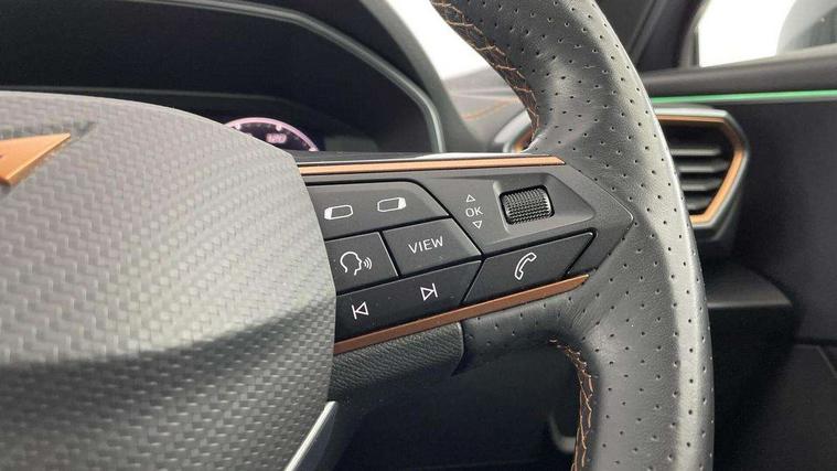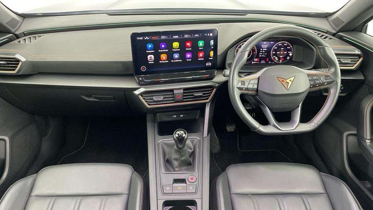 Digital cockpit and configurable dashboard, Driver alert system, Driving profile selection, E-call, Forward collision warning with automatic braking, Lane assist, Navigation system with 12'' Touchscreen Display, Park assist (inc front/rear parking sensors), PAS, Predictive adaptive cruise control with speed limiter, Rear view camera, RPM, trip computer, outside temp gauge, instrument light brightness, low fuel warning light, lights on reminder, gearshift indicator, Service interval indicator, Start/stop system with regenerative braking, Voice control system, Wireless apple carplay, Wireless phone charger, Electronic locking differential and dynamic traction support, Standard suspension, 2 front and 2 rear USB type C sockets, Auxiliary input socket, DAB radio, Auto dimming rear view mirror, Body colour door handles, Body coloured bumpers, Dark grey wing mirror, Daytime running light with automatic headlight control and coming home feature, Dynamic headlight range control, Electric front/rear windows, Electrically adjustable heated and folding door mirrors with memory function, Front fog lamps with cornering function, Gloss black roof rails and window surrounds, LED Headlights, LED Taillights with dynamic indicator, Rain sensing wipers, Rear diffuser with black simulated exhaust pipes, Rear side wing doors, Rear wash/wipe, Third brake light, Tinted rear windows, Welcome lights, 12v power supply in centre console, 12V socket, 12v socket in loadspace, 2 front and 2 rear reading lights, 230V socket, 3 seat bench in 2nd row, 60/40 split rear bench seat with armrest and mechanical seat release, Black headlining, Dust/pollen filter, Front and rear head restraints, Front centre armrest, Height/reach adjust steering wheel, Illuminated interior front door sills, Illuminated sunvisor with mirror, Isofix, Leather multi function steering wheel, Luggage tie-down hooks, Single front passenger seat, Three zone climate control with control panel in rear, Variable luggage/load compartment floor, Wraparound lighting, Genuine Nappa leather Pack - Cupra, Safety and driving pack (M) - Formentor, 3 point seatbelts on all rear seats, ABS, Brake control system - ESC and brake booster, Child proof door locks, Driver and front passenger airbags with front passenger airbag de-activation, Electronic parking brake, Front and rear disc brakes, Front side curtain airbags, Hill hold control, Seat belt reminder for front and rear seats, Tyre pressure monitoring system, Anti theft alarm system, Keyless entry and start system (KESSY), Locking wheel bolts, Copper and aluminium interior detailing, 19" 'Exclusive' machined sport matte black and silver alloy wheels,