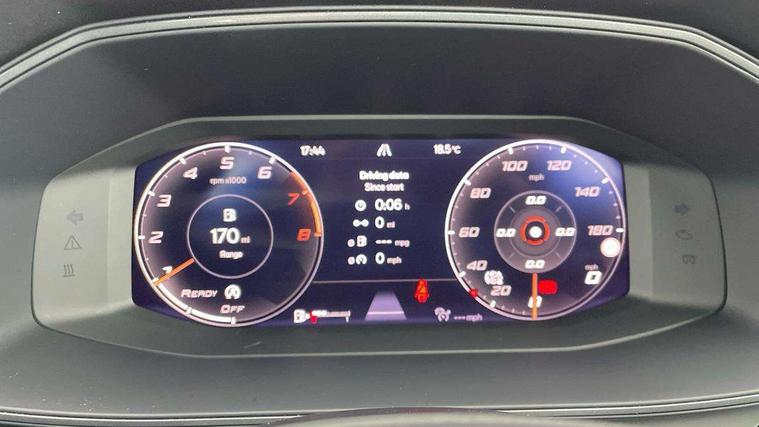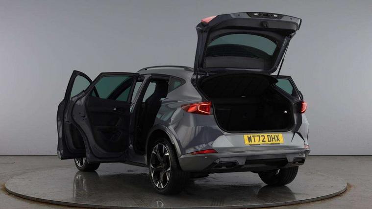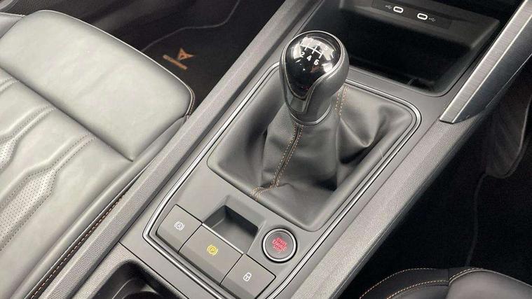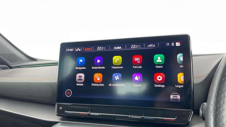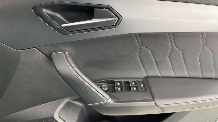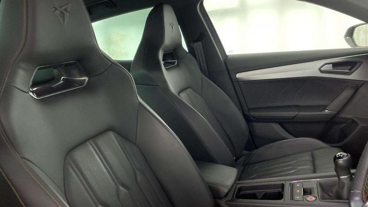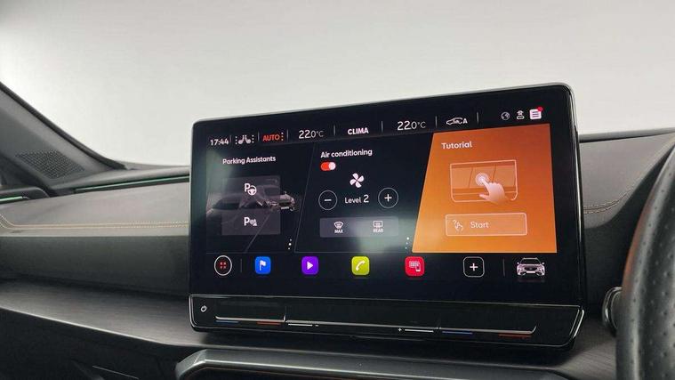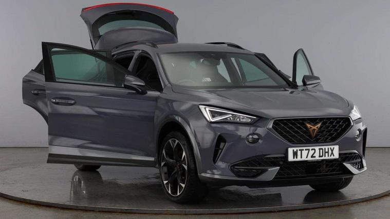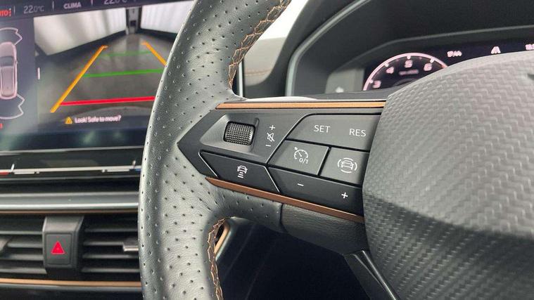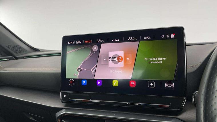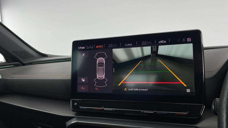 Digital cockpit and configurable dashboard, Driver alert system, Driving profile selection, E-call, Forward collision warning with automatic braking, Lane assist, Navigation system with 12'' Touchscreen Display, Park assist (inc front/rear parking sensors), PAS, Predictive adaptive cruise control with speed limiter, Rear view camera, RPM, trip computer, outside temp gauge, instrument light brightness, low fuel warning light, lights on reminder, gearshift indicator, Service interval indicator, Start/stop system with regenerative braking, Voice control system, Wireless apple carplay, Wireless phone charger, Electronic locking differential and dynamic traction support, Standard suspension, 2 front and 2 rear USB type C sockets, Auxiliary input socket, DAB radio, Auto dimming rear view mirror, Body colour door handles, Body coloured bumpers, Dark grey wing mirror, Daytime running light with automatic headlight control and coming home feature, Dynamic headlight range control, Electric front/rear windows, Electrically adjustable heated and folding door mirrors with memory function, Front fog lamps with cornering function, Gloss black roof rails and window surrounds, LED Headlights, LED Taillights with dynamic indicator, Rain sensing wipers, Rear diffuser with black simulated exhaust pipes, Rear side wing doors, Rear wash/wipe, Third brake light, Tinted rear windows, Welcome lights, 12v power supply in centre console, 12V socket, 12v socket in loadspace, 2 front and 2 rear reading lights, 230V socket, 3 seat bench in 2nd row, 60/40 split rear bench seat with armrest and mechanical seat release, Black headlining, Dust/pollen filter, Front and rear head restraints, Front centre armrest, Height/reach adjust steering wheel, Illuminated interior front door sills, Illuminated sunvisor with mirror, Isofix, Leather multi function steering wheel, Luggage tie-down hooks, Single front passenger seat, Three zone climate control with control panel in rear, Variable luggage/load compartment floor, Wraparound lighting, Genuine Nappa leather Pack - Cupra, Safety and driving pack (M) - Formentor, 3 point seatbelts on all rear seats, ABS, Brake control system - ESC and brake booster, Child proof door locks, Driver and front passenger airbags with front passenger airbag de-activation, Electronic parking brake, Front and rear disc brakes, Front side curtain airbags, Hill hold control, Seat belt reminder for front and rear seats, Tyre pressure monitoring system, Anti theft alarm system, Keyless entry and start system (KESSY), Locking wheel bolts, Copper and aluminium interior detailing, 19" 'Exclusive' machined sport matte black and silver alloy wheels,