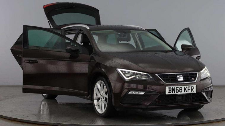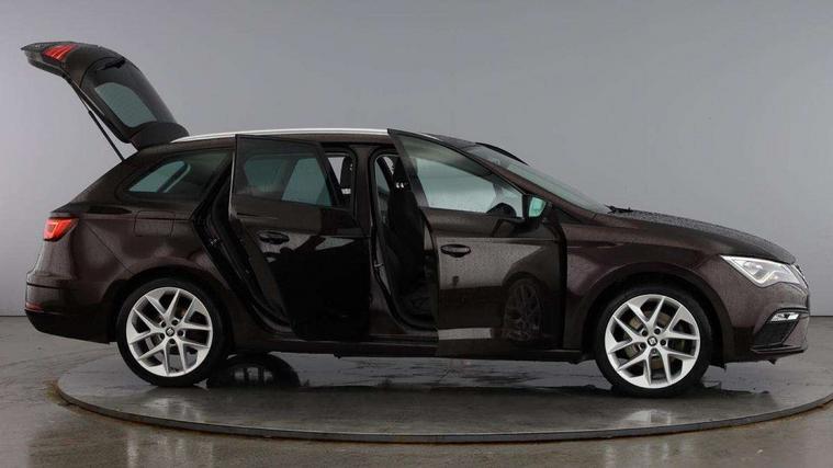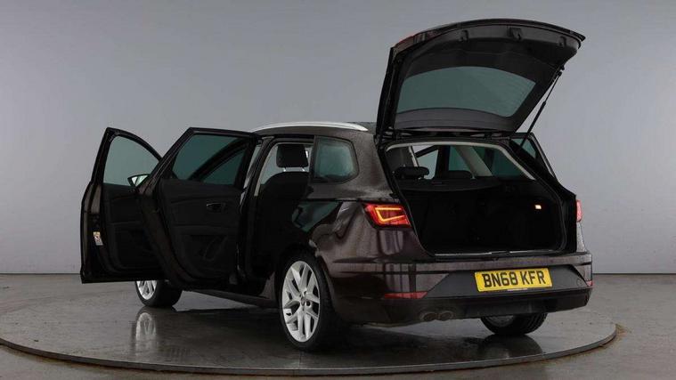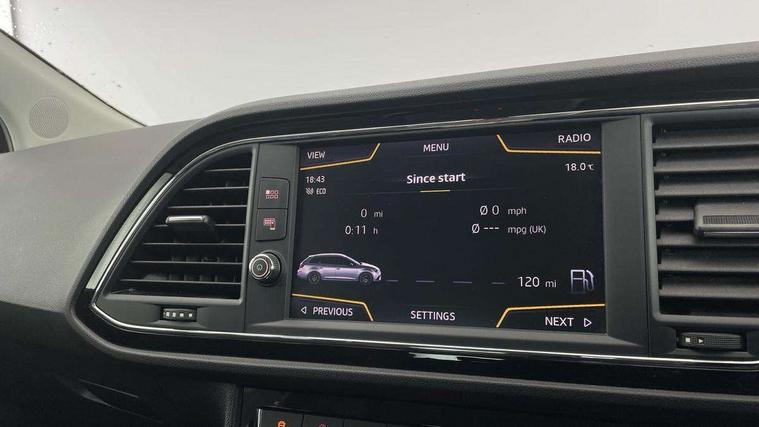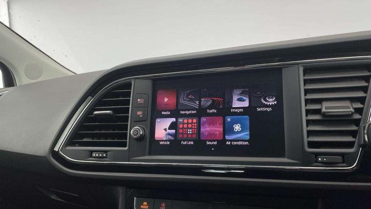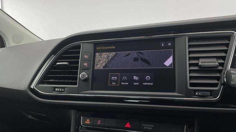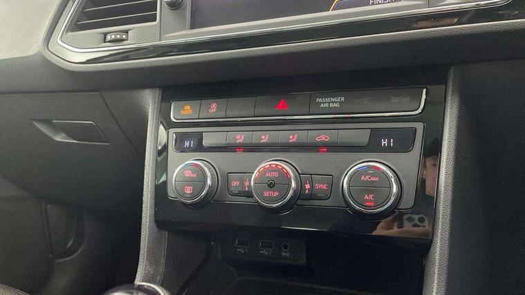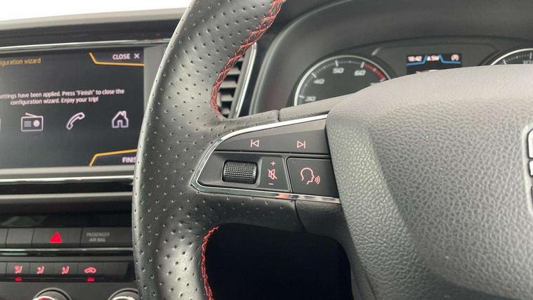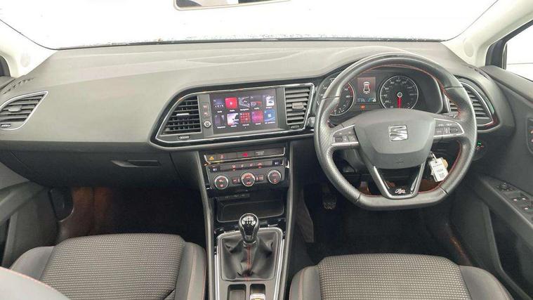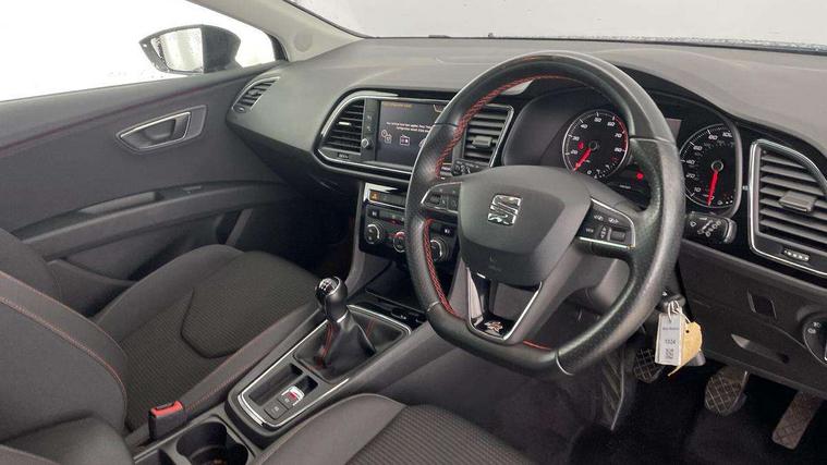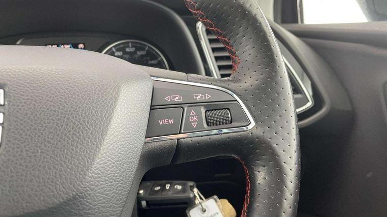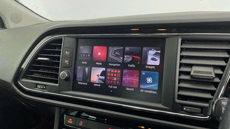'Lights On' Reminder warning buzzer, 8" touch screen, Bluetooth Handsfree Phone Connection, Low fuel warning light, Outside temperature gauge, Rear parking sensors, Remote fuel flap release, SEAT Drive profile, SEAT logo boot release, Service interval indicator, Trip computer, Voice control system, XDS electronic differential lock, 2 USB ports, 2 USB sockets in rear, 2x SD card slot, Auxiliary input socket, Bluetooth audio streaming, DAB Digital radio, Radio/CD + MP3, Steering wheel mounted audio/phone controls, Aluminium front door sills, Black grille with chrome surround, Body colour door handles, Body coloured bumpers, Body coloured door mirrors, Dark tinted rear windows, Electric adjustable/heated/folding door mirrors, Electric front/rear windows with one touch/auto up/down, Electric headlamp adjustment, High gloss black finish B and C pillars, LED daytime running lights, LED front fog lights, LED Headlights, LED indicators in door mirrors, LED number plate light, LED tail lights, Rear wash/wipe, Reverse activated kerb-view adjustment on passenger's door mirror, Twin exhaust pipes, 12v power point in centre console, 3 height adjustable rear headrests, 60/40 split folding rear seat, Active head restraints, Additional heating and ventilation outlet in rear of centre console, Boot net, Chrome loading sill, Double boot floor, Driver seat height adjust, Driver seat lumbar adjustment, Driver/passenger sunvisors with illuminated vanity mirrors, Dual zone climate control, Dust/pollen filter, Front adjustable head restraints, Front armrest with storage box, Front cupholders x 2, Front seat and rear pockets, Front sports seats, Front/rear floor mats, Height/reach adjust steering wheel, Illuminated boot, Illuminated door sills, Illuminated glovebox, Instrument lighting with brightness control, Leather handbrake, Luggage compartment cover, Luggage tie-down hooks, Passenger seat height adjuster, Passenger seat lumbar adjust, Perforated leather steering wheel with red stitching + gear knob, Rear top tether child seat ISOFIX attachment, Rear window curtains, Storage boxes under front seats, 3 point seatbelts on all rear seats, ABS + traction control, Active pedestrian safety system, Child proof door locks, Collision mitigation braking system, Curtain airbags, Driver/Front Passenger airbags, Drivers knee airbag, Electronic parking brake with auto hold, ESP+EBA, Front assist including city emergency braking, Front seatbelt pretensioners, Front Seatbelt warning, Front side airbags, Hill hold control, Passenger airbag deactivation system, Tyre pressure monitoring system, 2 folding remote keys with window open/close function, Engine immobiliser, Locking wheel bolts, Remote central locking + deadlocks, Volumetric alarm with back up horn, Chrome interior trim,