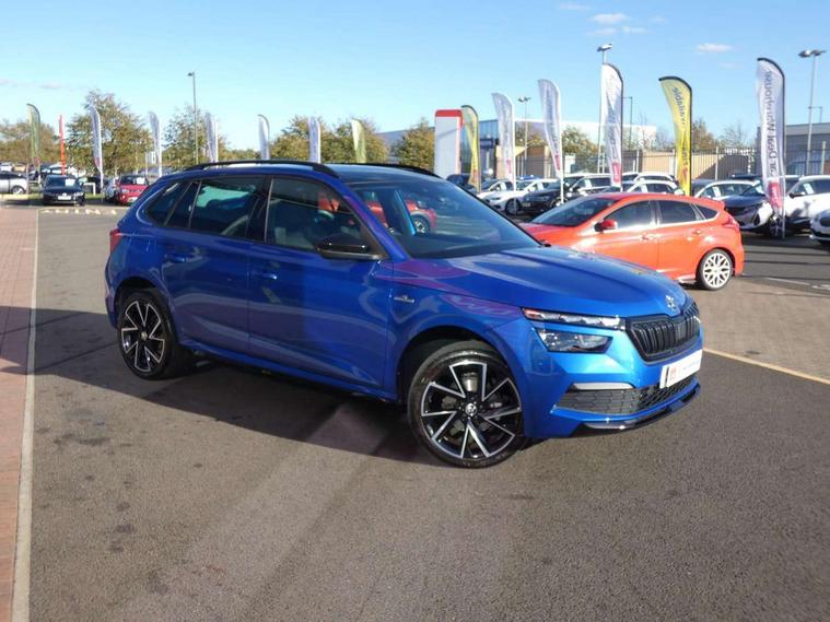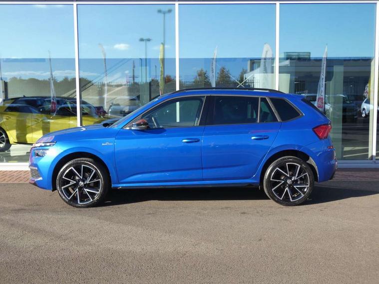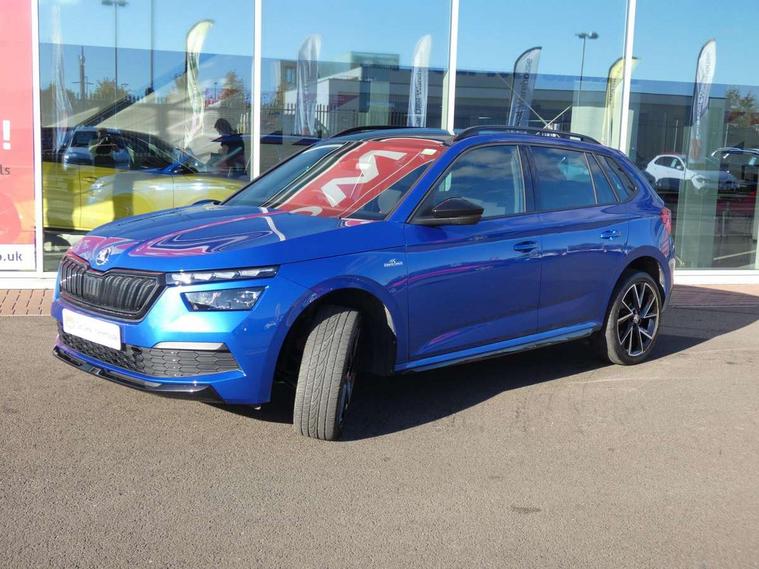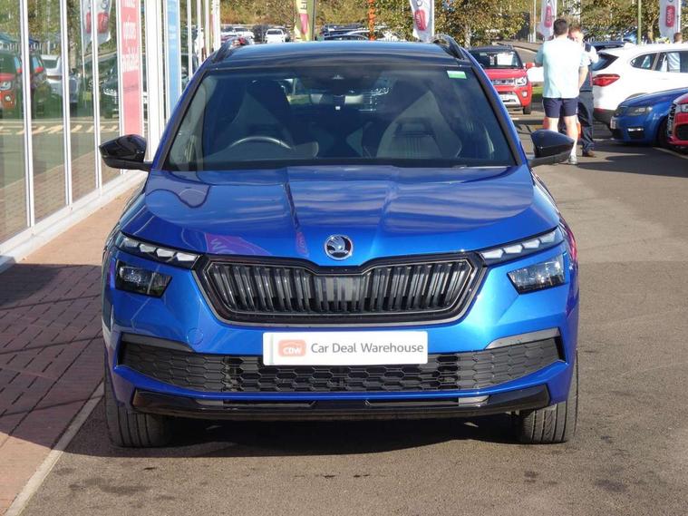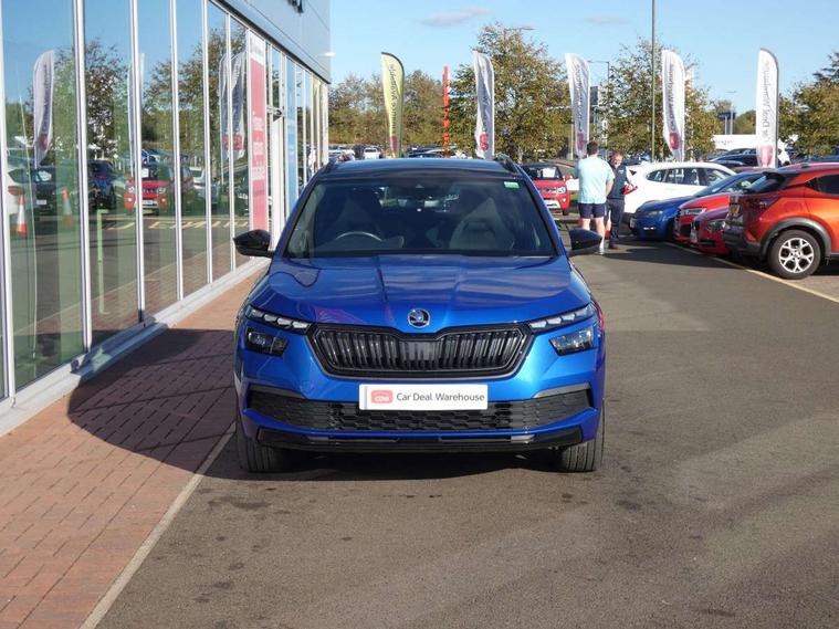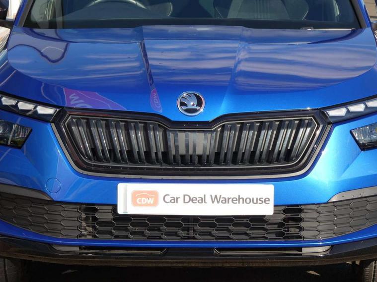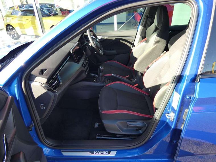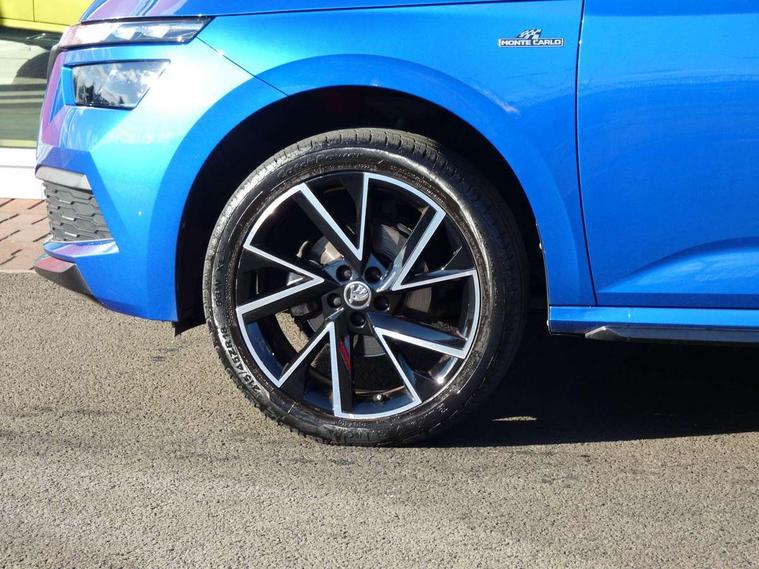 Amundsen satellite navigation with 9.2" touchscreen display, voice control, virtual cockpit and web radio, Bluetooth system, E-call, Front assist system, Gesture control, PAS, Service indicator, Speed limiter, Virtual cockpit with 10.25" display, Wireless SmartLink for apple car play, android auto and mirrorlink, 8 Speakers, Auxiliary input socket, DAB Digital radio, Black door mirrors, Black radiator grille, Black rear diffuser, Body colour bumpers, Body colour door handles, Body colour roof spoiler, Boot lettering in black, Chrome grille surround, Dimming rear view mirror with black surround, Electrically adjustable and heated door mirrors, Front and rear electric windows, Front sport bumper, Full LED headlights with adaptive front light system, dynamic indicators, cornering function and fog lights, Headlight range control, Heated rear window, High functionality rear led lights with dynamic indicators, KAMIQ Door sills, Light sensors, Monte carlo plaque, Panoramic sunroof with black roof rails, Privacy glass, Rear fog lights, Rear side wing doors, Rear wiper, 12V Accessory socket in centre console, 3 seat bench in 2nd row, Aluminium pedals, Black ceiling for black/beige interior, Chrome inner door handles, Cloth upholstery, Front head restraints, Glove compartment with illumination, Ice scraper, Isofix child seat fittings on outer rear seats, ISOFIX on front passenger seat, Leather gear lever, Manual lumbar support for front seats, Rake/reach adjustable steering wheel, Reading lights, Single front passenger seat, Sports seats, Sun visors with illumination on front passenger, Textile floor mats, Third rear headrest, Top tether for front passenger seat, Umbrella in driver's door, 3x3 point rear seatbelts, Airbags - driver and front passenger, ESP, Front passenger airbag deactivation switch, Front side airbags with curtain airbags, Hill hold control, Manual parking brake, Manual rear child locks, One tone horn, Rear disc brakes, Seatbelt reminder for driver an co-driver, Traction control, Tyre pressure monitor, Anti-theft alarm system with interior monitoring, backup horn, towing protection and remote central locking with SAFE system, Anti-theft wheel bolts, Electronic engine immobilizer, Chrome air vent surrounds, 18" Vega alloy wheels in black,