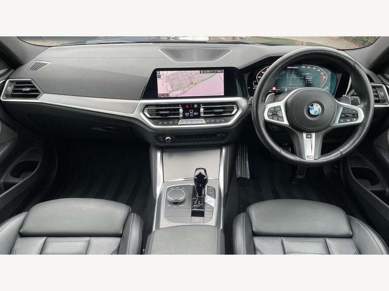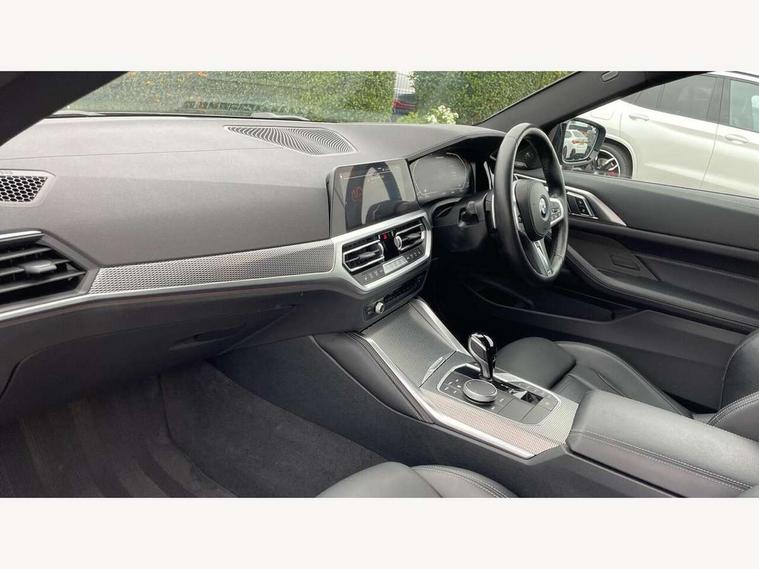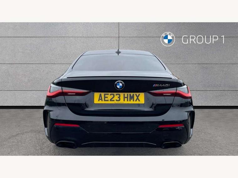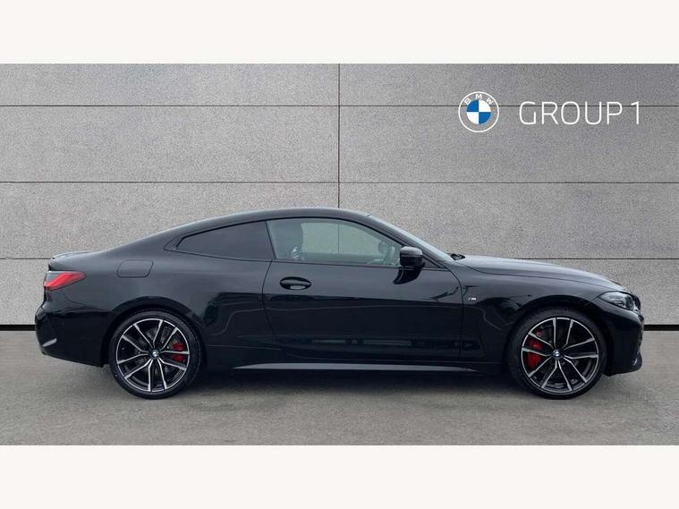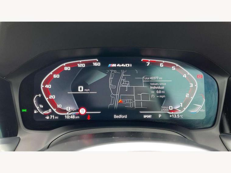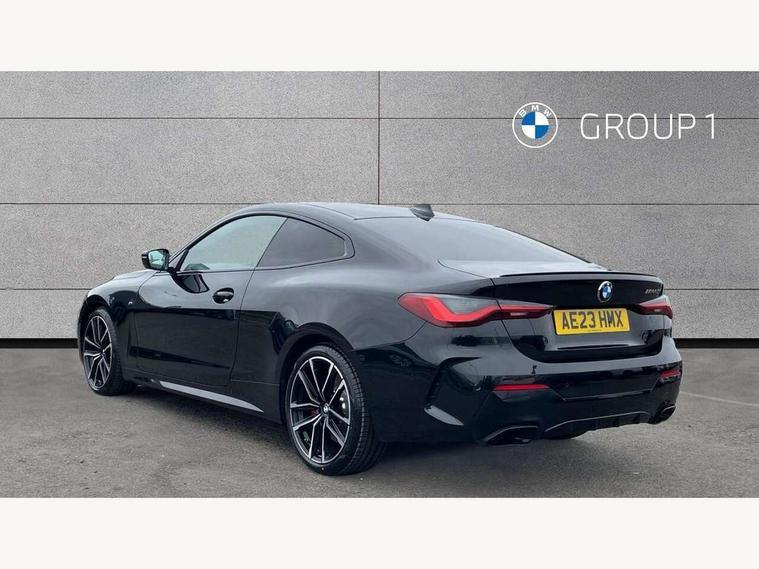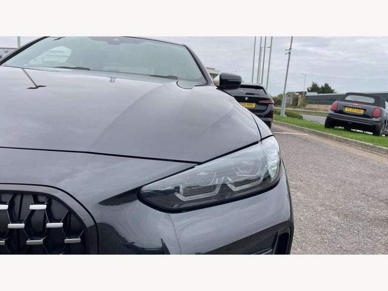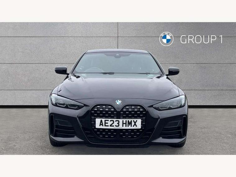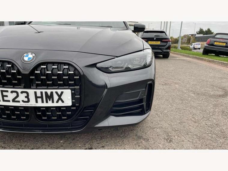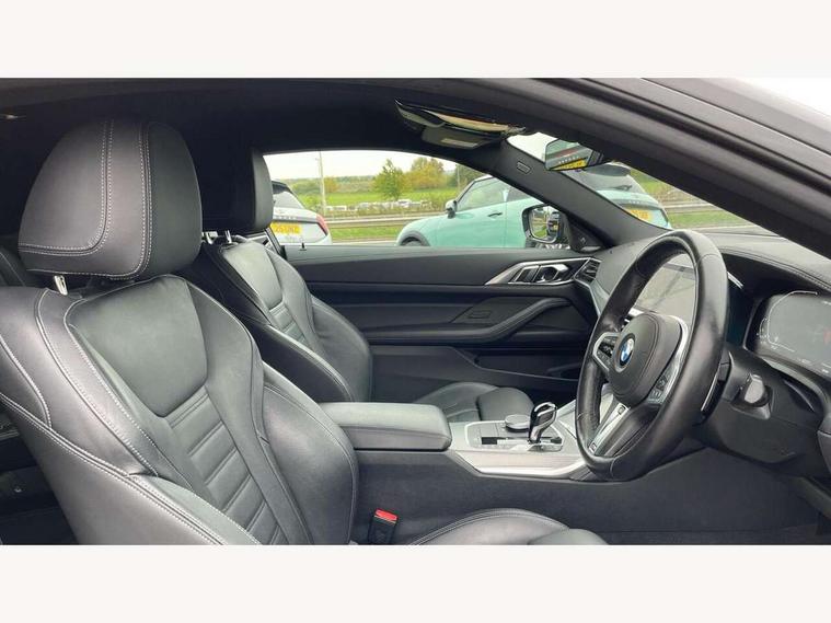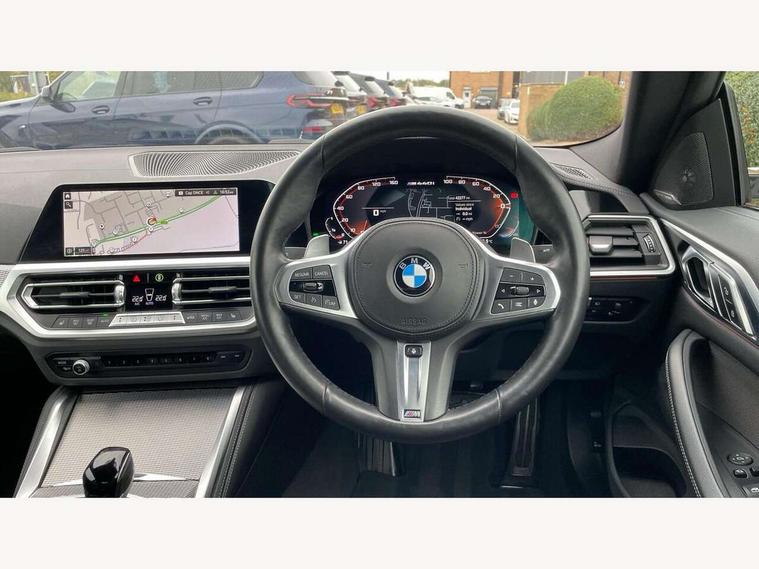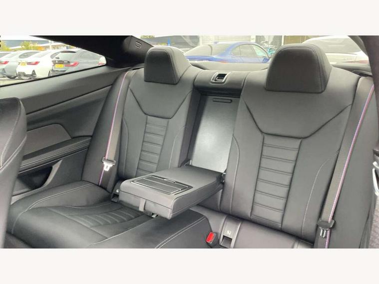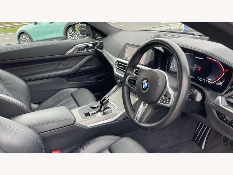 Active guard plus, Attentiveness assist, Auto start-stop, Bluetooth hands free facility with USB audio interface with audio streaming, BMW ConnectedDrive online services, BMW iDrive controller on centre console, BMW service history, BMW Teleservices, Brake pad wear indicator in front and rear, Check Control warning system for monitoring of lights and door/luggage compartment open warning, Condition based service, Electric power steering with Servotronic steering optimised at all speed ranges, Gearshift time display in manual mode, Instrument cluster with speedometer with mph readout, tachometer, fuel gauge and oil temperature gauge, Integrated owners handbook, Oil sensor for level and grade, warning by check control system, On board computer - average speed, fuel consumption, outside temp display with acoustic warning, clock/date, service interval, odometer/trip meter, Optimum shift indicator, Run flat indicator, Shifting point display, Variable sport steering, 48V Mild hybrid technology, 8 speed automatic steptronic transmission with gearshift paddles, Adaptive M suspension, Balanced 50/50 weight distribution, Double joint spring strut front axle, Drive performance control - ECO PRO, comfort and sport modes, Low centre of gravity, M Sport differential, Petrol Particulate Filter, Stroke dependent dampers, xDrive system permanent all-wheel drive variable torque distribution, 2x USB Type C ports in front centre console for charging and data transfer, 2x USB Type C ports in rear centre console for charging, DAB tuner, Electronic service booklet, 3rd brake light, Acoustic glazing, Automatic headlight beam throw control with load dependent regulating reaction, dynamic compensation of braking dive and acceleration squat, Automatic windscreen wipers and automatic headlight, Automatically dimming electrochromatic rear view mirror, BMW emblem on engine compartment lid and tailgate, Body colour fuel filler flap, Body colour roof fin, Brushed aluminium inserts in the front door sill finishers with BMW designation, Door sill strips, Dynamic brake lights, Electric windows - front and rear, with open/close fingertip control, anti trap facility and comfort closing function all round, Exterior mirrors - electrically folding with anti-dazzle, Fading support, Follow me home headlights, Front and rear bumper system, Front apron plastic in body colour, Green tinted heat protection glazing, High gloss shadow line exterior trim, Illuminated bow type door handles in body colour drivers side with door lock, Interior rear view electrochromatic mirror with automatic anti dazzle function, LED daytime running lights, LED front indicators, Licence plate panel integrated into front bumper and tailgate, Lightweight engineering, M designation on front side panels, left and right, Model designation on right side of tailgate, One piece front bumper cover including towing eye cover in body colour, Preparation for high beam assistant, Rear boot, Reversing light, Side frame decorative moulding black matt, Sun protection glass, Two part LED tailights in L-shape with components in smoked glass, brake light, LED turn indicator and rear fog light, Visible exhaust tailpipe finisher, Visible VIN plate, Welcome lights in interior and door handle area, Widened track and increased camber values for max transverse dynamics, agility and steering precision, Window recess cover black high gloss, Windscreen wipers with integrated heated washing jets, xDrive designation on left tailgate, 12V power socket in front centre console, 2 front cupholder in centre console with clamping elements and matt black inlay, 2 Rear seat headrests, 2 seat bench in second row, 3 spoke M sport leather multifunction steering wheel, 3 zone automatic air conditioning, 4 pieces lashing eyelets in luggage compartment, 40:20:40 split folding rear seat and rear centre armrest with two cupholders, Anthracite headlining, Armrest integrated in front and rear door trim + front centre console armrest, Battery in luggage compartment, BMW ID, Extended storage - Luggage compartment partition net on left side trim panel, Bag hook on both sides of the luggage compartment, Four grab handles integrated in roof lining, Front and rear door pockets, Front and rear reading lights, Heated driver and front passenger seats, Height adjustable front headrests, Height adjustable mechanically and infinitely variable steering column, Illuminated armrest storage compartment, Illuminated glove compartment with separate small compartment, Make-up mirror lights, Single front passenger seat, Storage compartment in rear centre console, Sunvisors with illuminated vanity mirrors and ticket pocket, Toolkit located in luggage compartment, Velour front floor mats, Ambient lighting pack - 4 Series, Connected professional package - 4 Series, M sport exterior styling pack - 4 Series M440i, 2 x 3-point rear seatbelts, Battery safety cut-off, BMW emergency call, Brake energy regeneration, Braking pre-tensioning, Child seat ISOFIX attachment for the two outer rear seats, Coasting in idle in ECO PRO mode, Cornering brake control (CBC), Crash sensor activating of airbags, Unlocking doors, hazard warning lights, fuel cut off, interior lighting+activation of safety battery terminal clamp, Driver and front passenger side airbags, integrated in the door side seat backrest bolsters for all seat variants, Driver/Front Passenger airbags, Dry braking, Dynamic brake control, Dynamic stability control + (DSC+) - Anti-lock Braking System (ABS) with brake assist and cornering brake control + Automatic Stability Control (ASC), Dynamic Traction Control - DTC, Electric parking brake including automatic hold function and automatic release of the parking brake when driving off, Electronic differential lock control (EDLC), Front and rear ventilated brake disc, Front passenger manual airbag deactivation, Head airbags for all 4 outer seats, Hill start assistant, M Sport brakes in red painted brake calipers with M designation, 