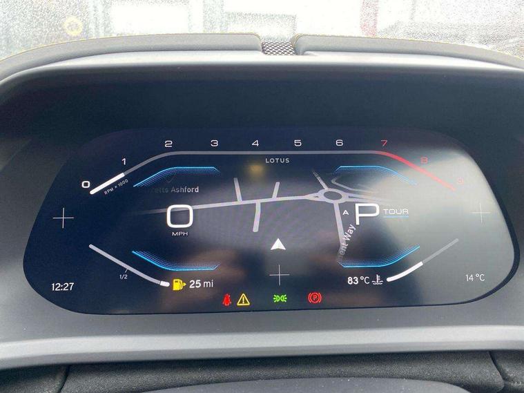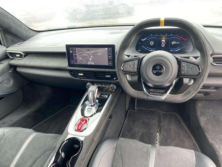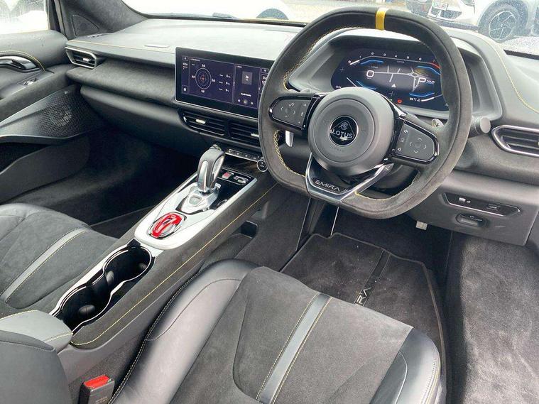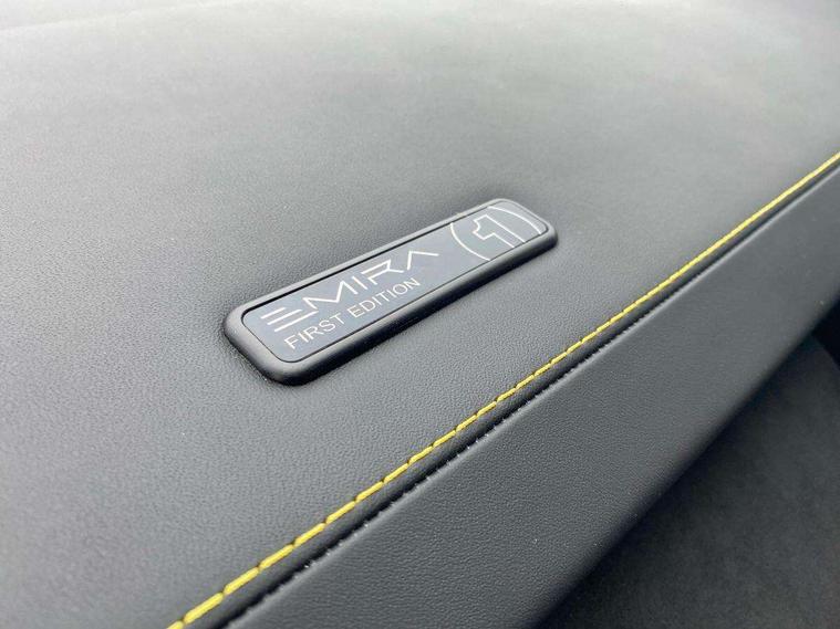 10.25" touchscreen MMI, 12.3" TFT supervision cluster display, Apple car play/Android Auto, Cruise control, Drive mode selector, eCall emergency call system, Embedded navigation system, Engine start button, Exterior temperature display, Front parking sensor, Hands free bluetooth system, Hydraulic PAS, On board diagnostics, Paddle shift with PRND selector, Rear park assist camera, Rear parking sensors, Rev counter, Service interval indicator, Speed limiter, Steering wheel with cruise control operation, Tailgate, Travel data recorder, Trip computer, Voice control system, Anti-roll bars, Exhaust particle filter, Launch control, Auxiliary input socket, Centre console media control knob, DAB Digital radio, iPod interface, KEF premium branded 10 channel audo (560w), Steering wheel audio controls, USB port, Auto dimming door mirrors, Auto dimming rear view mirror, Automatic headlight levelling, Automatic lights, Body coloured bumpers, Door mirror indicators lights, Door mirror memory, Door sill protection, Electric adjustable door mirrors, Emira branded sill kickplates, First Edition badges, Front electric windows, Initial anti-corrosion treatment, LED 3rd brake light, LED daytime running lights, LED fog lights, LED headlamps, LED indicator lights, NOx storage catalytic converter, Power folding and heated door mirrors, Rain sensor, Rear boot, Rear LED lights, Rear window heating, Tailgate demist function, Variable front intermittent wipers, Welcome home lighting, 12 way electrically adjustable front seats with driver's memory function, 12V Accessory socket, Alloy pedals, Cabin air filter, Cargo net, Central multimedia display, Centre console armrest, Coat hooks, Cup holders, Driver seat base with adjustable inclination, Driver/passenger electric lumbar adjustment, Front head restraints, Front passenger seat backrest adjust, Front sport seats, Heated seats, Height/reach adjustable steering column, Illuminated passenger vanity mirror, Luggage compartment light, Multifunction sport steering wheel, Premium black Lotus branded driver and passenger footwell over mats, Satin chrome interior trim finishers, Single front passenger seat, Single zone climate control air conditioning, Stowage - door bin, glovebox, centre console, Textile floor mats, Timed interior light, White ambient lighting, Convenience pack - Emira, Lotus drivers pack - Emira, Lower black pack - Emira, 3 point seatbelts, Anti-lock braking system (ABS), Branded brake calipers, Curtain Airbag, EBA, Electronic parking brake, Electronic Stability Programme (ESP), Emergency door unlock, Front and rear seatbelt reminder, Front seatbelt pretensioners, Front side airbags, Full size driver and passenger airbags, Height adjustable front seat belts (4 levels), Hill holder, Passenger airbag deactivate switch, Power assisted brakes, Traction control, Two piece high performance brake discs, Tyre pressure monitoring system, Alarm, Central locking, Immobiliser, Keyless Start, Locking wheel nuts, Remote central locking, Vehicle tracking system preparation, Warranty - 3 Years/Unlimited Mileage, Alcantara interior trim, Leather interior door trim, Metal finish dash trim, Metal gear selector trim, Tool kit, Tyre repair kit,