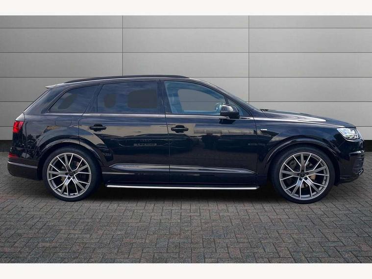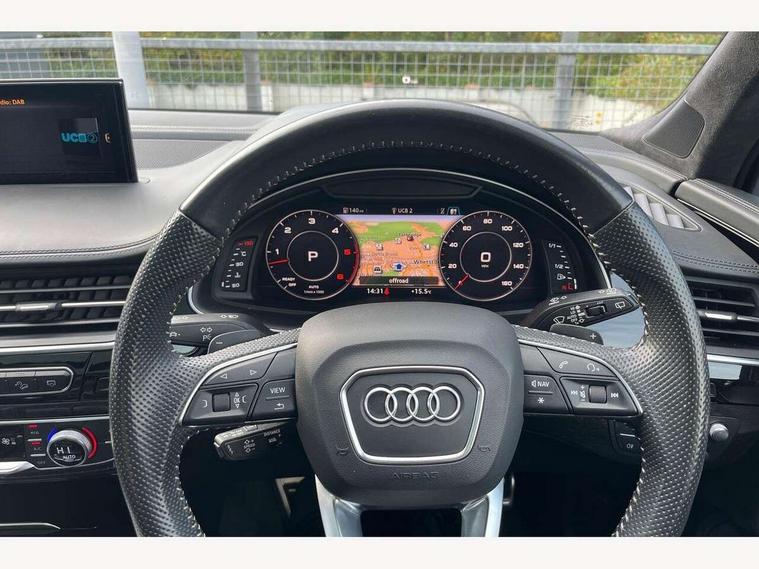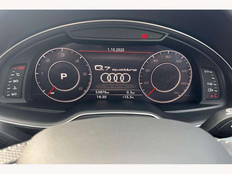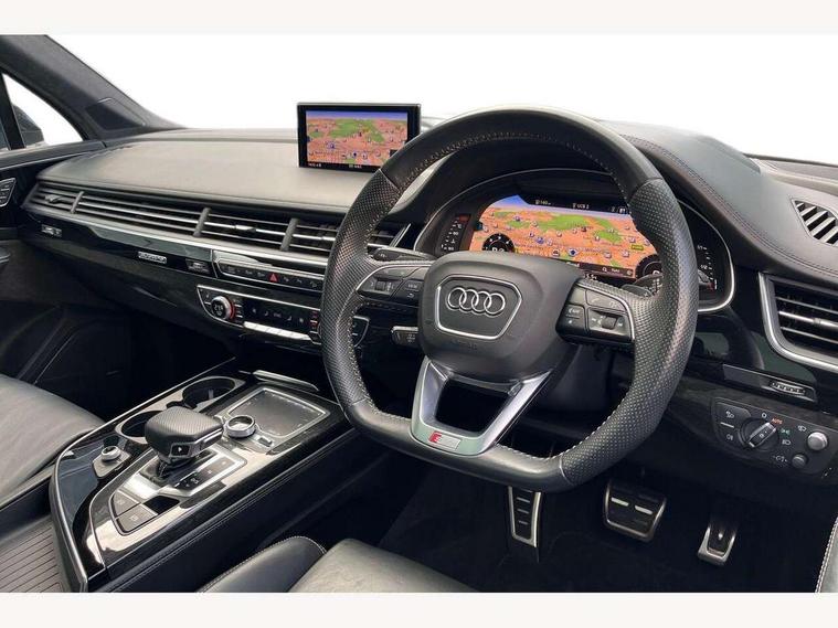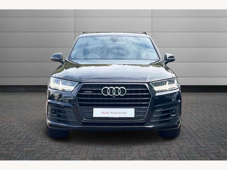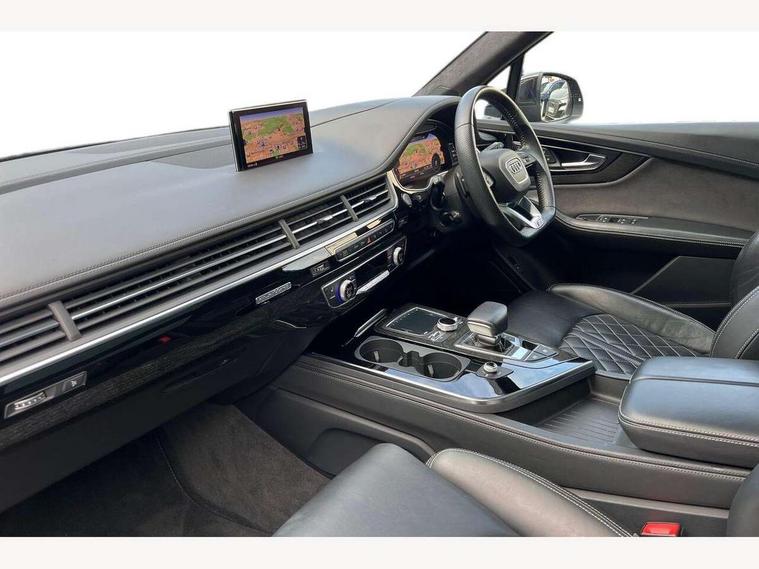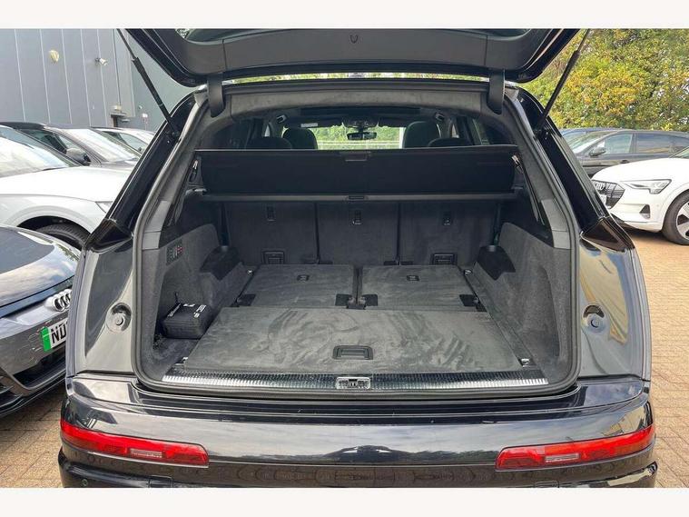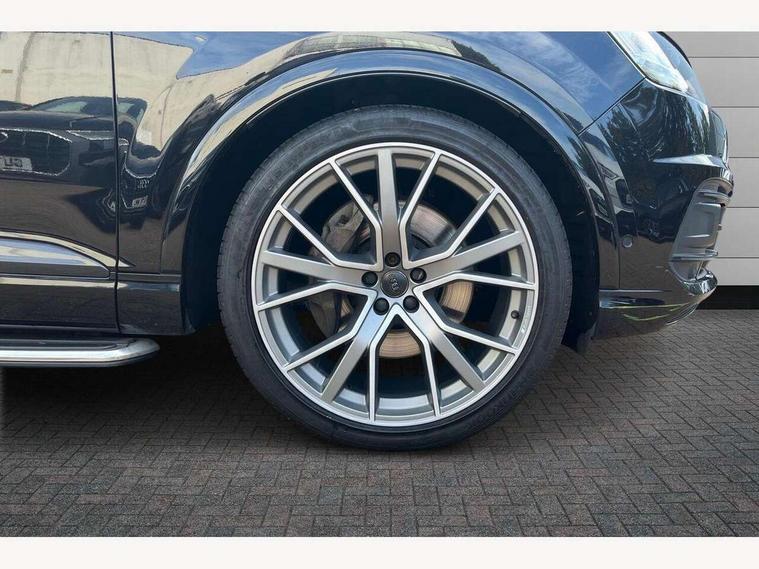8.3" central fold-down colour display with high-resolution graphics, Audi connect safety and service (e-call), Audi drive select, Audi phone box with wireless charging, Audi smartphone interface, Audi virtual cockpit - 12.3" high-resolution LCD display with fully customisable instrument cluster, Colour driver's information system display, Head up Display, MMI - Multi Media Interface control system, MMI navigation plus with MMI touch, Mobile phone preparation with bluetooth interface, Power tailgate, Service interval indicator, Servotronic speed related PAS, Speed limiter, Stop/start system, Voice control system, Adaptive air sports suspension, 2 USB ports, 2x SD card slot, Audi music interface, Aux-in socket, DAB digital radio module, DVD System, MMI radio plus, Acoustic windscreen, Audi matrix LED headlights with LED rear lights + dynamic front and rear indicators, Auto dimming rear view mirror, Body coloured bumpers, Electric front+rear windows, Electric panoramic glass sunroof, Electric/heated/folding door mirrors with memory, Green tinted heat insulating glass, Headlight washers, High beam assist, LED daytime running lights, Loading sill protector in stainless steel, Platinum grey front lip spoiler, Privacy glass, Rain and light sensors, Rear wiper, Roof spoiler, Running boards, 2 cupholders in front centre console, 35/30/35 split fold 2nd row seats, Driver and passenger seat memory, Electric 3rd row 50/50 split/fold, Electric adjustable steering column, Electrically adjustable front seats with electric 4- way lumbar support and driver memory function, Four zone electronic climate control, Front ashtray and cigar lighter, Front centre comfort armrest with storage + cupholders, Front head restraints, Front/rear floor mats, Gearshift paddles, Heated front and 2nd row seats, ISOFIX child seat mounting for 6 passenger seats with front passenger airbag deactivation includes top tether, Leather gear knob, Luggage compartment cover, Rear centre armrest with 2 cupholders, Rear headrests, Stainless steel pedals, Sunvisors with illuminated vanity mirrors, Twin sunvisors, Valcona leather upholstery + S sports seats plus, Extended LED interior multi coloured lighting pack - Q7, Full leather pack - Q7, Interior light pack - Q7, Parking pack - Q7, Titanium black styling pack - Q7, Tour Pack - Q7, 3 point seatbelts on all seats, ABS+Electronic Brake force Distribution, Curtain airbags, Driver and passenger airbags, EDL + ASR, Electrically operated child locks on rear doors, Electromechanical parking brake, Electronic stability control, ESP, Exit warning, Front side airbags, Hill descent control, Hill hold assist, Seatbelt warning, Traction control, Tyre pressure loss indicator, Warning triangle and first aid kit, Advanced key, Anti theft alarm, Anti-theft wheel bolts, Immobiliser, Keyless Go access/ignition system, Remote central locking, Chrome door inserts, 22" 5-V Spoke aluminium star design sport titanium look gloss turned finish alloy wheels, Tool kit, Tyre repair kit,