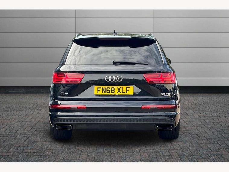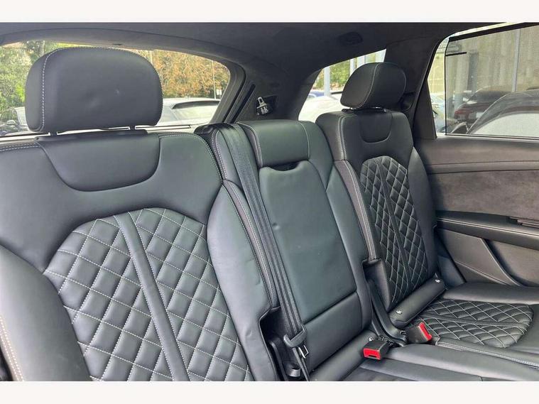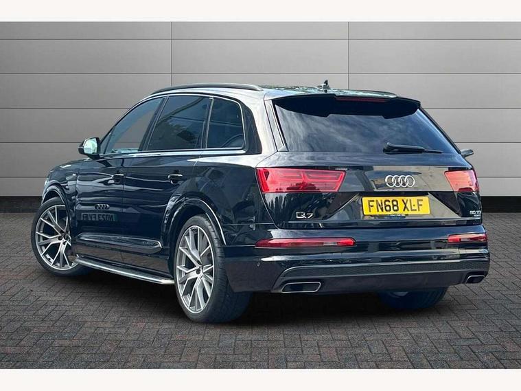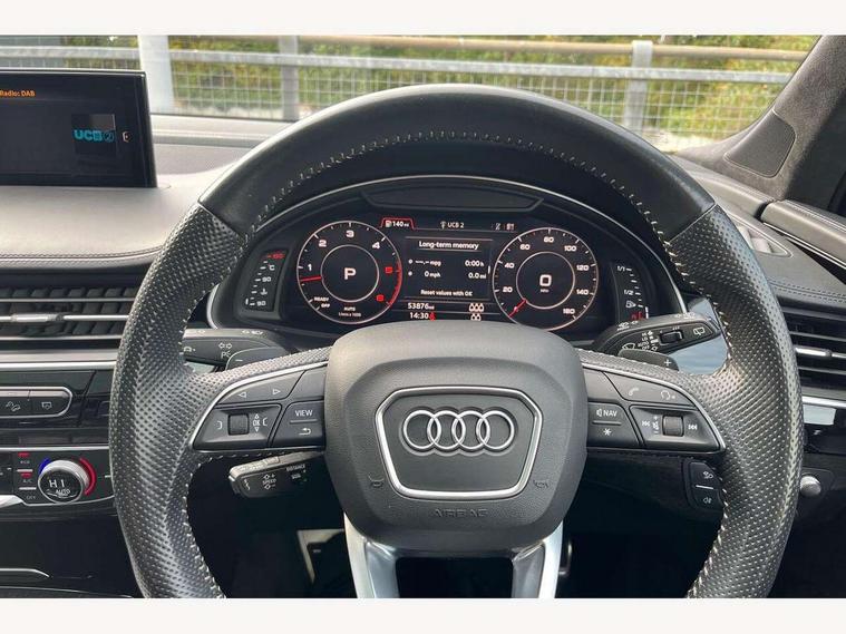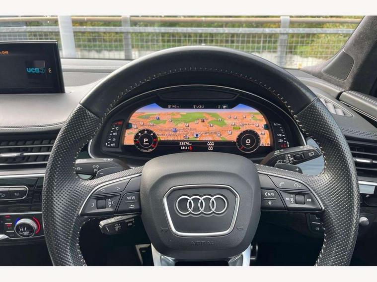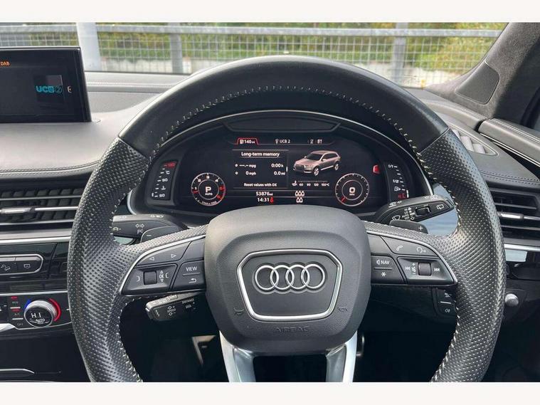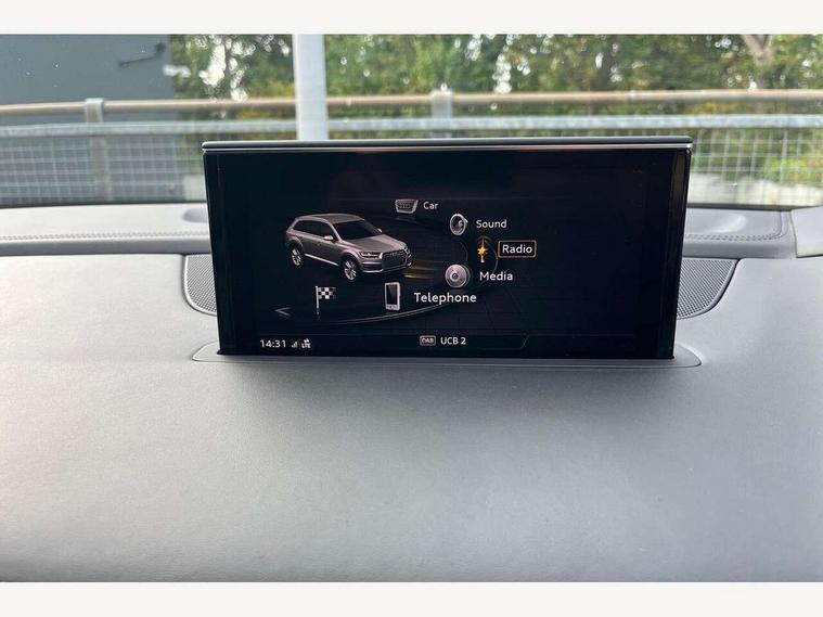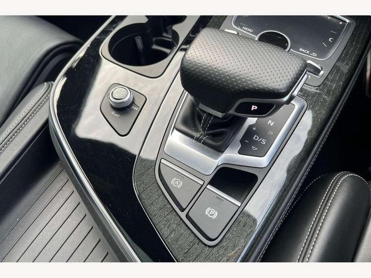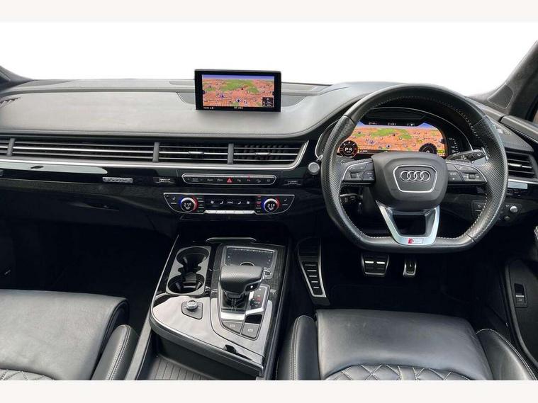 8.3" central fold-down colour display with high-resolution graphics, Audi connect safety and service (e-call), Audi drive select, Audi phone box with wireless charging, Audi smartphone interface, Audi virtual cockpit - 12.3" high-resolution LCD display with fully customisable instrument cluster, Colour driver's information system display, Head up Display, MMI - Multi Media Interface control system, MMI navigation plus with MMI touch, Mobile phone preparation with bluetooth interface, Power tailgate, Service interval indicator, Servotronic speed related PAS, Speed limiter, Stop/start system, Voice control system, Adaptive air sports suspension, 2 USB ports, 2x SD card slot, Audi music interface, Aux-in socket, DAB digital radio module, DVD System, MMI radio plus, Acoustic windscreen, Audi matrix LED headlights with LED rear lights + dynamic front and rear indicators, Auto dimming rear view mirror, Body coloured bumpers, Electric front+rear windows, Electric panoramic glass sunroof, Electric/heated/folding door mirrors with memory, Green tinted heat insulating glass, Headlight washers, High beam assist, LED daytime running lights, Loading sill protector in stainless steel, Platinum grey front lip spoiler, Privacy glass, Rain and light sensors, Rear wiper, Roof spoiler, Running boards, 2 cupholders in front centre console, 35/30/35 split fold 2nd row seats, Driver and passenger seat memory, Electric 3rd row 50/50 split/fold, Electric adjustable steering column, Electrically adjustable front seats with electric 4- way lumbar support and driver memory function, Four zone electronic climate control, Front ashtray and cigar lighter, Front centre comfort armrest with storage + cupholders, Front head restraints, Front/rear floor mats, Gearshift paddles, Heated front and 2nd row seats, ISOFIX child seat mounting for 6 passenger seats with front passenger airbag deactivation includes top tether, Leather gear knob, Luggage compartment cover, Rear centre armrest with 2 cupholders, Rear headrests, Stainless steel pedals, Sunvisors with illuminated vanity mirrors, Twin sunvisors, Valcona leather upholstery + S sports seats plus, Extended LED interior multi coloured lighting pack - Q7, Full leather pack - Q7, Interior light pack - Q7, Parking pack - Q7, Titanium black styling pack - Q7, Tour Pack - Q7, 3 point seatbelts on all seats, ABS+Electronic Brake force Distribution, Curtain airbags, Driver and passenger airbags, EDL + ASR, Electrically operated child locks on rear doors, Electromechanical parking brake, Electronic stability control, ESP, Exit warning, Front side airbags, Hill descent control, Hill hold assist, Seatbelt warning, Traction control, Tyre pressure loss indicator, Warning triangle and first aid kit, Advanced key, Anti theft alarm, Anti-theft wheel bolts, Immobiliser, Keyless Go access/ignition system, Remote central locking, Chrome door inserts, 22" 5-V Spoke aluminium star design sport titanium look gloss turned finish alloy wheels, Tool kit, Tyre repair kit,