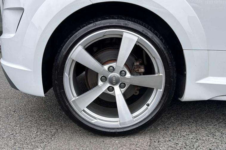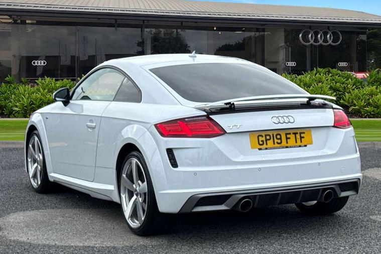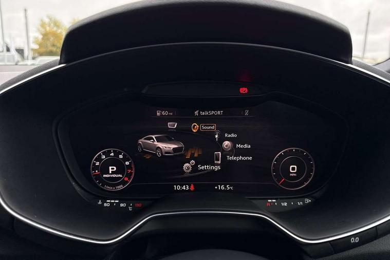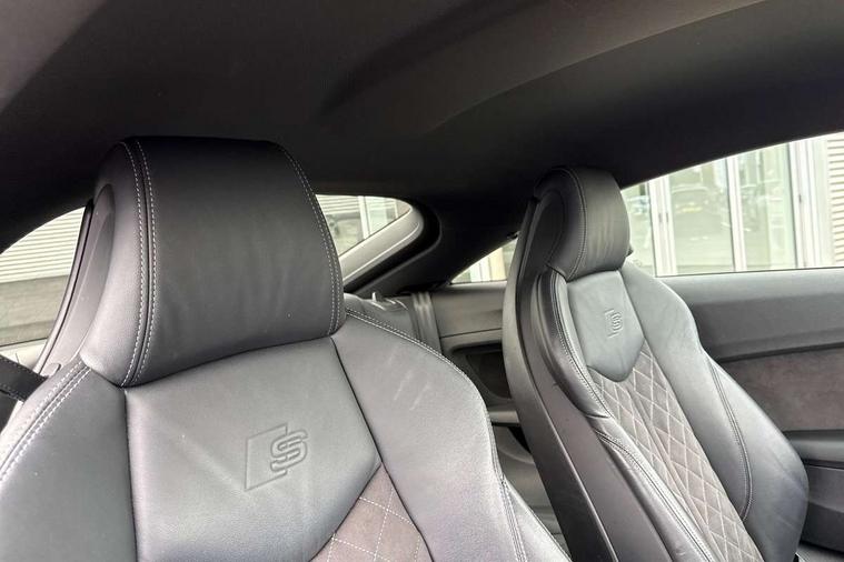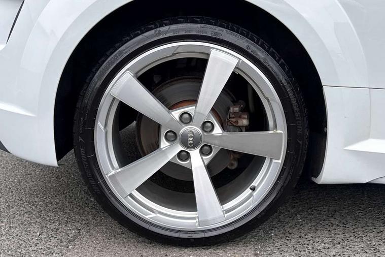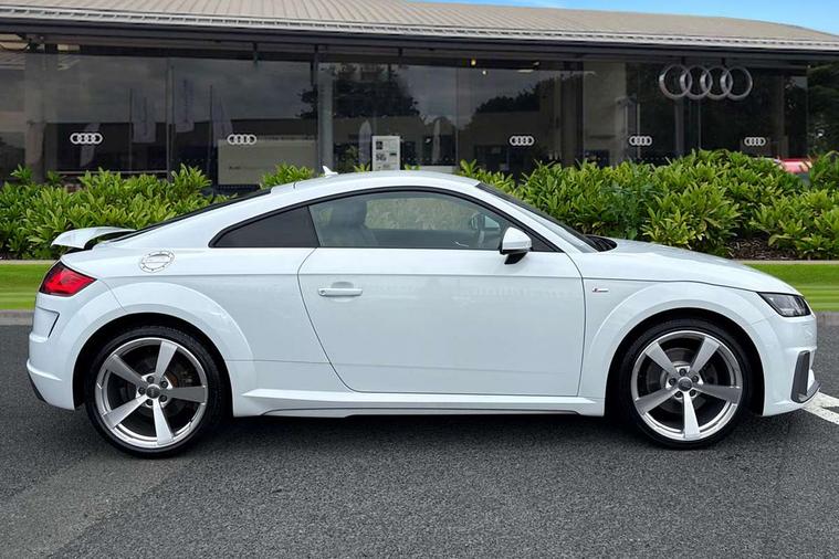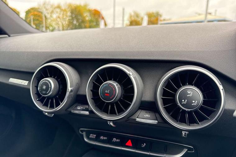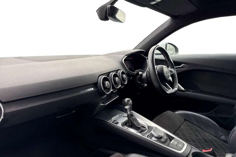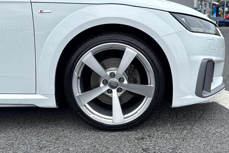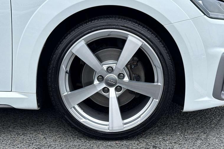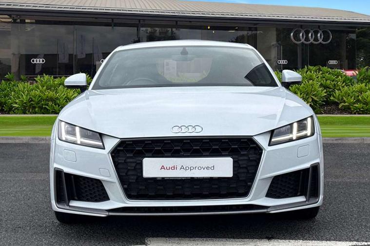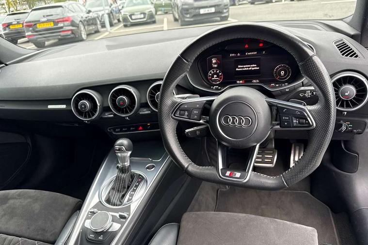 Audi drive select with 4 Pre configured modes, Audi virtual cockpit - 12.3" high-resolution LCD display with fully customisable instrument cluster, Cruise control + speed limiter, MMI touch panel, Mobile phone preparation with bluetooth interface, Progressive power assisted steering, Rear parking sensors, Service interval indicator, Start/Stop system with energy recuperation, TP memo, 8 Speakers, AM/FM radio, Audi music interface, Bluetooth audio streaming, DAB Digital radio, MMI Radio with CD player and SD/XC card slot, Auto dimming rear view mirror, Auto headlight range control, Body colour bumpers, Dynamic rear indicators, Electric front windows, Front fog lights, Green tinted heat insulating glass, Headlight wash system, High gloss black radiator grille, LED daytime running lights, Light and rain sensors, Retractable rear boot spoiler, S line badges on front wings, S Line body styling, S Line front and rear bumpers, S line rear diffuser with platinum grey insert, S line sill plates, Sunband for windscreen, 12V socket, 3 spoke flat bottomed high multi-function leather sport steering wheel with gearshift paddles, 4 way electric lumbar support for driver and front passenger, Black headlining, Door sill trims with S line logo, Extended aluminium look with stainless steel pedals, Front centre armrest, Front super sports seats, Heated front seats, Height adjustable driver's seat, Height adjustable front head restraints, Height/reach adjust steering wheel, ISOFIX child seat mounting for front passenger seat with airbag deactivation, Perforated leather gearknob, Rear top tether child seat ISOFIX attachment, S Line badge on steering wheel, Split folding rear seat, Top tether anchor plate for isofix child seat, Non smoking pack - TT/TT RS, 3 point front seat belts, ABS, ASR traction control, Brake energy regeneration, Curtain airbags, Driver and front passenger airbag with front passenger airbag deactivation, EDL traction control, Electromechanical parking brake, ESP, First aid kit, Front side airbags, Head airbags, Hill hold assist, Roll bar in glossy black, Seatbelt warning, Tyre pressure warning, Warning triangle, Anti theft alarm, Anti theft wheel bolts, Immobiliser, Keyless Go, Remote central locking, Matt brushed aluminium inlays, Tool kit, Tyre repair kit,