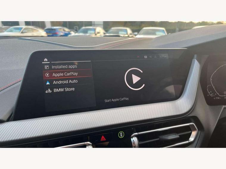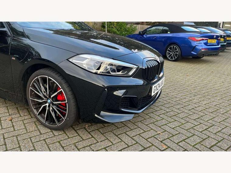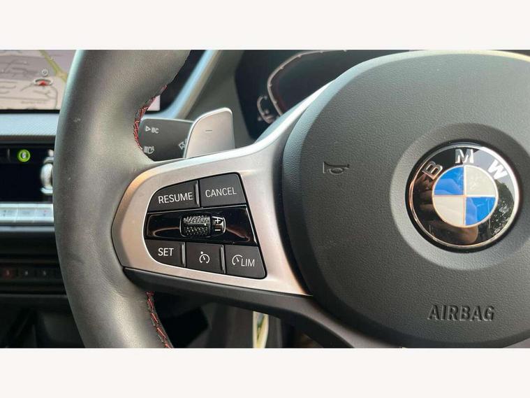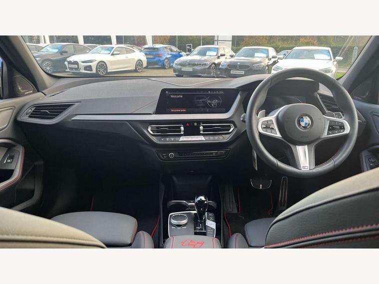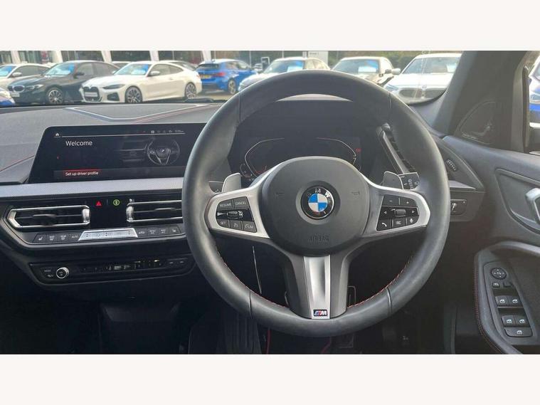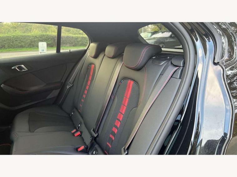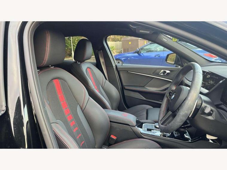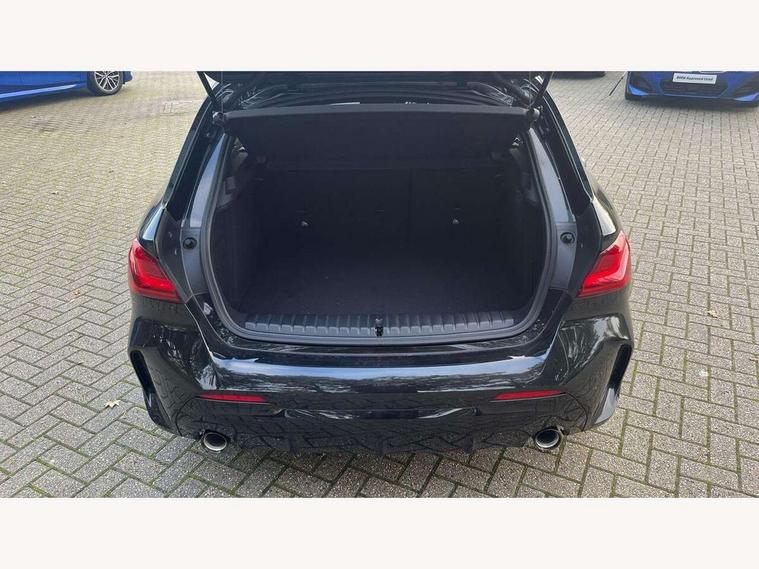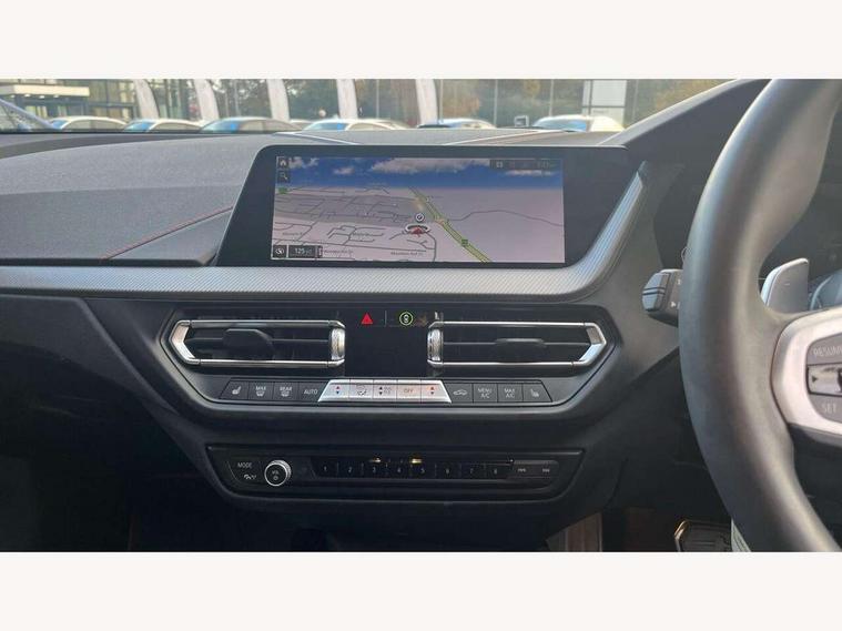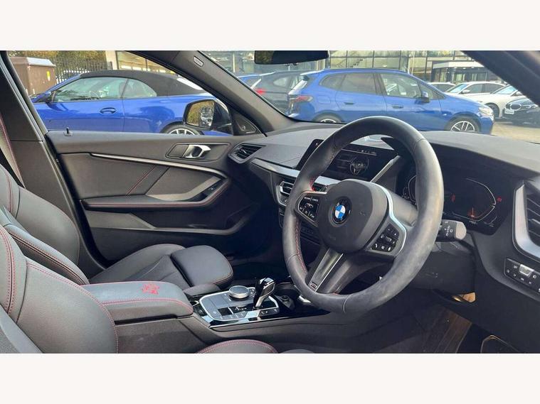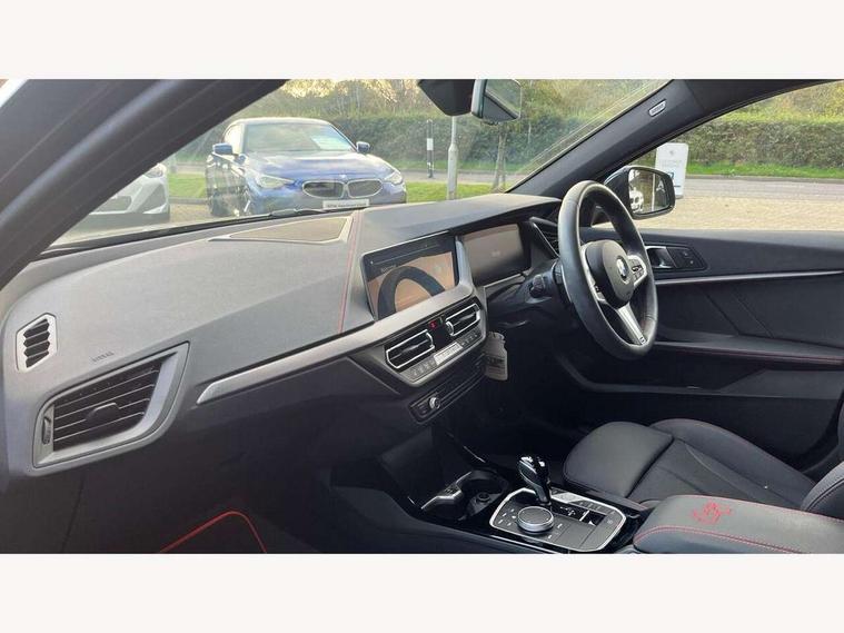 Active guard plus, Attentiveness assist, BMW ConnectedDrive online services, BMW Teleservices, Check Control warning system for monitoring of lights and door/luggage compartment open warning, Cruise control with speed limiter, Eco pro mode, Electric power steering with Servotronic steering optimised at all speed ranges, Front axle single joint with specific axle kinematics to minimise drive influences on steering + provide increased rigidity agile driving behaviour, Integrated owners handbook, Lane departure warning system, Oil sensor for level and grade, On board computer, Optimum shift indicator, Personal Profile, Pull away assistant, Rigidly mounted rear subframe - Multi link construction with separate spring / damper configuration and excellent driving characteristics, Speed limit Info including no-overtaking indicator, Aluminium lightweight construction, Anti roll bar front and rear, Balancer shaft, Double VANOS twin scroll turbocharging system, Drive Performance Control, Eight speed sport automatic transmission with gearshift paddle switches, Electronic differential lock, High precision injection, Larger fuel tank capacity (50 litres), M sport suspension with M128i xDrive specific settings, Petrol Particulate Filter, Twin tube gas filled shock absorbers with degressive characteristic curve, VALVETRONIC engine management, DAB Digital radio, Auto dimming rear view mirror, Automatic headlight beam throw control, Automatic windscreen wipers and automatic headlight, Black chrome tailpipe finishers, BMW individual high gloss shadow line with extended content, Body colour door handles, Body colour mirror caps, Body colour roof trims, Chrome 'M' logo side designation, Chrome kidney grille frame with Satin Aluminium struts, Direction indicator side lights in exterior mirrors, Electrically adjustable exterior mirror with mirror adjustment switch on drivers armrest and aspheric on driver side, convex on passenger side, Fading support, Folding side mirrors with auto dimming/folding wing mirrors with auto dimming, Follow me home headlights, Front and rear bumper system with replaceable deformation elements, Front and rear electric windows with open and close fingertip control, anti trap facility and comfort closing, Front door sill finishers in black plastic with M designation in metallic look, Green tinted heat protection glazing, High gloss shadowline window frame, Recess cover mirror frames and B/C pillar embelisher trim, High level third brake light, Integrated front windscreen with washer jets, Kidney frame and struts in high gloss black extended, LED daytime running lights, LED eyebrow turn indicators, Lightweight engineering, Matt black air guide grilles, Matt black wheel arch trim, Model designation on electric bootlid, Nearside reverse light in rear light cluster, Preparation for high beam assistant, Rear fog lights, Rear side wing doors, Rear window wiper, Shark fin antenna, Trailer stabilisation logic, Visible VIN plate, Welcome lighting, 12V power socket in front centre console with blanking plug, 3 rear seat head restraints, 3 seat bench in 2nd row, Anthracite headlining, Black boot net with lashing eyes, Cargo function on 2nd seat row, Child seat ISOFIX attachment for two outer rear seats and front passenger seat with anchorage points, Conditioned based service, Driver and front passenger backrest net on rear, Driver and front passenger seat heating, Driver side folding compartment in instrument panel, Folding rear clothes hook, Four grab handles integrated in roof lining, Front and rear door pockets with bottle holders, Front and rear side armrest integrated into door trim, Front armrest, Front sports seats, Glove compartment, Height adjustable front head restraints, Luggage compartment for bag hooks on left and right, foldable luggage compartment liner and four lashing eyelets, Manual adjust steering wheel, Multi-function controls for steering wheel, Single front passenger seat, Storage compartment in centre console, Storage compartment in luggage compartment, Stowage of the parcel shelf in luggage compartment trim, Sun visors with vanity mirrors and insert tab, Three spoke M sport design multi function leather steering wheel in unique red stitching, Two front centre console cupholders, Two zone automatic air conditioning, Type C two USB ports in rear centre console, Additional interior lighting pack - 1 Series, BMW live cockpit professional pack- 1 Series, Connected pack professional - 1 Series, Interior lights pack - 1 Series, M Sport exterior styling aerodynamics pack - 1 Series, 2 tone horn, 3 point seatbelts on all seats, front pyrotechnic belt tensioners, stopper and belt force limiters, rear coded belt buckles, Airbags - Front driver/passenger, front and rear curtain head protection, front side, manual deactivation of front passenger airbag, Anti lock braking system (ABS) with brake assist, BMW emergency call, Brake drying, Braking readiness, Child proof locking system in rear door, City braking function, Comfort modes, Cornering brake control, Crash sensor activating of airbags, Unlocking doors, hazard warning lights, fuel cut off, interior lighting+activation of safety battery terminal clamp, Driver and front passenger seat belt security check, Dynamic stability control + (DSC+), Dynamic Traction Control - DTC, Electrically operated hand brake including automatic hold function, Front and rear disc brakes, M Sport brakes with red calipers, M Sport seatbelts, Seatbelt warning, Side impact protection, Tyre pressure monitoring system, Warning triangle and first aid kit, Central locking switch for all doors, fuel filler cap and luggage compartment, Deadlocking function system to all doors, Drive away locking system on all doors and luggage compartment with de-activated in iDrive settings, Locking wheel bolts, Remote control with integrated key with High-gloss Black inlay and M designation and 1 button for open/ close lock, window, open luggage compartment, Start/stop button 