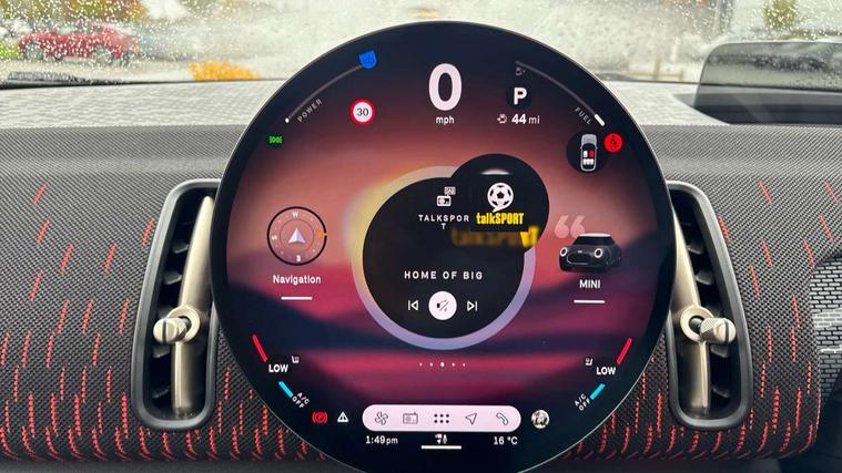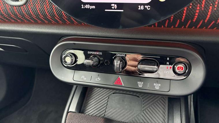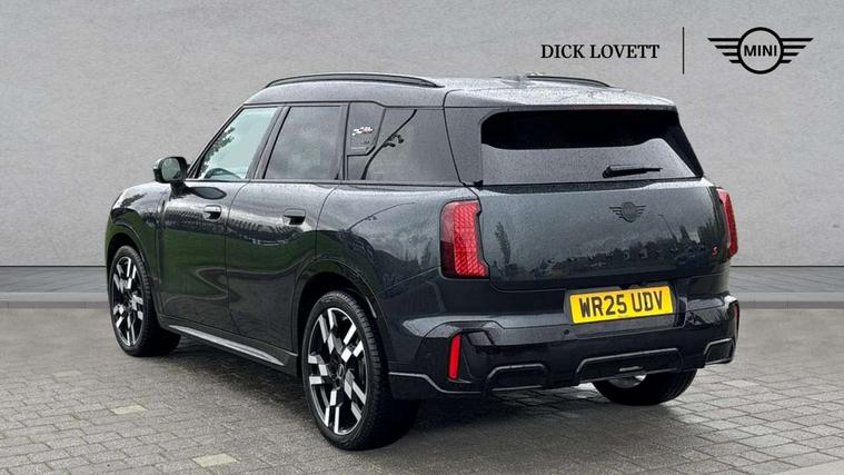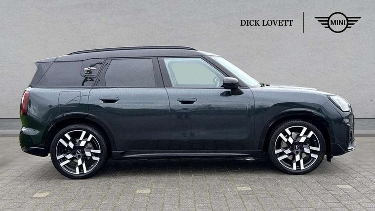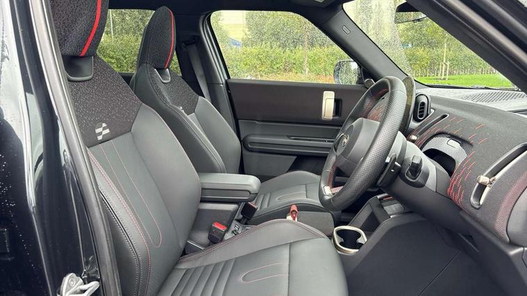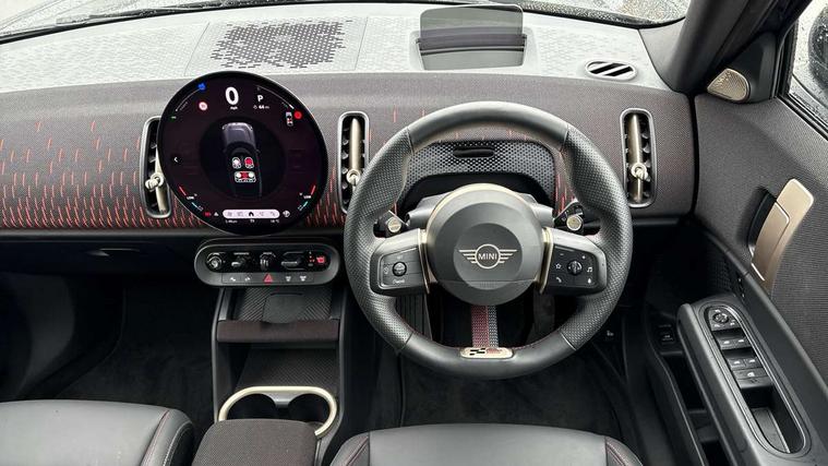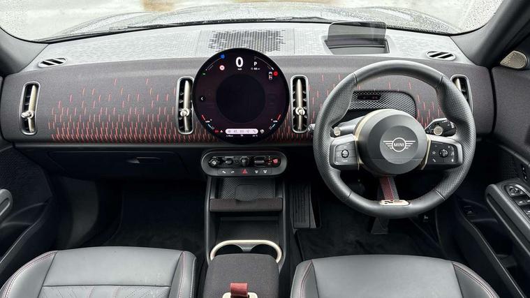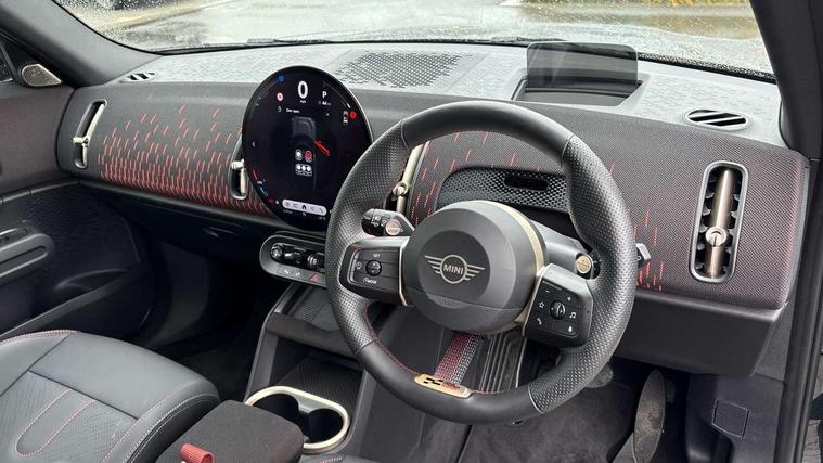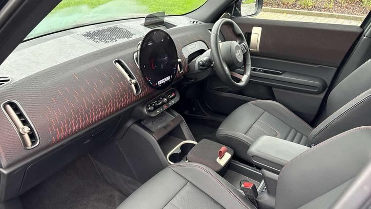 Bluetooth connection, Circular OLED Screen, Compatible mobile phone bluetooth with audio streaming, Cruise Control (DCC), Digital dashboard display, Driving assistant, Driving Assistant Plus Preparation, E-call, Electro-mechanical speed dependant steering assistance, MINI Experience Modes, MINI Head up display, Mini navigation system, MINI TeleServices, Parking assistant in camera and ultrasound based assistance system, rear view camera, parking aid and distance control, Adaptive suspension, Double clutch sports transmission, Larger capacity fuel tank, 6 speakers, DAB Digital radio, Personal eSim, Auto tailgate, Electric adjustable heated door mirrors, Front and rear apron, Front and rear electric windows, Heated rear window, High beam assistant, High gloss hexagonal patterned grille surround, Interior rear-view mirror with automatic anti-dazzle function, LED daytime running lights, LED headlights with extended contents including Adaptable light signatures, LED rear lights, LED third brake light, Rain sensor with auto headlights, Rear roof spoiler with airblades, Rear side wing doors, Rear window wiper, Roof rails, 3 Seat sliding rear bench in 2nd row, 60/40 split rear bench seat, Anthracite headliner, Auto air conditioning, Driver and front passenger seat heating, Floor mats, Front armrest, Front headrests, Heated steering wheel, Height and length steering column adjustment, JCW Front sports seats, Lidded storage box in Black/Red knit, Luggage compartment separating net, Perforated Vescin steering wheel, Rear headrests, Seat adjustment for rear seats, Single front passenger seat, Sunvisors with vanity mirrors, Vescin/Cloth upholstery, Wireless charging tray, Interior and exterior mirror package - Mini Countryman, 3x3 point rear seat belts, 6 Airbags - front, side, head and seat belt tensioners, ABS, Brake calipers in Black with JCW badge, DSC - Dynamic Stability Control, Electronic handbrake, Electronic Stability Programme (ESP), Front ISOFIX (iSize), Hill descent control, Hill hold assist, Hill start assist, JCW Sport Brakes, Manual rear child locks, Traction control, Tyre pressure monitoring system, Warning triangle, Alarm system with tilt sensor, monitoring doors, bonnet interior and tailgate, Auto drive away locking, Comfort access system, Deadlocking function, Electronic vehicle immobiliser, Locking wheel bolts, Remote control locking, Start/stop toggle with keyless go, JCW Black/Red dashboard knit, MINI Mobility Kit,