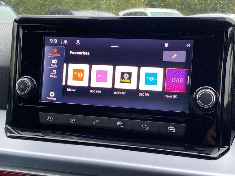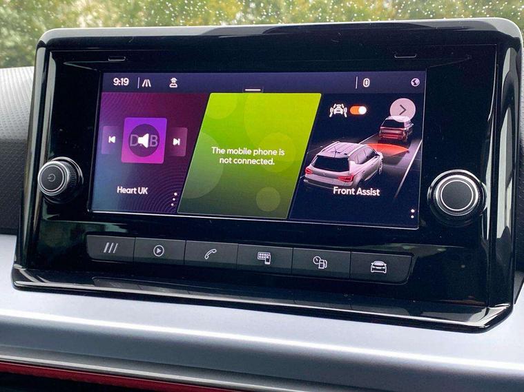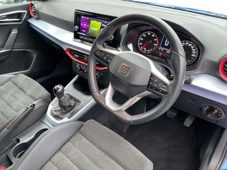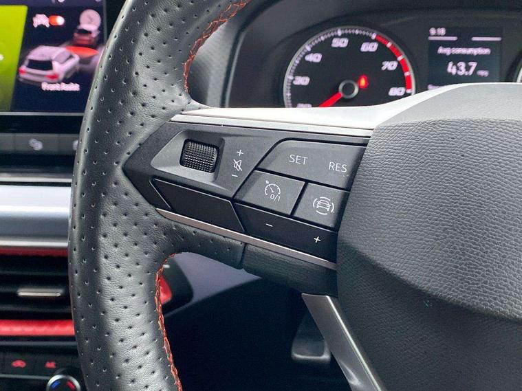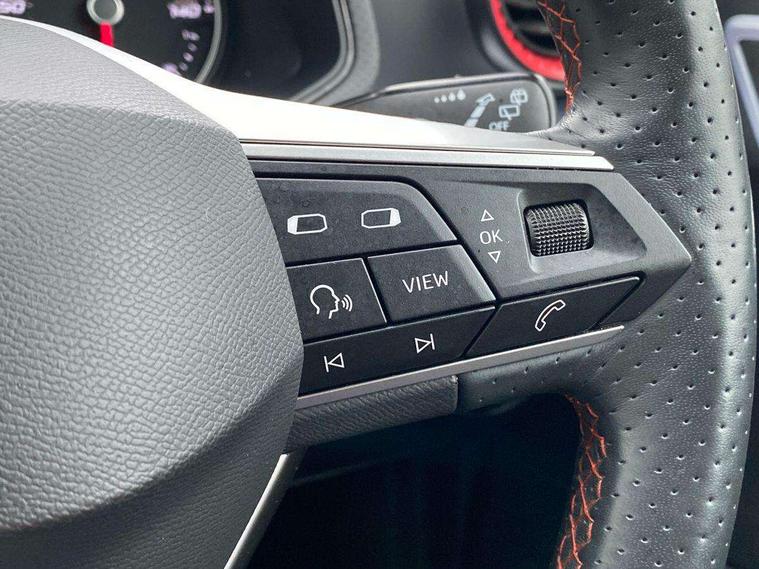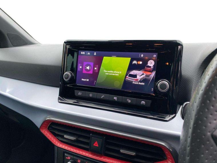 'Lights On' Reminder warning buzzer, Analogue cockpit with physical dials, Digital clock, E-call, Electric speed sensitive power steering, Full Link Smartphone Integration with Mirror Link, Apple Car Play, Google Android Auto with USB Type C cable for Apple and Android compatibility, Lane keeping system, Low fuel warning light, Outside temperature display, Rear parking sensor, RPM counter, Seat connect with safety, service and remote, SEAT Drive profile - Four different models normal-sport-eco-individual, steering response, throttle response, Trip computer, Wireless phone charger, Bluetooth interface for hands free and audio streaming, DAB digital radio and AM/FM radio, Media system with 8.25" colour touchscreen with USB port (type c), Steering wheel mounted audio controls, Anti theft roof antenna, Automatic activation of hazard warning lights, Body coloured bumpers, Body coloured door handle inserts, Chrome roof rails and window surrounds, Dark tinted rear windows, Dimming rear view mirror, Electric front/rear windows, Electrically adjustable and heated door mirrors, Front fog lights with cornering function and rear fog light, FULL LED automatic headlights with dynamic headlight range control, coming and leaving home, LED daytime running lights, LED rear tail lights and licence plate lights, Protective side mouldings, Rear side wing doors, Rear spoiler, Rear window wash/wipe, Roof colour door mirrors, Third brake light, Twin exhaust pipe styling hidden exhaust pipe, Visible VIN plate, Windshield wiper with intermittent control and potentiometer, 2 cupholders, 3 seat bench in 2nd row, 60/40 split folding rear seat, Aircare filter, Black interior roof, Double boot floor, Driver sunvisor with covered mirror + card holder, Dual zone climate control, Front comfort seats, Front courtesy light with 2x front and 2x rear reading lights, Gear shift indicator, Height adjustable front seats, Height/reach adjustable steering column, Illuminated boot, Instrument lighting with brightness control, Interior ambient lighting, Interior light in footwell, central console and door panel, ISOFIX points in outer rear seats with top tether anchorage points, Microsuede cloth upholstery, Passenger sunvisor with vanity mirror, Perforated flat bottomed leather steering wheel/gear knob/handbrake with red stitching and FR logo, Single front passenger seat, Two front and three rear height adjustable headrests, Interior chrome pack - Arona, 3 point seatbelts on all rear seats, ABS, Active front headrests, Child locks on rear doors, Driver and front passenger airbags with front passenger airbag de activation, front side and curtain airbags, Electronic stability control, Emergency Brake Assist (EBA) and front assist, Front and rear seatbelt reminder, Hill hold control, Multi-Collision braking, Tiredness recognition system, Traction control, Tyre pressure monitoring system, Alarm with back-up horn, Electronic engine immobiliser, KESSY Keyless entry and go, Locking wheel bolts, Remote central locking + deadlocks, Tow away protection, Titan black dashboard,