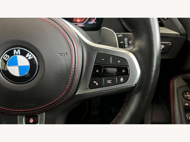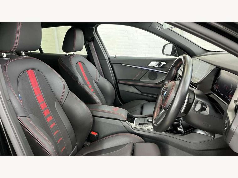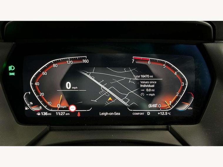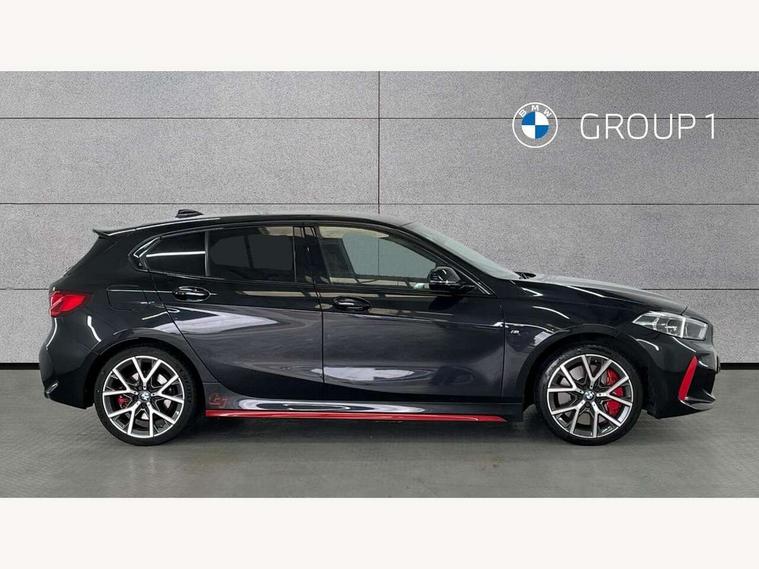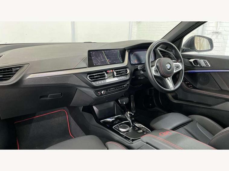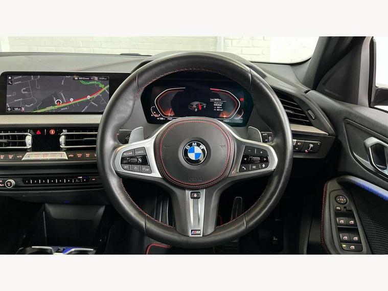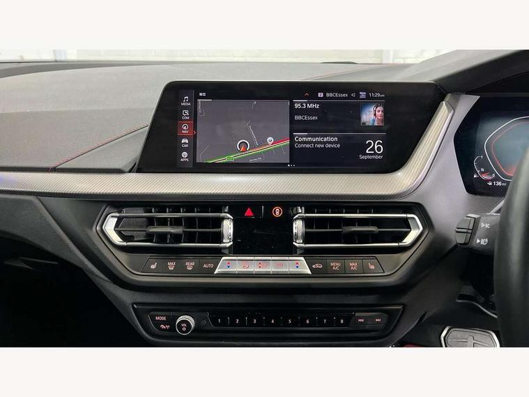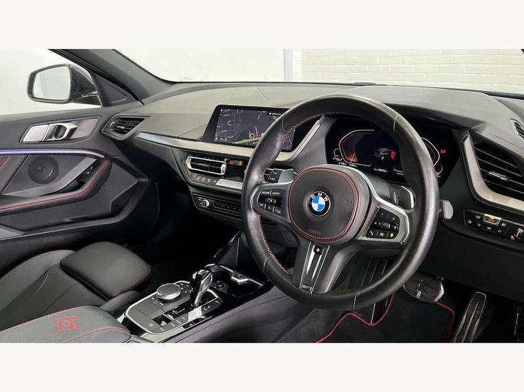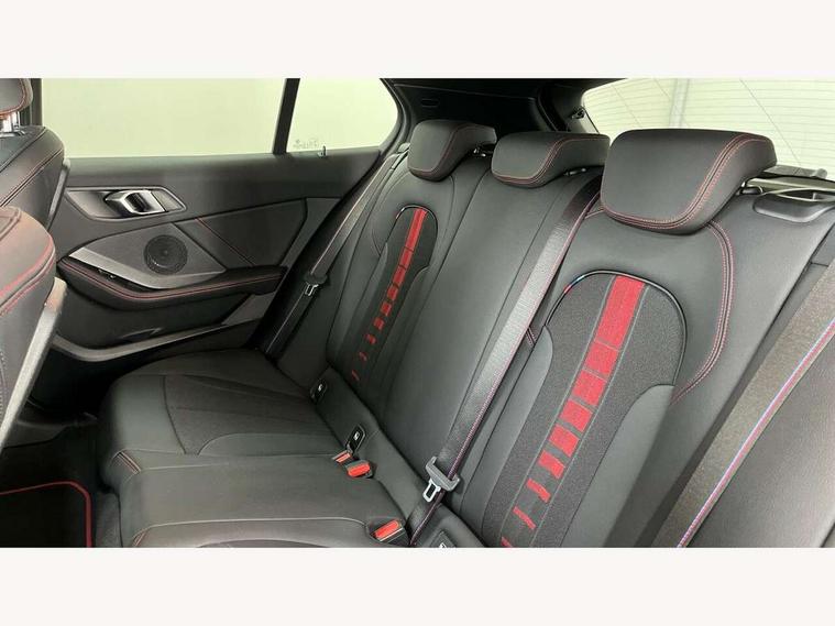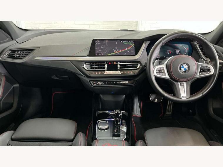 Active guard plus, Attentiveness assist, BMW ConnectedDrive online services, BMW Teleservices, Check Control warning system for monitoring of lights and door/luggage compartment open warning, Cruise control with brake assist, Eco pro mode, Electric power steering with Servotronic steering optimised at all speed ranges, Front axle single joint with specific axle kinematics to minimise drive influences on steering + provide increased rigidity agile driving behaviour, Integrated owners handbook, Lane departure warning system, Oil sensor for level and grade, On board computer, Optimum shift indicator, Personal Profile, Pull away assistant, Rigidly mounted rear subframe - Multi link construction with separate spring / damper configuration and excellent driving characteristics, Speed limit Info including no-overtaking indicator, Speed limiter, Aluminium lightweight construction, Anti roll bar front and rear, Balancer shaft, Double VANOS twin scroll turbocharging system, Drive Performance Control, Eight speed sport automatic transmission with gearshift paddle switches, Electronic differential lock, High precision injection, Larger fuel tank capacity (50 litres), M sport suspension with M128i xDrive specific settings, Petrol Particulate Filter, Twin tube gas filled shock absorbers with degressive characteristic curve, VALVETRONIC engine management, DAB Digital radio, Auto dimming rear view mirror, Automatic headlight beam throw control, Automatic windscreen wipers and automatic headlight, Black chrome tailpipe finishers, BMW individual high gloss shadow line with extended content, Body colour door handles, Body colour mirror caps, Body colour roof trims, Chrome 'M' logo side designation, Chrome kidney grille frame with Satin Aluminium struts, Direction indicator side lights in exterior mirrors, Fading support, Folding side mirrors with auto dimming/folding wing mirrors with auto dimming, Follow me home headlights, Front and rear bumper system with replaceable deformation elements, Front and rear electric windows with open and close fingertip control, anti trap facility and comfort closing, Front door sill finishers in black plastic with M designation in metallic look, Green tinted heat protection glazing, Heated, electrically adjustable exterior mirror aspheric on driver side, convex on passenger side, High gloss shadowline window frame, Recess cover mirror frames and B/C pillar embelisher trim, High level third brake light, Integrated front windscreen with washer jets, Kidney frame and struts in high gloss black extended, LED daytime running lights, LED eyebrow turn indicators, LED front fog lights, Lightweight engineering, Matt black air guide grilles, Matt black wheel arch trim, Model designation on electric bootlid, Nearside reverse light in rear light cluster, Preparation for high beam assistant, Rear fog lights, Rear side wing doors, Rear window wiper, Shark fin antenna, Trailer stabilisation logic, Visible VIN plate, Welcome lighting, 12V power socket in front centre console with blanking plug, 3 rear seat head restraints, 3 seat bench in 2nd row, Anthracite headlining, Black boot net with lashing eyes, Cargo function on 2nd seat row, Centre armrest in black/red highlight including embroidered 'ti' designation in red, Child seat ISOFIX attachment for two outer rear seats and front passenger seat with anchorage points, Conditioned based service, Driver and front passenger seat heating, Floor mats with red binding, Folding rear clothes hook, Four grab handles integrated in roof lining, Front and rear door pockets with bottle holders, Front and rear side armrest integrated into door trim, Front armrest, Front sports seats, Glove compartment, Height adjustable front head restraints, Instrument panel top section , door armrests and door panels in black/red highlight, Luggage compartment for bag hooks on left and right, foldable luggage compartment liner and four lashing eyelets, Manual adjust steering wheel, Multi-function controls for steering wheel, Single front passenger seat, Storage compartment in centre console, Sun visors with vanity mirrors and insert tab, Three spoke M sport design multi function leather steering wheel in unique red stitching, Two front centre console cupholders, Two zone automatic air conditioning, Additional interior lighting pack - 1 Series, BMW live cockpit professional pack- 1 Series, Connected pack professional - 1 Series, Interior lights pack - 1 Series, M Sport exterior styling aerodynamics pack - 1 Series, 2 tone horn, 3 point seatbelts on all seats, front pyrotechnic belt tensioners, stopper and belt force limiters, rear coded belt buckles, Airbags - Front driver/passenger, front and rear curtain head protection, front side, manual deactivation of front passenger airbag, Anti lock braking system (ABS) with brake assist, BMW emergency call, Brake drying, Braking readiness, Child proof locking system in rear door, City braking function, Comfort modes, Cornering brake control, Crash sensor activating central locking release, hazard warning lights, fuel cut off, interior lighting + activation of safety battery terminal clamp, Driver and front passenger seat belt security check, Dynamic stability control + (DSC+), Dynamic Traction Control - DTC, Electrically operated hand brake including automatic hold function, Front and rear disc brakes, M Sport brakes with red calipers, M Sport seatbelts, Seatbelt warning, Side impact protection, Tyre pressure monitoring system, Warning triangle and first aid kit, Central locking switch for all doors, fuel filler cap and luggage compartment, Deadlocking function system to all doors, Drive away locking system on all doors and luggage compartment with de-activated in iDrive settings, Locking wheel bolts, Remote control with integrated key with High-gloss Black inlay and M designation and 1 button for open/ close lock, window, open luggage compartment, Start/stop button illuminated in centre console with keyless engine start and 