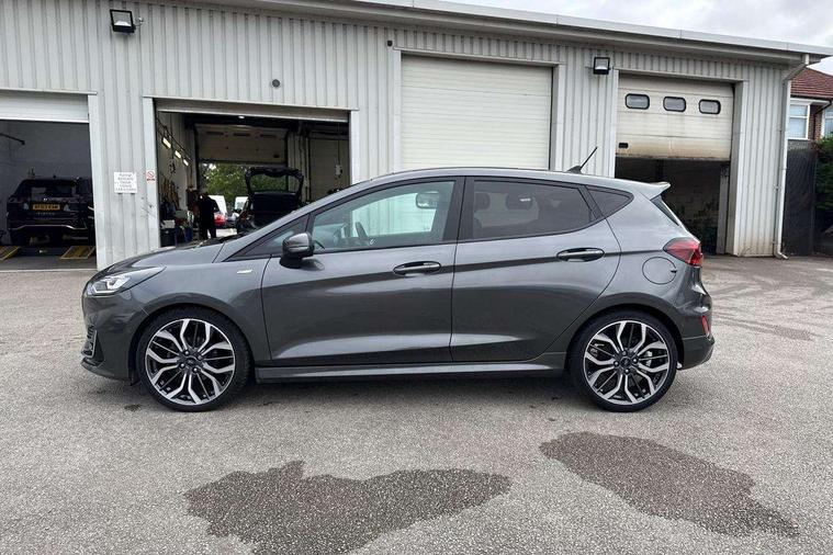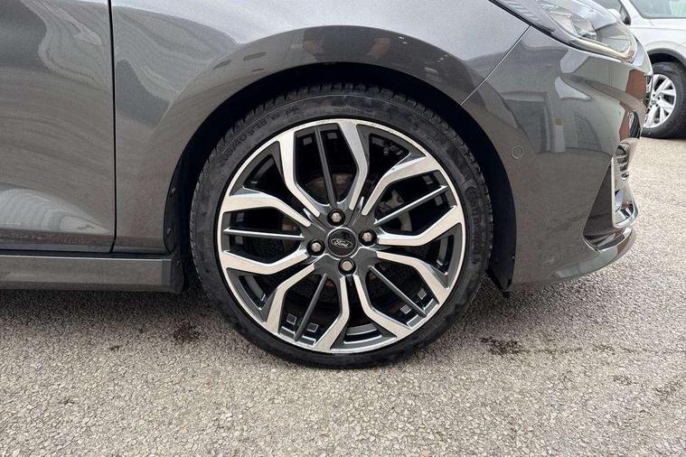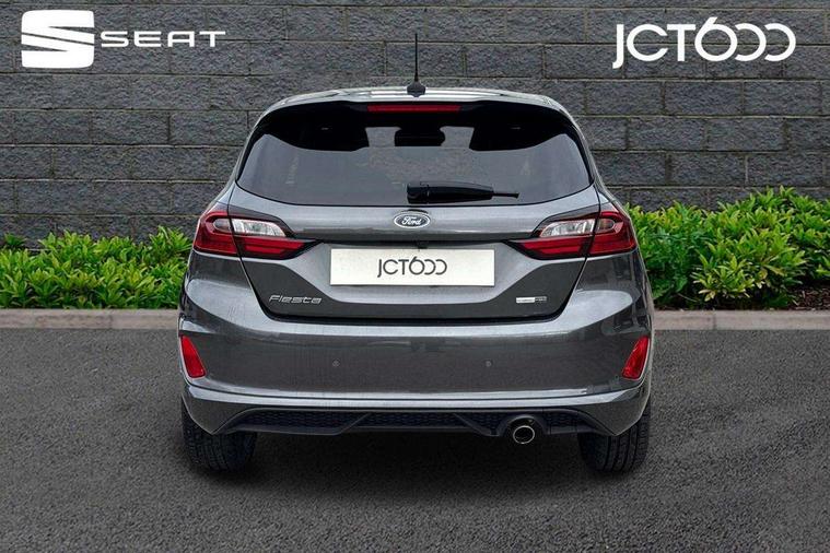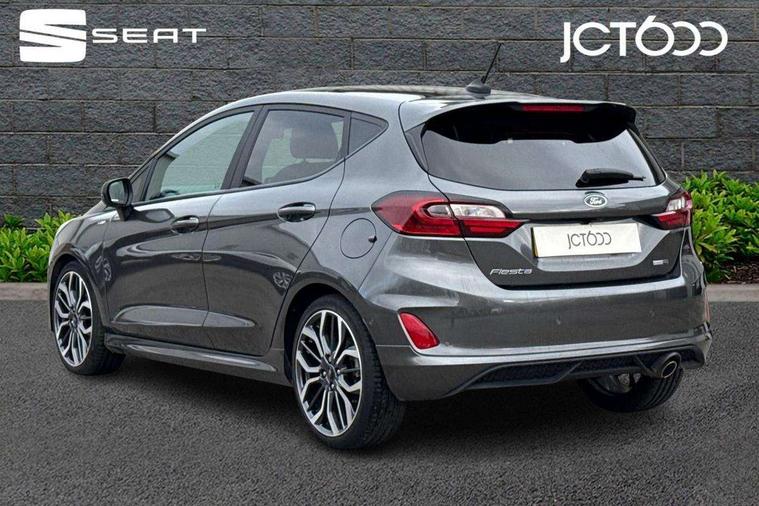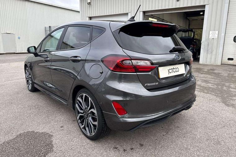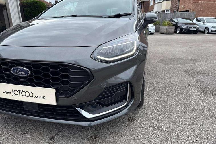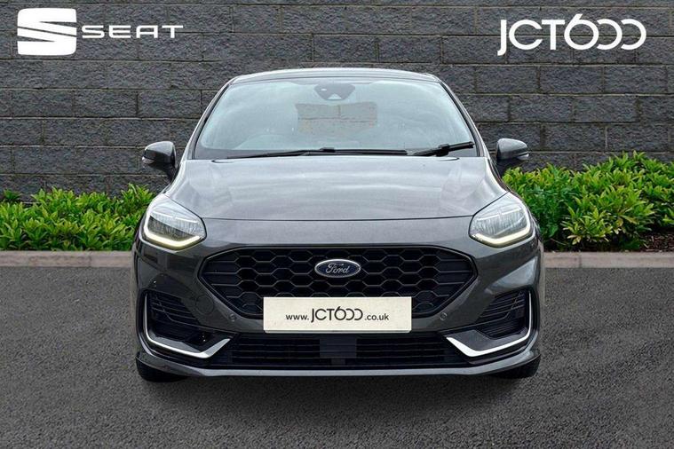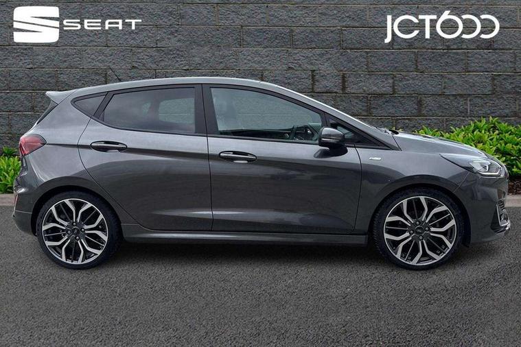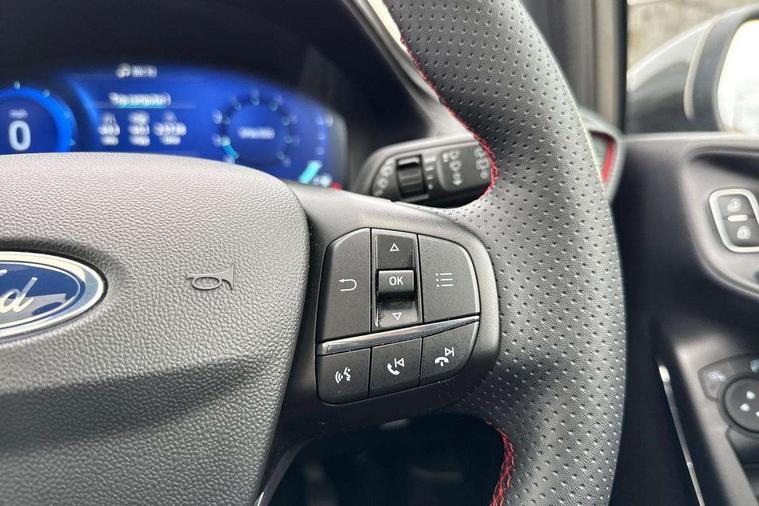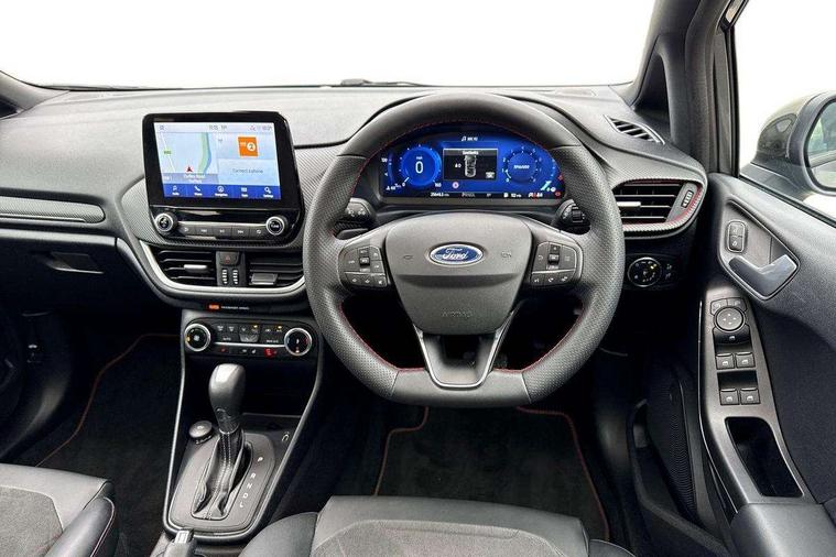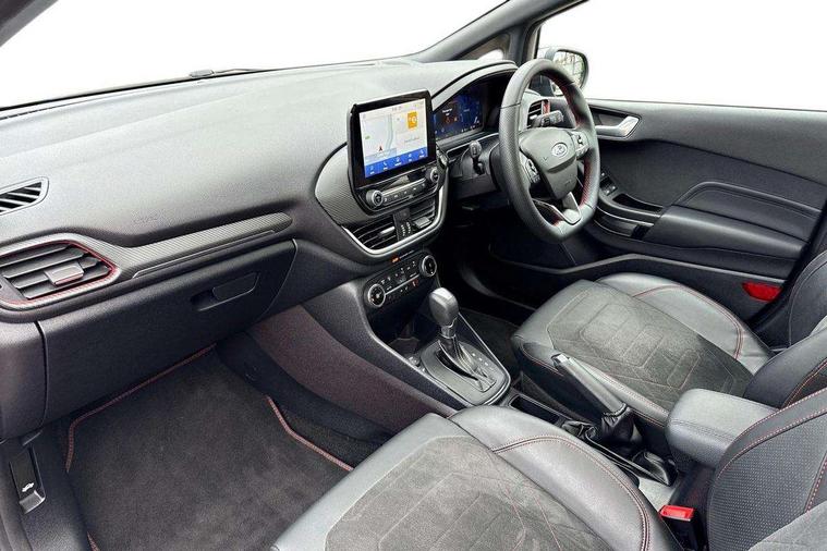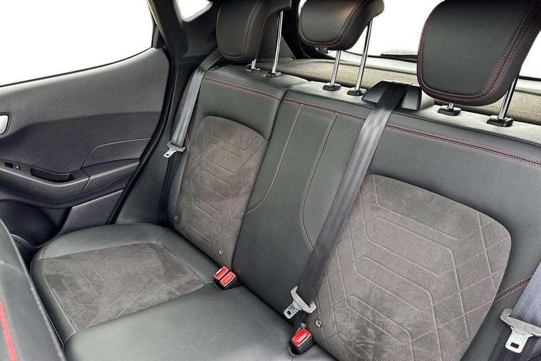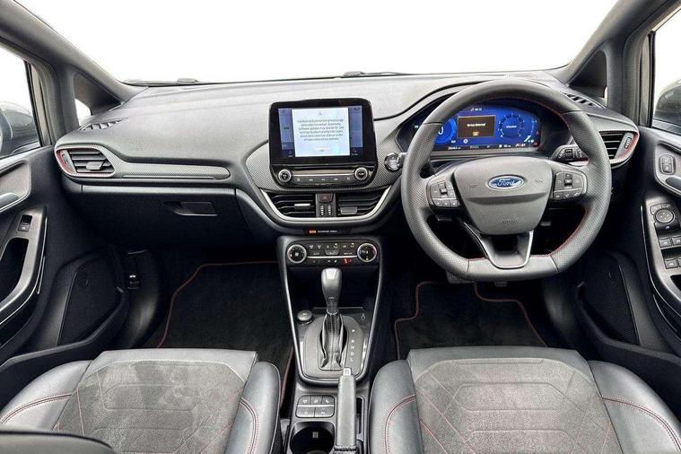 12.3" Full digital cluster, Driver alert system, Electric power steering, Ford easy fuel, Ford SYNC 3 Nav with DAB radio, 8" touch screen, voice control, emergency assist, Apple CarPlay/Android auto, 2x USB, 6 speaker, Ford pass connect, Rear parking distance sensors, Rear view camera, Selectable drive modes (Normal, Sport, Track), Speed sign recognition, Trip computer, Wrong way alert, Sports suspension, Auto high beam, Body colour bumpers, Body colour large rear spoiler, Body coloured electrically operated with side indicators, Electric front windows/one touch facility, Front unique ST scuff plates, LED Night signature to rear lights, LED third brake light, Quickclear heated windscreen, Rain sensing wipers and auto dimming rear view mirror, Rear privacy glass, Rear side wing doors, Rear wiper, Unique ST-Line upper grille & full bodystyling kit with ST-Line wing badges, 3 seat bench in 2nd row, 4 way manually adjustable passenger seat, Adjustable head restraints, Black headlining, Centre console with opening armrest, 2x cupholders, 12v and USB, Drivers and Passenger lumbar support, EATC - Electronic Auto Temperature control, Front floor mats in velour, Leather gear knob, LED ambient lighting, Manual 4-way driver seat adjust, Sensico partial premium leather upholstery with red stitching, Sensico wrapped steering wheel, Single front passenger seat, NCAP Pack - Fiesta, Winter pack [GTBAB]- Fiesta, 3 point seatbelts on all rear seats, Electronic stability control with hill start assist, Manual child lock in rear doors, Tyre pressure monitoring system, Ford keyfree system with Keyless entry and keyless start, MyKey system, Remote central locking, Thatcham alarm with power door dead locks, 18" 5x2 spoke alloys with pearl grey machined finish,