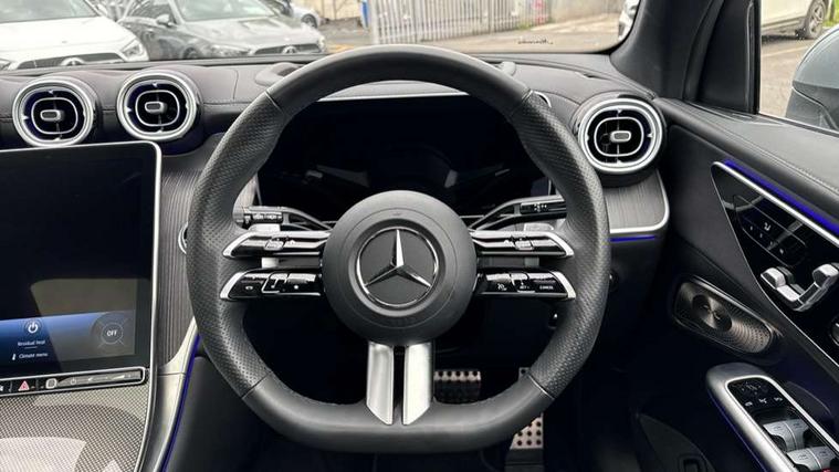 11.9" high resolution multimedia colour display, 12.3" Digital individually configurable instrument display, Acoustic presence indicator, Active lane keeping assist, Attention assist, Bluetooth interface for hands free telephone, Collision prevention assist plus, Dashcam - front camera for video recording, Direct steer speed sensitive steering, DYNAMIC SELECT with a choice of driving modes (ECO, Comfort, Sport, Sport+ and Individual), eCall emergency call system, ECO start/stop function, Fingerprint scanner, Fluorescent jacket for driver, Hard disc navigation, Head up Display, Instrument display in miles with English lettering, MBUX navigation premium, MBUX voice control activated by keywords "Hey Mercedes", Mercedes me connect, Outside temperature display, Remote boot release, Remote services, Road sign recognition system, Service indicator (ASSYST), Smartphone integration, Status display for rear seat belts in instrument cluster, Traffic sign assist, Trip computer, Wireless charging, 48V Mild hybrid technology, 4MATIC permanent four wheel drive, 62 litre fuel tank, 9G TRONIC plus automatic transmission, Petrol Particulate Filter (PPF), Residual engine heat utilisation, Sport suspension, Burmester 3D surround sound system, DAB digital radio tuner, MBUX extended functions, Pre installation for Mercedes Benz Link, Sound personalisation, Adaptive brake lights, Adaptive high beam assist plus, Aluminium look running boards with rubber studs, Aluminium roof rails, AMG bodystyling front apron, rear apron and side skirts, AMG Line exterior, Auto headlights, Body colour bumpers, Body colour door mirrors, Digital light LED headlights, Electric panoramic glass sunroof, Electrically adjustable door mirrors, Front and rear electric windows, Headlight washers, Heat insulating dark tinted glass, Heated rear window, High level LED brake light, Integrated LED daytime running lights, LED indicator lights, LED rear fog lights, LED tail lamp, Motor way mode function and locator lighting, Noise acoustic glass, Radiator grille with Mercedes Benz pattern and integreated Mercedes star and louvre in dark grey matt with chrome inlay and black frame, Rain sensor windscreen wipers, Range adjustable headlights, Rear side wing doors, Rear wiper, Transparent Bonnet, Two chrome plated tailpipe trim elements, Variable front intermittent wipers, Welcome and follow-me home light functionality, Wider wheel arch for AMG wheels, 3 seat bench in 2nd row, 40:20:40 split folding rear seats, Air balance package, Ambient lighting premium, AMG line interior, Audio and onboard settings control on multifunction steering wheel, Automatic child seat recognition sensor, Black fabric roof lining, Black floor mats with AMG lettering, Double cup holder in centre console, Easy-pack removable load compartment cover, Electrically height/reach adjustable steering column, Energising package plus- climatised and Multicontour front seats, Front centre armrest with stowage compartment, Front head restraints, Galvanised steering wheel gearshift paddles, Heated steering wheel, Illuminated door sill panels with Mercedes Benz lettering, Illuminated glove compartment, Instrument panel and beltlines in ARTICO manmade leather in nappa look, Multifunction sports steering wheel in nappa leather, Rear centre headrest, Rear head restraints, Rear top tether child seat ISOFIX attachment, Single front passenger seat, Sports pedals with stainless steel surfaces and rubber studs, Sports seats, Sun visors, Anti theft protection package - GLC, Boot comfort package - GLC, Exterior chrome package - GLC, Interior chrome package - GLC, Interior lighting pack - GLC, Keyless-Go comfort package - GLC, Memory pack - GLC, Mirror pack - GLC, Parking package with 360 degree camera - GLC, Seat comfort package - GLC, Stowage space package - GLC, USB Plus Pack - GLC, 3 rear 3 point seatbelts, Anti-lock braking system (ABS), ASR traction control, Automatic front passenger airbag deactivation, Black seat belts, Brake calipers with Mercedes-Benz lettering + perforated brake discs, Braking system with larger brake discs on the front axle, Child proof door locks, Dual-stage airbags - driver and front passenger, driver knee bag and window bags for driver, front passenger and rear passengers, Electronic parking brake, Electronic stability programme (ESP) with curve dynamic assist and cross wind assist, Front and rear seatbelt reminder, Front passenger seat occupancy sensor, Front seatbelt pretensioners, Hill start assist, Tyre pressure monitoring system, Warning triangle and first aid kit, Automatic door locking, Guard 360 degree vehicle protection plus, Interior protection/immobiliser, Remote central locking, Anthracite linestructure lime wood trim, Black open-pore aluminium lines wood trim, Centre console in metal structure finish, 20" AMG multi spoke light alloy wheels in painted black with high sheen finish, Summer tyres, TIREFIT with tyre inflation compressor,