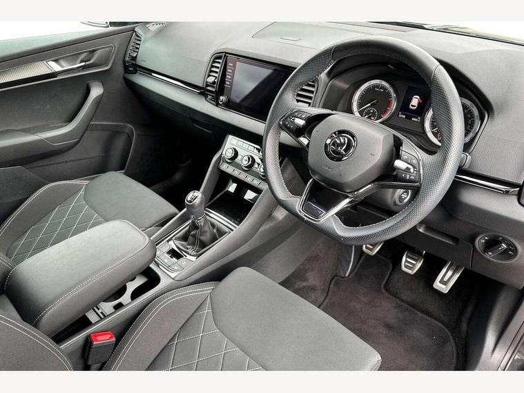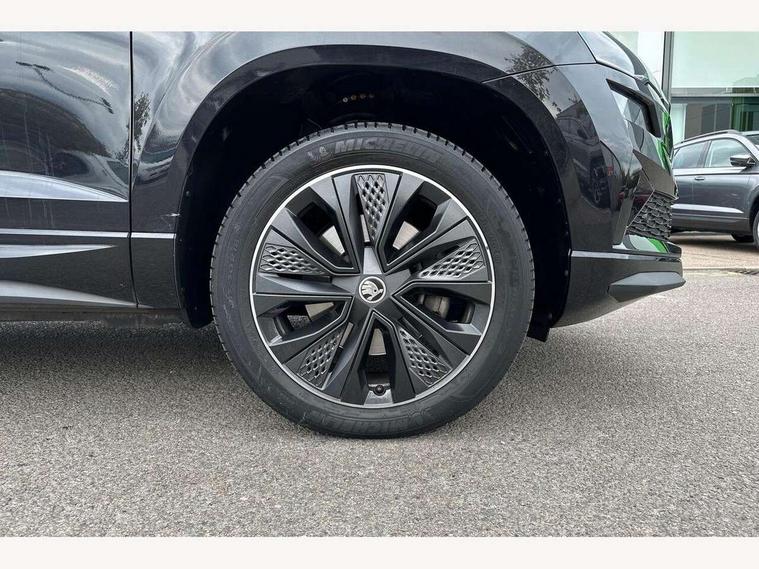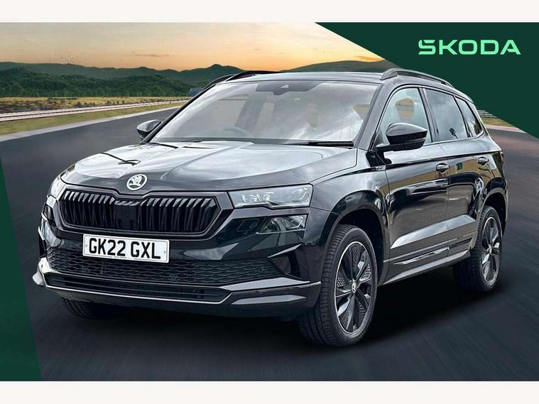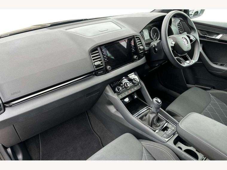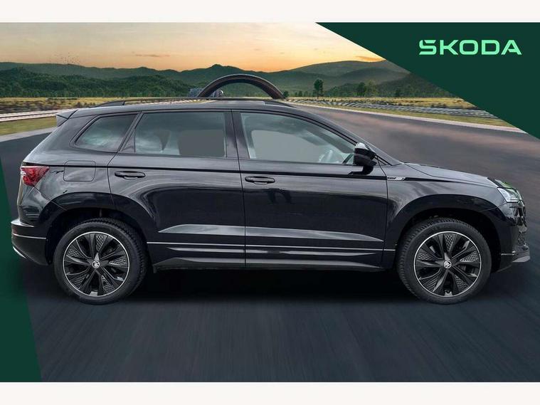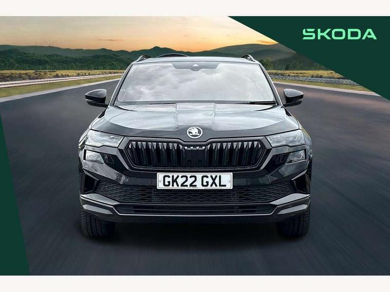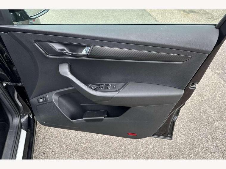 Care connect, Driver fatigue sensor, Emergency services call system, Multifunction colour trip computer, Outside temperature gauge, Service interval indicator, SmartLink wireless for Apple and wired for Android, Start/stop system with regenerative braking, USB C Port x 2 in front centre console, Virtual pedal with electrically operated boot door, 8 Speakers, DAB radio with Bluetooth, USB connection, Acoustic glass, Aero front windscreen wipers with intermittent function, Auto dimming rear view mirror with light and rain sensors, Automatic headlight control system, Black door mirrors, Black electric window control buttons, Black radiator grille, Black roof rails, Body colour door handles, Body coloured bumpers, Electric front and rear windows with child proof lock, Front door steps with SportLine logo, Heated rear windscreen, LED daytime running lights, LED rear lights with high functionality welcome effect and dynamic indicators, Light assistant (coming/leaving home/tunnel light), Panoramic sliding sunroof, Privacy glass, Protective door side sills in body colour, Rear diffuser, Rear side wing doors, Rear spoiler, Rear wiper, Safety reflectors on front doors, Skoda lettering on tailgate in black, Sportline badge on front fender, Sportline decorative inserts with badging, Sports front and rear bumpers, 1.5 litre bottle holders in driver and front passenger door panels, 12V socket in boot, 12v socket in front centre armrest with storage compartment and rear air vents, 2 Folding hooks and nets in boot, 3 rear height adjustable headrests, 3 seat bench in 2nd row, 3 spoke leather sports multifunction steering wheel and silver stitching, 4 foldable roof handles with rear coat hooks, Black floor carpet, Black roof headlining, Chrome inner door handles, Double sided boot floor, Foldable hooks in the boot, Front head restraints, Height adjustable front three point seats belts with tensioners, Height/reach adjust steering wheel, Ice scraper, Illuminated and cooled glovebox, Illuminated luggage compartment, Isofix child seat preparation outer rear, Manual lumbar support for front seats, Pen holder, Pollen filter, Rear reading lights, Rear seats fixed folding and divided 60:40, Retractable parcel shelf attachable to tailgate, Rubbish bin door, Safety vest holder, Single front passenger seat, Solid rear boot cover, Storage box in upper central dashboard closed, Sunvisors with illuminated vanity mirrors, Textile floor mats, Titan black interior ceiling, Umbrella under passenger seat, Welcome animation with sportline logo, Light Pack - Karoq, Parking pack - Karoq, Airbags - Front side, head, knee and curtain, Automatic door unlocking in case of crash, Automatic fuel cut off in case of crash, Child locks on rear doors, Driver airbag, Electronic parking brake with auto hold function, Emergency rear braking signal, ESC including ABS, MSR, ASR, EDS, HBA, DSR, RBS, MKB and traction control, Front assist radar scanning of the space in front of the car with automatic braking, Hill hold control, Passenger airbag with switch-off function, Pedestrian monitor, Seatbelt reminder signalisation and pretensioner for all seats, Three point seatbelts rear, Two tone horn, Tyre pressure display, Tyre pressure monitor, Alarm with interior monitoring, back up horn and tilt sensor with safe function, Electronic engine immobiliser, Keyless entry and start/stop system with SAFE system, Remote central locking with 2 remote folding keys, Black air vent surround, Black centre console, Satin black dashboard, Satin black door trim, 18" Procyon alloy wheels in black, Anti-theft wheel bolts protection, Matt black aero hub caps, Storage on wheel cover,