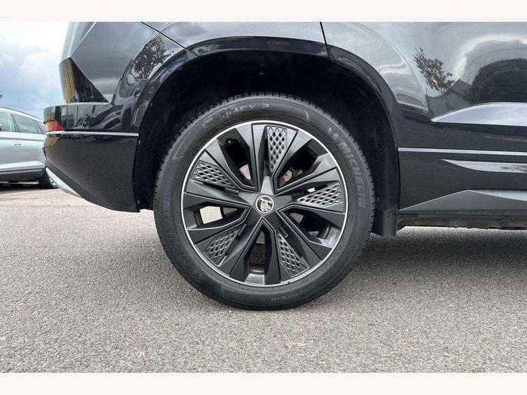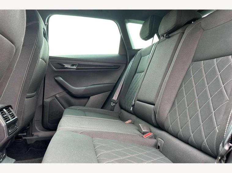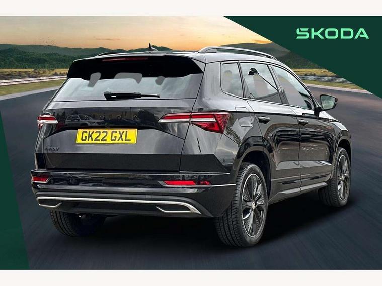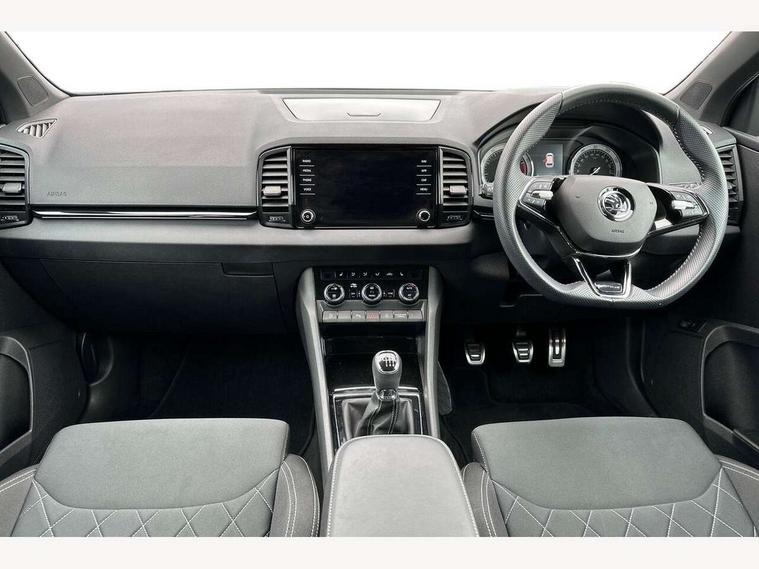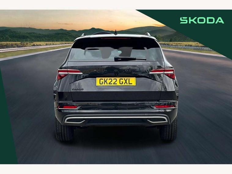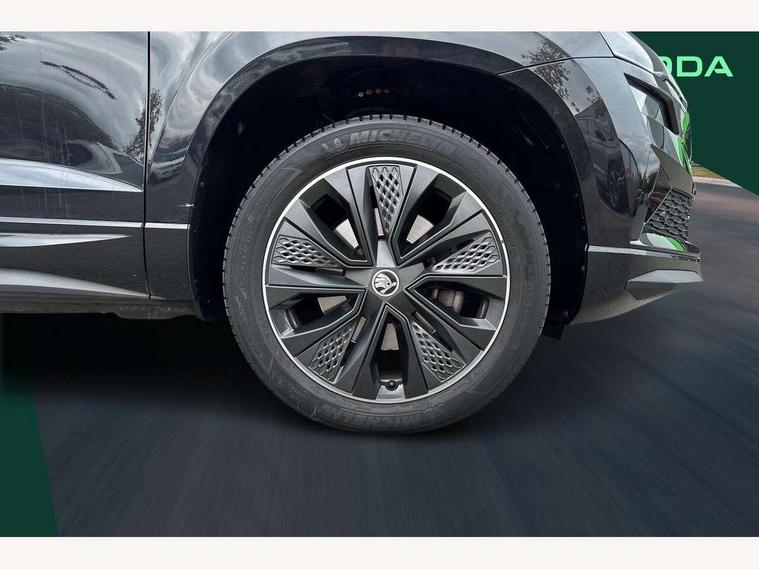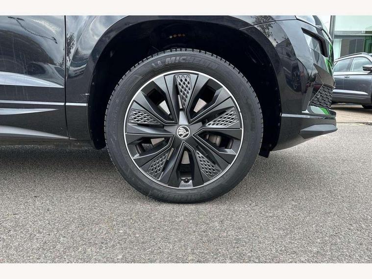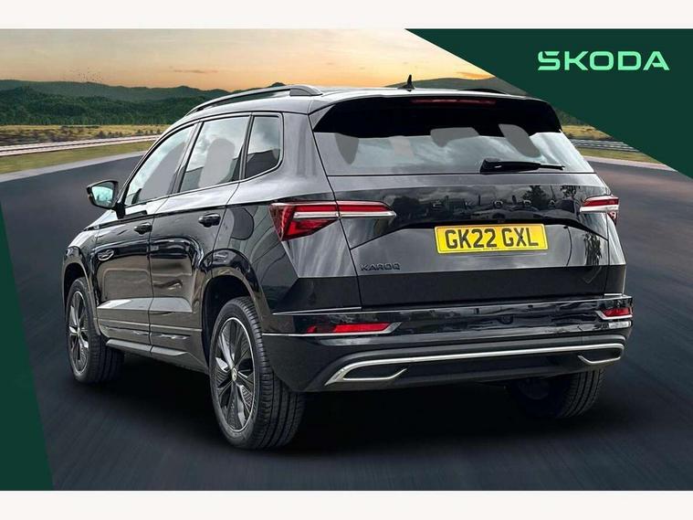 Care connect, Driver fatigue sensor, Emergency services call system, Multifunction colour trip computer, Outside temperature gauge, Service interval indicator, SmartLink wireless for Apple and wired for Android, Start/stop system with regenerative braking, USB C Port x 2 in front centre console, Virtual pedal with electrically operated boot door, 8 Speakers, DAB radio with Bluetooth, USB connection, Acoustic glass, Aero front windscreen wipers with intermittent function, Auto dimming rear view mirror with light and rain sensors, Automatic headlight control system, Black door mirrors, Black electric window control buttons, Black radiator grille, Black roof rails, Body colour door handles, Body coloured bumpers, Electric front and rear windows with child proof lock, Front door steps with SportLine logo, Heated rear windscreen, LED daytime running lights, LED rear lights with high functionality welcome effect and dynamic indicators, Light assistant (coming/leaving home/tunnel light), Panoramic sliding sunroof, Privacy glass, Protective door side sills in body colour, Rear diffuser, Rear side wing doors, Rear spoiler, Rear wiper, Safety reflectors on front doors, Skoda lettering on tailgate in black, Sportline badge on front fender, Sportline decorative inserts with badging, Sports front and rear bumpers, 1.5 litre bottle holders in driver and front passenger door panels, 12V socket in boot, 12v socket in front centre armrest with storage compartment and rear air vents, 2 Folding hooks and nets in boot, 3 rear height adjustable headrests, 3 seat bench in 2nd row, 3 spoke leather sports multifunction steering wheel and silver stitching, 4 foldable roof handles with rear coat hooks, Black floor carpet, Black roof headlining, Chrome inner door handles, Double sided boot floor, Foldable hooks in the boot, Front head restraints, Height adjustable front three point seats belts with tensioners, Height/reach adjust steering wheel, Ice scraper, Illuminated and cooled glovebox, Illuminated luggage compartment, Isofix child seat preparation outer rear, Manual lumbar support for front seats, Pen holder, Pollen filter, Rear reading lights, Rear seats fixed folding and divided 60:40, Retractable parcel shelf attachable to tailgate, Rubbish bin door, Safety vest holder, Single front passenger seat, Solid rear boot cover, Storage box in upper central dashboard closed, Sunvisors with illuminated vanity mirrors, Textile floor mats, Titan black interior ceiling, Umbrella under passenger seat, Welcome animation with sportline logo, Light Pack - Karoq, Parking pack - Karoq, Airbags - Front side, head, knee and curtain, Automatic door unlocking in case of crash, Automatic fuel cut off in case of crash, Child locks on rear doors, Driver airbag, Electronic parking brake with auto hold function, Emergency rear braking signal, ESC including ABS, MSR, ASR, EDS, HBA, DSR, RBS, MKB and traction control, Front assist radar scanning of the space in front of the car with automatic braking, Hill hold control, Passenger airbag with switch-off function, Pedestrian monitor, Seatbelt reminder signalisation and pretensioner for all seats, Three point seatbelts rear, Two tone horn, Tyre pressure display, Tyre pressure monitor, Alarm with interior monitoring, back up horn and tilt sensor with safe function, Electronic engine immobiliser, Keyless entry and start/stop system with SAFE system, Remote central locking with 2 remote folding keys, Black air vent surround, Black centre console, Satin black dashboard, Satin black door trim, 18" Procyon alloy wheels in black, Anti-theft wheel bolts protection, Matt black aero hub caps, Storage on wheel cover,