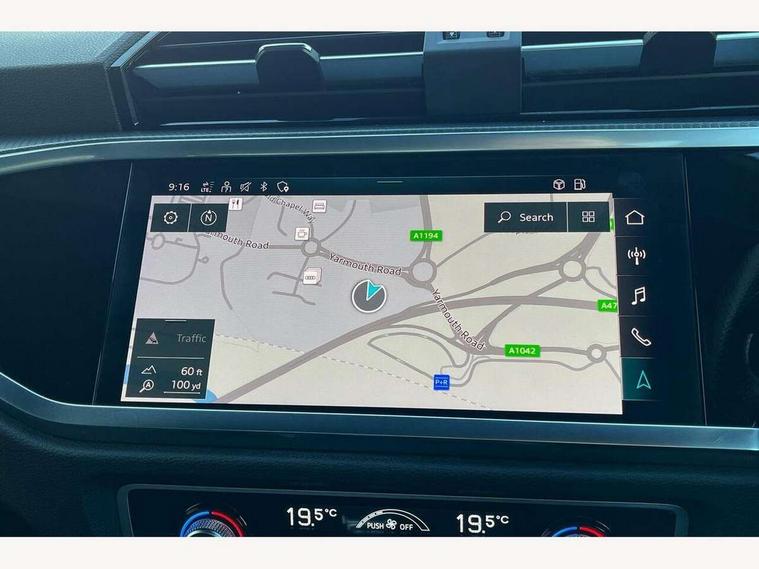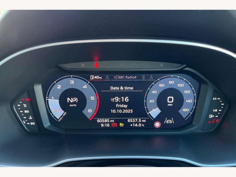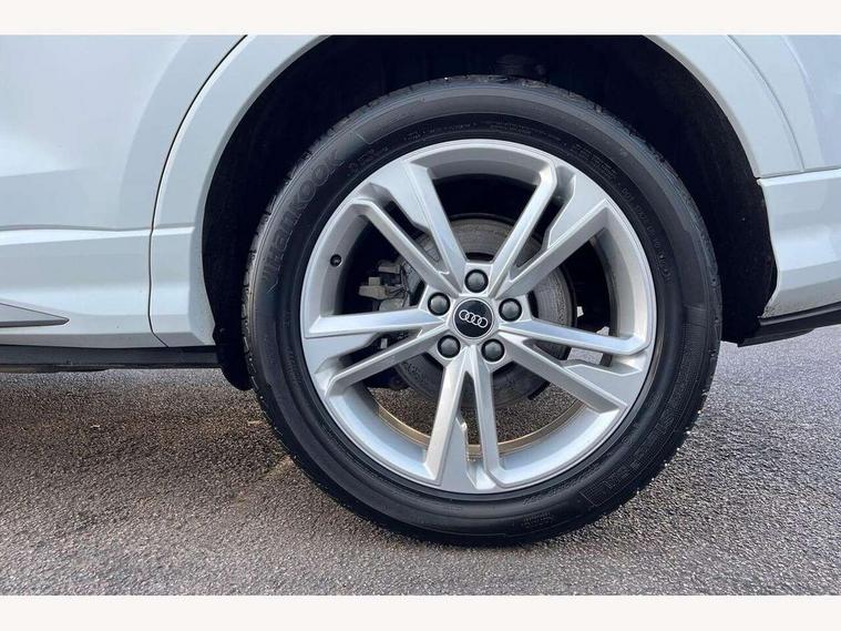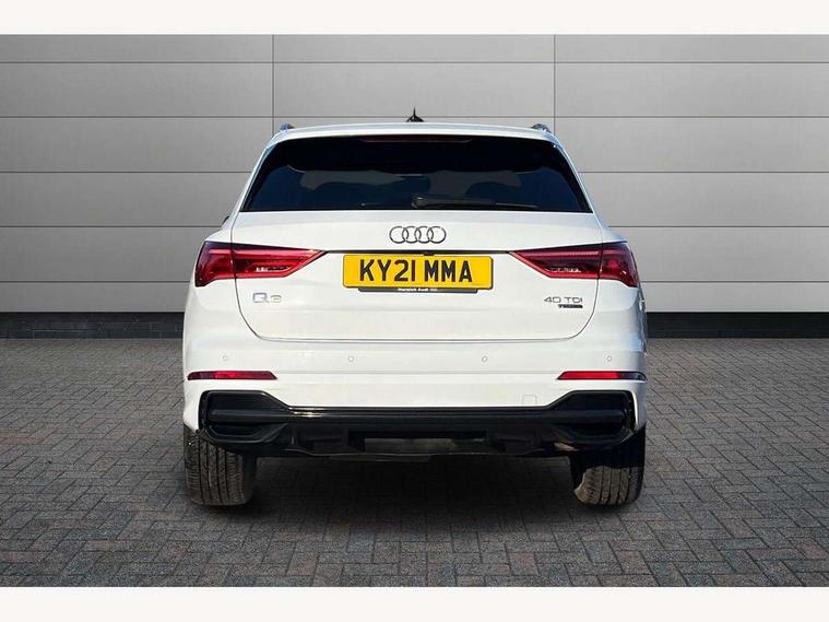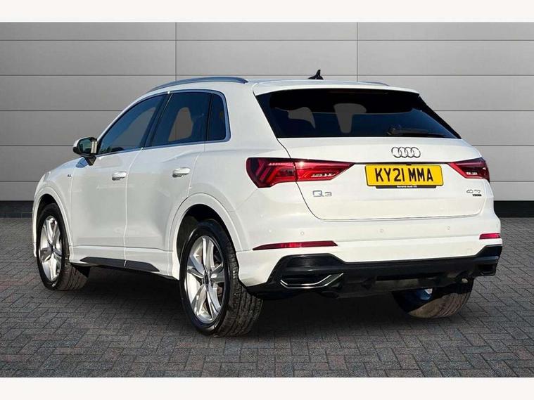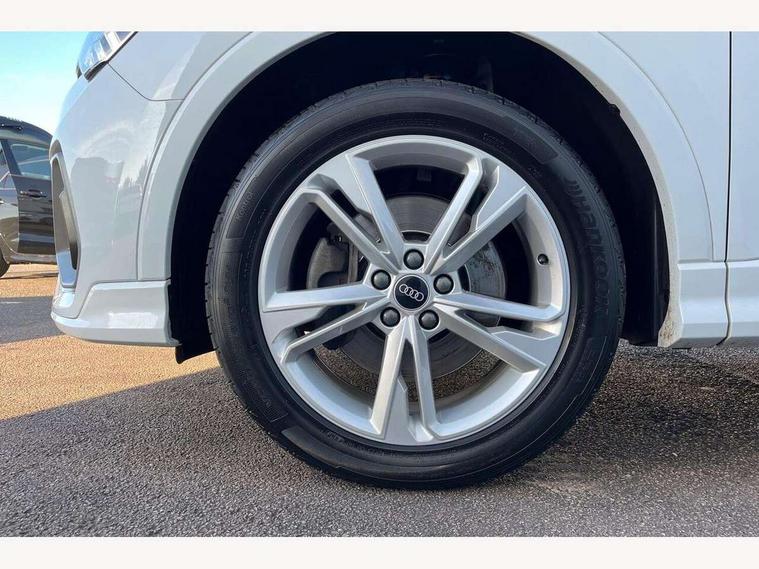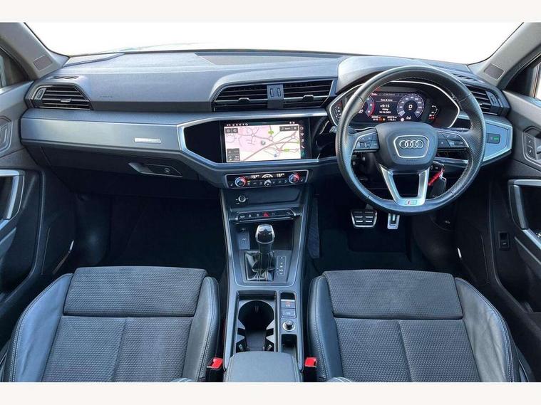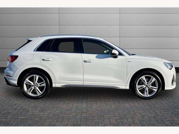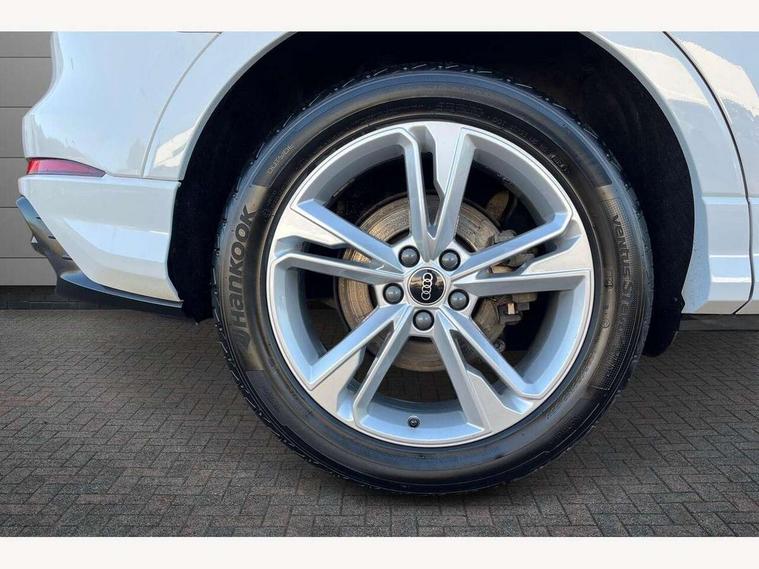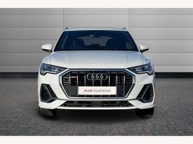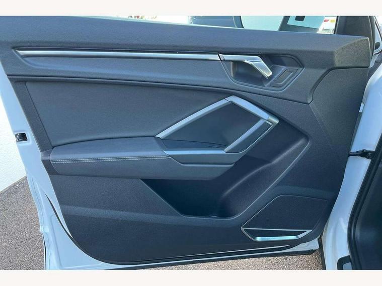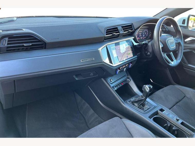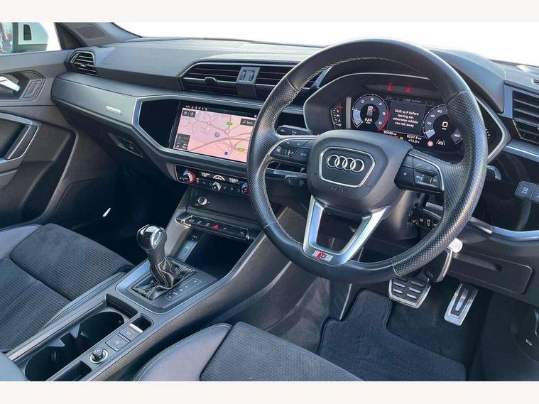 Audi connect safety and service (e-call), Audi drive select, Audi lane departure warning, Audi smartphone interface includes wireless Apple carplay/Android Auto, Audi Virtual Cockpit - 10.25" display, Bluetooth interface, Camera based traffic sign recognition, MMI Navigation Plus with high resolution 10.1 inch touchscreen colour display, Power operated tailgate, Progressive steering, Service interval indicator, Start stop system with recuperation, Voice control system with natural language interaction, Diesel particulate filter, Sports suspension, 2 USB-C ports with charge and data functions, 6 passive loudspeakers, DAB digital radio module, Acoustic windscreen, Aluminium roof rails, Aluminium window trim, Auto dimming frameless rear view mirror, Body coloured bumpers, Electrically folding, adjustable and heated door mirrors with integrated LED side indicators and kerb view function for passenger side, Front and rear electric windows, Front fog lights, Front side air inlets in matt platinum grey, Front spoiler blade in matt platinum grey, Grille vertical bars in aluminium silver/Matt, High gloss black finish B and C pillars, LED headlights with LED daytime running lights and dynamic rear indicator, LED rear lights, Privacy glass dark tinted rear and rear-side windows (from B-pillar backwards), Rain and light sensors, Rear diffuser strip in matt titanium black, S line badges on front wings, S Line front and rear bumpers, Side skirt insert in matt Platinium grey, Silver chrome grille surround, Titanium black radiator grille, 12V socket in rear centre console, 40:20:40 folding with manual adjustment for 60:40 forwards/backwards position and backrest angle, Adjustable rear seat bench/backrest with centre armrest and cupholder, Black cloth headlining, Dual zone electronic climate control, Front and rear black floor mats with contrast stitching in rock grey, Front and rear headrests, Front and rear roof module including reading lights, Front centre armrest, Glove compartment lighting, Height and reach adjustable steering wheel, Illuminated door sill trims with S logo, ISOFIX child seat mounting for front passenger with airbag deactivation and outer rear seat including top tether attachment point for outer rear seats, Luggage compartment light, Manual front seats with height adjustment, Perforated leather gearknob, Stainless steel luggage compartment sill finisher, Stainless steel pedals, Non smoking pack - Q3, 3x3 point rear seatbelts, 6 airbags - Driver, front passenger, curtain and side windows, Electrically operated child locks on rear doors, Electromechanical parking brake, Electronic stabilisation control including ABS, ASR and EDL, Hill descent control, Hill hold assist, Pre sense basic, Seatbelt monitoring, Tyre pressure warning, Warning triangle and first aid kit, Anti theft alarm, Anti theft wheel bolts, Audi pre-sense front with pedestrain and cyclist recognition, Remote central locking, Dark matt brushed aluminium inlay, Leatherette door armrest, MMI touch colour display in glass look, black with surround in aluminium look,