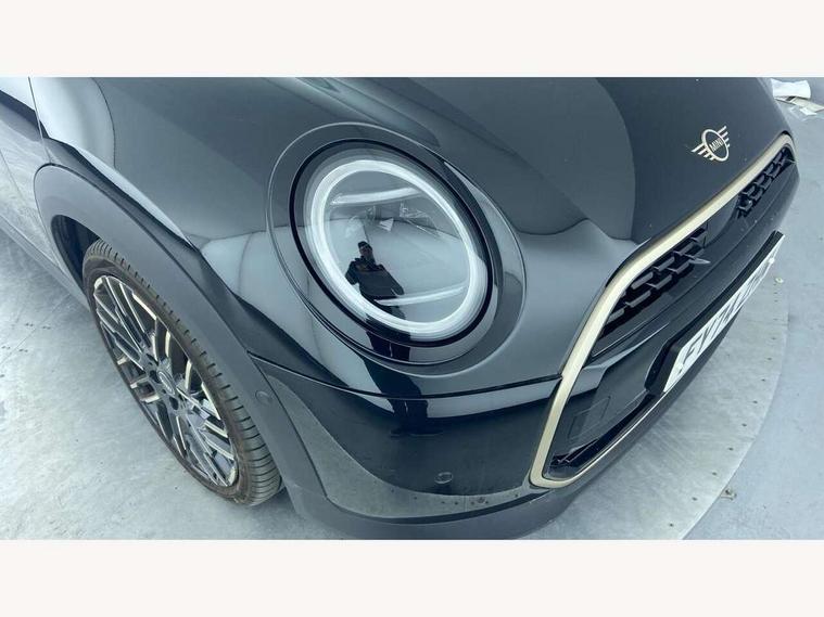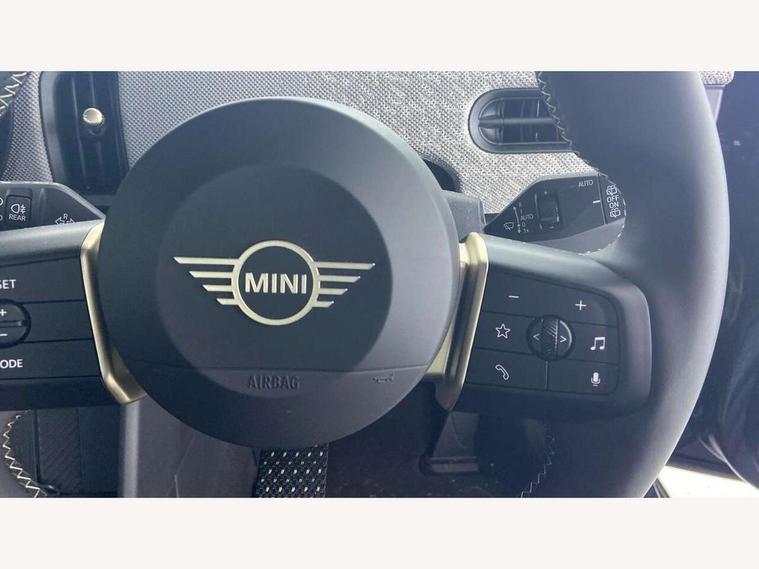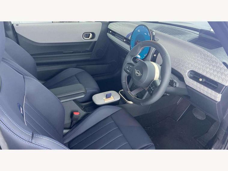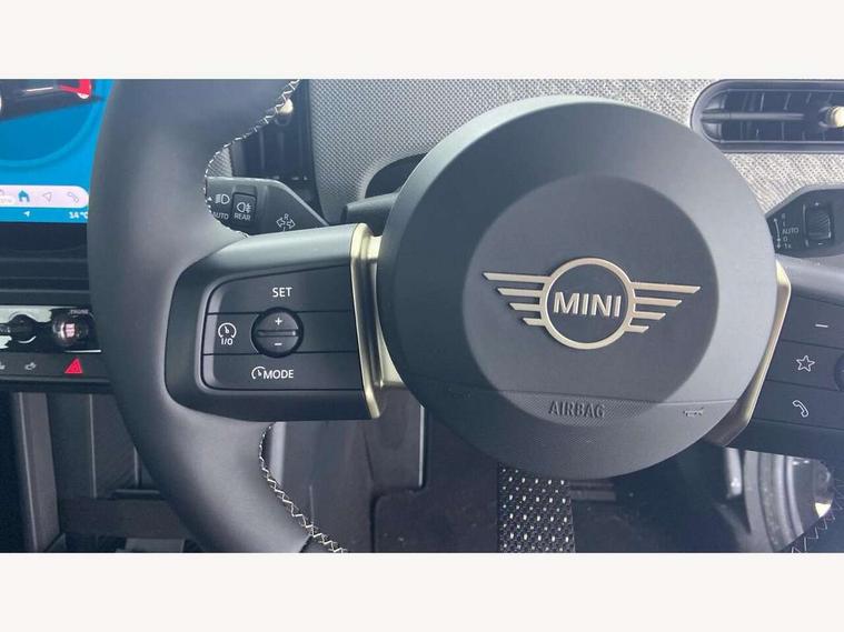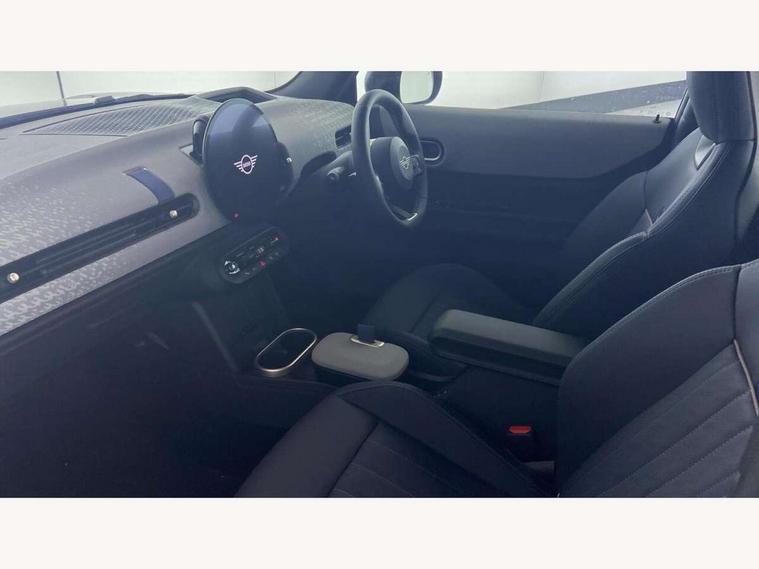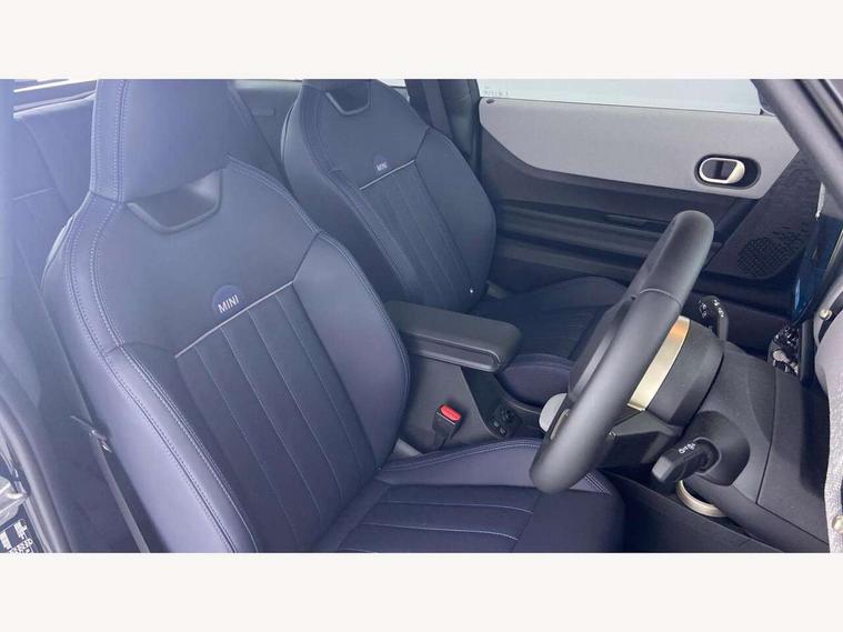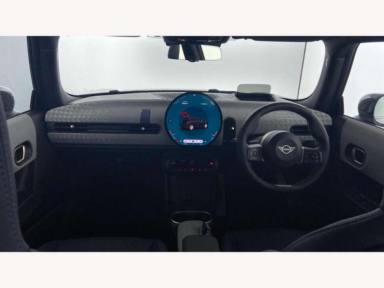 Central toggle bar, Circular OLED Screen, Compatible mobile phone bluetooth with audio streaming, Cruise control, Digital instrument cluster, Electro-mechanical speed dependant steering assistance, Emergency call service, MINI Experience Modes, Mini navigation system, On board computer, Service interval indicator, 7 speed steptronic transmission with double clutch, DAB Digital radio, Personal eSim, Auto headlights, Electric adjustable heated door mirrors, Electric front windows, Heated rear window, Heated windscreen washer jets, LED daytime running lights, LED Headlights, LED indicator lights, LED rear lights, Logos in Vibrant Silver, Rain sensor window wipers, Rear fog lights, Rear window wiper, Vibrant silver grille surround, 2 seat bench in second row, 2 zone automatic air conditioning, 60/40 rear seat bench, Ambient lighting, Cupholders, Dark headliner, Floor mats, Front and rear head restraints, Front compact armrest, Heated steering wheel, Height adjustable passenger seat, Lidded storage box in grey knit, Luggage compartment lighting, Single front passenger seat, Sport Vescin Steering Wheel black with vibrant silver accents, Sunvisors with vanity mirrors, Vescin synthetic leather upholstery, Driving assistant pack - Cooper Hatchback, Park assistant pack - Cooper Hatchback, 3 point seatbelts on all four seats, 6 Airbags - front, side, head and seat belt tensioners, Acoustic pedestrian protection, Anti-lock braking system (ABS), DSC - Dynamic Stability Control, Electronic parking brake, Front and rear disc brakes, Front ISOFIX (iSize), Front passenger airbag deactivation, Traction control, Tyre pressure monitoring system, Alarm, Immobiliser, Remote central locking, Blue decorative dash strap, Light Beige/Grey dash knit, Tyre repair kit,
