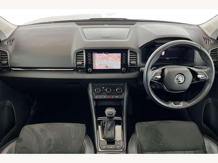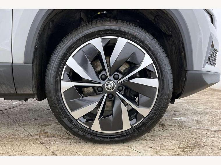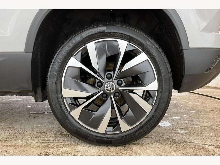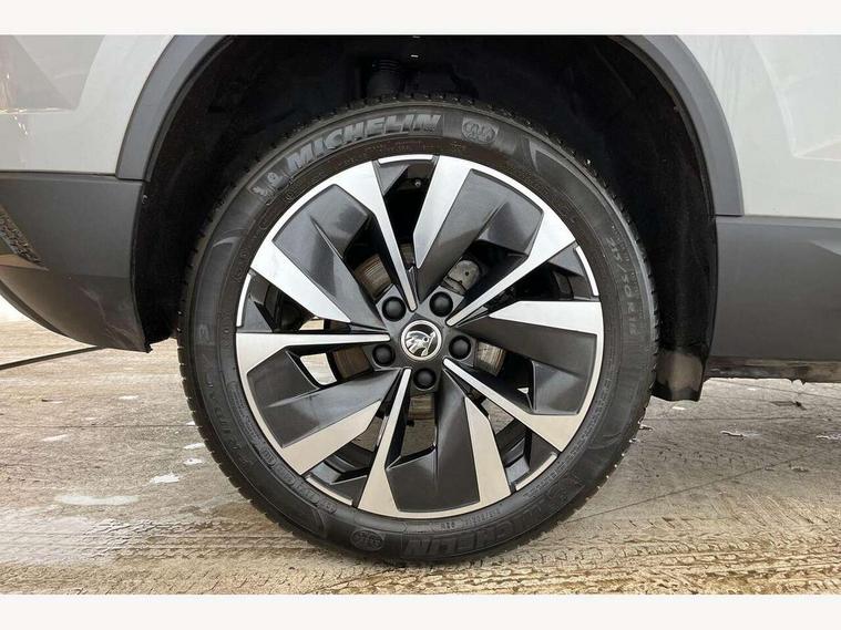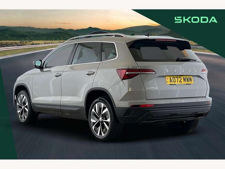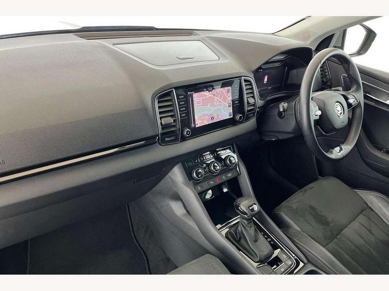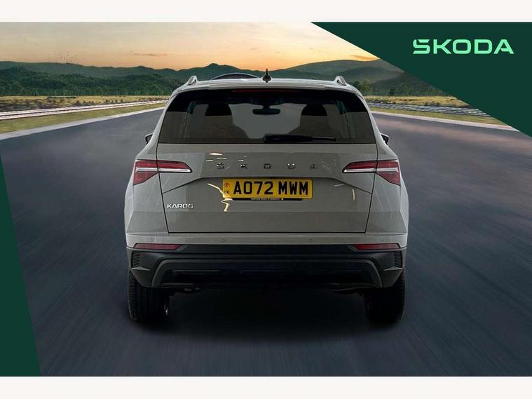8" Digital display, Care connect, Driver fatigue sensor, Emergency services call system, Outside temperature gauge, Service interval indicator, SmartLink wireless for Apple and wired for Android, Start/stop system with regenerative braking, USB C Port x 2 in front centre console, 8 Speakers, DAB radio with Bluetooth, USB connection, Acoustic glass, Aero front windscreen wipers with intermittent function, Auto dimming rear view mirror with light and rain sensors, Black electric window control buttons, Body colour door mirrors and handles, Dynamic headlight range control with cornering light function, Electric front and rear windows with child proof lock, Heated rear windscreen, LED daytime running lights, LED rear lights with high functionality welcome effect and dynamic indicators, Light assistant (coming/leaving home/tunnel light), Plastic scuff plates, Privacy glass, Rear side wing doors, Rear spoiler, Rear window wiper with washer system and intermittent control, Safety reflectors on front doors, 1.5 litre bottle holders in driver and front passenger door panels, 12V socket in boot, 12v socket in front centre armrest with storage compartment and rear air vents, 2 Folding hooks and nets in boot, 2 spoke leather heated multifunction steering wheel with DSG paddles, 2 x Tablet holder, 3 rear height adjustable headrests, 3 seat bench in 2nd row, 4 foldable roof handles with rear coat hooks, Black floor carpet, Chrome inner door handles, Decorative door sills with KAROQ badging, Double sided boot floor, Foldable hooks in the boot, Front head restraints, Height adjustable front three point seats belts with tensioners, Height/reach adjust steering wheel, Ice scraper, Illuminated glovebox, Illuminated luggage compartment, Isofix child seat preparation for front passenger seat, Isofix child seat preparation outer rear, Manual lumbar support for front seats, Pen holder, Pollen filter, Rear boot cover, Rear reading lights, Rubbish bin door, Safety vest holder, Single front passenger seat, Storage box in upper central dashboard closed, Sunvisors with illuminated vanity mirrors, Textile floor mats, Ticket holder, VarioFlex seats with standard rear seat release, Chrome roof rails + chrome pack - Karoq, Parking pack - Karoq, Automatic door unlocking in case of crash, Automatic fuel cut off in case of crash, Child locks on rear doors, Driver airbag, Electronic parking brake with auto hold function, Emergency rear braking signal, ESC including ABS, MSR, ASR, EDS, HBA, DSR, RBS, MKB and traction control, Front side airbags, Hill hold control, Knee airbags, Passenger airbag with switch-off function, Pedestrian monitor, Seatbelt reminder signalisation and pretensioner for all seats, Three point seatbelts rear, Two tone horn, Tyre pressure display, Tyre pressure monitor, Alarm with interior monitoring, back up horn and tilt sensor with safe function, Electronic engine immobiliser, Keyless entry and start/stop, Remote central locking with 2 remote folding keys, Chrome framed air vents, Anti-theft wheel bolts protection, Storage on wheel cover, Tool kit,