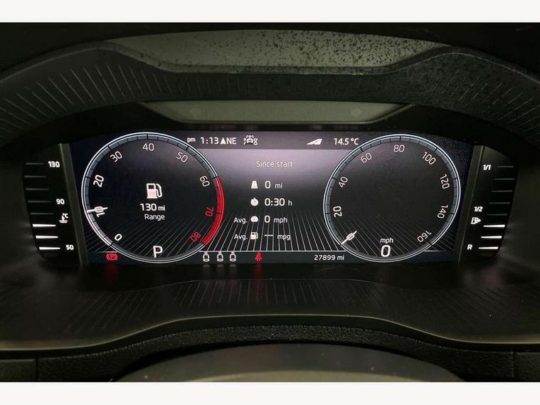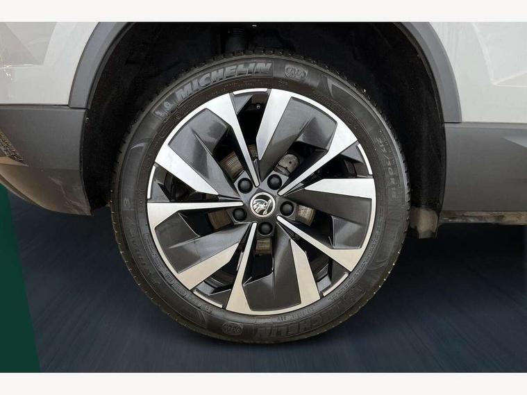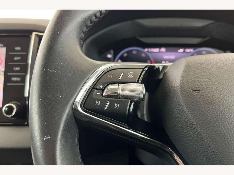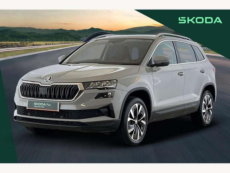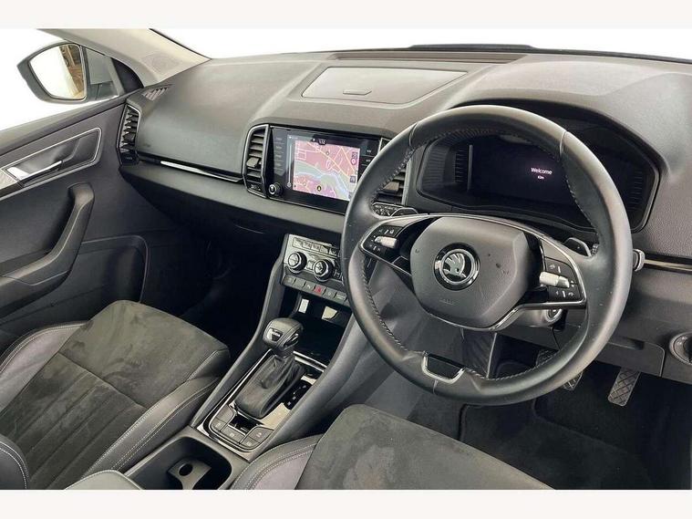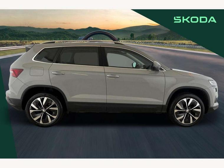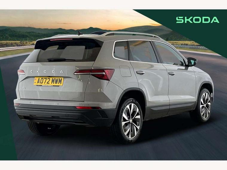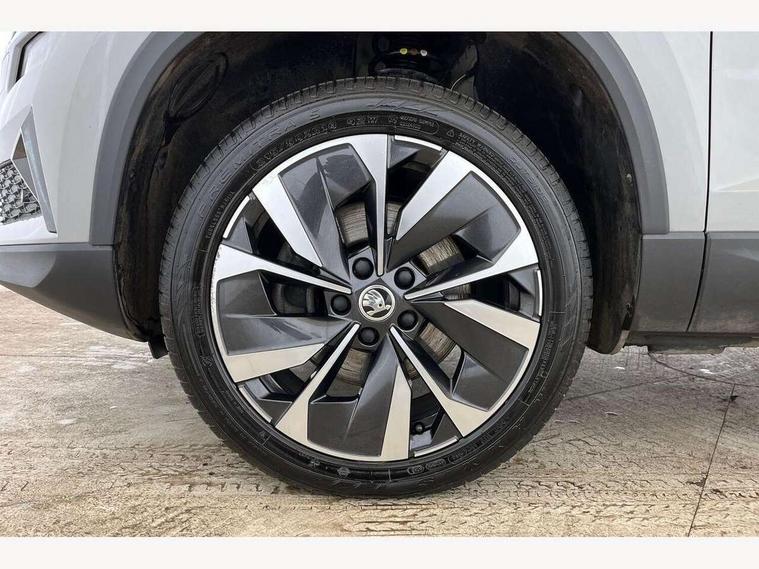 8" Digital display, Care connect, Driver fatigue sensor, Emergency services call system, Outside temperature gauge, Service interval indicator, SmartLink wireless for Apple and wired for Android, Start/stop system with regenerative braking, USB C Port x 2 in front centre console, 8 Speakers, DAB radio with Bluetooth, USB connection, Acoustic glass, Aero front windscreen wipers with intermittent function, Auto dimming rear view mirror with light and rain sensors, Black electric window control buttons, Body colour door mirrors and handles, Dynamic headlight range control with cornering light function, Electric front and rear windows with child proof lock, Heated rear windscreen, LED daytime running lights, LED rear lights with high functionality welcome effect and dynamic indicators, Light assistant (coming/leaving home/tunnel light), Plastic scuff plates, Privacy glass, Rear side wing doors, Rear spoiler, Rear window wiper with washer system and intermittent control, Safety reflectors on front doors, 1.5 litre bottle holders in driver and front passenger door panels, 12V socket in boot, 12v socket in front centre armrest with storage compartment and rear air vents, 2 Folding hooks and nets in boot, 2 spoke leather heated multifunction steering wheel with DSG paddles, 2 x Tablet holder, 3 rear height adjustable headrests, 3 seat bench in 2nd row, 4 foldable roof handles with rear coat hooks, Black floor carpet, Chrome inner door handles, Decorative door sills with KAROQ badging, Double sided boot floor, Foldable hooks in the boot, Front head restraints, Height adjustable front three point seats belts with tensioners, Height/reach adjust steering wheel, Ice scraper, Illuminated glovebox, Illuminated luggage compartment, Isofix child seat preparation for front passenger seat, Isofix child seat preparation outer rear, Manual lumbar support for front seats, Pen holder, Pollen filter, Rear boot cover, Rear reading lights, Rubbish bin door, Safety vest holder, Single front passenger seat, Storage box in upper central dashboard closed, Sunvisors with illuminated vanity mirrors, Textile floor mats, Ticket holder, VarioFlex seats with standard rear seat release, Chrome roof rails + chrome pack - Karoq, Parking pack - Karoq, Automatic door unlocking in case of crash, Automatic fuel cut off in case of crash, Child locks on rear doors, Driver airbag, Electronic parking brake with auto hold function, Emergency rear braking signal, ESC including ABS, MSR, ASR, EDS, HBA, DSR, RBS, MKB and traction control, Front side airbags, Hill hold control, Knee airbags, Passenger airbag with switch-off function, Pedestrian monitor, Seatbelt reminder signalisation and pretensioner for all seats, Three point seatbelts rear, Two tone horn, Tyre pressure display, Tyre pressure monitor, Alarm with interior monitoring, back up horn and tilt sensor with safe function, Electronic engine immobiliser, Keyless entry and start/stop, Remote central locking with 2 remote folding keys, Chrome framed air vents, Anti-theft wheel bolts protection, Storage on wheel cover, Tool kit,