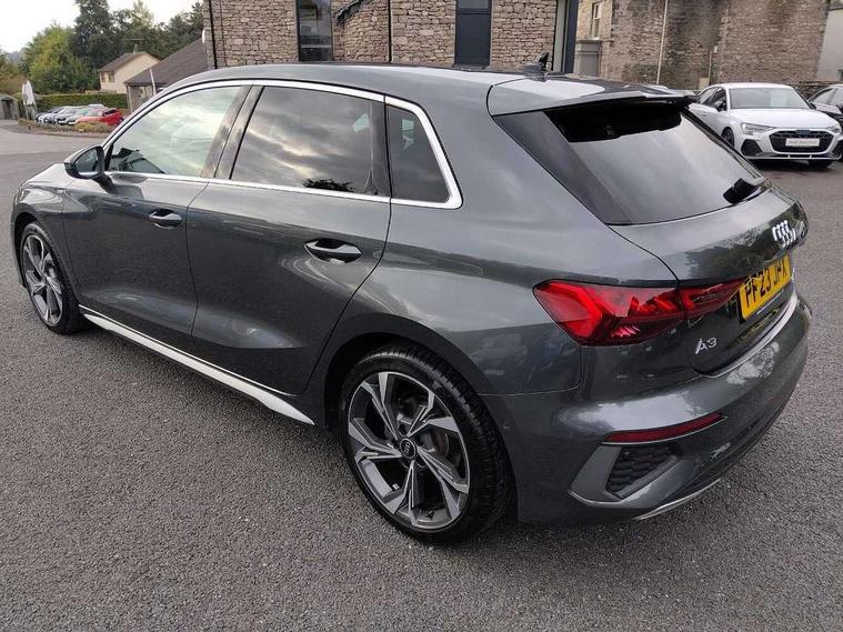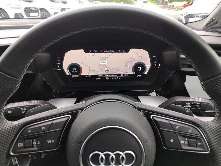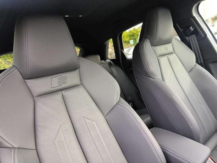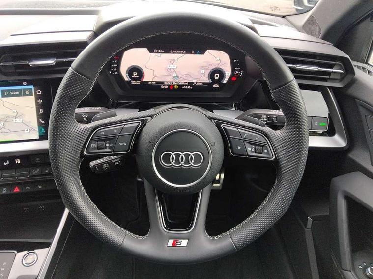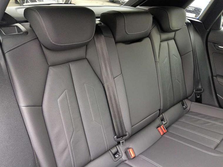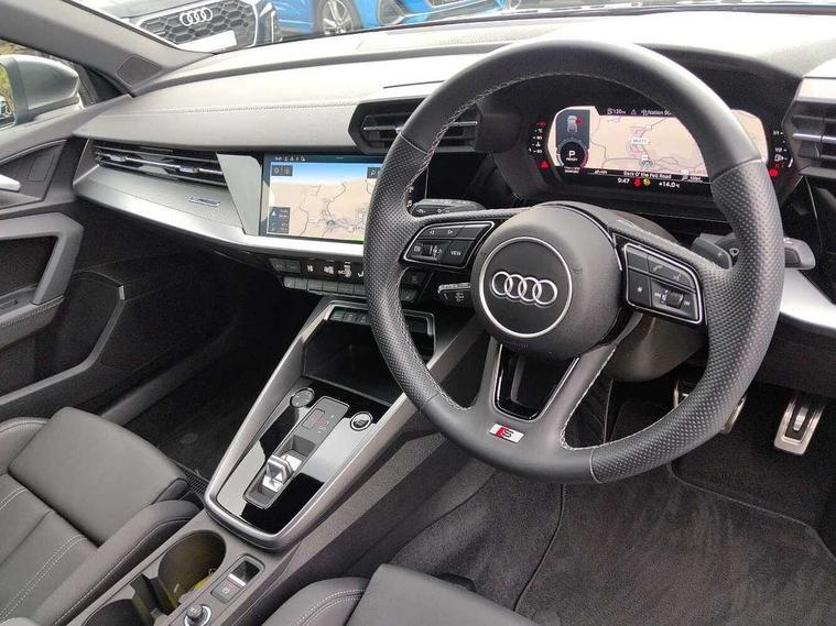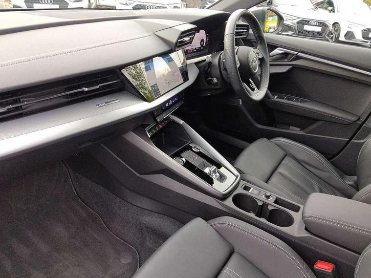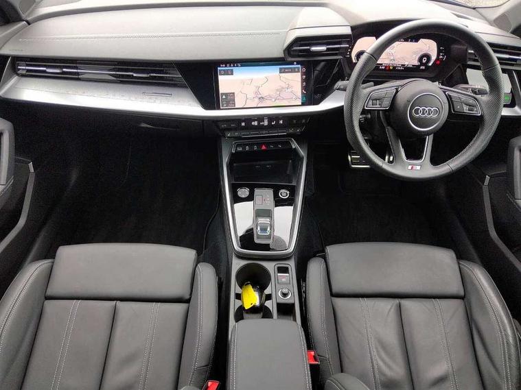 Audi drive select (Auto, Comfort, Dynamic, Efficiency and Individual), Audi smartphone interface, Audi Virtual Cockpit - 10.25" digital and colour instrument cluster, Automatic start/stop system with recuperation, Bluetooth interface, Camera based traffic sign recognition, Collision avoidance assistant, e-Call (emergency call), Electromechanical power speed sensitive steering, Lane departure warning system, MMI Navigation Plus with high resolution 10.1" colour touch screen display, Service indicator, Trip computer, Voice control system with natural language interaction, Sports suspension, 2xUSB-C connection with data and charging functions, 6 passive loudspeakers, DAB Digital radio, 3rd brake light, Acoustic glass windscreen, Aluminium window trim, Auto dimming frameless rear view mirror, Body colour exterior mirrors, Electrically adjustable/heated/folding/auto dimming door mirrors with integrated LED indications + kerb view function for passenger side, Front electric windows, Illuminated aluminium inserts front door sills with S logo, LED daytime running lights, LED headlights with LED rear lights and dynamic rear indicators, Light and rain sensors, Privacy glass - dark tinted rear window, rear door and side windows, Rear electric windows, Rear side air outlets in grained matt black, Rear side wing doors, Rear wiper, S line bumpers, S roof spoiler, 12V socket and storage compartment in front centre console, 3 seat bench in 2nd row, 3 spoke leather multifunction steering wheel with paddle shift, 4 way electrically adjustable lumbar support for driver and front passenger, 60/40 split folding rear seat bench, Black cloth headlining, Dual zone electronic climate control, Front and rear centre armrest in leather, Front and rear headrests, Front/rear floor mats, Height and reach adjustable steering wheel, Interior lighting - glove compartment light and right hand side, Luggage compartment floor covering, Manual boot compartment lid, Manually adjustable front seats, Seat side bolsters, Single front passenger seat, Stainless steel pedals and front footrest in black, Twin leather upholstery with front sports seats S embossed logo, Aluminium interior elements pack - A3 Sportback, LED interior lighting pack - A3 Sportback, S line styling pack - A3 Sportback, 3x3 point rear seat belts, Driver and front passenger airbag with passenger airbag deactivation, Electronic Stabilisation Control (ESC) including ABS, ASR and EDL, First aid kit with warning triangle and 2 safety vests, Front side airbags with head airbags and interaction airbag, Pre-sense front with pedestrian and cyclist detection, Seatbelt monitoring, Tyre pressure loss indicator, Anti theft alarm, Anti-theft wheel bolts, Electronically operated child lock, Immobiliser, Remote control central locking, Dark spectrum aluminium inlays, accent surfaces in the dashboard and centre console in platinum grey silk effect paint finish,