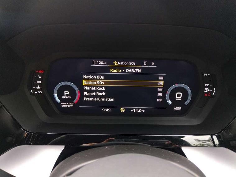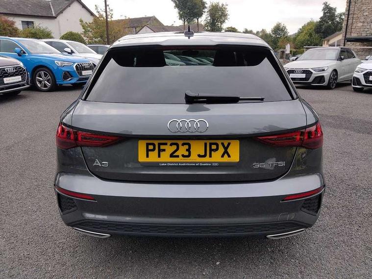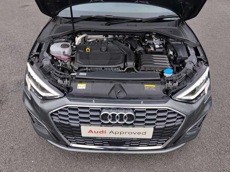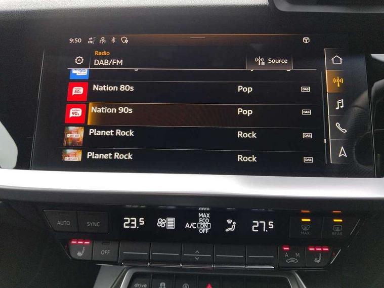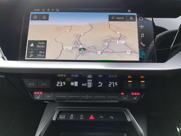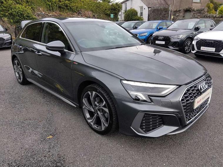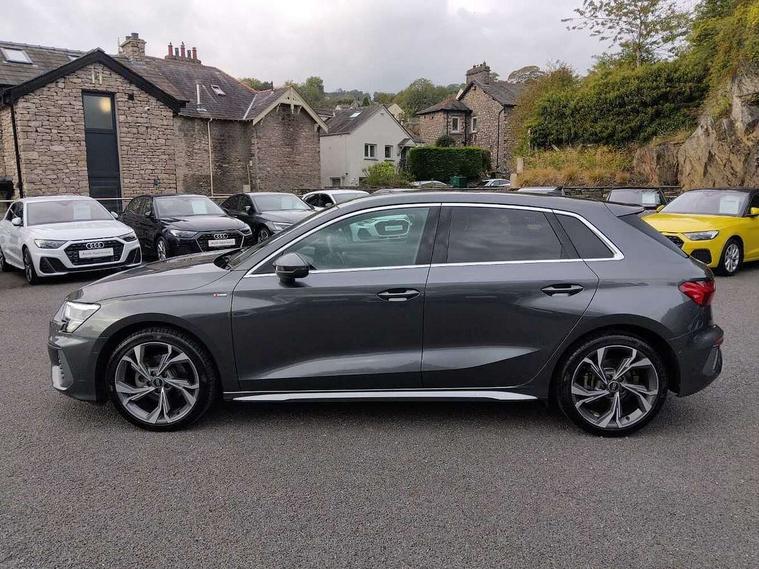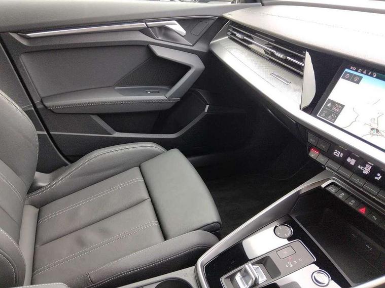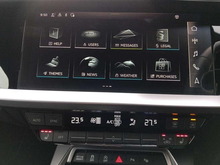 Audi drive select (Auto, Comfort, Dynamic, Efficiency and Individual), Audi smartphone interface, Audi Virtual Cockpit - 10.25" digital and colour instrument cluster, Automatic start/stop system with recuperation, Bluetooth interface, Camera based traffic sign recognition, Collision avoidance assistant, e-Call (emergency call), Electromechanical power speed sensitive steering, Lane departure warning system, MMI Navigation Plus with high resolution 10.1" colour touch screen display, Service indicator, Trip computer, Voice control system with natural language interaction, Sports suspension, 2xUSB-C connection with data and charging functions, 6 passive loudspeakers, DAB Digital radio, 3rd brake light, Acoustic glass windscreen, Aluminium window trim, Auto dimming frameless rear view mirror, Body colour exterior mirrors, Electrically adjustable/heated/folding/auto dimming door mirrors with integrated LED indications + kerb view function for passenger side, Front electric windows, Illuminated aluminium inserts front door sills with S logo, LED daytime running lights, LED headlights with LED rear lights and dynamic rear indicators, Light and rain sensors, Privacy glass - dark tinted rear window, rear door and side windows, Rear electric windows, Rear side air outlets in grained matt black, Rear side wing doors, Rear wiper, S line bumpers, S roof spoiler, 12V socket and storage compartment in front centre console, 3 seat bench in 2nd row, 3 spoke leather multifunction steering wheel with paddle shift, 4 way electrically adjustable lumbar support for driver and front passenger, 60/40 split folding rear seat bench, Black cloth headlining, Dual zone electronic climate control, Front and rear centre armrest in leather, Front and rear headrests, Front/rear floor mats, Height and reach adjustable steering wheel, Interior lighting - glove compartment light and right hand side, Luggage compartment floor covering, Manual boot compartment lid, Manually adjustable front seats, Seat side bolsters, Single front passenger seat, Stainless steel pedals and front footrest in black, Twin leather upholstery with front sports seats S embossed logo, Aluminium interior elements pack - A3 Sportback, LED interior lighting pack - A3 Sportback, S line styling pack - A3 Sportback, 3x3 point rear seat belts, Driver and front passenger airbag with passenger airbag deactivation, Electronic Stabilisation Control (ESC) including ABS, ASR and EDL, First aid kit with warning triangle and 2 safety vests, Front side airbags with head airbags and interaction airbag, Pre-sense front with pedestrian and cyclist detection, Seatbelt monitoring, Tyre pressure loss indicator, Anti theft alarm, Anti-theft wheel bolts, Electronically operated child lock, Immobiliser, Remote control central locking, Dark spectrum aluminium inlays, accent surfaces in the dashboard and centre console in platinum grey silk effect paint finish,