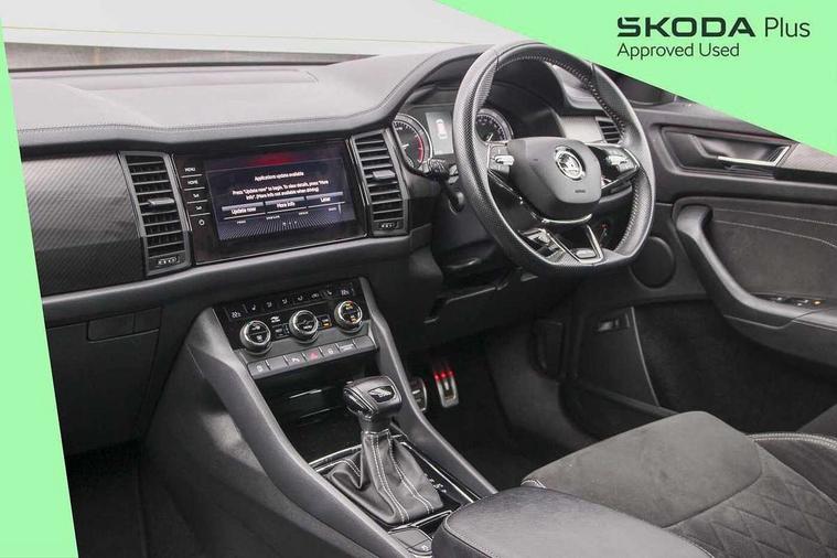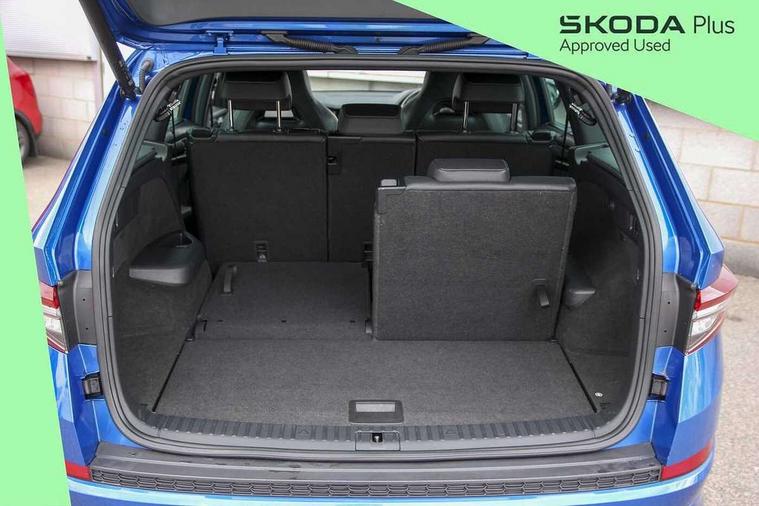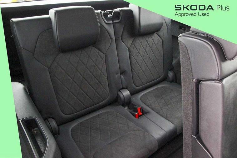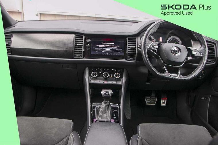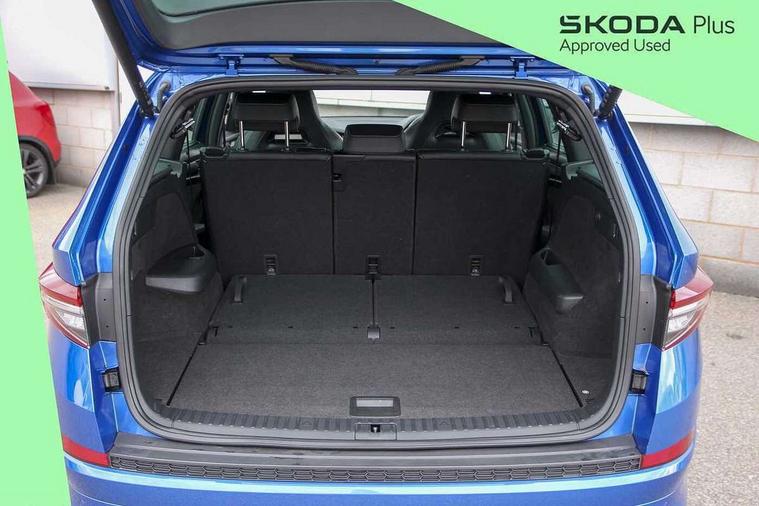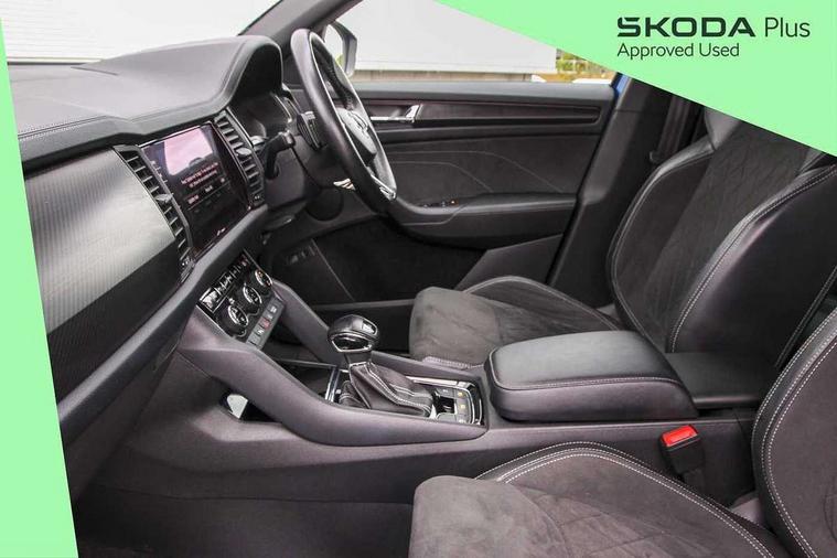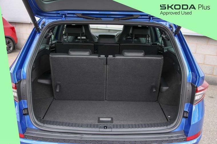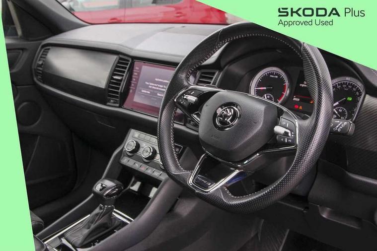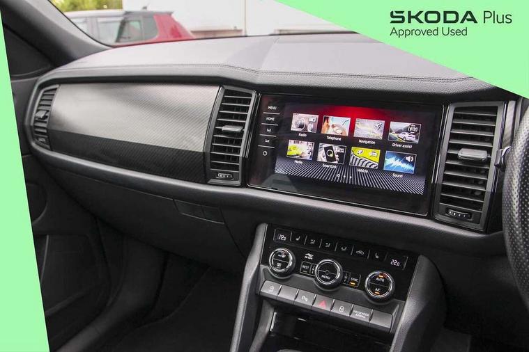 Bluetooth system, Columbus satellite navigation with 9.2" touchscreen, integrated Wi-Fi, web radio, E-call, ECO Stop/start function, Exterior temperature indicator, Progressive steering, Rear view camera, Smartlink wireless for apple carplay and wired for android auto, Speed limiter, Tailgate unlocking from outside, USB C Port x 2 in front centre console, Wireless charging, 8 Speakers, DAB Digital radio, Aero front windscreen wipers with intermittent function, Aero rear window wiper, Auto dimming rear view mirror, Black roof rails, Black sports styling including front grille and window surrounds, Black wheel arch surrounds, Body colour bumpers, Body colour door handles, Electric adjustable/heated/folding door mirrors, driver side auto dimming with boarding sports and memory function, Electric front and rear windows, Extended rear spoiler with finlets in gloss black, Front fog lights, Full LED matrix headlights with AFS (adaptive front light system), cornering function and AWL (all weather lighting system), Gloss black door mirrors, Headlight washers, Heated rear window, Invisible tailpipe, LED daytime running lights, LED rear fog light, LED third brake light in rear spoiler, Light assistant (coming/leaving home/tunnel light), Off-road style lower front bumper element, Privacy glass, Rain and light sensors, Rear diffuser, Rear LED lights (high functionality) with welcome effect and dynamic indicators, Rear side wing doors, Safety reflectors on front and rear doors, Sportline badge on front fender, Sports front and rear bumpers including lower rear chrome strip, Tailgate lettering in Black, Window control switches with black trim, 12V socket in boot, 2 rails with 2 hooks, 2 seat bench in 3rd row, 3 seat bench in 2nd row, 4 foldable roof handles with rear coat hooks, 60:40 foldable rear seat with sliding adjustment and backrest angle adjustment, Aluminium pedals, Black roof headlining, Bottle holders in door panel in the 1.5 litre front and 1 litre rear, Cargo storage compartments, Chrome headlight control button, Chrome interior door handles, Coat hooks on B pillar, Covered storage compartment on driver side, Decorative door sills in the front and rear, Front centre armrest with storage compartment, cup holder and 12V socket, Front courtesy lights, Gear shift lever with chrome frame and black gloss insert, Grey stitching in front and rear armrests and door armrests + door inserts, Height adjustable front headrests, Illuminated and cooled glovebox, Illuminated luggage compartment, Isofix child seat fittings in outer rear seats with top tether, Manually adjustable steering column, Microsuede door panels, Net programme in boot (1x horizontal Net, 2x vertical Nets), Overhead glasses storage compartment, Pollen filter, Rear centre armrest with cupholders, Single front passenger seat, Sliding trunk cover, Small Bags on the inner sides of the front backrests, Sports seats, Sunvisors with illuminated vanity mirrors, Three rear height adjustable headrests, Ticket holder on A Pillar, Umbrella in door panel, Variable boot floor, LED Interior light pack - Kodiaq, Auto door release and activation of warning lights in the event of an accident, Child locks on rear doors, Driver and front passenger airbag with knee airbag and front passenger airbag deactivation, Electronic parking brake with hill start assist, Emergency rear braking signal, ESC (incl. ABS+MSR+ASR+EDS+HBA+DSR+RBS+MKB), Front assist with autonomous emergency braking, Front side airbags with curtain airbags, Fuel cut off safety device, Height adjustable front 3 point seatbelts + pretensioners, Hill hold control, Rear disc brakes, Safety vest holder in door, Seat belt reminder for all seats, Three point rear seat belts, Two tone horn, Tyre pressure monitor, Alarm with interior monitoring and tilt sensor with safe function, Anti-theft wheel bolts, Immobiliser, Keyless entry and start system (KESSY), Remote central locking with 2 keys, Black air vent surround, Carbon finish dashboard and door inserts, Grey stitching in dashboard, 20" Vega Anthracite alloy wheels, Temporary spare wheel (space saver),