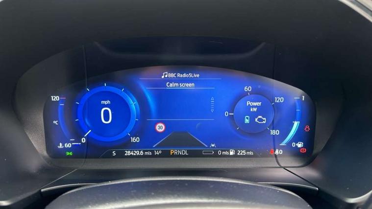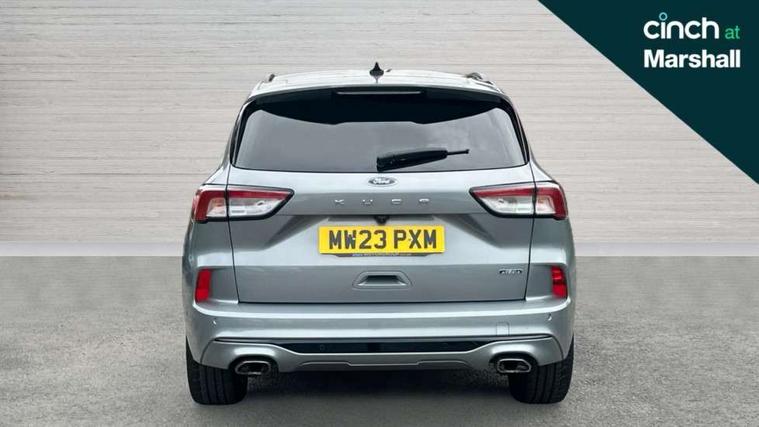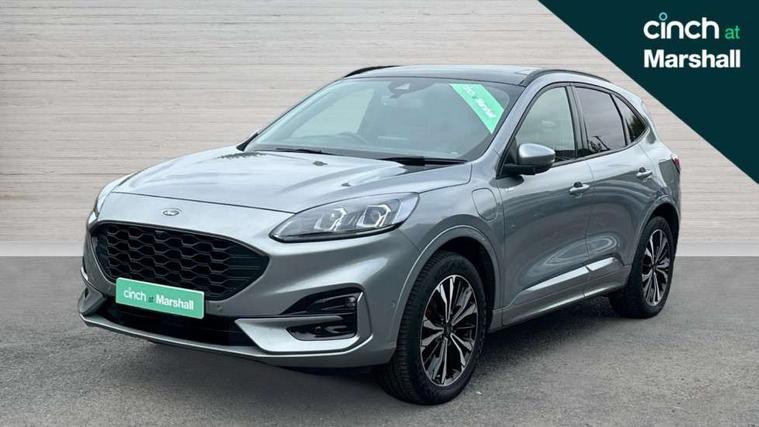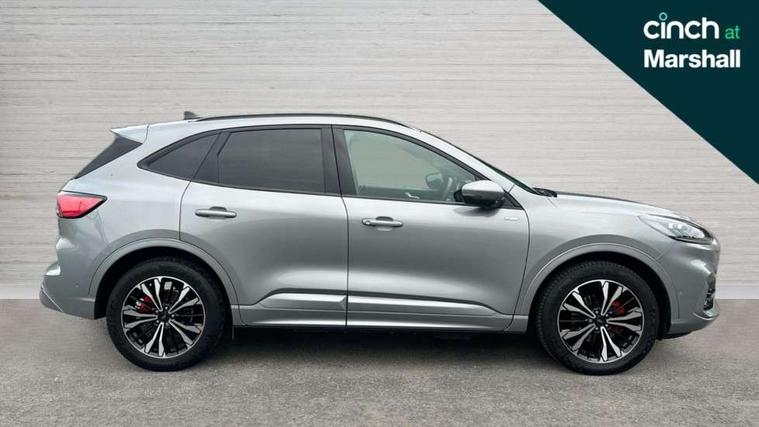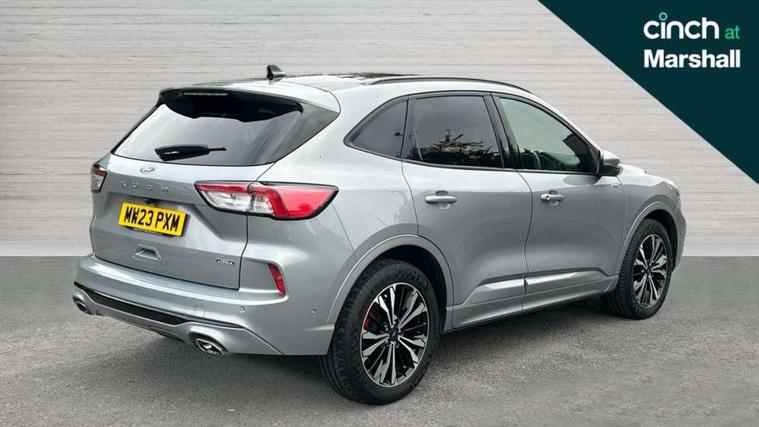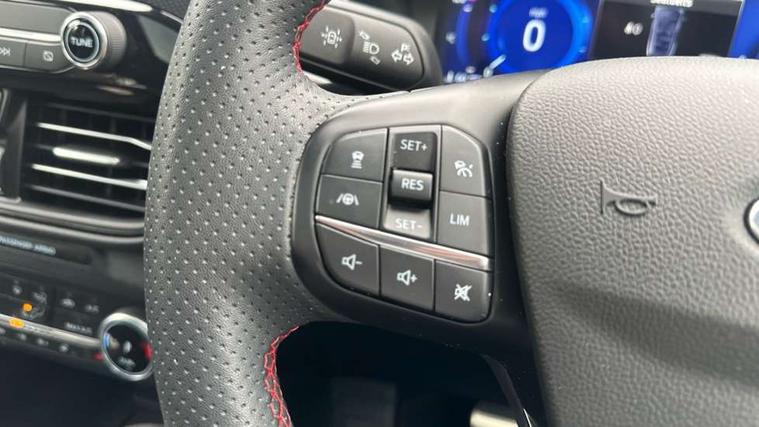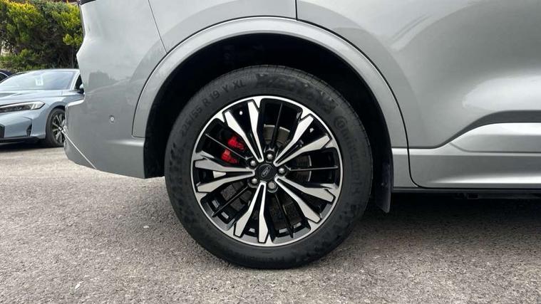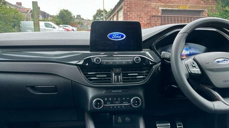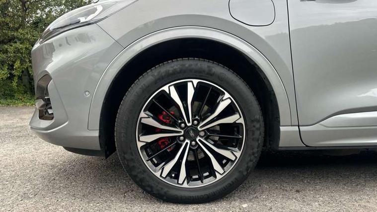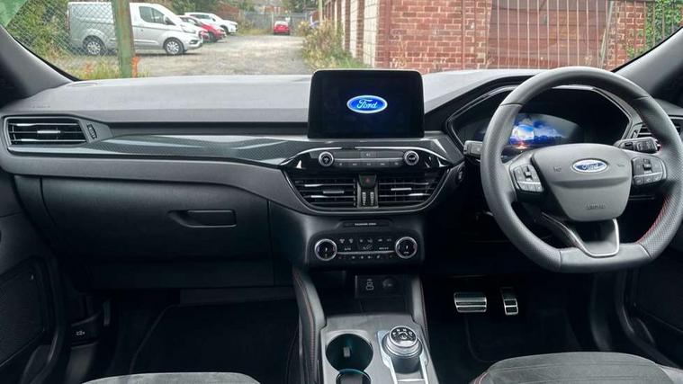 Driver impairment monitor, Ford easy fuel, Ford SYNC 3 with 8" colour touchscreen, App Link, andriod auto/apple carPlay and navigation with Ford pass connect, Front and rear parking sensors, Hands free power tailgate, Intelligent speed assist, Lane keeping aid with lane departure warning, Mobile phone wireless charging pad, Power assist steering, Selectable drive modes, 3-Pin Home charge cable (230V/16A Domestic socket), Sports suspension, Ford DAB audio system with 6 speakers, Auto dimming rear view mirror, Auto headlamps with high and low beam, Auto wipers, Black roof rails, Front LED fog lights with cornering function, Full LED headlamps, Large rear spoiler, LED daytime running lights, LED rear lights, Power folding heated door mirrors with puddle lights, Power front/rear windows with global close, Power opening panoramic roof, Privacy glass, Quickclear heated windscreen, ST Line body styling kit with unique front and rear fascia and bumper, rear painted diffuser, front painted skid plates, dark mesh upper grille, ST Line front scuff plates, Twin exhausts, 10 way power adjustable drivers seat, 2nd row sliding seats, 8 way manual passenger seat including lumbar support and height adjust, Alloy pedals, Ambient lighting, Centre console with electronic parking brake, Dark headlining and pillars, Dual electronic automatic temperature control, Flat bottomed leather steering wheel in sensico with red stitching, Front and rear head restraints, Heated passenger and driver seats, Rear charging point, Sensico partial premium leather upholstery, Sports seats, ST Line front and rear floor mats, B&O with large instrument cluster pack - Kuga, 3x3 point rear seatbelts, Airbags - front driver/passenger, front and rear curtain, Drivers knee airbag, Electronic stability control (ESC) and ABS, Ford MyKey Gen 2 safety system, Post collision braking, Powered child proof rear door locks, Pre collision assist with autonomous emergency braking, Red brake calipers, Tyre pressure monitoring system, Engine immobiliser, Keyless entry, Keyless start with 'Ford Power' starter button, Locking wheel nuts, Remote powered central double locking doors, Thatcham category 1 alarm,