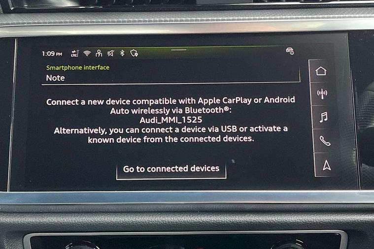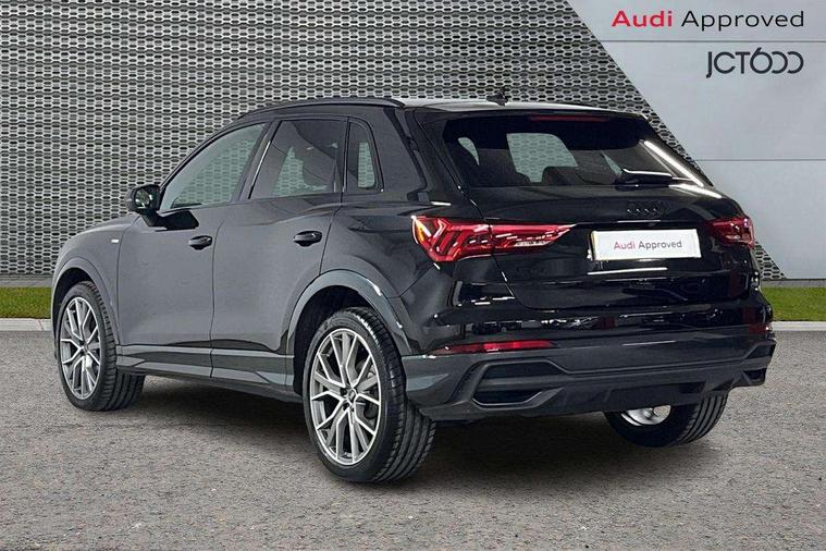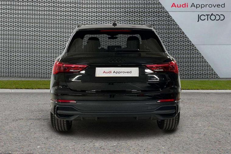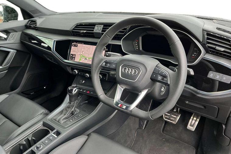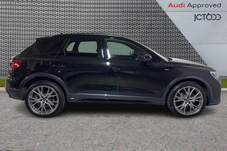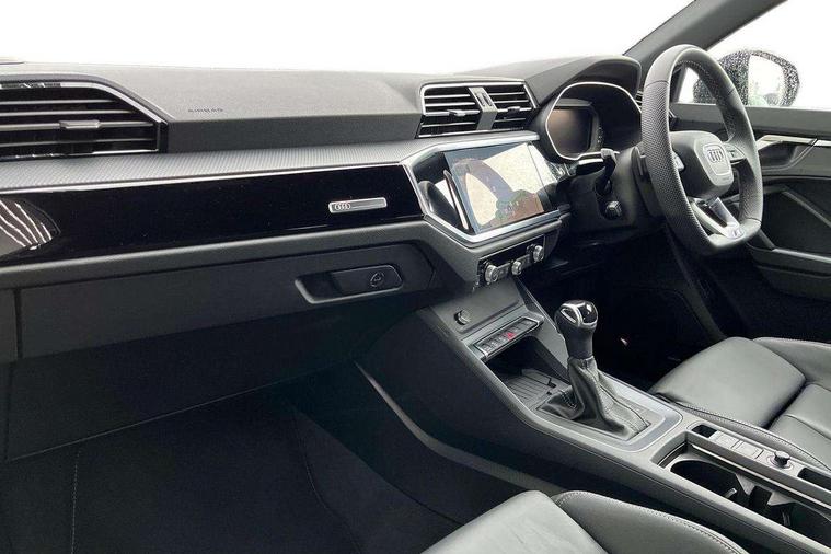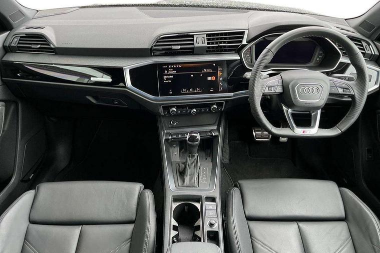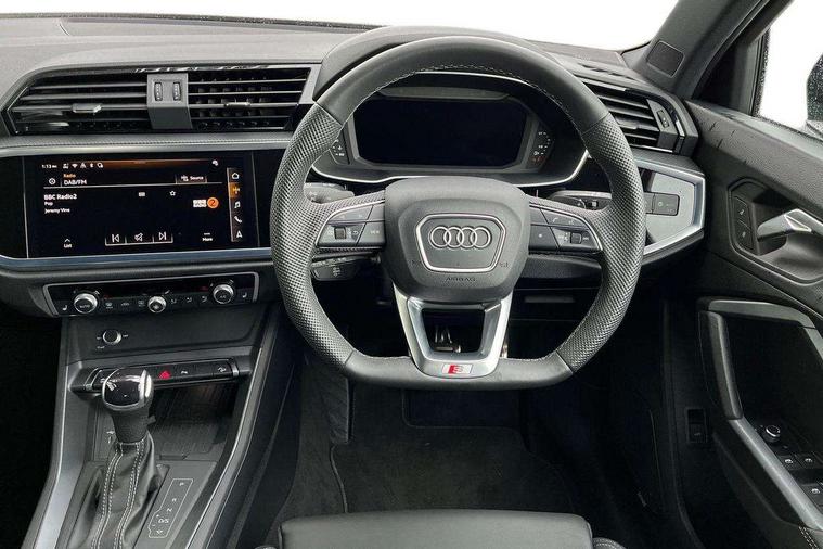 Amazon alexa Integration, Audi connect safety and service, Audi drive select, Audi lane departure warning, Audi Virtual Cockpit - 10.25" display, Bluetooth interface, Camera based traffic sign recognition, Distraction and Fatigue warning, Legal emergency call, MMI Navigation Plus with high resolution 10.1 inch touchscreen colour display, Power operated tailgate, Progressive steering, Service interval indicator, Smartphone interface includes wireless Apple carplay/Android Auto, Start stop system with recuperation, Voice control system with natural language interaction, Sports suspension, 2 USB-C ports with charge and data functions, 6 passive loudspeakers, DAB digital radio module, Acoustic windscreen, Audi Beam uses LEDs to project the Audi logo onto the ground as you exit your Q3, Auto dimming door mirrors, Auto dimming frameless rear view mirror, Black roof rails, Electrically folding, adjustable and heated door mirrors with integrated LED side indicators and kerb view function for passenger side, Front and rear electric windows, Front fog lights, Grille vertical bars in aluminium silver/Matt, High gloss black finish B and C pillars, LED Dynamic rear indicators, LED headlights with LED daytime running lights, LED rear lights, LED third brake light, Privacy glass dark tinted rear and rear-side windows (from B-pillar backwards), Rain and light sensors, Rear diffuser grille in grained matt black, Rear diffuser strip in matt anthracite black, Rear side wing doors, Rear wiper, S line bumpers in contrasting Manhattan grey, Variable front intermittent wipers, 12V socket in rear centre console, 3 seat bench in 2nd row, 40:20:40 folding with manual adjustment for 60:40 forwards/backwards position and backrest angle, Adjustable rear seat bench/backrest with centre armrest and cupholder, Black cloth headlining, Dual zone electronic climate control, Electric lumbar support, Front and rear black floor mats with contrast stitching in rock grey, Front and rear headrests, Front centre armrest, Height and reach adjustable steering wheel, Illuminated door sill trims with S logo, ISOFIX child seat mounting for front passenger with airbag deactivation and outer rear seat including top tether attachment point for outer rear seats, Manual front seats with height adjustment, Perforated leather gearknob, Single front passenger seat, Stainless steel luggage compartment sill finisher, Stainless steel pedals, Twin leather upholstery with front sport seats + S embossing, Black styling pack - Q3, Non smoking pack - Q3, 3x3 point rear seatbelts, 6 airbags - Driver, front passenger, curtain and side windows, Audi pre-sense front with pedestrain and cyclist recognition, Electrically operated child locks on rear doors, Electromechanical parking brake, Electronic stabilisation control including ABS, ASR and EDL, Front seatbelt reminder, Hill descent control, Hill hold assist, Pre sense basic, Seatbelt monitoring, Tyre pressure warning, Warning triangle and first aid kit, Anti theft wheel bolts, Immobiliser, Remote central locking, Thatcham approved category 1 anti theft alarm, Aluminium look interior elements, Detail dashboard around MMI touch colour display in glass look, black with surround in aluminium look, Leatherette door armrest, Piano black inlay,