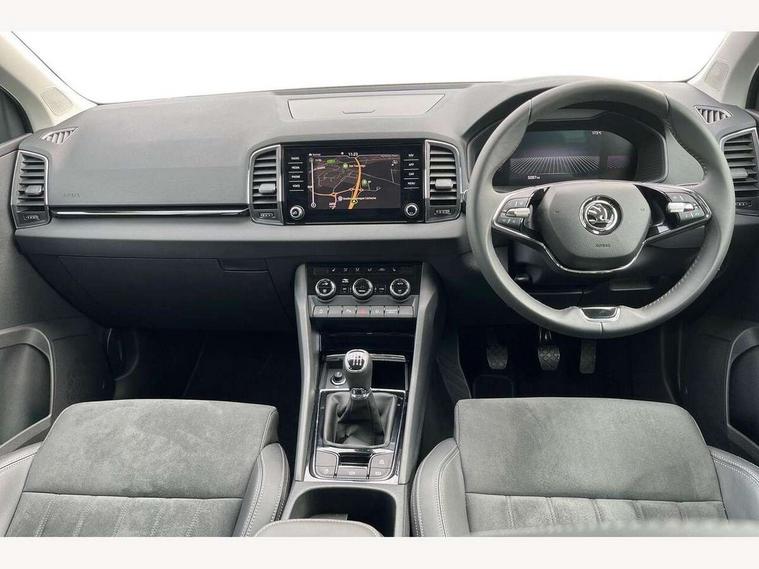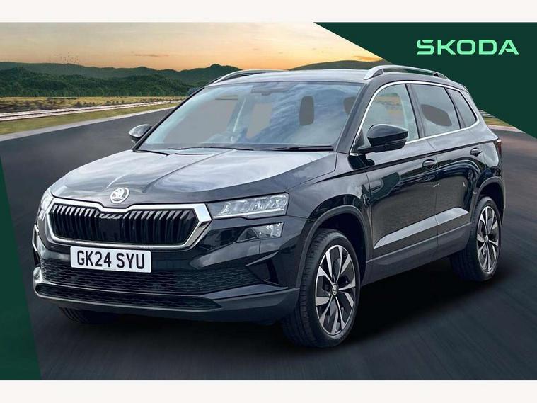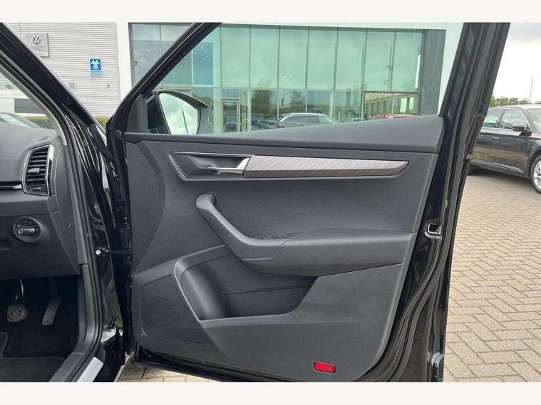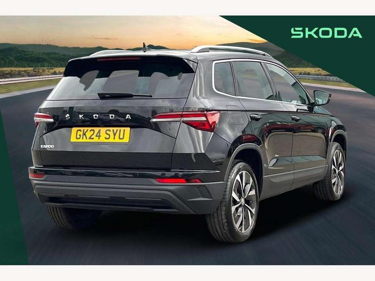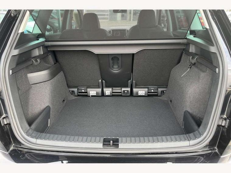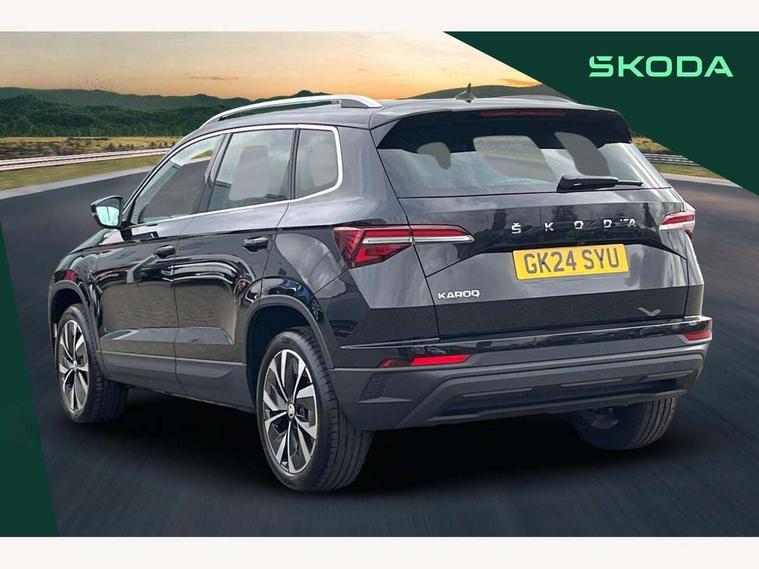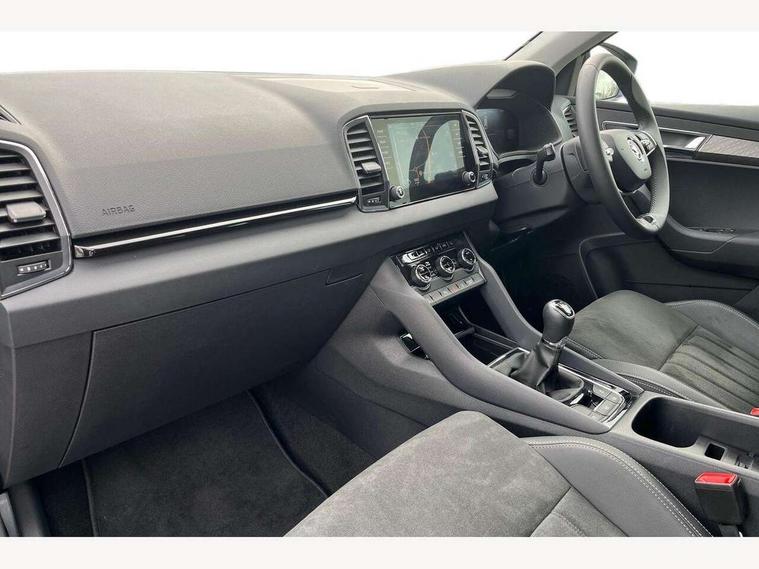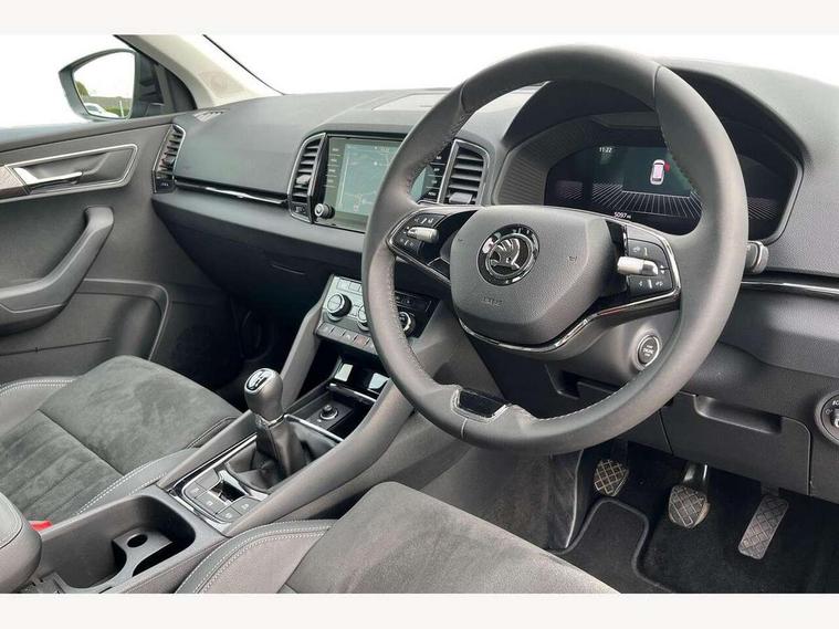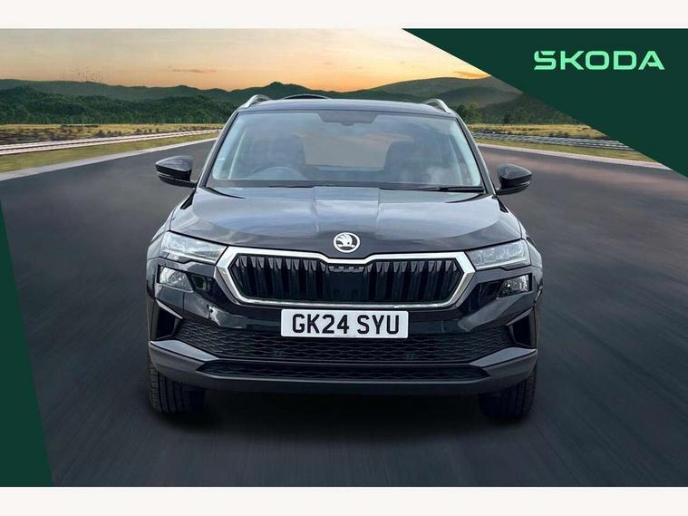 8" Digital display, Care connect, Drive mode selector, Driver fatigue sensor, Electro-mechanical PAS, Emergency services call system, Outside temperature gauge, Service interval indicator, SmartLink wireless for Apple and wired for Android, Start/stop system with regenerative braking, USB C Port x 2 in front centre console, 8 Speakers, DAB radio with Bluetooth, USB connection, Acoustic glass, Aero front windscreen wipers with intermittent function, Auto dimming rear view mirror with light and rain sensors, Black electric window control buttons, Body colour door mirrors and handles, Dynamic headlight range control with cornering light function, Electric front and rear windows with child proof lock, Heated rear windscreen, LED daytime running lights, LED rear lights with high functionality welcome effect and dynamic indicators, Light assistant (coming/leaving home/tunnel light), Plastic scuff plates, Privacy glass, Rear side wing doors, Rear spoiler, Rear window wiper with washer system and intermittent control, Safety reflectors on front doors, Third brake light, 1.5 litre bottle holders in driver and front passenger door panels, 12V socket in boot, 12v socket in front centre armrest with storage compartment and rear air vents, 2 spoke leather heated multifunction steering wheel, 2 x Tablet holder, 3 rear height adjustable headrests, 3 seat bench in 2nd row, 4 foldable roof handles with rear coat hooks, Black floor carpet, Chrome inner door handles, Double sided boot floor, Foldable hooks in the boot, Front head restraints, Height adjustable front three point seats belts with tensioners, Height/reach adjust steering wheel, Ice scraper, Illuminated glovebox, Illuminated luggage compartment, Isofix child seat preparation for front passenger seat, Isofix child seat preparation outer rear, Manual lumbar support for front seats, Pen holder, Pollen filter, Rear boot cover, Rear reading lights, Rubbish bin door, Safety vest holder, Single front passenger seat, Storage box in upper central dashboard closed, Sunvisors with illuminated vanity mirrors, Textile floor mats, Ticket holder, VarioFlex seats with standard rear seat release, Boot pack - Karoq, Design Pack - Karoq, Parking pack - Karoq, Automatic door unlocking in case of crash, Automatic fuel cut off in case of crash, Child locks on rear doors, Driver airbag, Electronic parking brake with auto hold function, Emergency rear braking signal, ESC including ABS, MSR, ASR, EDS, HBA, DSR, RBS, MKB and traction control, Front side airbags, Hill hold control, Knee airbags, Passenger airbag with switch-off function, Pedestrian monitor, Seatbelt reminder signalisation and pretensioner for all seats, Three point seatbelts rear, Two tone horn, Tyre pressure display, Tyre pressure monitor, Alarm with interior monitoring, back up horn and tilt sensor with safe function, Electronic engine immobiliser, Keyless entry and start/stop, Remote central locking with 2 remote folding keys, Chrome framed air vents, 18" Miran alloy wheels in black, Anti-theft wheel bolts protection, Tool kit,