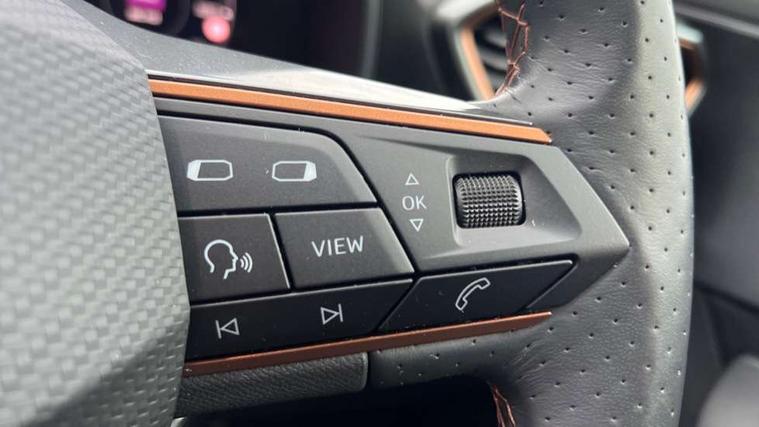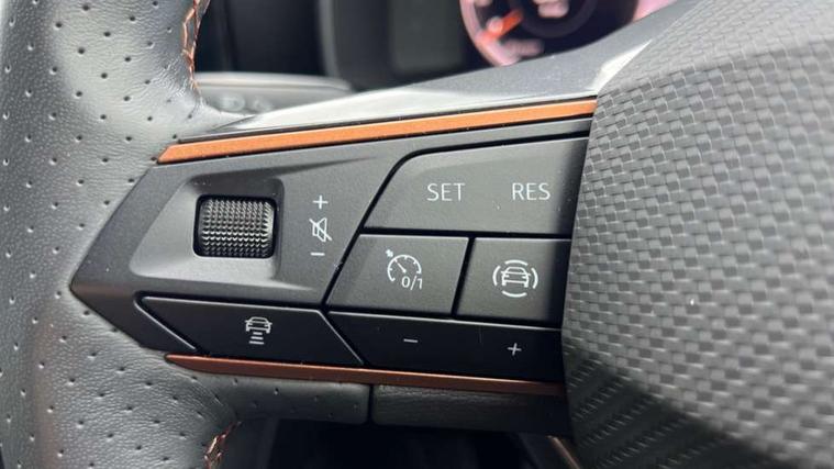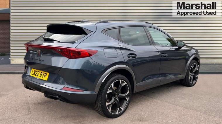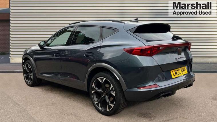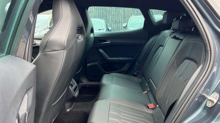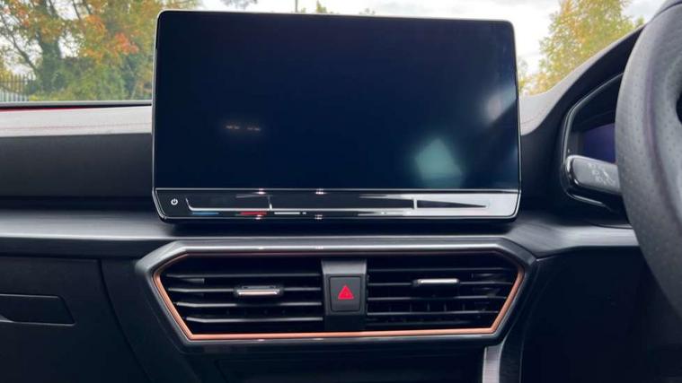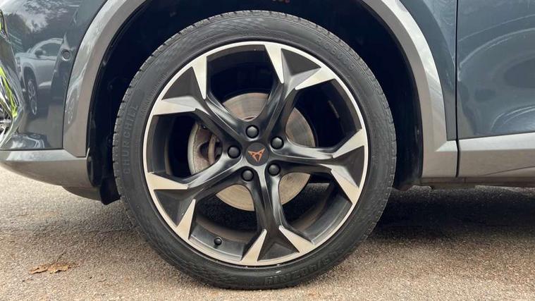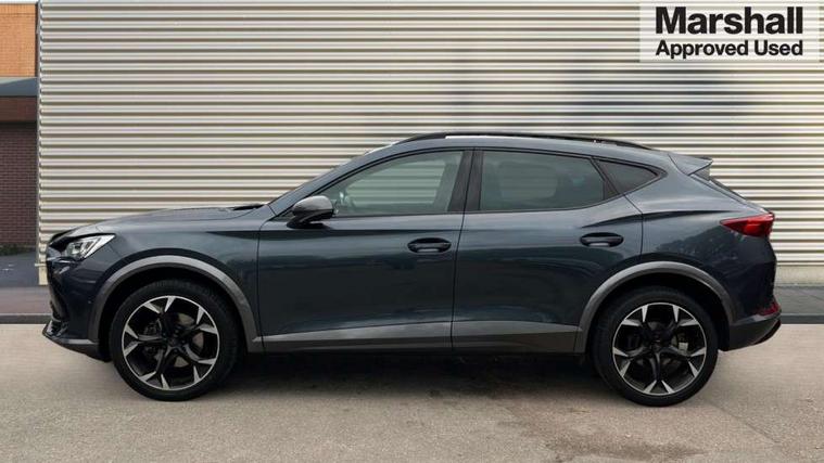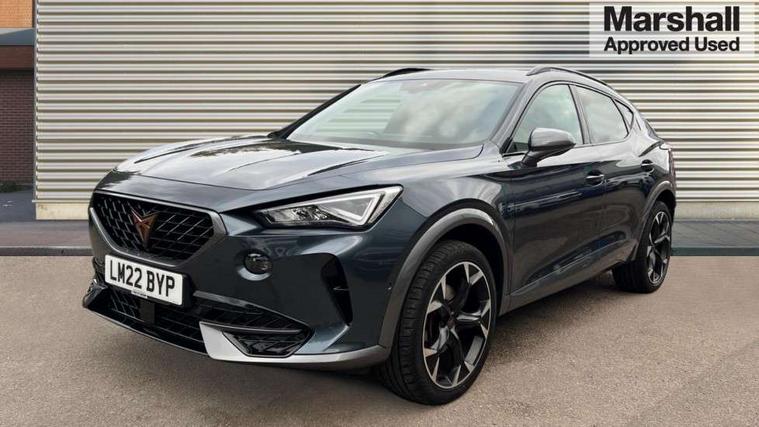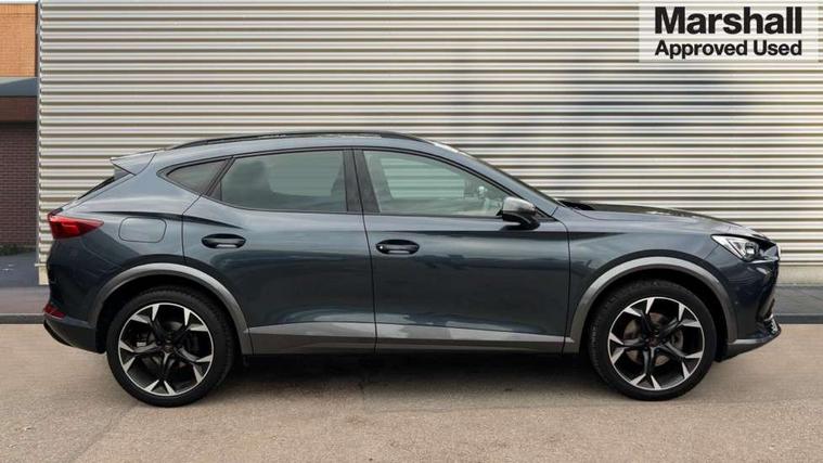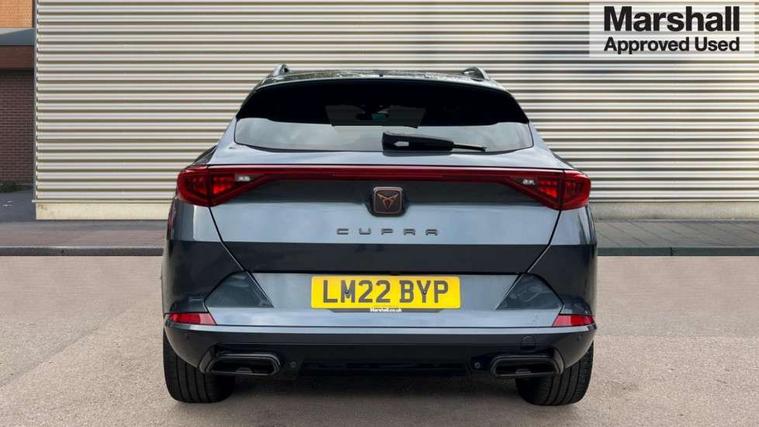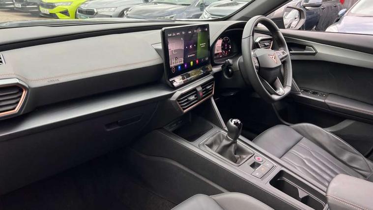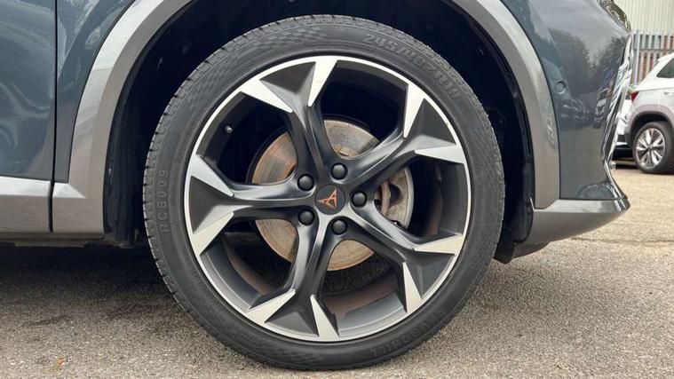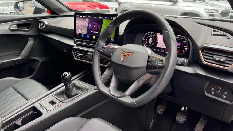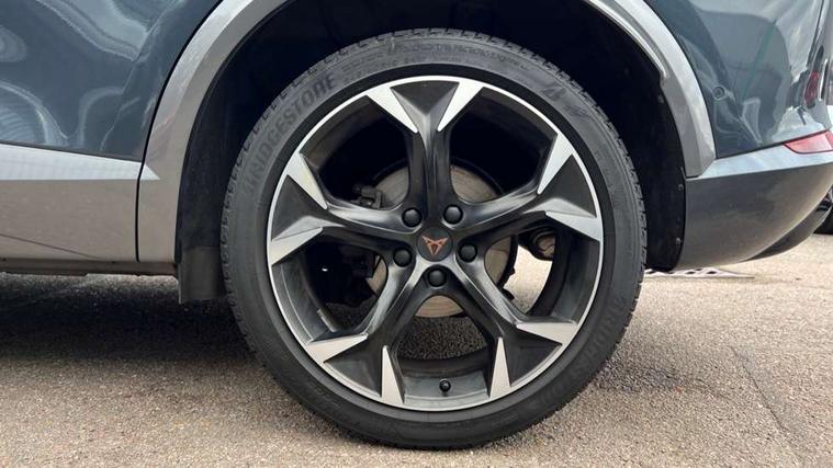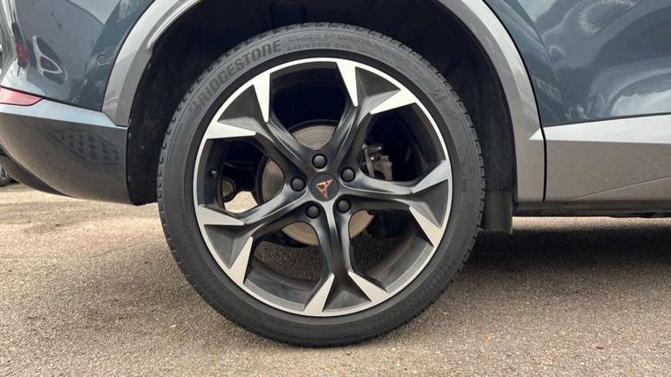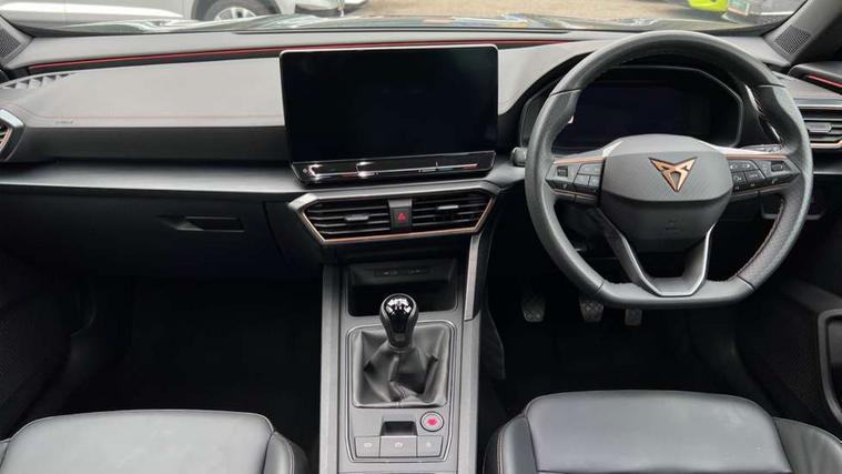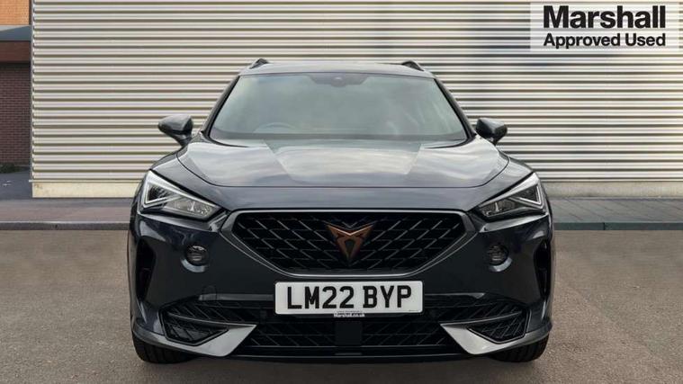 Digital cockpit and configurable dashboard, Driver alert system, Driving profile selection, E-call, Forward collision warning with automatic braking, Lane assist, Navigation system with 12'' Touchscreen Display, Park assist (inc front/rear parking sensors), PAS, Predictive adaptive cruise control with speed limiter, Rear view camera, RPM, trip computer, outside temp gauge, instrument light brightness, low fuel warning light, lights on reminder, gearshift indicator, Service interval indicator, Start/stop system with regenerative braking, Voice control system, Wireless apple carplay, Wireless phone charger, Electronic locking differential and dynamic traction support, Standard suspension, 2 front and 2 rear USB type C sockets, Auxiliary input socket, DAB radio, Auto dimming rear view mirror, Body colour door handles, Body coloured bumpers, Dark grey wing mirror, Daytime running light with automatic headlight control and coming home feature, Dynamic headlight range control, Electric front/rear windows, Electrically adjustable heated and folding door mirrors with memory function, Front fog lamps with cornering function, Gloss black roof rails and window surrounds, LED Headlights, LED Taillights with dynamic indicator, Rain sensing wipers, Rear diffuser with black simulated exhaust pipes, Rear side wing doors, Rear wash/wipe, Third brake light, Tinted rear windows, Welcome lights, 12v power supply in centre console, 12V socket, 12v socket in loadspace, 2 front and 2 rear reading lights, 230V socket, 3 seat bench in 2nd row, 60/40 split rear bench seat with armrest and mechanical seat release, Dust/pollen filter, Front and rear head restraints, Front centre armrest, Height/reach adjust steering wheel, Illuminated interior front door sills, Illuminated sunvisor with mirror, Isofix, Leather multi function steering wheel, Luggage tie-down hooks, Single front passenger seat, Three zone climate control with control panel in rear, Variable luggage/load compartment floor, Wraparound lighting, Genuine Nappa leather Pack - Cupra, Safety and driving pack (M) - Formentor, 3 point seatbelts on all rear seats, ABS, Brake control system - ESC and brake booster, Child proof door locks, Driver and front passenger airbags with front passenger airbag de-activation, Electronic parking brake, Front and rear disc brakes, Front side curtain airbags, Hill hold control, Seat belt reminder for front and rear seats, Tyre pressure monitoring system, Anti theft alarm system, Keyless entry and start system (KESSY), Locking wheel bolts, Copper and aluminium interior detailing, 19" 'Exclusive' machined sport matte black and silver alloy wheels,
