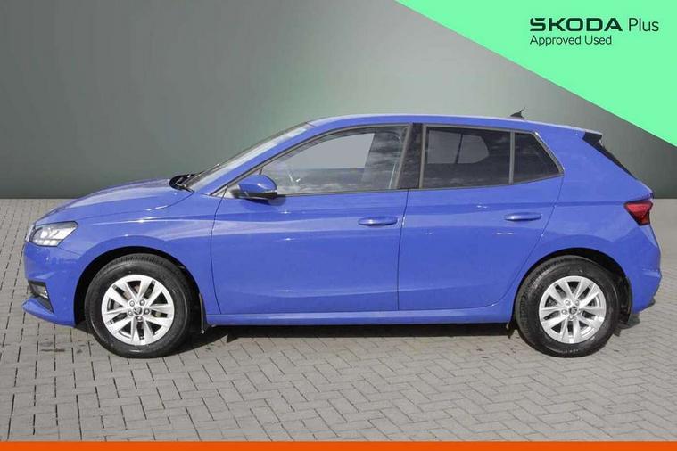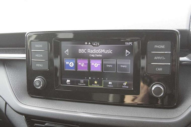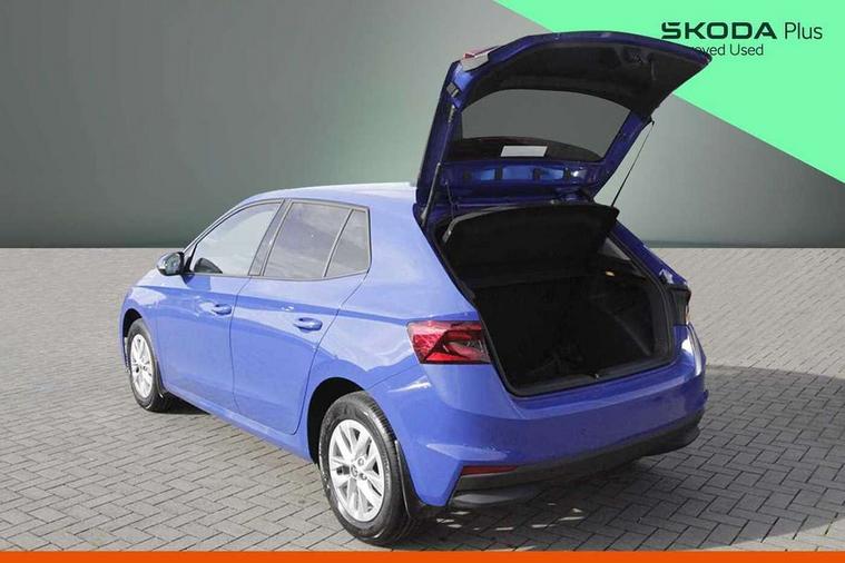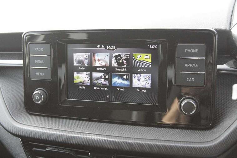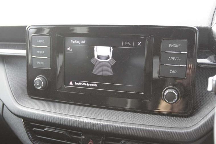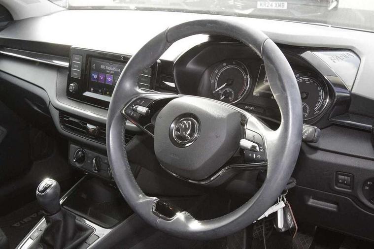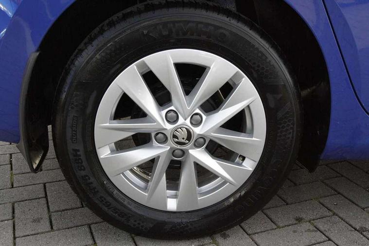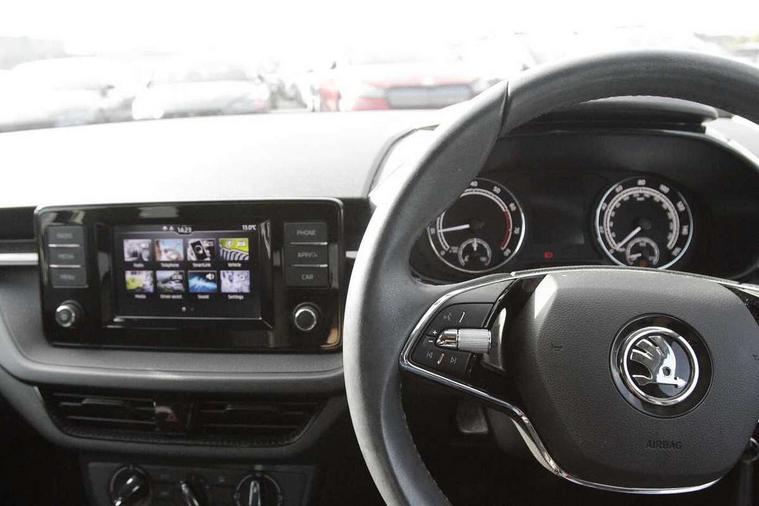 Bluetooth connection, Driver alert system - DAS, Electromechanical power steering, Exterior temperature gauge, Lane assist including road edge detection, Multifunction trip computer in black and white, Service interval indicator, Speed limiter, 2x USB-C in the front (for data transmission and charging), 4 speakers in front, Auxiliary socket for external MP3 player, DAB digital radio reception, Radio Swing with 6.5" colour display, Basic LED Headlights, Basic rear lights, Body colour door mirrors, Body coloured bumpers, Dimming rear view mirror with black frame, Door mirror integrated indicators, Electrically adjustable and heated door mirrors, Electrically adjustable front windows with function auto up/down, Front fog lights, Front window wiper intermittent control, Headlight range control - Automatic, Ice scraper in fuel cap, LED daytime running lights with coming and leaving home feature, Mechanical adjustable rear windows, Rain sensor, Rear LED fog light, Rear side wing doors, Rear window wiper with washing nozzles, Roof mounted spoiler, SKODA tailgate lettering in chrome, Third brake light, 2 reading lights in front and 2 reading lights in rear, 2 spoke leather multifunction steering wheel, 3 rear headrests, Backrest split and folding, Central console with fixed cup holder and storage box, Chrome handbrake release button, Fabric upholstery, Gearshift knob/handle in leather, Grain satin black interior door handles, Hand brake lever handle in leather, Height adjustable front headrests, Height adjustable front seats, Height adjustable steering wheel, ISOFIX and TopTether anchorage points to the outer rear seats, ISOFIX and TopTether on the front passenger seat, Luggage compartment lighting, Manual air conditioning, Manually adjustable lumbar support in front seats, Pollen filter, Rear seat bench unsplit, Single front passenger seat, Storm grey headlining, Sun visors with mirror and airbag label on passenger side, Ticket holder, 3-point height adjustable front seats belts with pretensioner and force limiter, Automatic warning lights in case of crash, Driver and passengers airbag with switch off function, e-Call+, ESC including ABS, MSR, ASR, EDS, HBA and XDS, Front and rear seat belt warning, FRONT ASSIST (AEB City and AEB Inter Urban), Front side airbags, Head airbags, One tone horn, Pedestrian protection, Three rear 3-points safety seat belts with pretensioner and force limiter including stop function for outer rear seat belts, Tyre pressure monitoring system, Anti-theft alarm system including immobiliser, interior monitoring, backup horn, and towing protection, Central locking with radio remote control, interior controls, SAFE function and 2 foldable keys, Black painted air vents, Glossy black decorative trim, Grain satin black central console cover, Grain satin black lower decorative trim, Satin black door and side trim panel in front, Anti-theft wheel bolts protection, Super-low rolling resistance tyres,