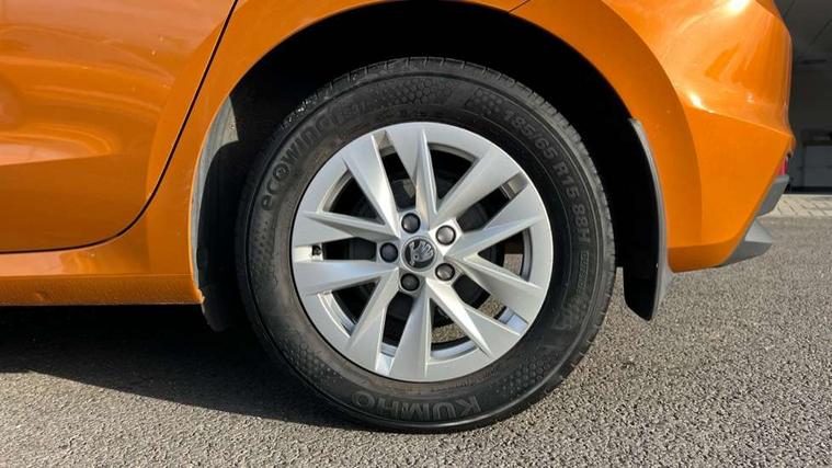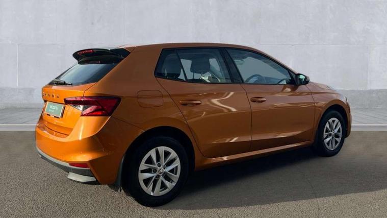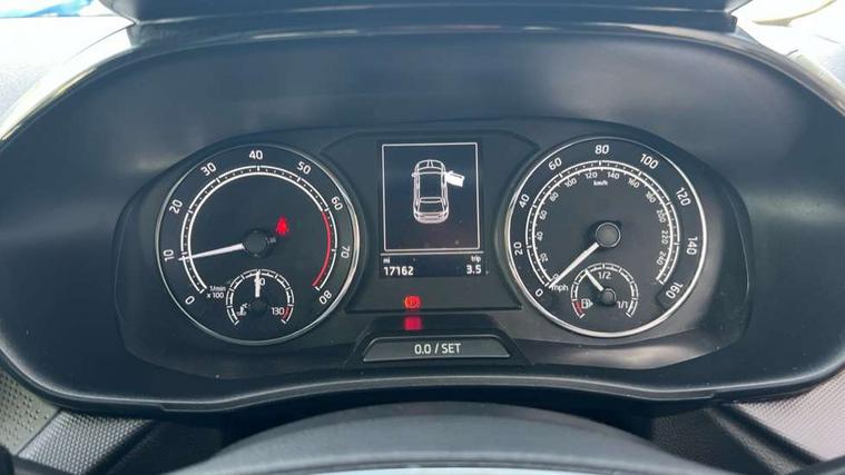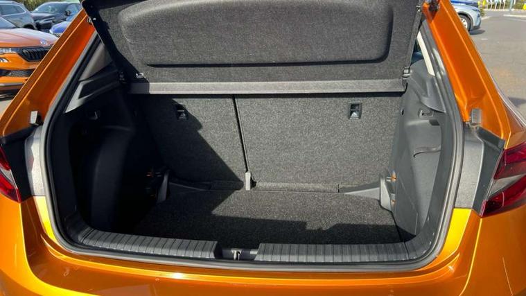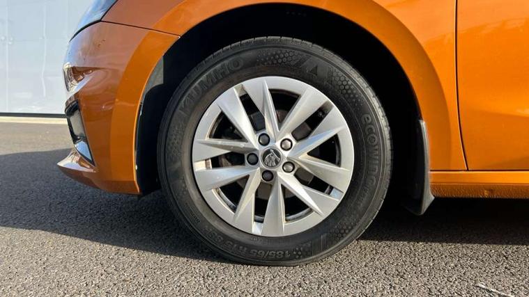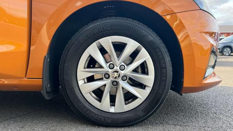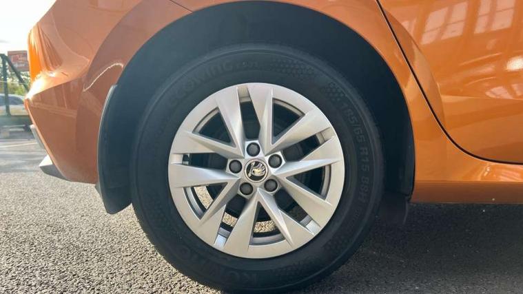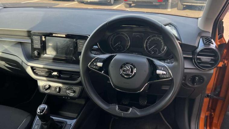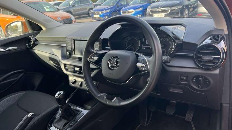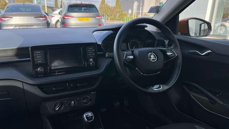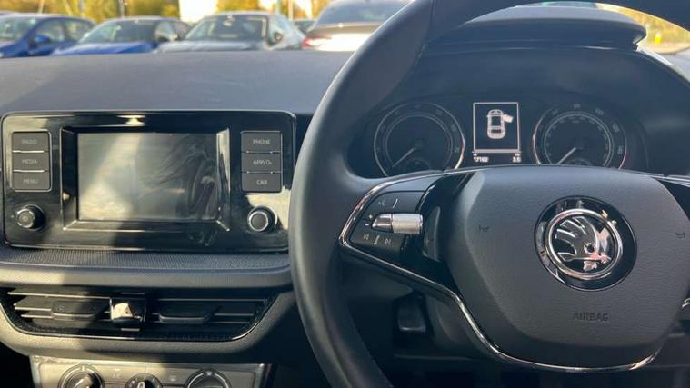 Bluetooth connection, Driver alert system - DAS, Electromechanical power steering, Exterior temperature gauge, Lane assist including road edge detection, Multifunction trip computer in black and white, Service interval indicator, Speed limiter, 2x USB-C in the front (for data transmission and charging), 4 speakers in front, Auxiliary socket for external MP3 player, DAB digital radio reception, Radio Swing with 6.5" colour display, Basic LED Headlights, Basic rear lights, Body colour door mirrors, Body coloured bumpers, Dimming rear view mirror with black frame, Door mirror integrated indicators, Electrically adjustable and heated door mirrors, Electrically adjustable front windows with function auto up/down, Front fog lights, Front window wiper intermittent control, Headlight range control - Automatic, Ice scraper in fuel cap, LED daytime running lights with coming and leaving home feature, Mechanical adjustable rear windows, Rain sensor, Rear LED fog light, Rear side wing doors, Rear window wiper with washing nozzles, Roof mounted spoiler, SKODA tailgate lettering in chrome, Third brake light, 2 reading lights in front and 2 reading lights in rear, 2 spoke leather multifunction steering wheel, 3 rear headrests, Backrest split and folding, Central console with fixed cup holder and storage box, Chrome handbrake release button, Fabric upholstery, Gearshift knob/handle in leather, Grain satin black interior door handles, Hand brake lever handle in leather, Height adjustable front headrests, Height adjustable front seats, Height adjustable steering wheel, ISOFIX and TopTether anchorage points to the outer rear seats, ISOFIX and TopTether on the front passenger seat, Luggage compartment lighting, Manual air conditioning, Manually adjustable lumbar support in front seats, Pollen filter, Rear seat bench unsplit, Single front passenger seat, Storm grey headlining, Sun visors with mirror and airbag label on passenger side, Ticket holder, 3-point height adjustable front seats belts with pretensioner and force limiter, Automatic warning lights in case of crash, Driver and passengers airbag with switch off function, e-Call+, ESC including ABS, MSR, ASR, EDS, HBA and XDS, Front and rear seat belt warning, FRONT ASSIST (AEB City and AEB Inter Urban), Front side airbags, Head airbags, One tone horn, Pedestrian protection, Three rear 3-points safety seat belts with pretensioner and force limiter including stop function for outer rear seat belts, Tyre pressure monitoring system, Anti-theft alarm system including immobiliser, interior monitoring, backup horn, and towing protection, Central locking with radio remote control, interior controls, SAFE function and 2 foldable keys, Black painted air vents, Glossy black decorative trim, Grain satin black central console cover, Grain satin black lower decorative trim, Satin black door and side trim panel in front, Anti-theft wheel bolts protection, Super-low rolling resistance tyres,