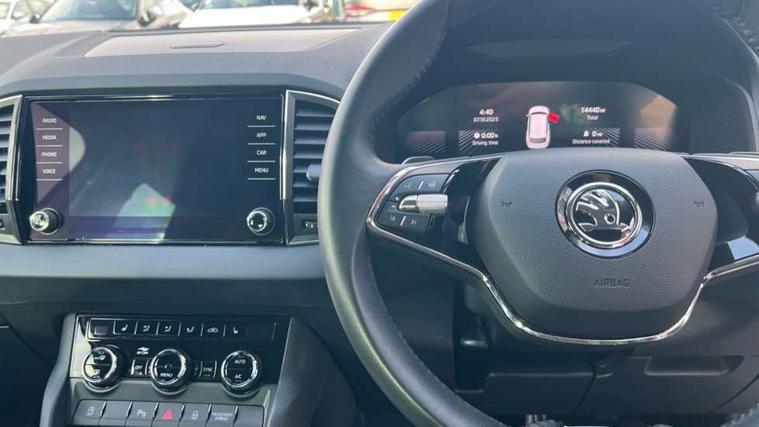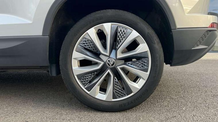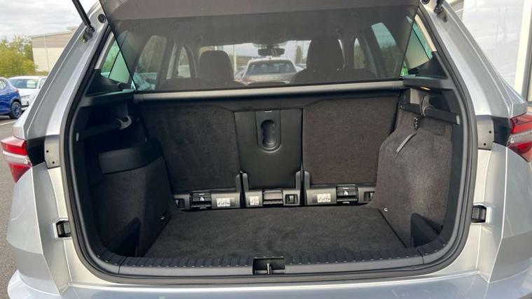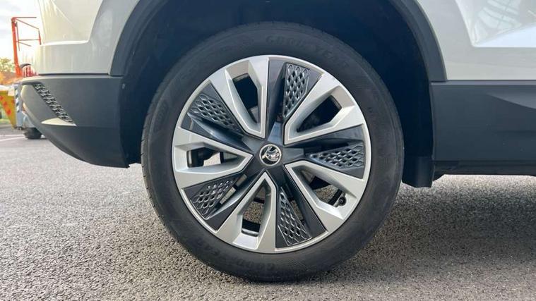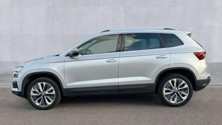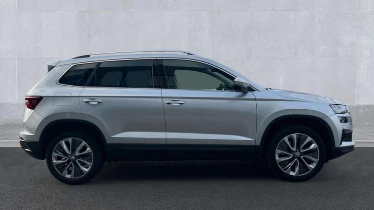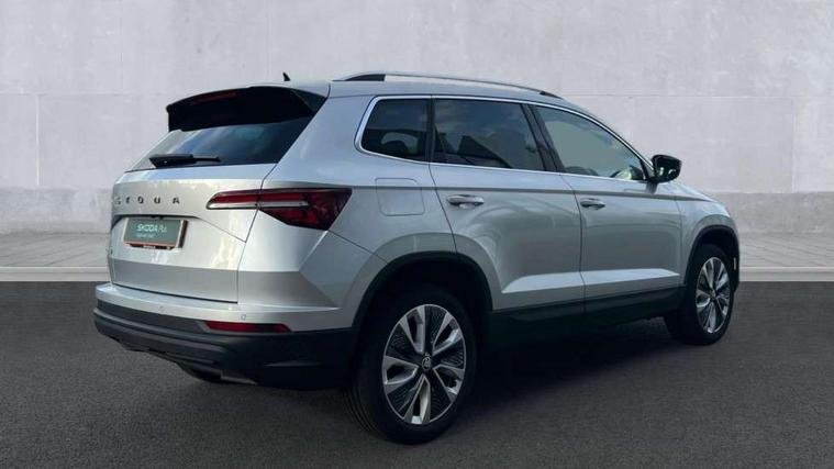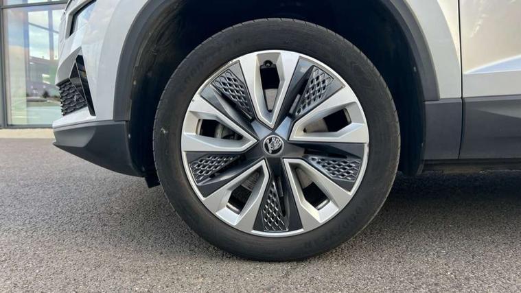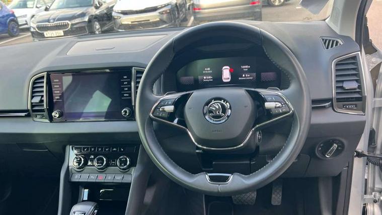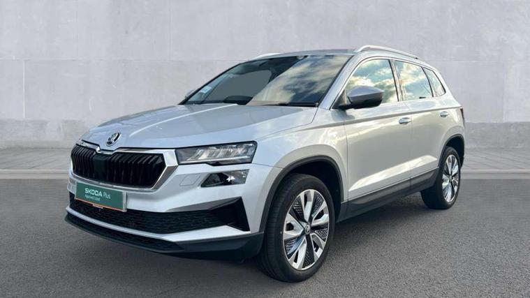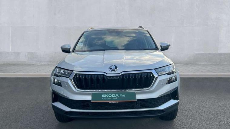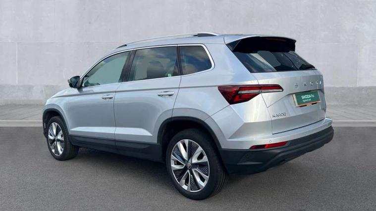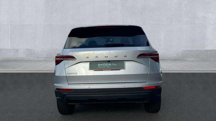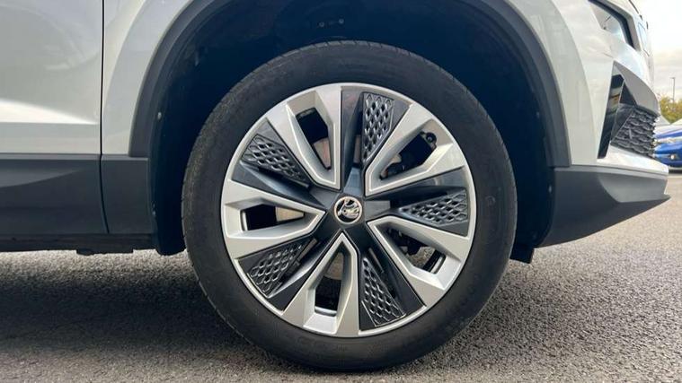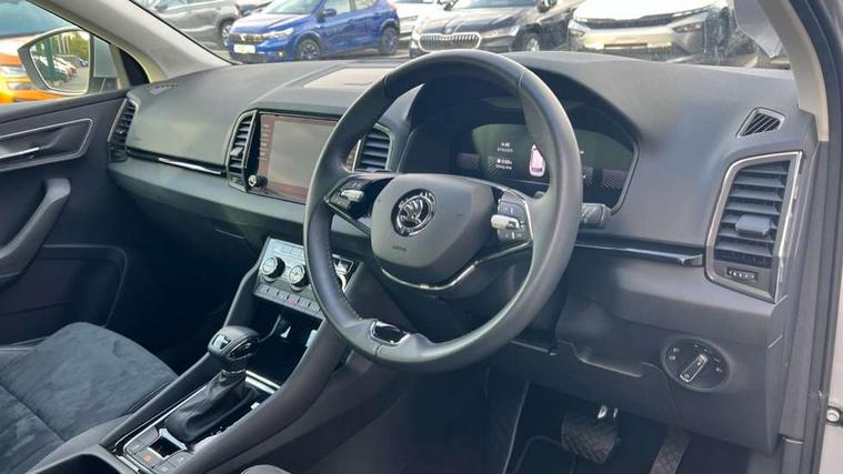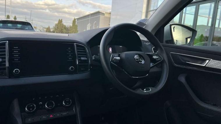8" Digital display, Care connect, Driver fatigue sensor, Emergency services call system, Outside temperature gauge, Service interval indicator, SmartLink wireless for Apple and wired for Android, Start/stop system with regenerative braking, USB C Port x 2 in front centre console, 8 Speakers, DAB radio with Bluetooth, USB connection, Acoustic glass, Aero front windscreen wipers with intermittent function, Auto dimming rear view mirror with light and rain sensors, Black electric window control buttons, Body colour door mirrors and handles, Dynamic headlight range control with cornering light function, Electric front and rear windows with child proof lock, Heated rear windscreen, LED daytime running lights, LED rear lights with high functionality welcome effect and dynamic indicators, Light assistant (coming/leaving home/tunnel light), Plastic scuff plates, Privacy glass, Rear side wing doors, Rear spoiler, Rear window wiper with washer system and intermittent control, Safety reflectors on front doors, 1.5 litre bottle holders in driver and front passenger door panels, 12V socket in boot, 12v socket in front centre armrest with storage compartment and rear air vents, 2 spoke leather heated multifunction steering wheel with DSG paddles, 2 x Tablet holder, 3 rear height adjustable headrests, 3 seat bench in 2nd row, 4 foldable roof handles with rear coat hooks, Black floor carpet, Chrome inner door handles, Decorative door sills with KAROQ badging, Double sided boot floor, Foldable hooks in the boot, Front head restraints, Height adjustable front three point seats belts with tensioners, Height/reach adjust steering wheel, Ice scraper, Illuminated glovebox, Illuminated luggage compartment, Isofix child seat preparation for front passenger seat, Isofix child seat preparation outer rear, Manual lumbar support for front seats, Pen holder, Pollen filter, Rear boot cover, Rear reading lights, Rubbish bin door, Safety vest holder, Single front passenger seat, Storage box in upper central dashboard closed, Sunvisors with illuminated vanity mirrors, Textile floor mats, Ticket holder, VarioFlex seats with standard rear seat release, Boot pack - Karoq, Chrome roof rails + chrome pack - Karoq, Parking pack - Karoq, Automatic door unlocking in case of crash, Automatic fuel cut off in case of crash, Child locks on rear doors, Driver airbag, Electronic parking brake with auto hold function, Emergency rear braking signal, ESC including ABS, MSR, ASR, EDS, HBA, DSR, RBS, MKB and traction control, Front side airbags, Hill hold control, Knee airbags, Passenger airbag with switch-off function, Pedestrian monitor, Seatbelt reminder signalisation and pretensioner for all seats, Three point seatbelts rear, Two tone horn, Tyre pressure display, Tyre pressure monitor, Alarm with interior monitoring, back up horn and tilt sensor with safe function, Electronic engine immobiliser, Keyless entry and start/stop, Remote central locking with 2 remote folding keys, Chrome framed air vents, 18" Procyon silver alloy wheels with anthracite aero inserts, Anti-theft wheel bolts protection, Storage on wheel cover, Tool kit,