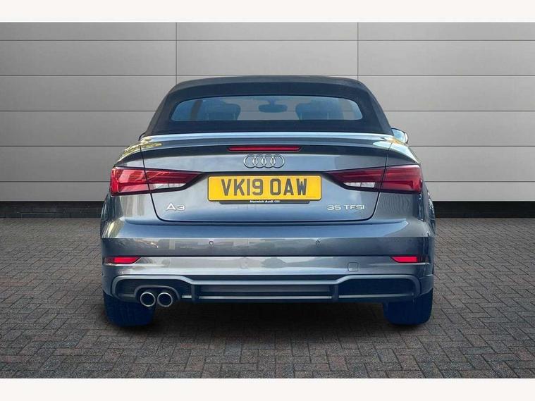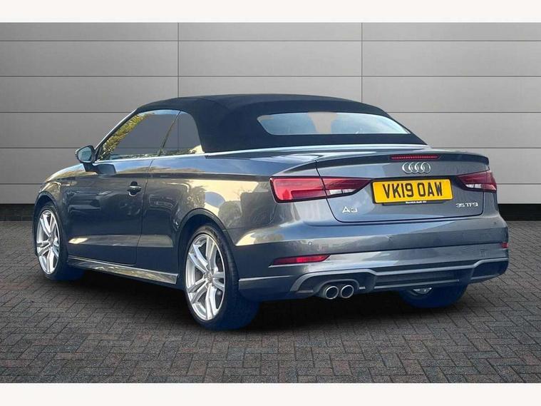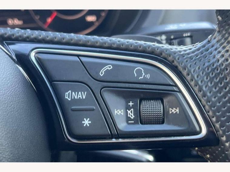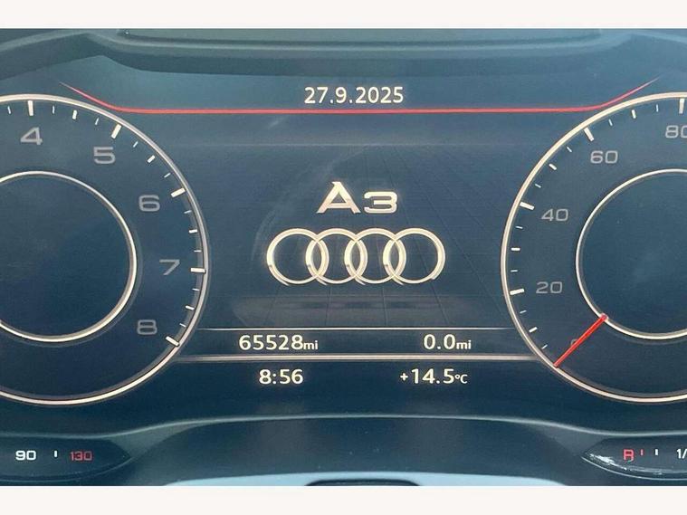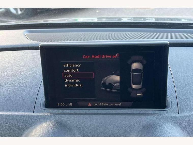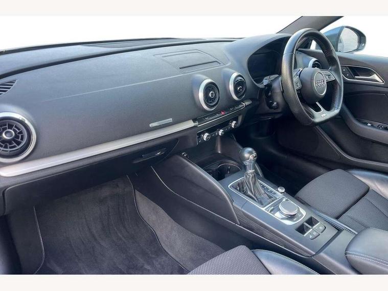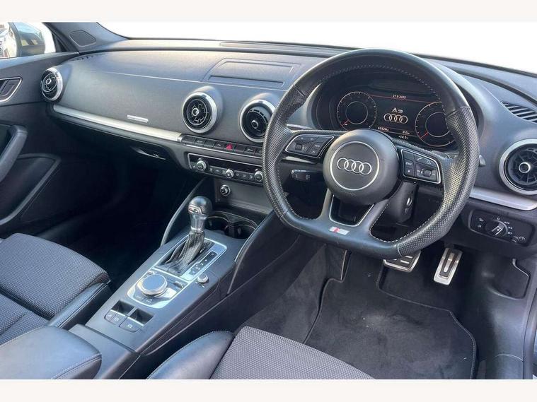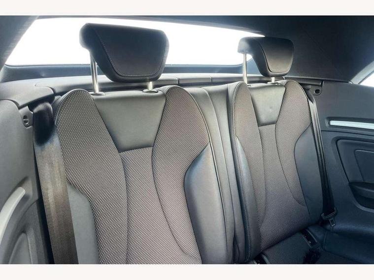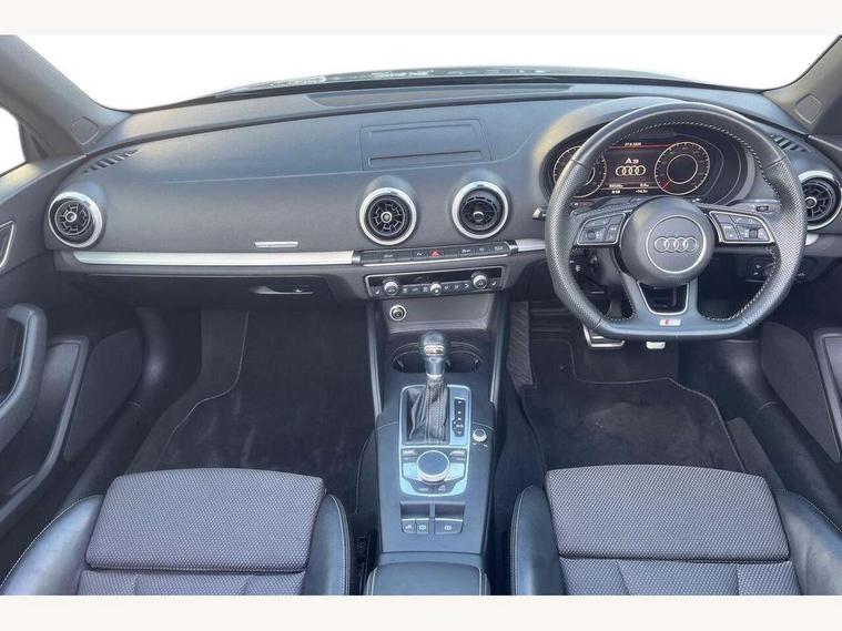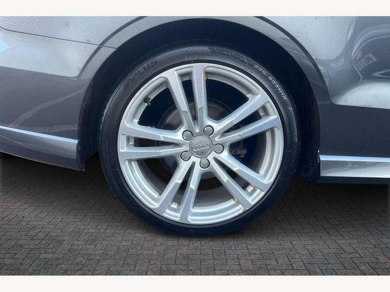 Audi drive select, Audi smartphone interface, Automatic start/stop system, Bluetooth interface, Colour driver's information system display, Electro-mechanical PAS, SD card based MMI navigation, Service interval indicator, 2 USB ports, Audi music interface, Auxiliary input socket, CD player, DAB Digital radio, MMI radio plus with 7" colour MMI screen and MMI controller, Aluminium side window trim, Auto dimming rear view mirror with light and rain sensors, Automatic lights and wipers, Body colour bumpers, Body colour door mirrors with integral indicators, Chrome exhaust tailpipes, Dark chrome grille, Electric operated/heated door mirrors, Front and rear electric windows, Fully automatic acoustic hood, Heated front windscreen, Heated rear window, Heated windscreen washer jets, LED daytime running lights, Roof spoiler, S Line body styling, 2 height adjustable rear headrests, 3 spoke flat bottom multi-function leather steering wheel including paddle shift, 4 lashing points to secure luggage, 50/50 split folding rear seat, Adjustable front armrest, Black headlining, Driver/passenger sunvisors, Dual zone electronic climate control, Front/rear floor mats, Height adjustable front seats, Height/reach adjustable steering column, Illuminated glovebox, Isofix child seat preparation, Perforated leather gearknob, Stainless steel pedals, Storage box under drivers seat, Storage compartment in centre console, Storage compartments in doors, Tool kit, LED interior light pack - A3/RS3, Light and rain sensor pack - A3 Cabriolet, Non smoking pack - A3, Storage pack - A3 Cabriolet/Saloon, 3 point seatbelts on all seats, ABS/EBD, Active bonnet, Active front headrests, ASR, Automatic roll over protection, Driver and passenger side airbags, Driver/Front Passenger airbags, Drivers knee airbag, EDL, Electromechanical parking brake, ESC - Electronic Stability Control + traction control, Front passenger airbag deactivation, Hill hold assist, Seatbelt warning, Tyre pressure monitor, Warning triangle and first aid kit, Anti theft alarm, Anti-theft wheel bolts, Immobiliser, Remote control central locking, Aluminium air vent surrounds, Aluminium trim elements, Matt brushed aluminium inlays, Space saver spare wheel,