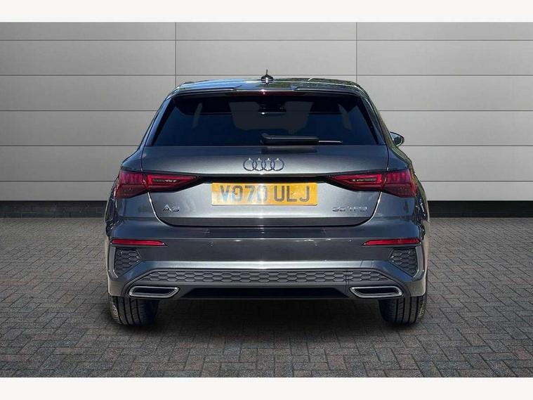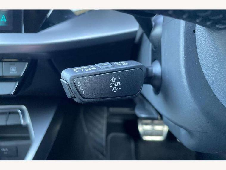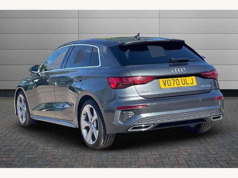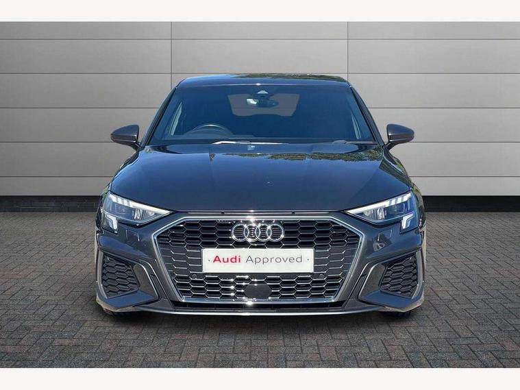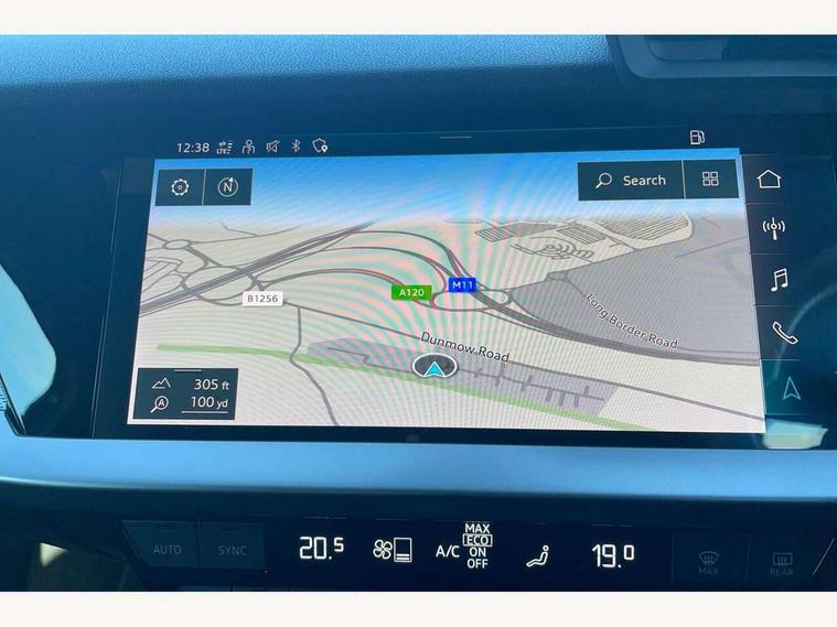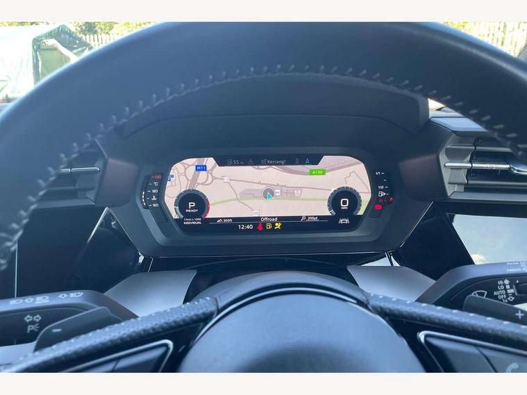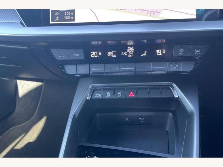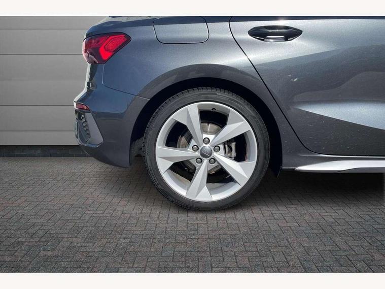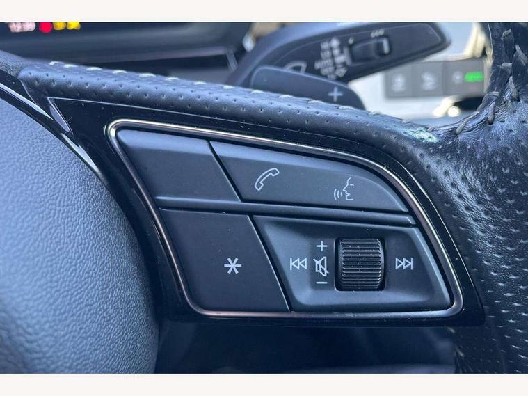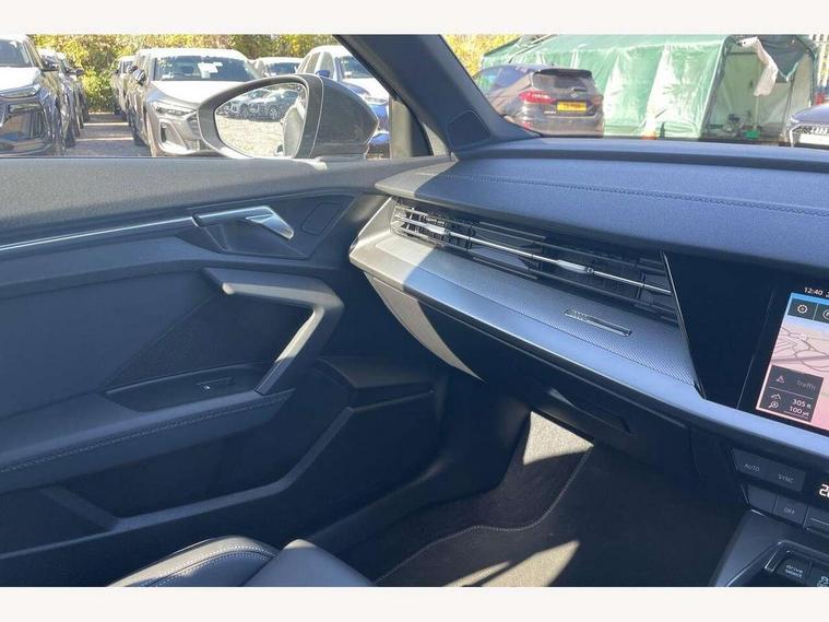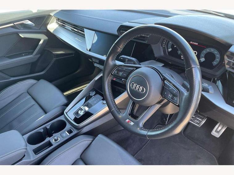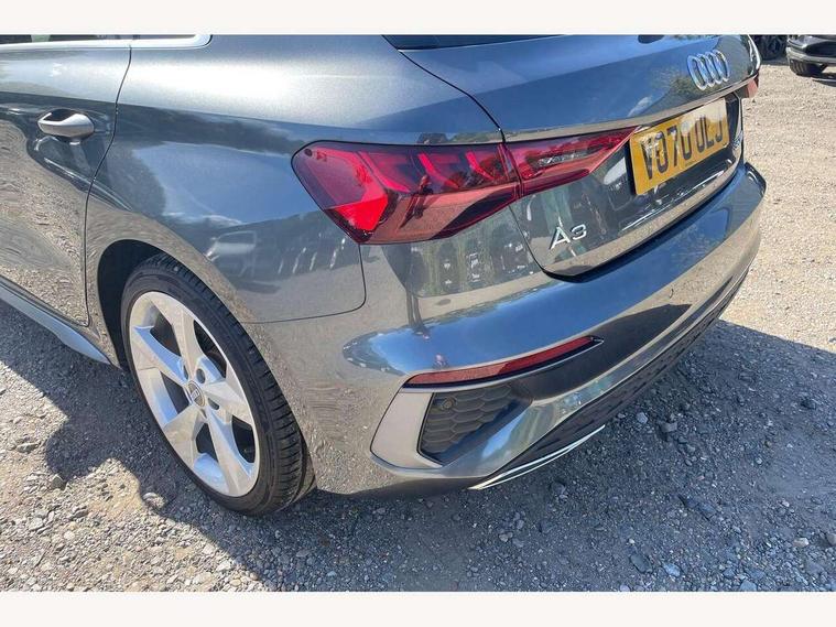 Audi connect emergency call and service, Audi drive select (Auto, Comfort, Dynamic, Efficiency and Individual), Audi smartphone interface, Audi Virtual Cockpit - 10.25" digital and colour instrument cluster, Automatic start/stop system with recuperation, Bluetooth interface, Collision avoidance assistant, Electromechanical power speed sensitive steering, Lane departure warning system, MMI Navigation Plus with high resolution 10.1" colour touch screen display, Service indicator, Trip computer, Voice control system with natural language interaction, 1xUSB-A and 1xUSB-C connection, 6 passive loudspeakers, DAB Digital radio, Acoustic glass windscreen, Aluminium window trim, Auto dimming frameless rear view mirror, Body colour exterior mirrors, Electrically adjustable/heated/folding/auto dimming door mirrors with integrated LED indications + kerb view function for passenger side, Front electric windows, Illuminated aluminium inserts front door sills with S logo, LED daytime running lights, Light and rain sensors, Privacy glass - dark tinted rear window, rear door and side windows, Rear electric windows, Rear side air outlets in grained matt black, Rear wiper, S line bumpers, S roof spoiler, 12V socket and storage compartment in front centre console, 40/20/40 split folding rear seat bench with cupholder, Black cloth headlining, Dual zone electronic climate control, Front and rear centre armrest in leather, Front and rear headrests, Front/rear floor mats, Height and reach adjustable steering wheel, Interior lighting - glove compartment light and right hand side, Luggage compartment floor covering, Manual boot compartment lid, Manually adjustable front seats, Seat side bolsters, Stainless steel pedals and front footrest, Twin leather upholstery with front sports seats S embossed logo, Aluminium interior elements pack - A3 Sportback, S line styling pack - A3 Sportback, 3x3 point rear seat belts, Driver and front passenger airbag with passenger airbag deactivation, Electronic Stabilisation Control (ESC) including ABS, ASR and EDL, First aid kit with warning triangle and 2 safety vests, Hill hold assist, Pre-sense front with pedestrian and cyclist detection, Seatbelt monitoring, Tyre pressure loss indicator, Anti theft alarm, Anti-theft wheel bolts, Electronically operated child lock, Immobiliser, Remote control central locking, Accent surfaces in the dashboard and centre console in platinum grey silk effect paint finish, Dark spectrum aluminium inlays,