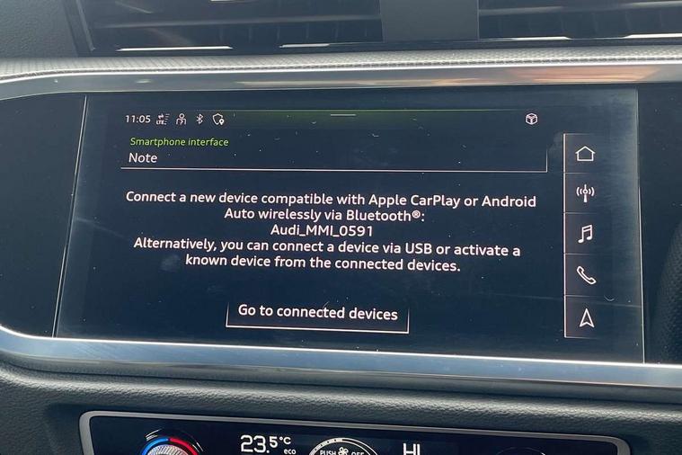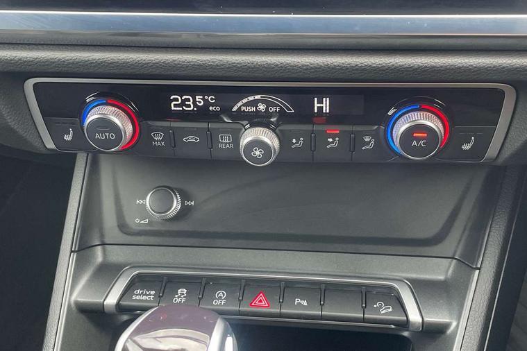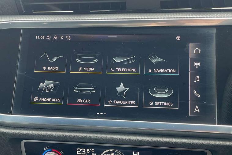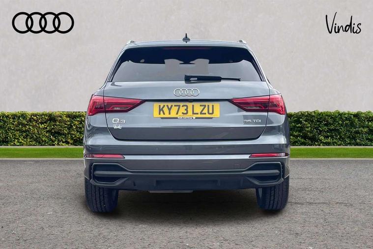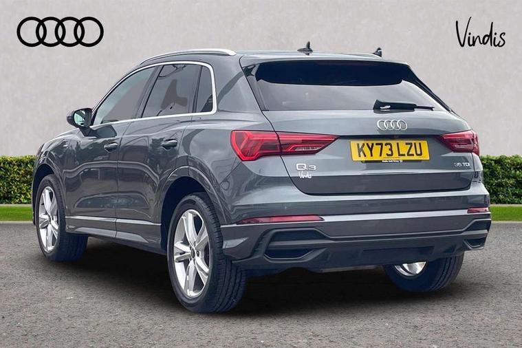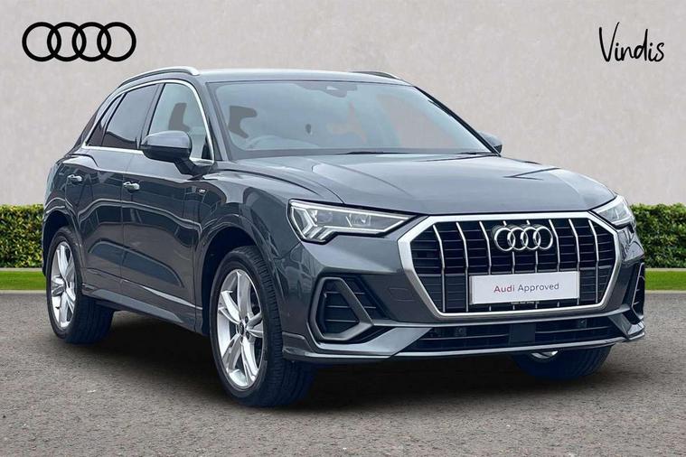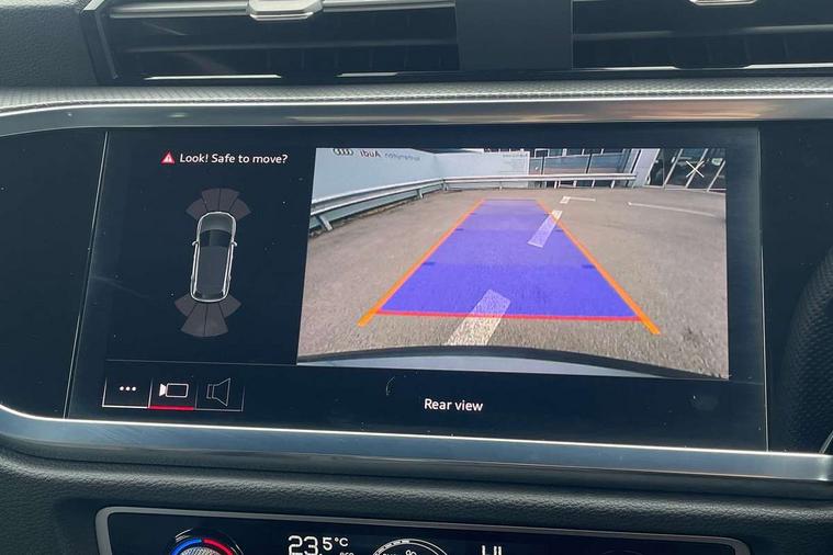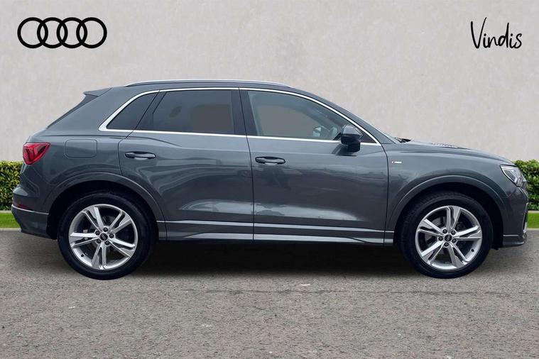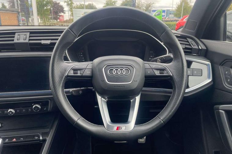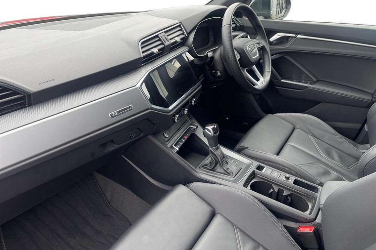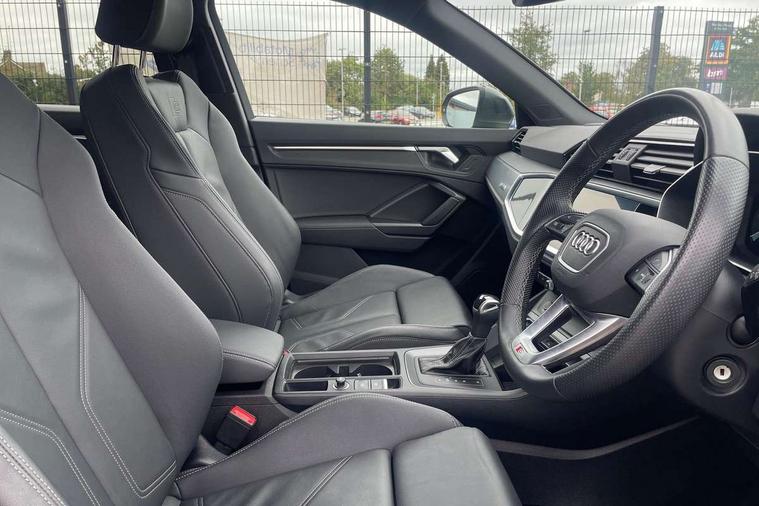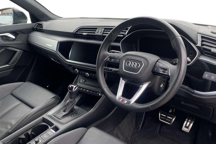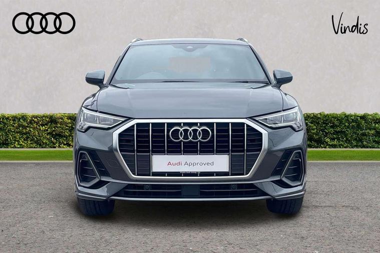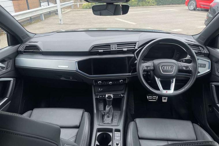 Amazon alexa Integration, Audi drive select, Audi lane departure warning, Audi Virtual Cockpit - 10.25" display, Bluetooth interface, Camera based traffic sign recognition, Legal emergency call, MMI Navigation Plus with high resolution 10.1 inch touchscreen colour display, Power operated tailgate, Progressive steering, Service interval indicator, Smartphone interface includes wireless Apple carplay/Android Auto, Start stop system with recuperation, Voice control system with natural language interaction, Diesel particulate filter, Sports suspension, 2 USB-C ports with charge and data functions, 6 passive loudspeakers, DAB digital radio module, Acoustic windscreen, Aluminium roof rails, Aluminium window trim, Anthracite black radiator grille, Auto dimming frameless rear view mirror, Body colour front spoiler blade, Body coloured bumpers, Electrically folding, adjustable and heated door mirrors with integrated LED side indicators and kerb view function for passenger side, Front and rear electric windows, Front fog lights, Front side air inlets in matt platinum grey, Grille vertical bars in aluminium silver/Matt, High gloss black finish B and C pillars, LED Dynamic rear indicators, LED headlights with LED daytime running lights, LED rear lights, LED third brake light, Privacy glass dark tinted rear and rear-side windows (from B-pillar backwards), Rain and light sensors, Rear diffuser grille in grained matt black, Rear diffuser strip in matt anthracite black, Rear side wing doors, Rear wiper, S line badges on front wings, S Line front and rear bumpers, Side skirt insert in matt Platinium grey, Variable front intermittent wipers, 12V socket in rear centre console, 3 seat bench in 2nd row, 3 spoke leather multifunction steering wheel features S badging and grips in perforated leather with contrast stitching, 40:20:40 folding with manual adjustment for 60:40 forwards/backwards position and backrest angle, Adjustable rear seat bench/backrest with centre armrest and cupholder, Black cloth headlining, Dual zone electronic climate control, Front and rear black floor mats with contrast stitching in rock grey, Front and rear headrests, Front and rear roof module including reading lights, Front centre armrest, Glove compartment lighting, Height and reach adjustable steering wheel, Illuminated door sill trims with S logo, ISOFIX child seat mounting for front passenger with airbag deactivation and outer rear seat including top tether attachment point for outer rear seats, Luggage compartment light, Manual front seats with height adjustment, Perforated leather gearknob, Single front passenger seat, Stainless steel luggage compartment sill finisher, Stainless steel pedals, Ambient lighting pack - Q3, Non smoking pack - Q3, 3x3 point rear seatbelts, 6 airbags - Driver, front passenger, curtain and side windows, Audi pre-sense front with pedestrain and cyclist recognition, Electrically operated child locks on rear doors, Electromechanical parking brake, Electronic stabilisation control including ABS, ASR and EDL, Front seatbelt reminder, Hill descent control, Hill hold assist, Pre sense basic, Seatbelt monitoring, Tyre pressure warning, Warning triangle and first aid kit, Anti theft alarm, Anti theft wheel bolts, Immobiliser, Remote central locking, Aluminium look interior elements, Dark matt brushed aluminium inlay, Detail dashboard around MMI touch colour display in glass look, black with surround in aluminium look, Leatherette door armrest,