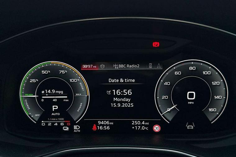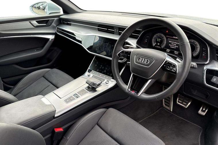 Audi connect safety and service (e-call), Audi connect with Amazon Alexa Integration, Audi drive select, Audi parking system plus - acoustic and visual park assist system for front and rear, Audi virtual cockpit, Automatic start/stop system with coasting functionality, Bluetooth interface, Camera based traffic sign recognition, Lane departure warning system, MMI navigation plus with 10.1" and 8.6" touch screens, Power operated tailgate, Progressive steering, Rear view camera, Service interval indicator, Smartphone interface includes wireless Apple carplay/Android Auto, Voice control system, 3 pin 10 amp domestic charging cable, 52 litre fuel tank, 7.4 kW onboard charger, Compact charging system, Hybrid propulsion system, Industrial connector CEE 32A, 230V, long and straight for the e-tron charging system, Mode 3 charging cable for public charging (AC), Sports suspension, Type 2 socket for AC charging, Audi front music interface, Audi sound system, Auxiliary input socket, DAB Digital radio, USB connection, Aluminium roof rails, Body colour rear roof spoiler, Body coloured door mirrors, Electric front/rear windows, Electrically adjustable heated and folding + automatically dimming exterior mirrors with memory function, Frameless auto dimming interior rear view mirror, Front intermittent wipers, Heat insulating darkened glass in side and rear windows, Heat insulating glass in windshield, LED rear lights with dynamic indicators, LED signature front daytime running light, LED third brake light, Matrix LED headlights, Matt black rear diffuser with diffuser strip and tailpipes in chrome, Matt black side air intake grille with inlay in matt aluminium, Privacy glass, Radiator grille in anthracite black matt, single frame in chrome and horizontal struts in matt aluminium silver, Rain and light sensors, Rear side wing doors, Rear wiper, 3 spoke high multi-function perforated leather steering wheel with contrast stitching and shift paddles, 4 zone deluxe automatic climate control, 40/20/40 split folding 3 rear seat bench in 3 parts with rear centre armrest, Audi phone box light, Black cloth headlining, Electrically adjustable front seats including seat height, fore/aft position, backrest angle and 4-way lumbar with memory for driver's seat, Front and rear floor mats, Front centre armrest, Front head restraints, Heated front seats, Height/reach adjust steering wheel, Illuminated door sill trims with S logo, Illuminated sun visors with vanity mirrors, Leather gear knob, Luggage compartment system, Rear headrests, Single front passenger seat, Stainless steel pedals and foot rest, Tool kit and car jack, LED Interior Ambient Lighting Pack - A6, Non smoking pack - A6, S line exterior style pack - A6, 3 point seatbelts on all seats, Airbags - Front side, front and rear including head, Audi pre-sense front, EBD - Electronic brakeforce distribution, Electromechanical parking brake, Electronic Stability Control (ESC) including ABS, ASR and EDL, Extended pedestrian protection measures, ISOFIX child seat mounting for front passenger seat and ISOFIX child seat mounting with Top Tether for outer rear seats, Manual child proof rear door locks, Seatbelt monitoring, Tyre pressure warning light, Warning triangle and first aid kit, Anti theft alarm with tow away protection, Anti-theft wheel bolts and wheel loosening detection, Immobiliser, Keyless Go, Remote central locking, Matt brushed aluminium inlays, Tyre repair kit,