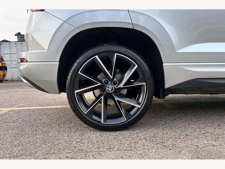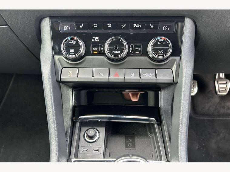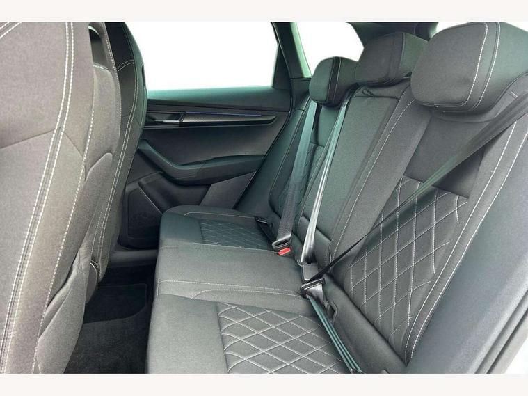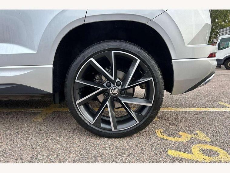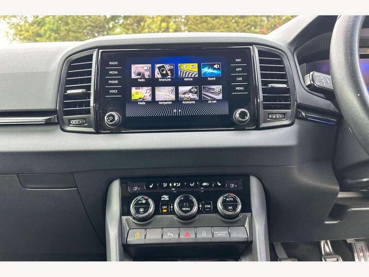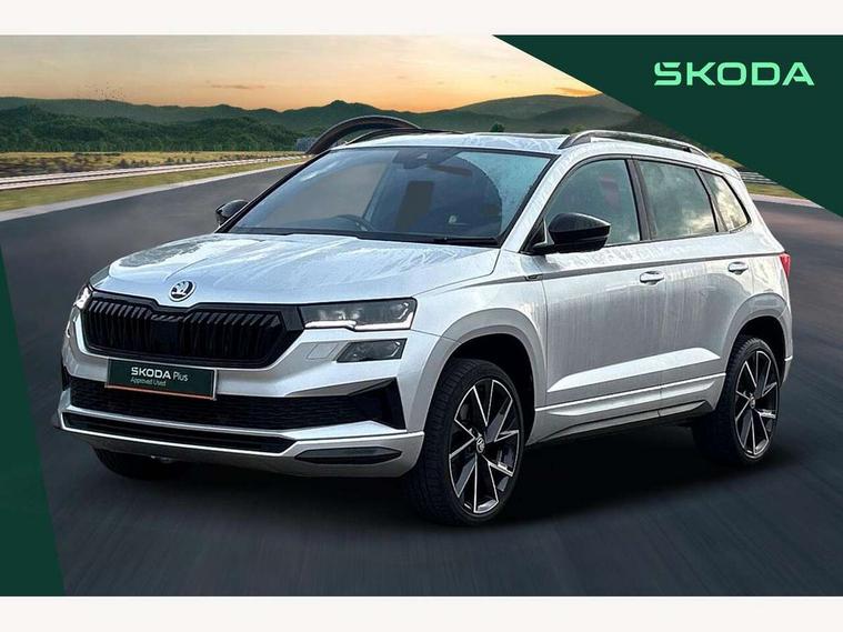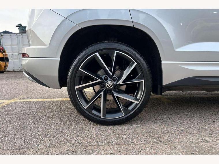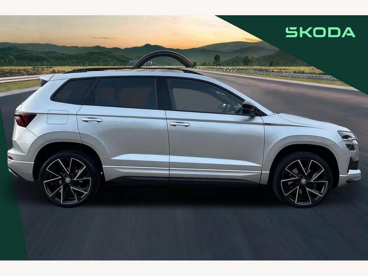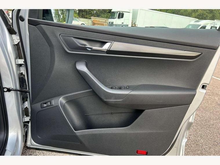 8" Digital display, Care connect, Driver fatigue sensor, Emergency services call system, Outside temperature gauge, Service interval indicator, SmartLink wireless for Apple and wired for Android, Start/stop system with regenerative braking, USB C Port x 2 in front centre console, Virtual cockpit, Virtual pedal with electrically operated boot door, 8 Speakers, DAB radio with Bluetooth, USB connection, Wireless charging without wireless aerial connection, Acoustic glass, Aero front windscreen wipers with intermittent function, Auto dimming rear view mirror with light and rain sensors, Black door mirrors, Black electric window control buttons, Black radiator grille, Black roof rails, Body colour door handles, Electric front and rear windows with child proof lock, Front door steps with SportLine logo, Heated rear windscreen, LED daytime running lights, LED rear lights with high functionality welcome effect and dynamic indicators, Light assistant (coming/leaving home/tunnel light), Panoramic sliding sunroof, Plastic scuff plates, Privacy glass, Protective door side sills in body colour, Rear diffuser, Rear side wing doors, Rear spoiler, Rear window wiper with washer system and intermittent control, Safety reflectors on front doors, Skoda lettering on tailgate in black, Sportline badge on front fender, Sportline decorative inserts with badging, Sports front and rear bumpers, 1.5 litre bottle holders in driver and front passenger door panels, 12V socket in boot, 12v socket in front centre armrest with storage compartment and rear air vents, 3 rear height adjustable headrests, 3 seat bench in 2nd row, 3 spoke leather sports multifunction steering wheel and silver stitching, 4 foldable roof handles with rear coat hooks, Black floor carpet, Black roof headlining, Chrome inner door handles, Double sided boot floor, Foldable hooks in the boot, Front head restraints, Height adjustable front three point seats belts with tensioners, Height/reach adjust steering wheel, Ice scraper, Illuminated glovebox, Illuminated luggage compartment, Isofix child seat preparation outer rear, Manual lumbar support for front seats, Pen holder, Pollen filter, Rear boot cover, Rear reading lights, Rear seats fixed folding and divided 60:40, Rubbish bin door, Safety vest holder, Single front passenger seat, Storage box in upper central dashboard closed, Sunvisors with illuminated vanity mirrors, Textile floor mats, Ticket holder, Titan black interior ceiling, Welcome animation with sportline logo, Boot pack - Karoq, Light Pack - Karoq, Parking pack - Karoq, Automatic door unlocking in case of crash, Automatic fuel cut off in case of crash, Child locks on rear doors, Driver airbag, Electronic parking brake with auto hold function, Emergency rear braking signal, ESC including ABS, MSR, ASR, EDS, HBA, DSR, RBS, MKB and traction control, Front side airbags, Hill hold control, Knee airbags, Passenger airbag with switch-off function, Pedestrian monitor, Seatbelt reminder signalisation and pretensioner for all seats, Three point seatbelts rear, Two tone horn, Tyre pressure display, Tyre pressure monitor, Alarm with interior monitoring, back up horn and tilt sensor with safe function, Electronic engine immobiliser, Keyless entry and start/stop, Remote central locking with 2 remote folding keys, Black air vent surround, Black centre console, Satin black dashboard, Satin black door trim, 19" Sagitarius anthracite alloy wheels with matt black aero inserts, Anti-theft wheel bolts protection, Matt black aero hub caps, Storage on wheel cover, Tool kit,