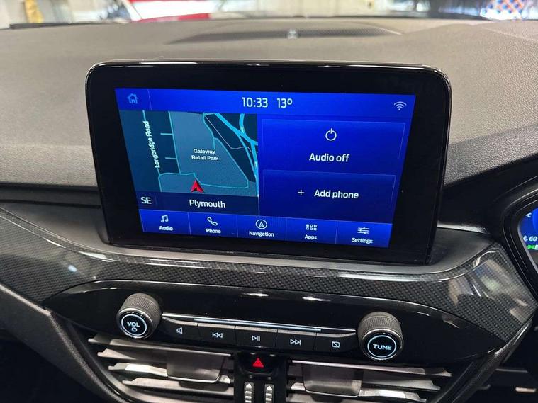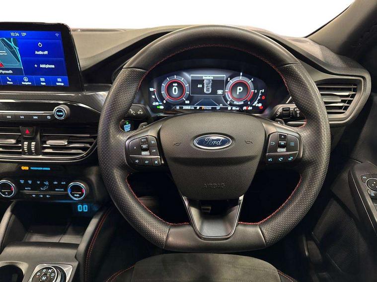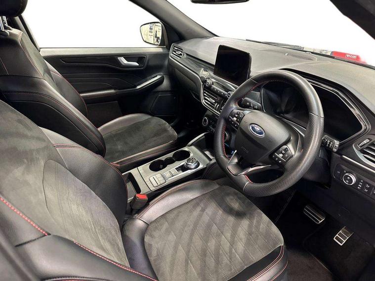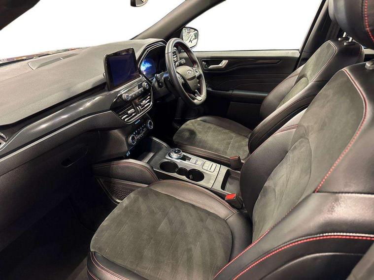 12.3" digital colour instrument cluster, Ford easy fuel, Ford SYNC 3 with 8" TFT LCD touchscreen, App Link, andriod auto/apple carPlay, emergency assistance and navigation with Ford pass connect, Front and rear parking sensors, Hands free power tailgate, Lane keeping aid with lane departure warning, Power assist steering, Rear view camera, Selectable drive modes, Service interval indicator, Sports suspension, Twist beam rear suspension, B&O premium audio system with 10 speakers and subwoofer, 2 USB ports, DAB radio/CD, Auto headlamps with high and low beam, Black roof rails, Day/night rear view mirror, Front LED fog lamps, Large rear spoiler, LED daytime running lights, LED rear lights, Power folding heated door mirrors with puddle lights, Power front/rear windows with global close, Privacy glass, Quickclear heated windscreen, ST Line body styling kit with unique front and rear fascia and bumper, rear painted diffuser, front painted skid plates, dark mesh upper grille, ST Line front scuff plates, Third brake light, Twin exhausts, 10 way power adjustable drivers seat, 2nd row sliding seats with 60:40 split, 8 way manual passenger seat including lumbar support and height adjust, Alloy pedals, Centre console with electronic parking brake, Dark headlining and pillars, Dual electronic automatic temperature control, Flat bottomed leather steering wheel in sensico with red stitching, Front and rear head restraints, Partial premium touch sensico leather upholstery with black cloth inserts and red stitching, Rear charging point, Sports seats, ST Line front and rear floor mats, Steering wheel mounted paddle shift, 3x3 point rear seatbelts, Airbags - front driver/passenger, front and rear curtain, Drivers knee airbag, Electronic stability control (ESC) and ABS, Ford MyKey Gen 2 safety system, Manual child proof rear door locks, Post collision braking, Pre collision assist with autonomous emergency braking, Rear seat Occupancy alert, Red brake calipers, Tyre pressure monitoring system, Engine immobiliser, Keyless entry and Ford power start button (Keyless start), Locking wheel nuts, Remote powered central double locking doors, Thatcham category 1 alarm,