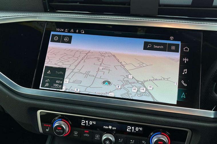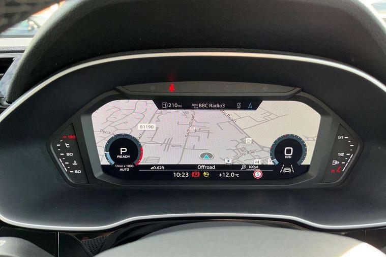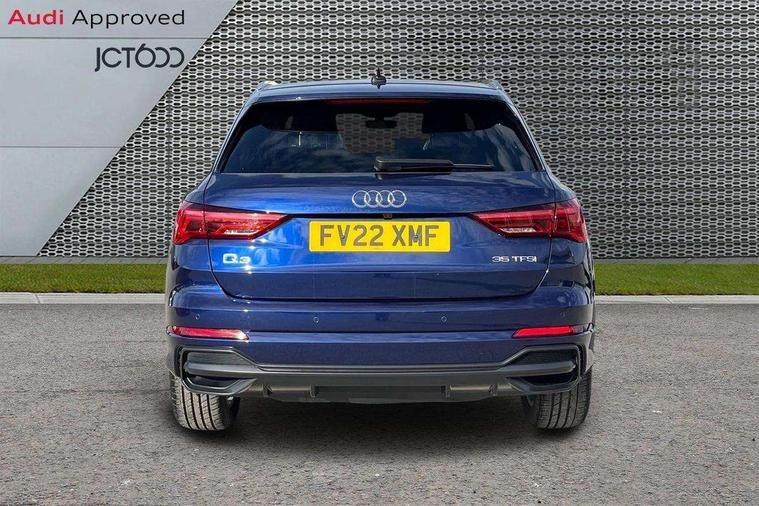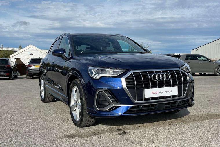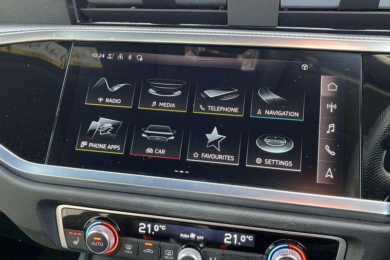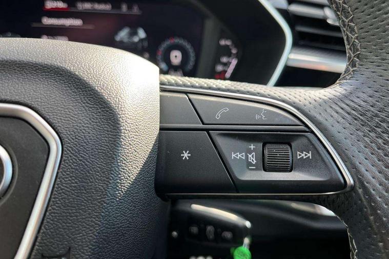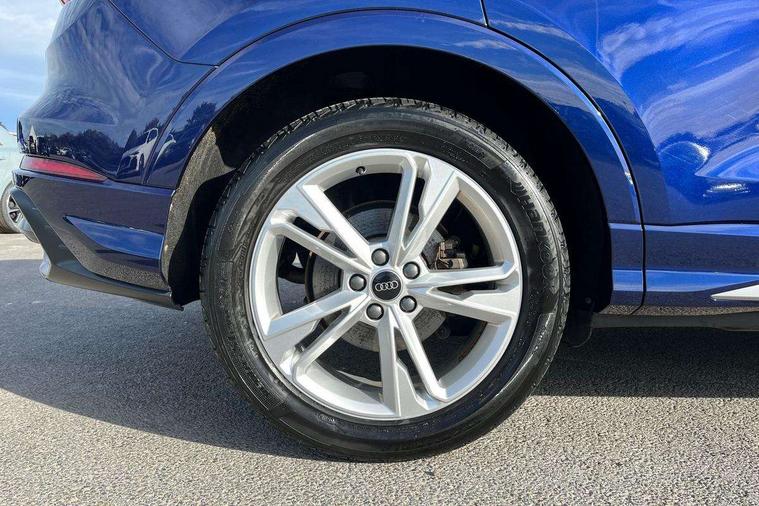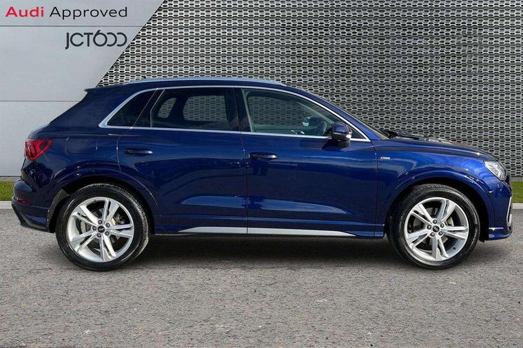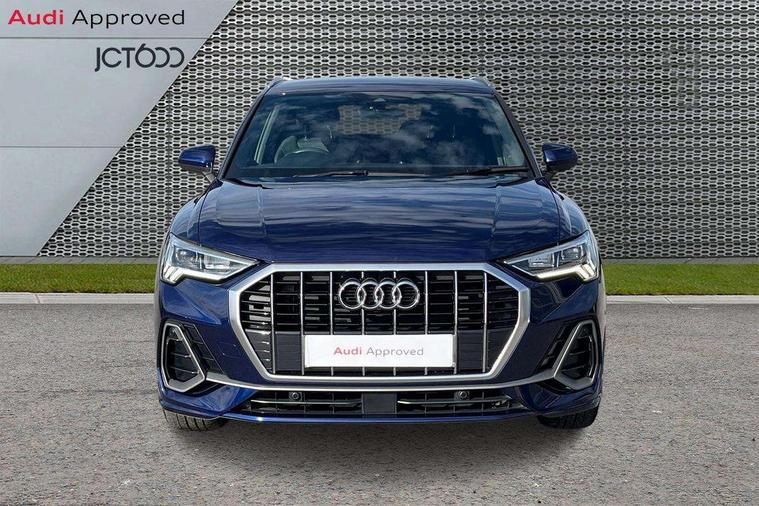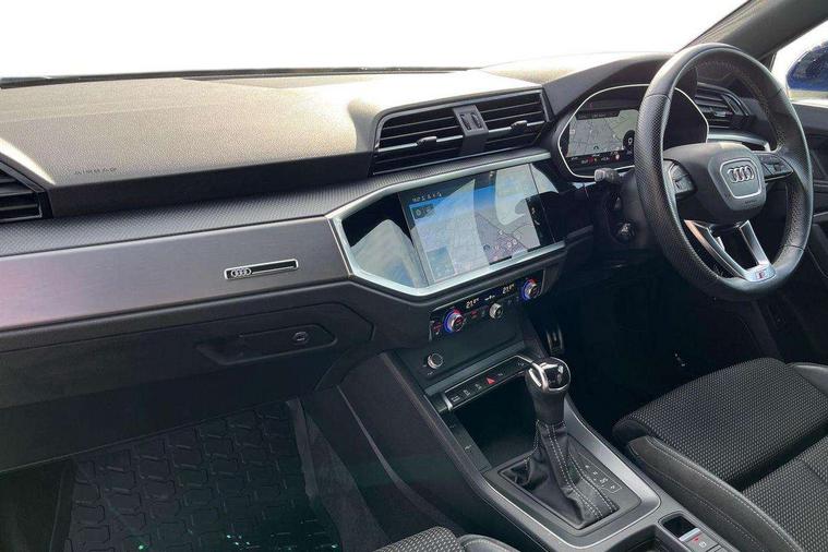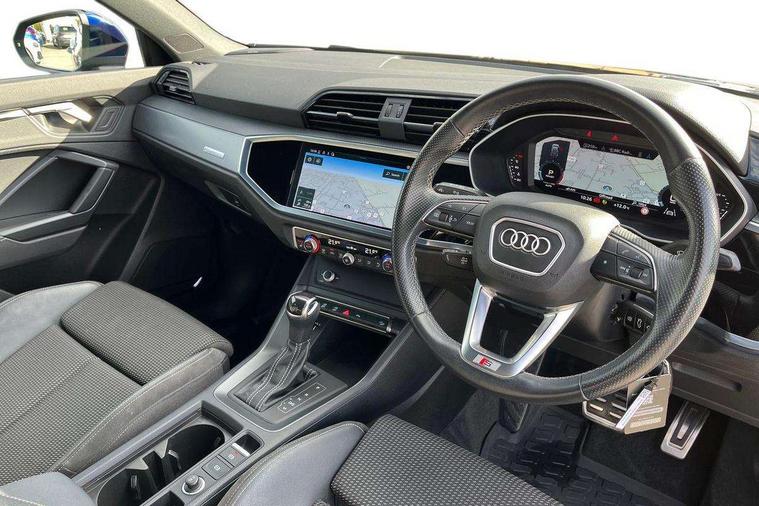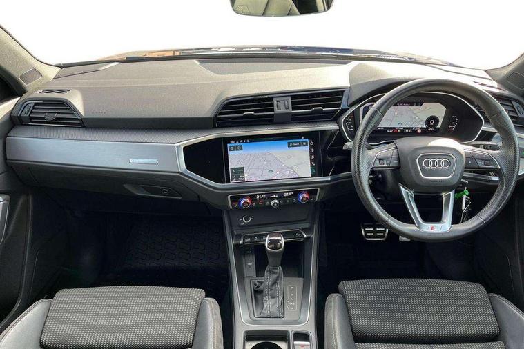 Amazon alexa Integration, Audi drive select, Audi lane departure warning, Audi Virtual Cockpit - 10.25" display, Bluetooth interface, Camera based traffic sign recognition, Legal emergency call, MMI Navigation Plus with high resolution 10.1 inch touchscreen colour display, Power operated tailgate, Progressive steering, Service interval indicator, Smartphone interface includes wireless Apple carplay/Android Auto, Start stop system with recuperation, Voice control system with natural language interaction, 48V Mild hybrid technology, Sports suspension, 2 USB-C ports with charge and data functions, 6 passive loudspeakers, DAB digital radio module, Acoustic windscreen, Aluminium roof rails, Aluminium window trim, Auto dimming frameless rear view mirror, Body coloured bumpers, Electrically folding, adjustable and heated door mirrors with integrated LED side indicators and kerb view function for passenger side, Front and rear electric windows, Front fog lights, Front side air inlets in matt platinum grey, Front spoiler blade in matt platinum grey, Grille vertical bars in aluminium silver/Matt, High gloss black finish B and C pillars, LED headlights with LED daytime running lights, LED rear lights, LED third brake light, Privacy glass dark tinted rear and rear-side windows (from B-pillar backwards), Rain and light sensors, Rear diffuser grille in grained matt black, Rear diffuser strip in matt titanium black, Rear side wing doors, Rear wiper, S line badges on front wings, S Line front and rear bumpers, Side skirt insert in matt Platinium grey, Titanium black radiator grille, Variable front intermittent wipers, 12V socket in rear centre console, 3 seat bench in 2nd row, 40:20:40 folding with manual adjustment for 60:40 forwards/backwards position and backrest angle, Adjustable rear seat bench/backrest with centre armrest and cupholder, Black cloth headlining, Dual zone electronic climate control, Front and rear black floor mats with contrast stitching in rock grey, Front and rear headrests, Front and rear roof module including reading lights, Front centre armrest, Glove compartment lighting, Height and reach adjustable steering wheel, Illuminated door sill trims with S logo, ISOFIX child seat mounting for front passenger with airbag deactivation and outer rear seat including top tether attachment point for outer rear seats, Luggage compartment light, Manual front seats with height adjustment, Perforated leather gearknob, Single front passenger seat, Stainless steel luggage compartment sill finisher, Stainless steel pedals, Non smoking pack - Q3, 3x3 point rear seatbelts, 6 airbags - Driver, front passenger, curtain and side windows, Audi pre-sense front with pedestrain and cyclist recognition, Electromechanical parking brake, Electronic stabilisation control including ABS, ASR and EDL, Front seatbelt reminder, Hill descent control, Hill hold assist, Manual child lock in rear doors, Pre sense basic, Seatbelt monitoring, Tyre pressure warning, Warning triangle and first aid kit, Anti theft alarm, Anti theft wheel bolts, Immobiliser, Remote central locking, Dark matt brushed aluminium inlay, Detail dashboard around MMI touch colour display in glass look, black with surround in aluminium look, Leatherette door armrest, Tool kit, Tyre repair kit,