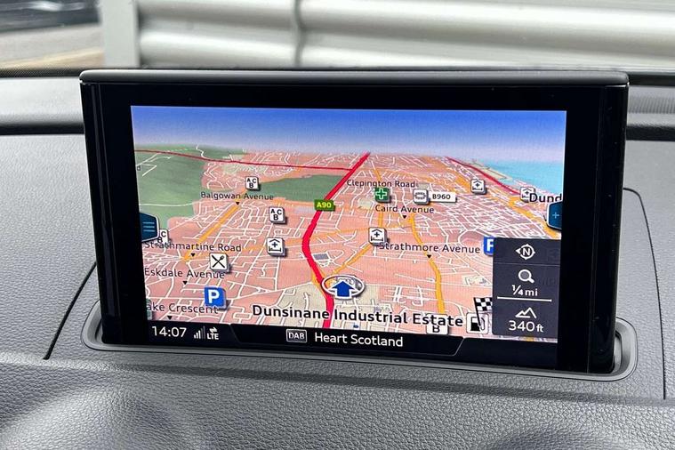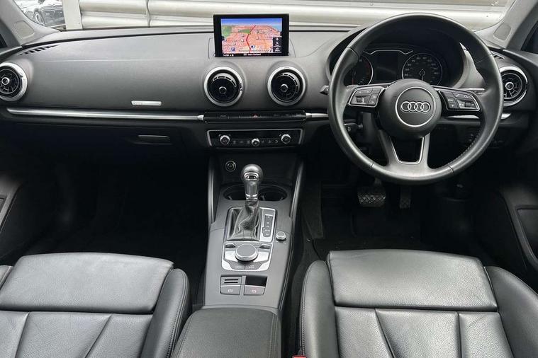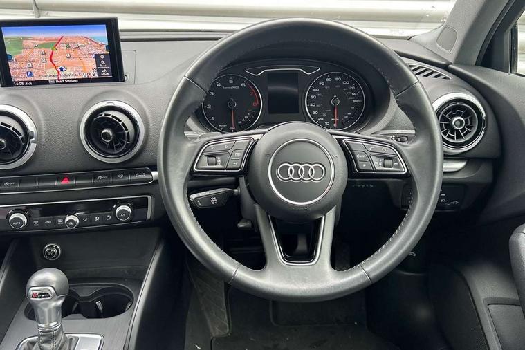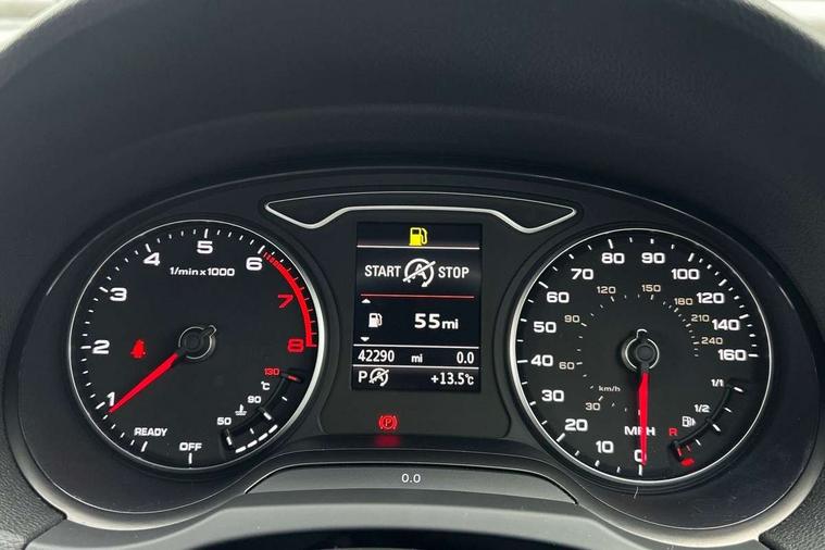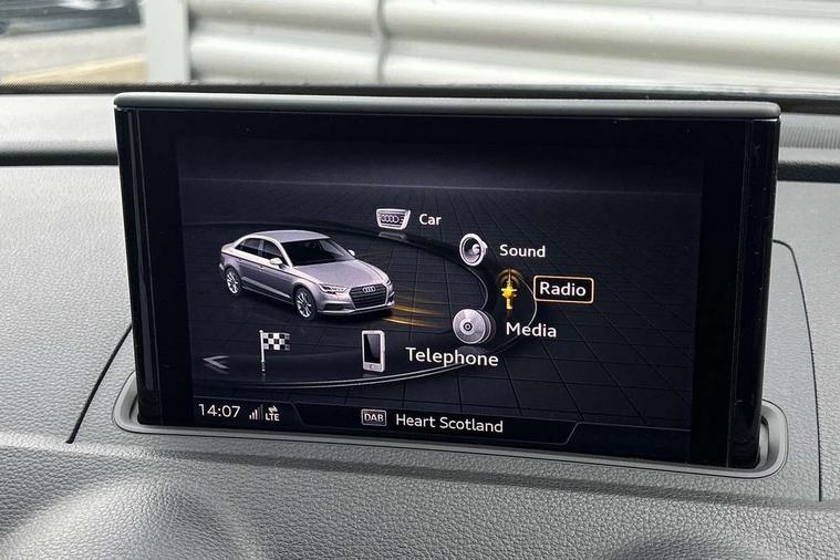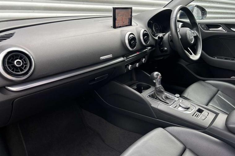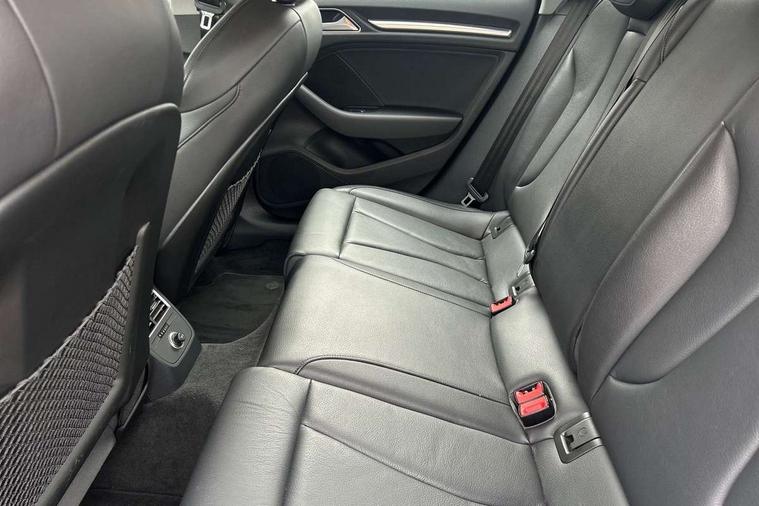Audi connect, Audi drive select, Audi smartphone interface, Automatic start/stop system, Bluetooth interface, Colour driver's information system display, Electro-mechanical PAS, SD card based MMI navigation, Service indicator, Voice control system, Dynamic suspension, 2 USB interfaces and Aux-In jack, CD player, DAB Digital radio, MMI radio plus with 7" colour MMI screen and MMI controller, Two SDXC card slots, Aluminium side window trim, Auto dimming rear view mirror, Automatic lights and wipers, Body colour bumpers, Body colour door mirrors, Body colour roof spoiler, Dual branch chrome-plated exhaust tailpipe, Electrically adjustable and heated door mirrors with integrated LED side indicators, Front and rear electric windows, Heated rear window, Heated windscreen washer jets, Illuminated roof module, Model and engine designation badges at rear, Passive door reflectors, Single chrome exhaust tailpipe, Sport specific side air inlet grille and diffuser insert, Xenon headlights with LED Daytime running light, 3 adjustable rear headrests, 3 spoke leather multifunction sports steering wheel with paddle shift gear change controls, 4 lashing points to secure luggage, 60/40 split folding rear seat, Adjustable front centre armrest, Aluminium door sill trims, Cloth headlining, Driver/passenger sunvisors, Dual zone electronic climate control, Front and rear interior lights with delay, Front sports seats, Front/rear floor mats, Height/depth adjustable steering column, Illuminated glovebox, Illuminated luggage compartment, ISOFIX child seat mounting and Top Tether with front passenger airbag deactivation, Manual height adjustable front seats, Storage compartments in doors side trims, centre console and under front drivers seat, Non smoking pack - A3, Storage and luggage pack - A3/RS3, 3 point seatbelts on all seats, ABS/EBD, Active front headrests, Airbags - front driver/passenger, front & rear side, curtain, drivers knee, ASR, EDL, Electromechanical parking brake, ESC - Electronic Stability Control + traction control, Hill hold assist, Predictive pedestrian protection, Seatbelt warning, Tyre pressure warning, Warning triangle and first aid kit, Anti theft alarm, Anti-theft wheel bolts, Immobiliser, Remote control central locking, Aluminium air vent surrounds, Aluminium mistral silver inlay, Aluminium trim elements, Tool kit, Tyre repair kit,