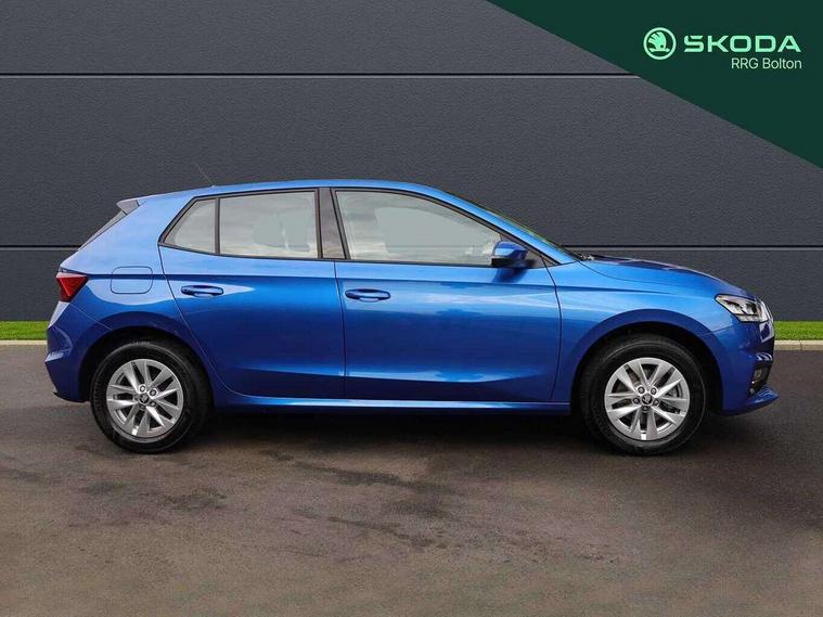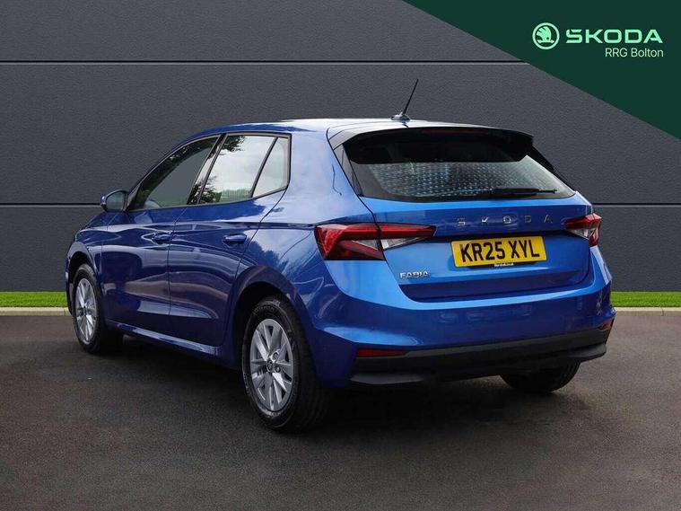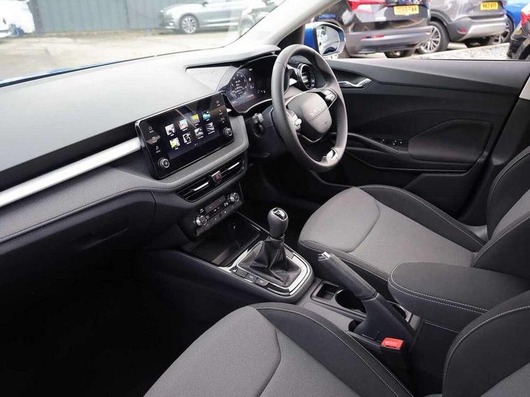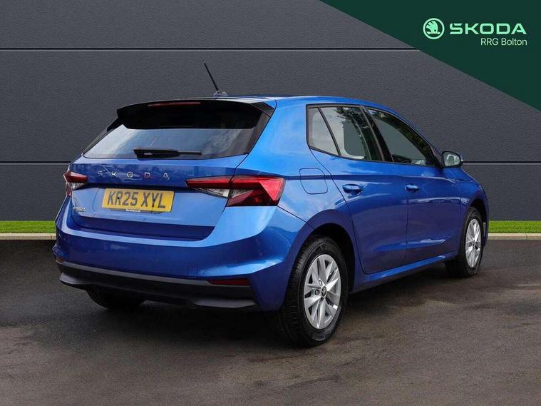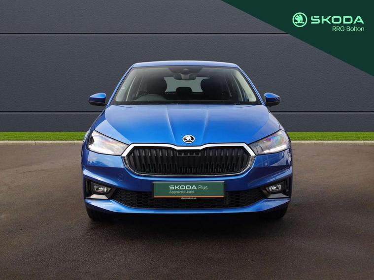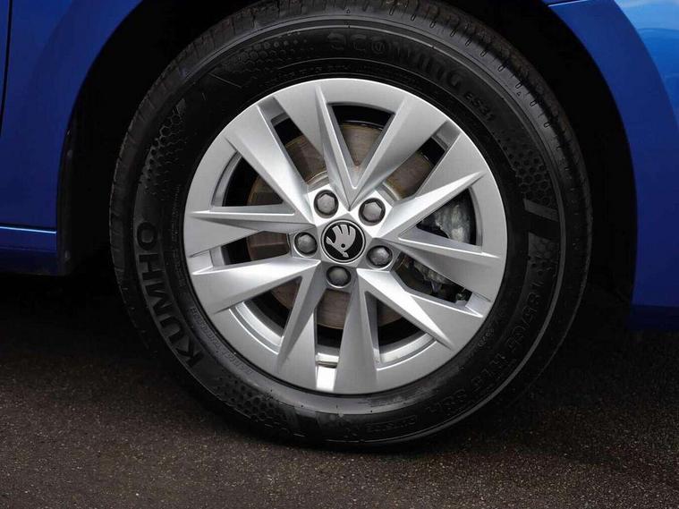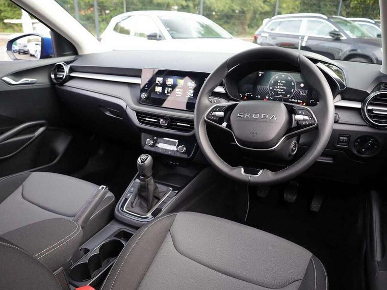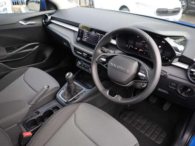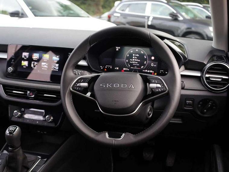 8" Digital instrument display, Advanced driver attention and drowsiness monitor, Bluetooth connection, Driver alert system, Electromechanical power steering, Exterior temperature gauge, Service interval indicator, Traffic sign recognition, Wireless SmartLink for Apple CarPlay and Android Auto, 6 Speakers (4 in front and 2 in rear), 8.25" Skoda infotainment touchscreen display, Auxiliary socket for external MP3 player, DAB digital radio reception, Auto dimming rear view mirror, Body colour door mirrors, Body coloured bumpers, Door mirror integrated indicators, Front and rear electric windows, Front window wiper intermittent control, Headlight range control - Automatic, Ice scraper in fuel cap, LED 3rd brake light, LED daytime running lights with coming and leaving home feature, LED rear lights, Rear LED fog light, Rear side wing doors, Rear window wiper with washing nozzles, Roof mounted spoiler, SKODA tailgate lettering in chrome, Unique dark chrome design logo on alloy wheels, 2 reading lights in front and 2 reading lights in rear, 3 rear headrests, Backrest split and folding, Central console with removable cup holder and storage box, Chrome handbrake release button, Dual zone air conditioning with climatronic electronic control, Fabric upholstery, Front centre armrest, Gearshift knob/handle in leather, Grain satin black interior door handles, Hand brake lever handle in leather, Height adjustable front headrests, Height adjustable front seats, Height adjustable steering wheel, ISOFIX and TopTether anchorage points to the outer rear seats, ISOFIX and TopTether on the front passenger seat, Luggage compartment lighting, Manually adjustable lumbar support in front seats, Pollen filter, Rear seat bench unsplit, Single front passenger seat, Skoda lettering on steering wheel, Storm grey headlining, Sun visors with mirror and airbag label on passenger side, Textile floor mats, Ticket holder, Umbrella in drivers door, Ambient lighting pack - Fabia Hatchback, 3-point height adjustable front seats belts with pretensioner and force limiter, Automatic warning lights in case of crash, Driver and passengers airbag with switch off function, e-Call+, ESC including ABS, MSR, ASR, EDS, HBA and XDS, Front and rear seat belt warning, FRONT ASSIST (AEB City and AEB Inter Urban), Front side airbags, Head airbags, One tone horn, Pedestrian protection, Three rear 3-points safety seat belts with pretensioner and force limiter including stop function for outer rear seat belts, Tyre pressure monitoring system, Anti-theft alarm system including immobiliser, interior monitoring, backup horn, and towing protection, Central locking with radio remote control, interior controls, SAFE function and 2 foldable keys, Black painted air vents, Grain satin black central console cover, Metallic grey upper decorative trim, Satin black door and side trim panel in front, Textile Kota grey lower decorative inserts, Anti-theft wheel bolts protection, Super-low rolling resistance tyres,