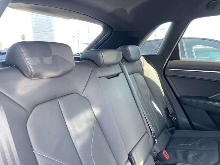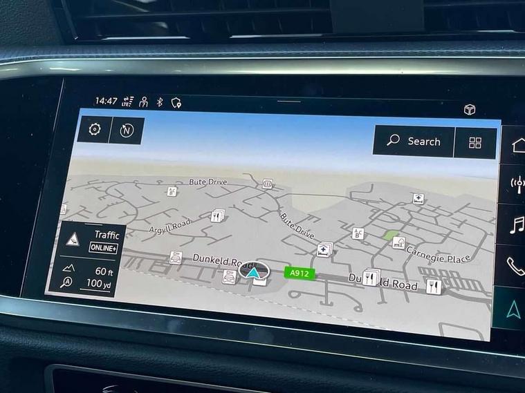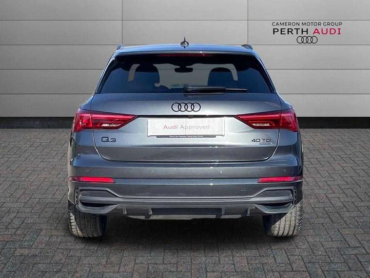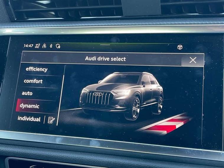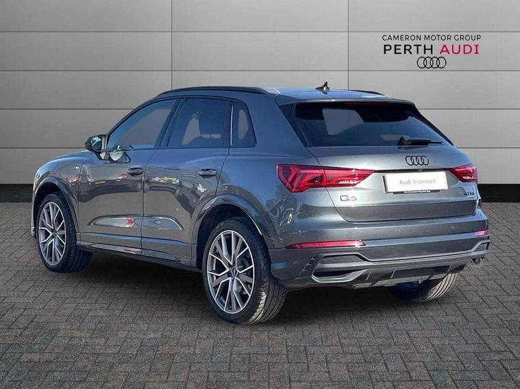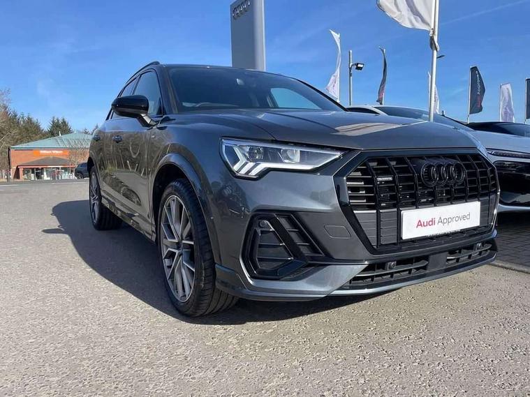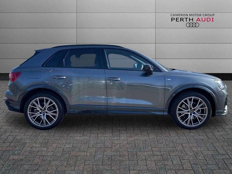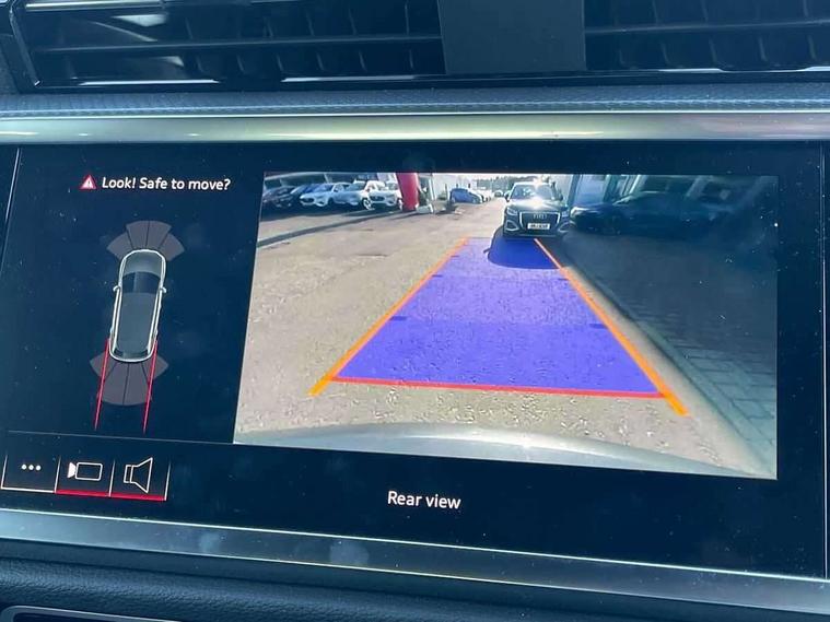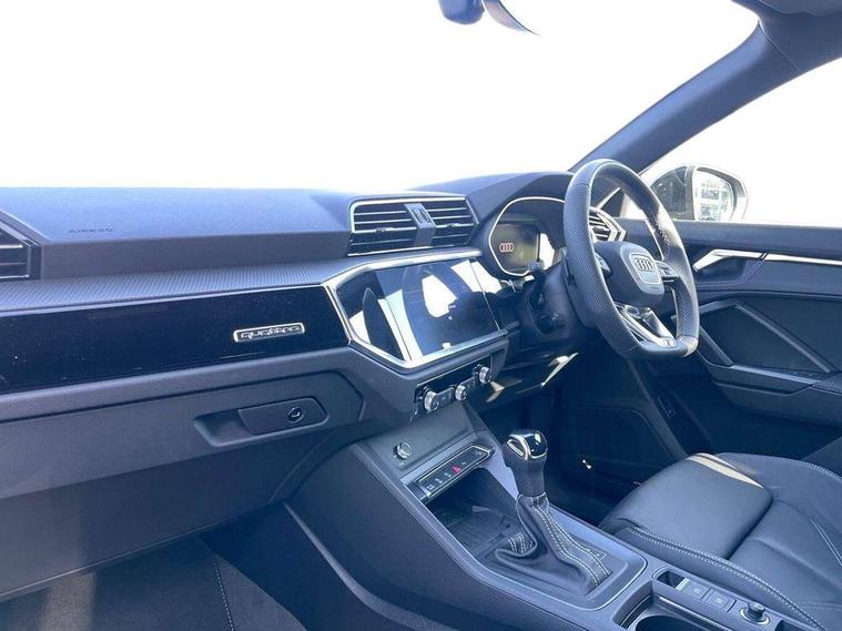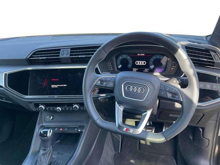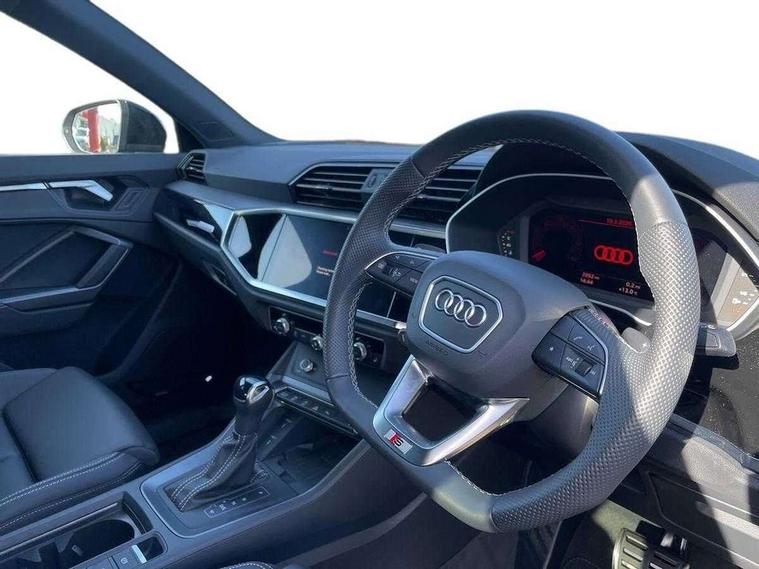 Amazon alexa Integration, Audi connect safety and service, Audi drive select, Audi lane departure warning, Audi Virtual Cockpit - 10.25" display, Bluetooth interface, Camera based traffic sign recognition, Distraction and Fatigue warning, Legal emergency call, MMI Navigation Plus with high resolution 10.1 inch touchscreen colour display, Power operated tailgate, Progressive steering, Service interval indicator, Smartphone interface includes wireless Apple carplay/Android Auto, Start stop system with recuperation, Voice control system with natural language interaction, Diesel particulate filter, Sports suspension, 2 USB-C ports with charge and data functions, 6 passive loudspeakers, DAB digital radio module, Acoustic windscreen, Anthracite black radiator grille, Audi Beam uses LEDs to project the Audi logo onto the ground as you exit your Q3, Auto dimming door mirrors, Auto dimming frameless rear view mirror, Black roof rails, Electrically folding, adjustable and heated door mirrors with integrated LED side indicators and kerb view function for passenger side, Front and rear electric windows, Front fog lights, Grille vertical bars in aluminium silver/Matt, High gloss black finish B and C pillars, LED Dynamic rear indicators, LED headlights with LED daytime running lights, LED rear lights, LED third brake light, Privacy glass dark tinted rear and rear-side windows (from B-pillar backwards), Rain and light sensors, Rear diffuser grille in grained matt black, Rear diffuser strip in matt anthracite black, Rear side wing doors, Rear wiper, S line bumpers in contrasting Manhattan grey, Variable front intermittent wipers, 12V socket in rear centre console, 3 seat bench in 2nd row, 40:20:40 folding with manual adjustment for 60:40 forwards/backwards position and backrest angle, Adjustable rear seat bench/backrest with centre armrest and cupholder, Black carpet mats, Black cloth headlining, Dual zone electronic climate control, Electric lumbar support, Front and rear black floor mats with contrast stitching in rock grey, Front and rear headrests, Front centre armrest, Height and reach adjustable steering wheel, Illuminated door sill trims with S logo, ISOFIX child seat mounting for front passenger with airbag deactivation and outer rear seat including top tether attachment point for outer rear seats, Luggage compartment sill protection in stainless steel, Manual front seats with height adjustment, Perforated leather gearknob, Single front passenger seat, Stainless steel pedals, Twin leather upholstery with front sport seats + S embossing, Black styling pack - Q3, Non smoking pack - Q3, 3x3 point rear seatbelts, 6 airbags - Driver, front passenger, curtain and side windows, Audi pre-sense front with pedestrain and cyclist recognition, Electrically operated child locks on rear doors, Electromechanical parking brake, Electronic stabilisation control including ABS, ASR and EDL, Front seatbelt reminder, Hill descent control, Hill hold assist, Pre sense basic, Seatbelt monitoring, Tyre pressure warning, Warning triangle and first aid kit, Anti theft wheel bolts, Immobiliser, Remote central locking, Thatcham approved category 1 anti theft alarm, Aluminium look interior elements, Detail dashboard around MMI touch colour display in glass look, black with surround in aluminium look, Leatherette door armrest, Piano black inlay,