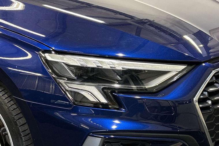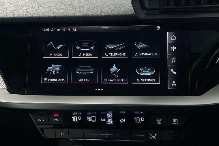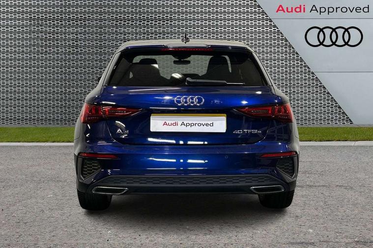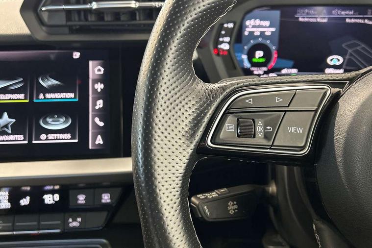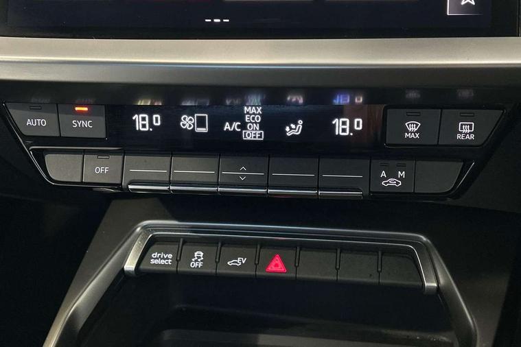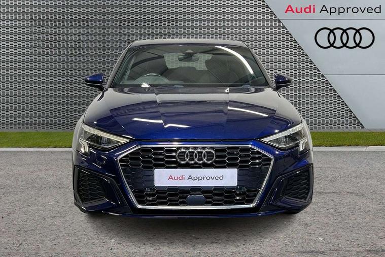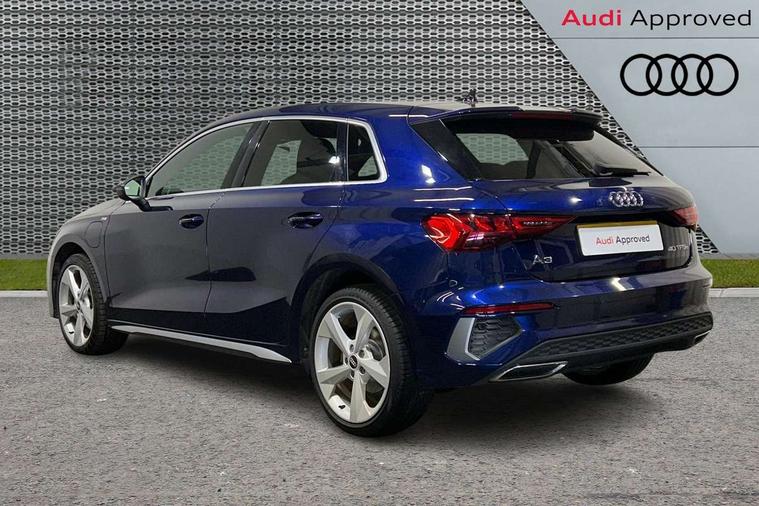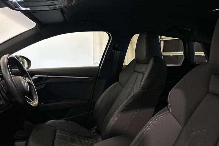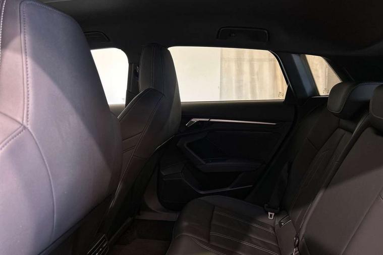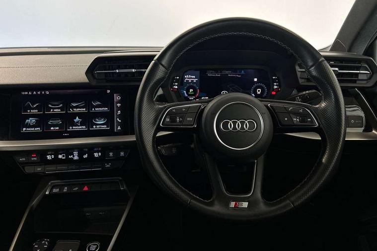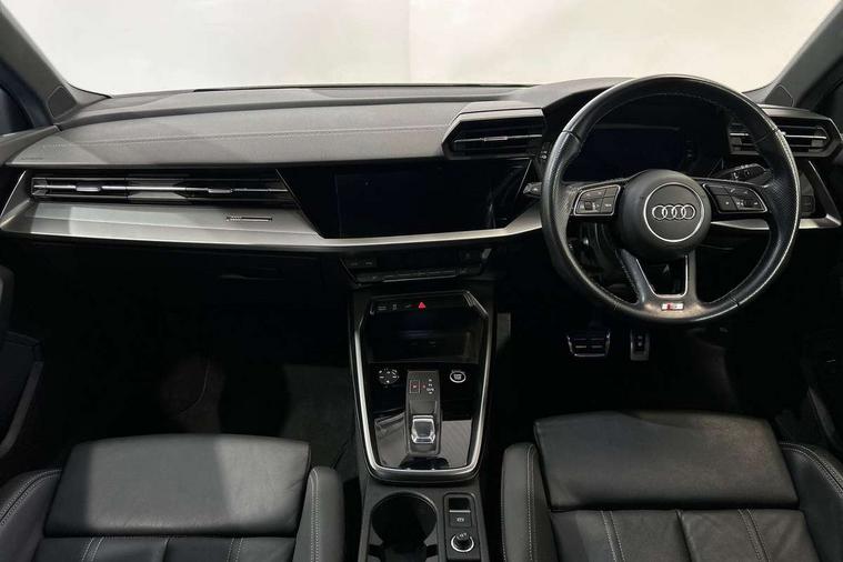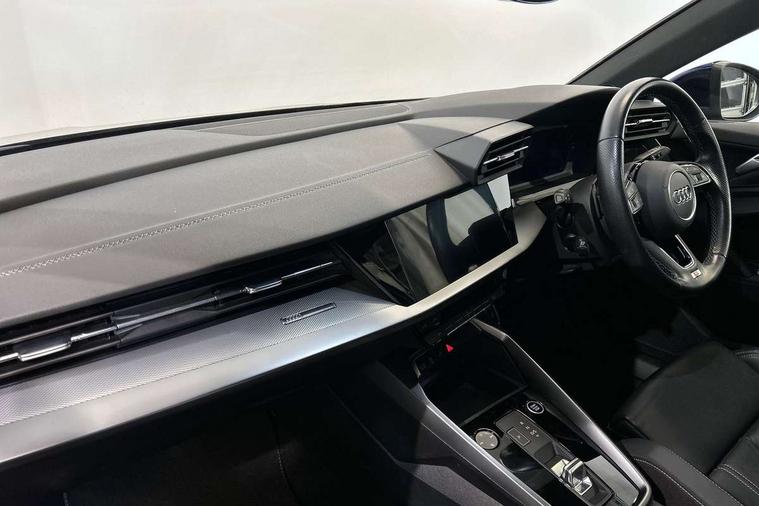 Audi connect emergency call and service, Audi drive select (Auto, Comfort, Dynamic, Efficiency and Individual), Audi smartphone interface, Audi Virtual Cockpit - 10.25" digital and colour instrument cluster, Automatic start/stop system with recuperation, Bluetooth interface, Collision avoidance assistant, Electromechanical power speed sensitive steering, Lane departure warning system, MMI Navigation Plus with high resolution 10.1" colour touch screen display, Service indicator, Trip computer, Voice control system with natural language interaction, 3 pin 10 amp domestic charging cable, Type 2 mode 3 32 amp charging cable, Type 2 socket for AC charging, 2xUSB-C connection with data and charging functions, 6 passive loudspeakers, DAB Digital radio, 3rd brake light, Acoustic glass windscreen, Aluminium window trim, Auto dimming frameless rear view mirror, Electrically adjustable/heated/folding/auto dimming door mirrors with integrated LED indications + kerb view function for passenger side, Front electric windows, Illuminated aluminium inserts front door sills with S logo, LED daytime running lights, LED headlights with LED rear lights and dynamic rear indicators, Light and rain sensors, Privacy glass - dark tinted rear window, rear door and side windows, Rear electric windows, Rear side air outlets in grained matt black, Rear wiper, S line bumpers, S roof spoiler, 12V socket and storage compartment in front centre console, 40/20/40 split folding rear seat bench with cupholder, Black cloth headlining, Dual zone electronic climate control, Front and rear centre armrest in leather, Front and rear headrests, Front/rear floor mats, Height and reach adjustable steering wheel, Interior lighting - glove compartment light and right hand side, Luggage compartment floor covering, Manual boot compartment lid, Manually adjustable front seats, Seat side bolsters, Stainless steel pedals and front footrest, Twin leather upholstery with front sports seats S embossed logo, Aluminium interior elements pack - A3 Sportback, S line styling pack - A3 Sportback, 3x3 point rear seat belts, Driver and front passenger airbag with passenger airbag deactivation, Electronic Stabilisation Control (ESC) including ABS, ASR and EDL, First aid kit with warning triangle and 2 safety vests, Front side airbags with head airbags and interaction airbag, Hill hold assist, Pre-sense front with pedestrian and cyclist detection, Seatbelt monitoring, Tyre pressure loss indicator, Anti theft alarm, Anti-theft wheel bolts, Electronically operated child lock, Immobiliser, Remote control central locking, Accent surfaces in the dashboard and centre console in platinum grey silk effect paint finish, Dark spectrum aluminium inlays, Tool kit, Tyre repair kit,